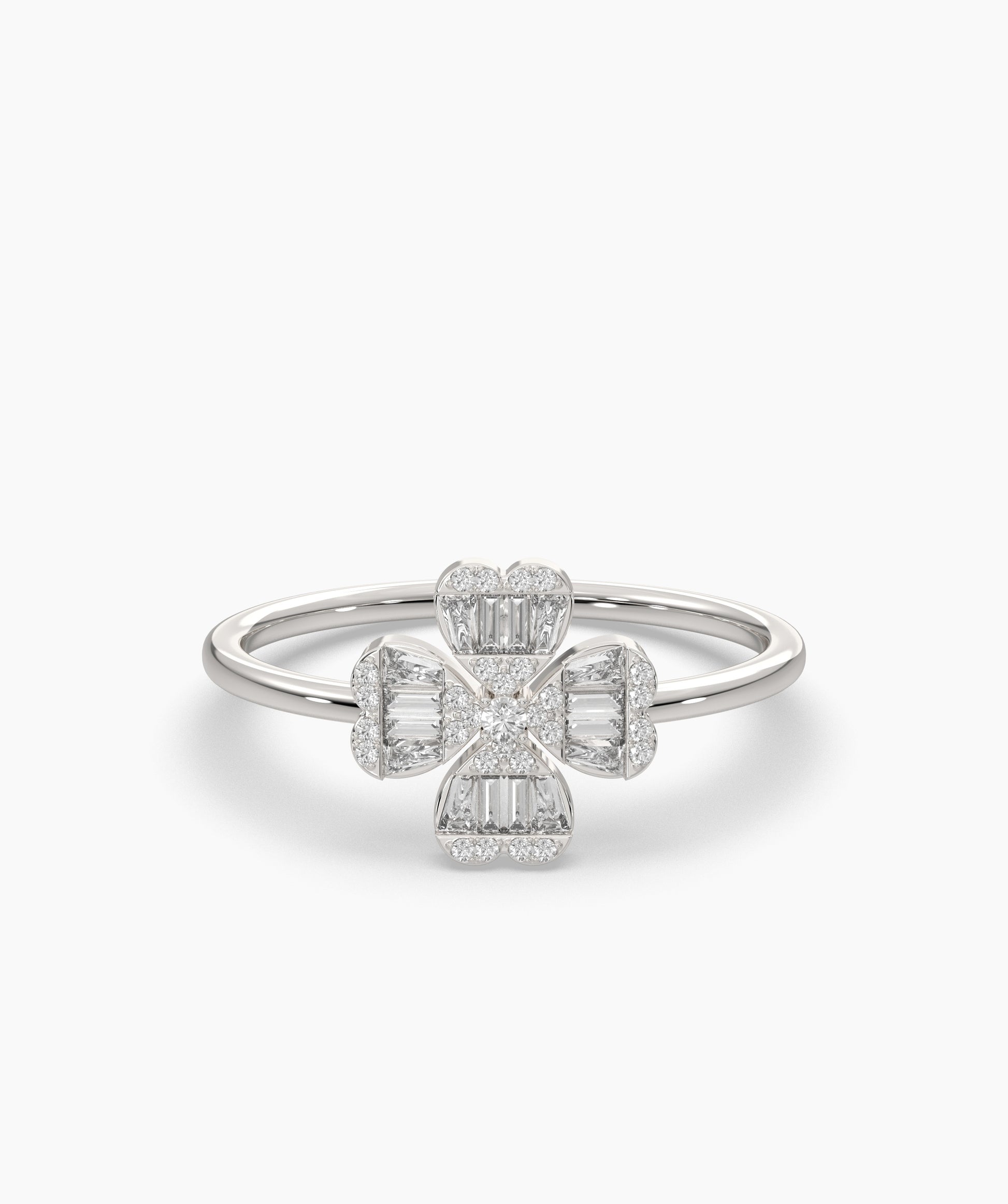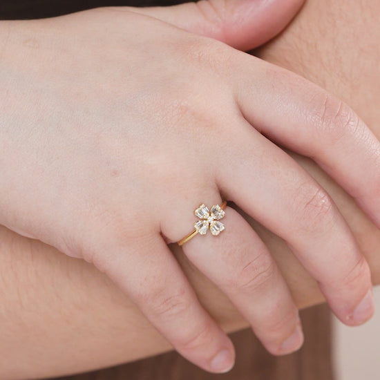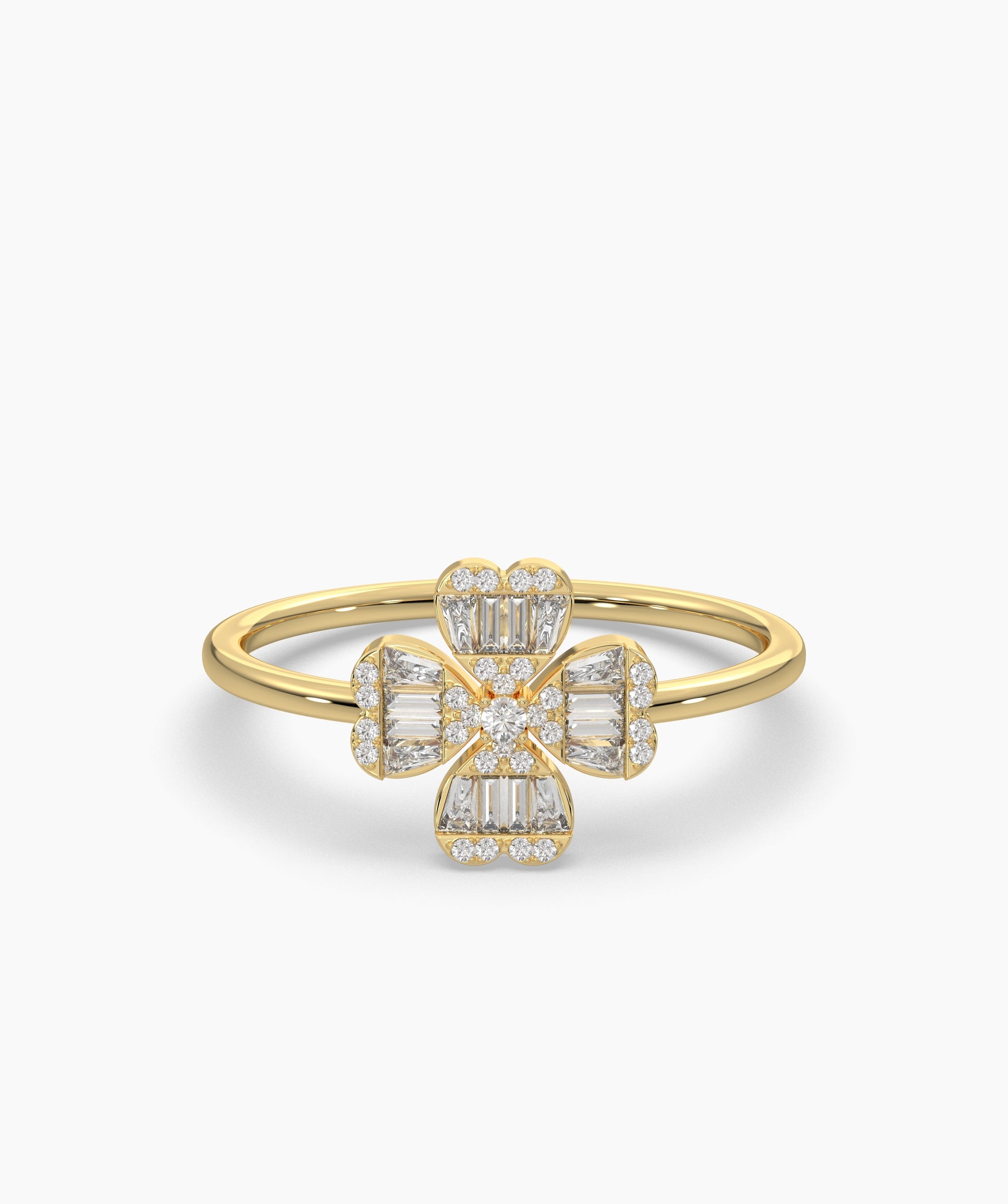 A refined floral design meets modern flair—this ring’s baguette diamonds and sleek gold setting create a captivating bloom.