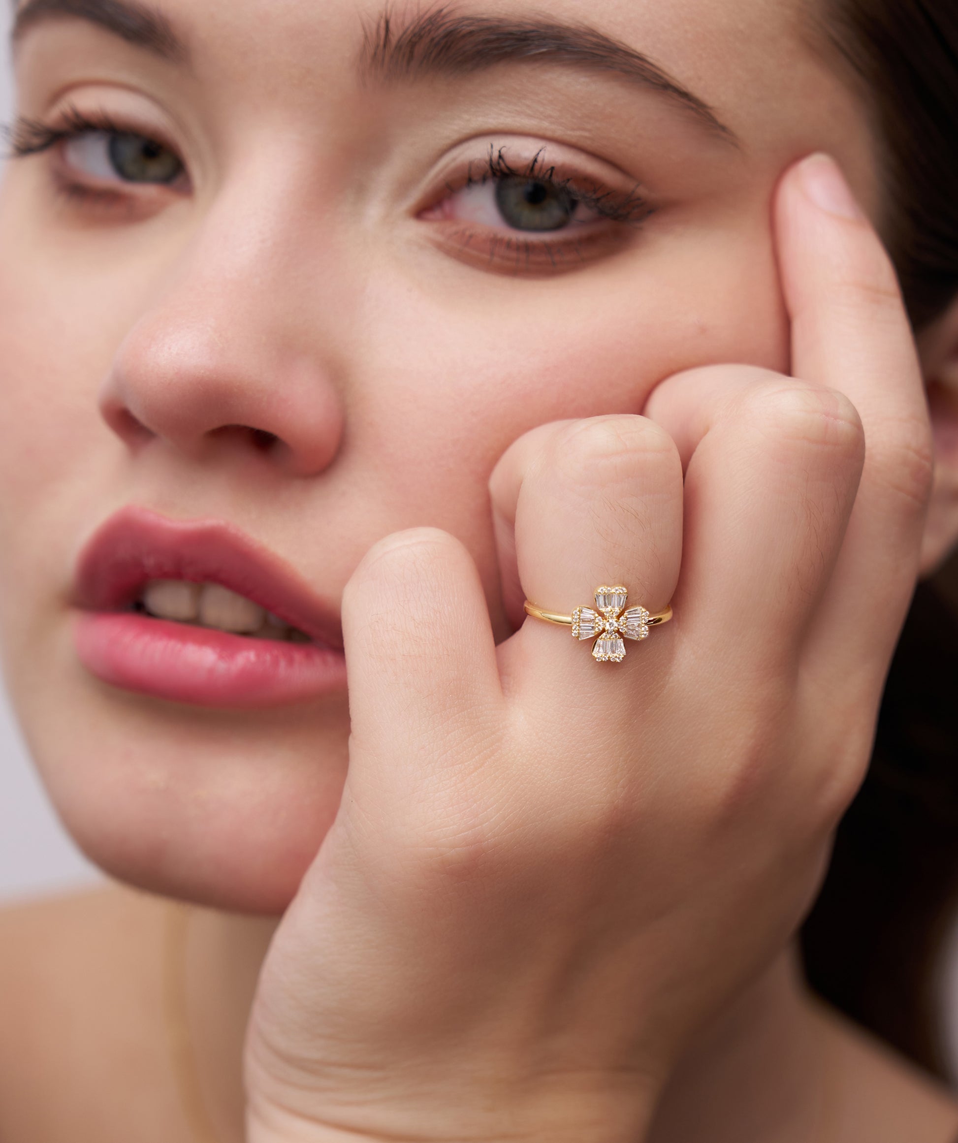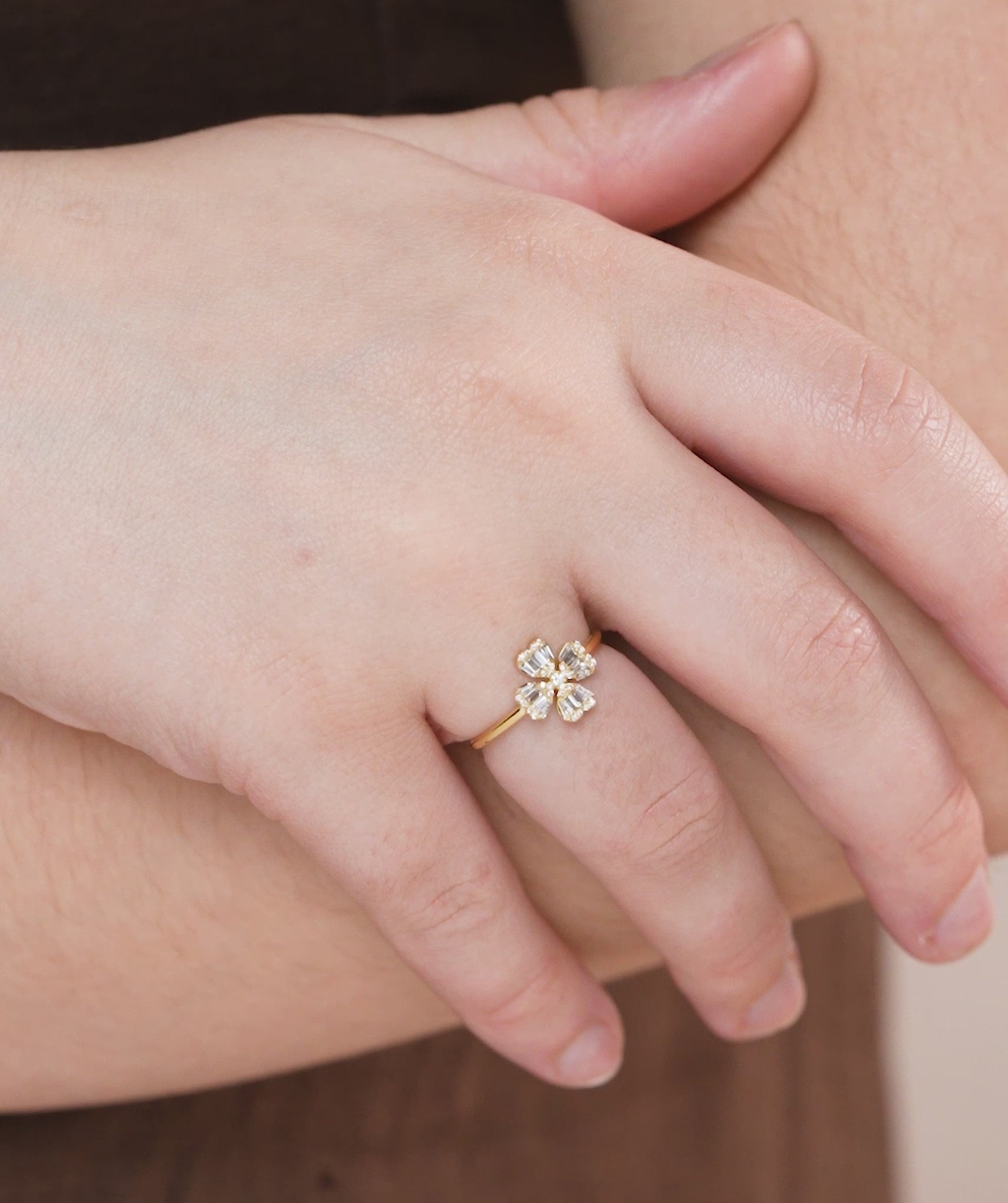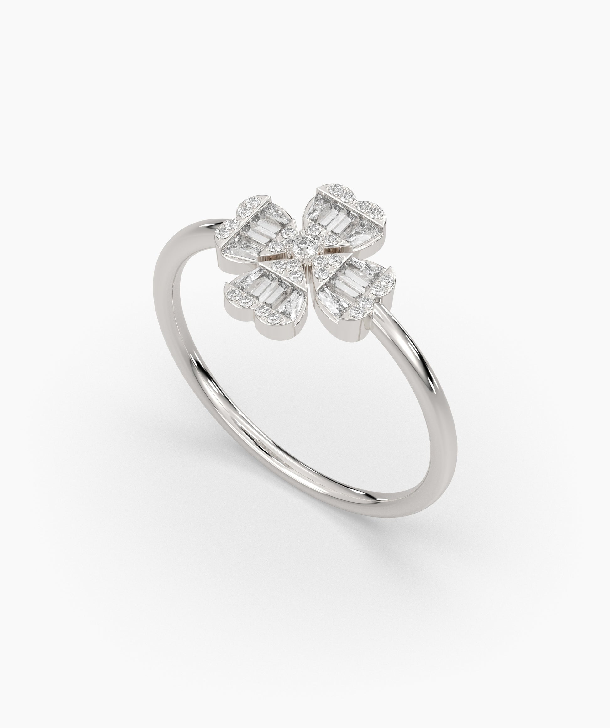 A refined floral design meets modern flair—this ring’s baguette diamonds and sleek gold setting create a captivating bloom.