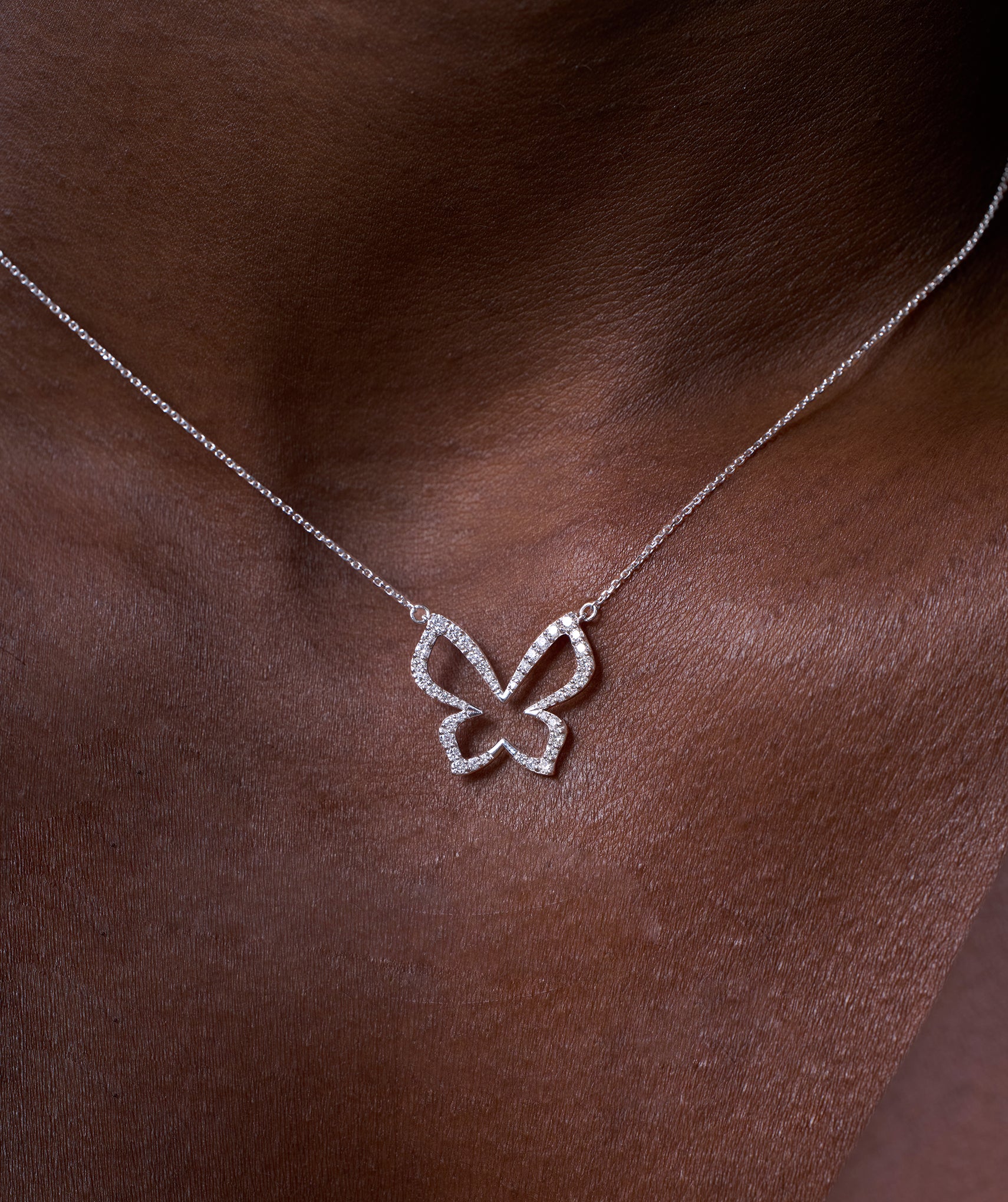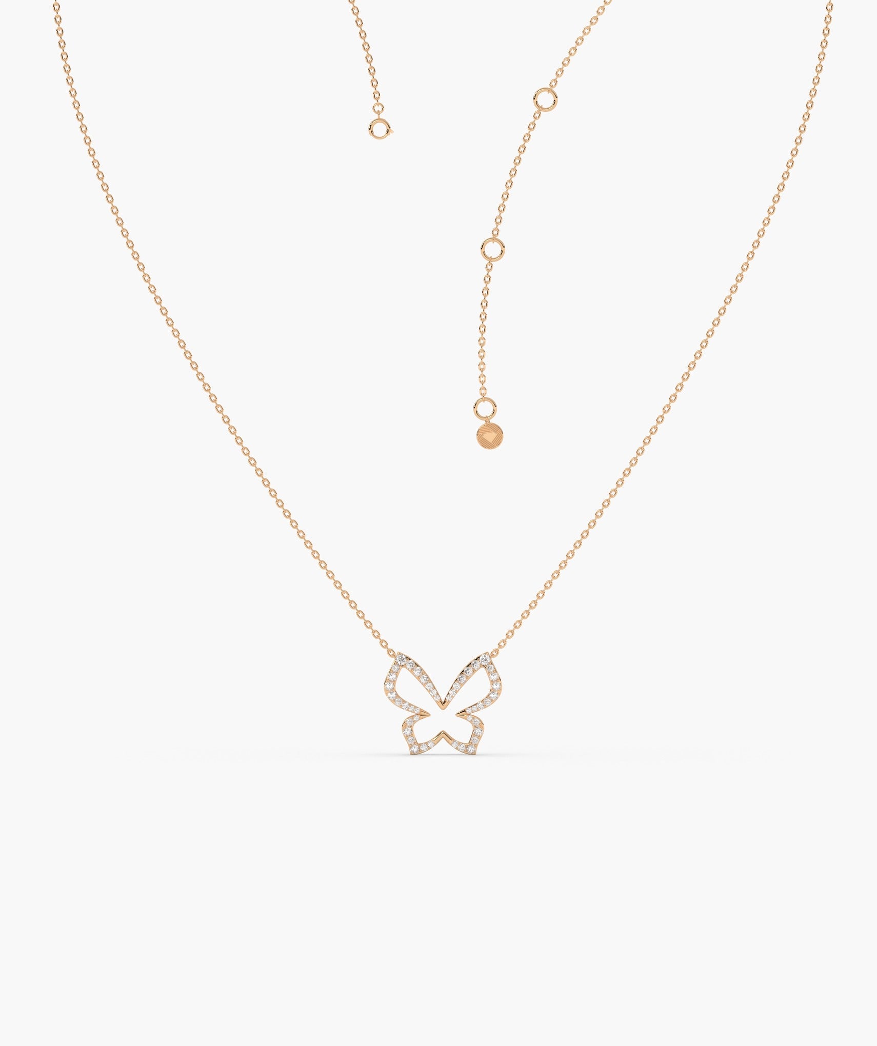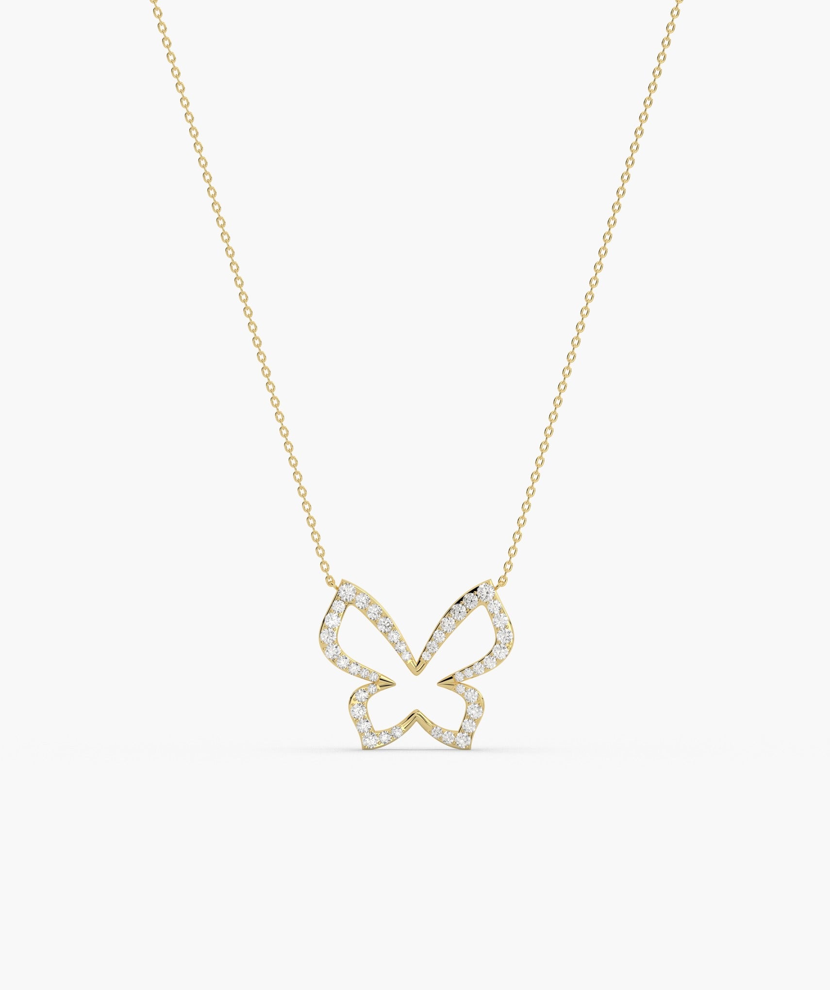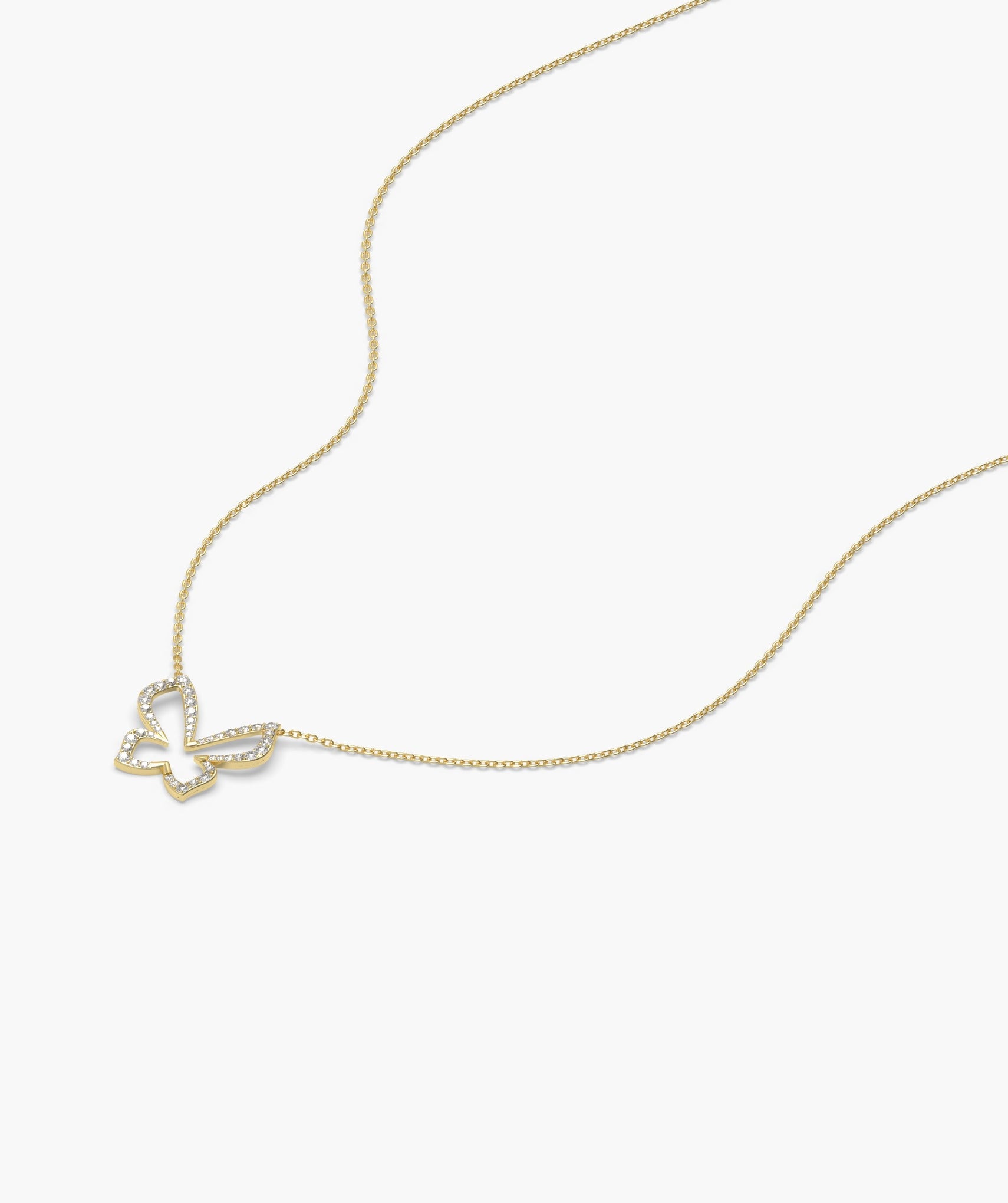 This 14K gold necklace showcases a glittering butterfly pendant, beautifully adorned with pave diamonds, perfect for adding a touch of elegance to any outfit.