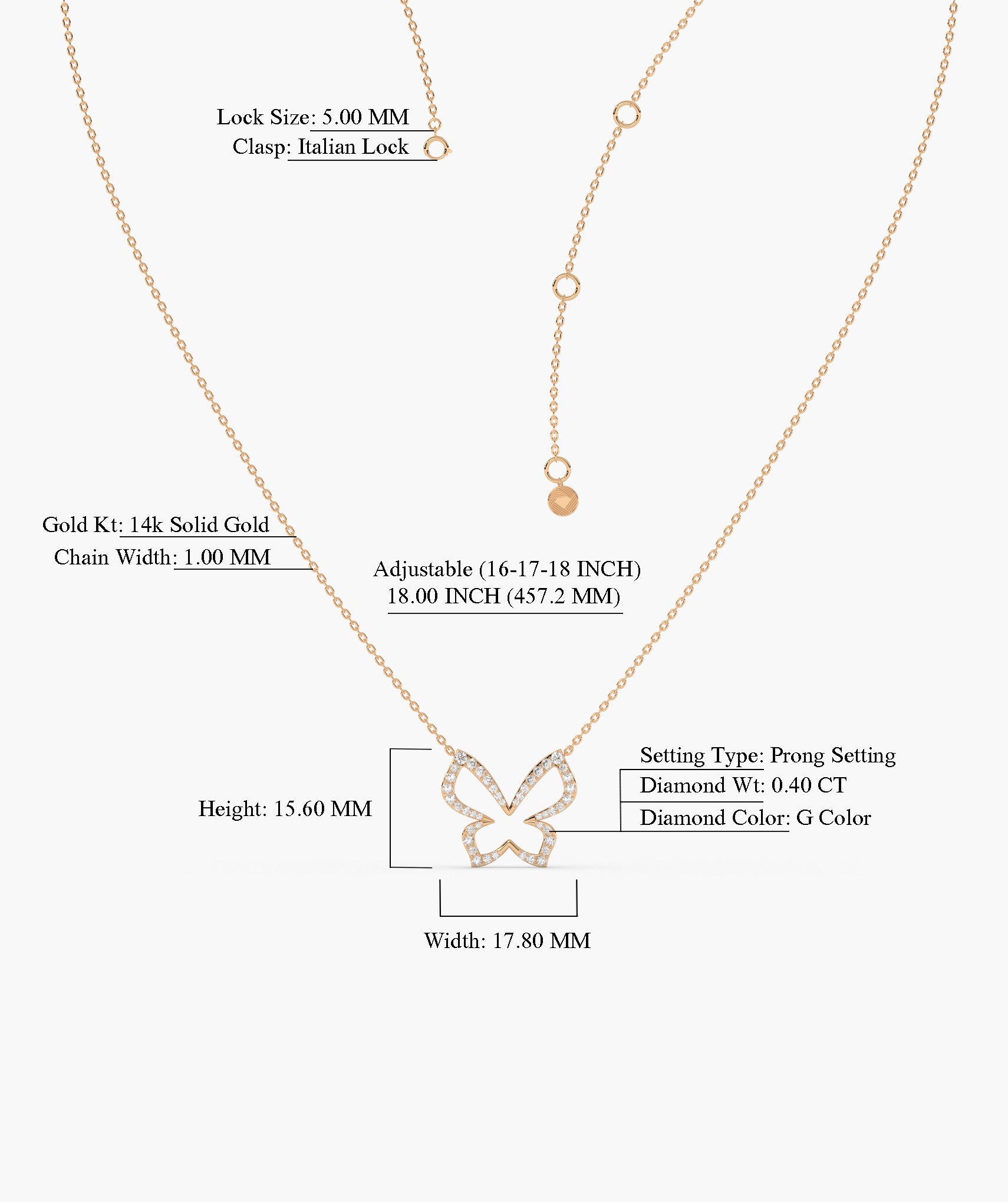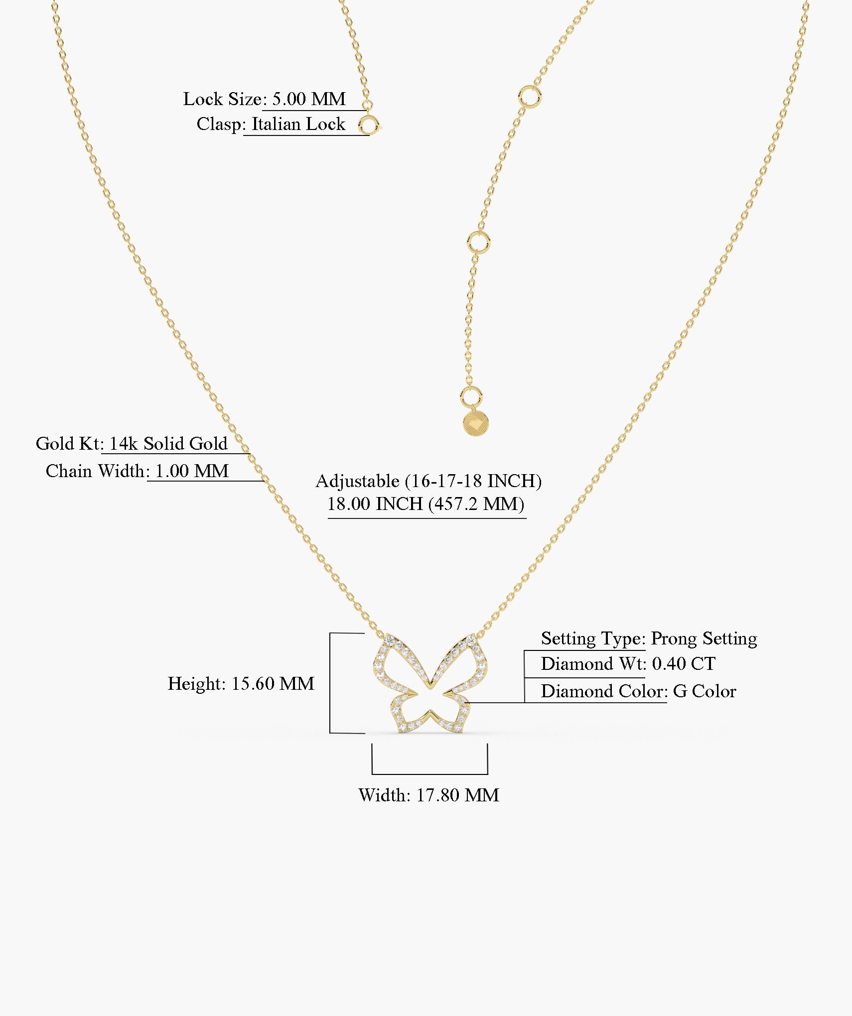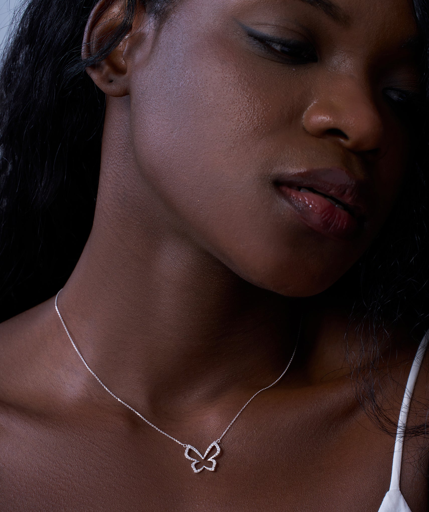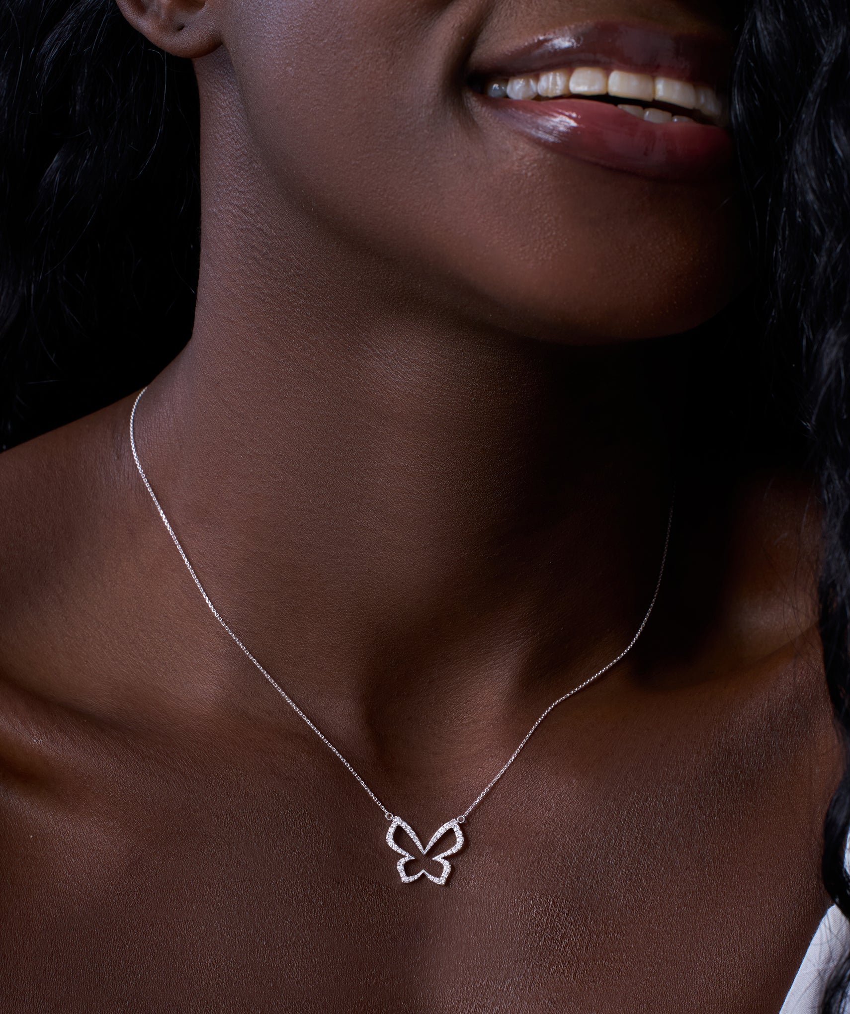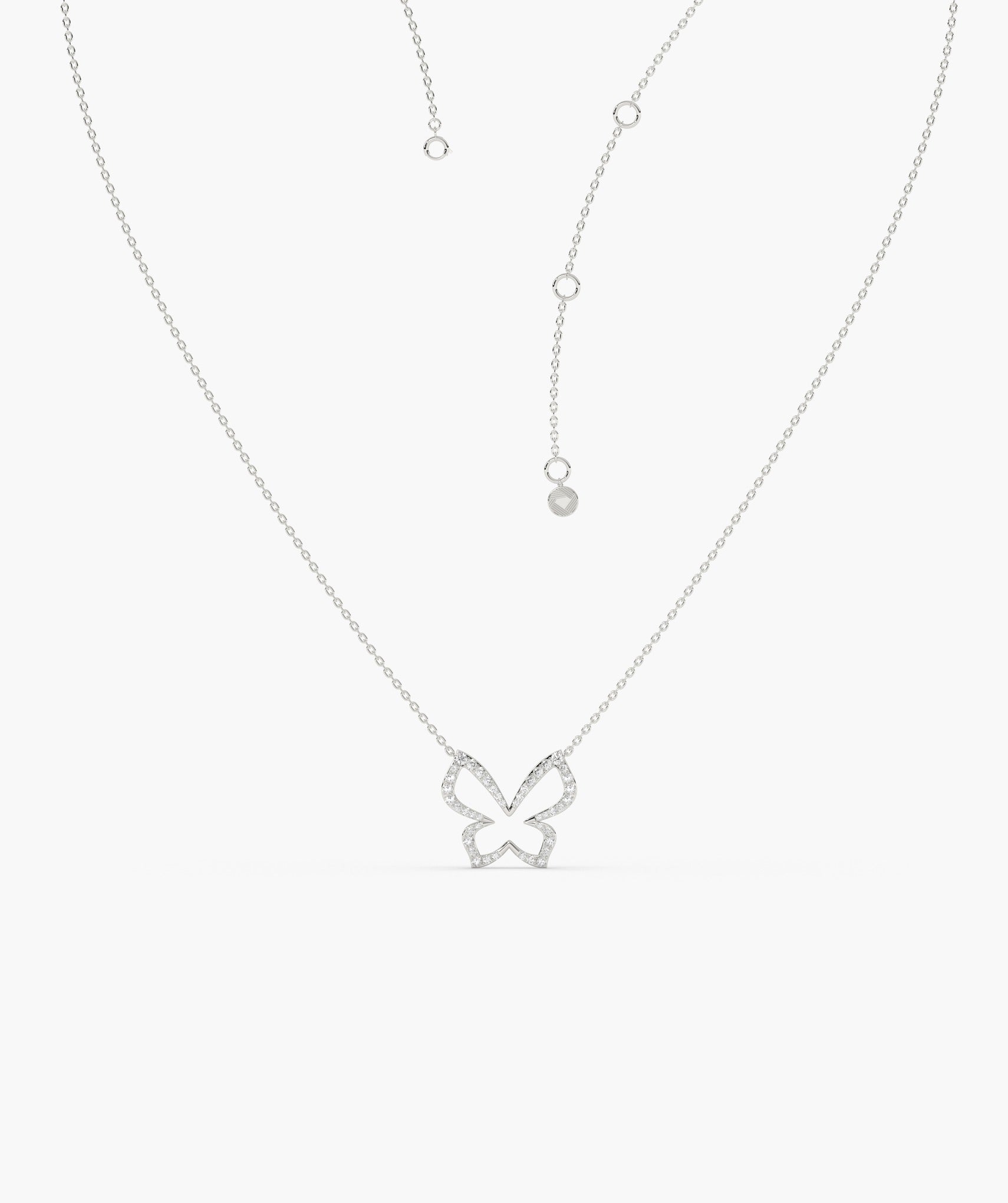 This 14K gold necklace showcases a glittering butterfly pendant, beautifully adorned with pave diamonds, perfect for adding a touch of elegance to any outfit.