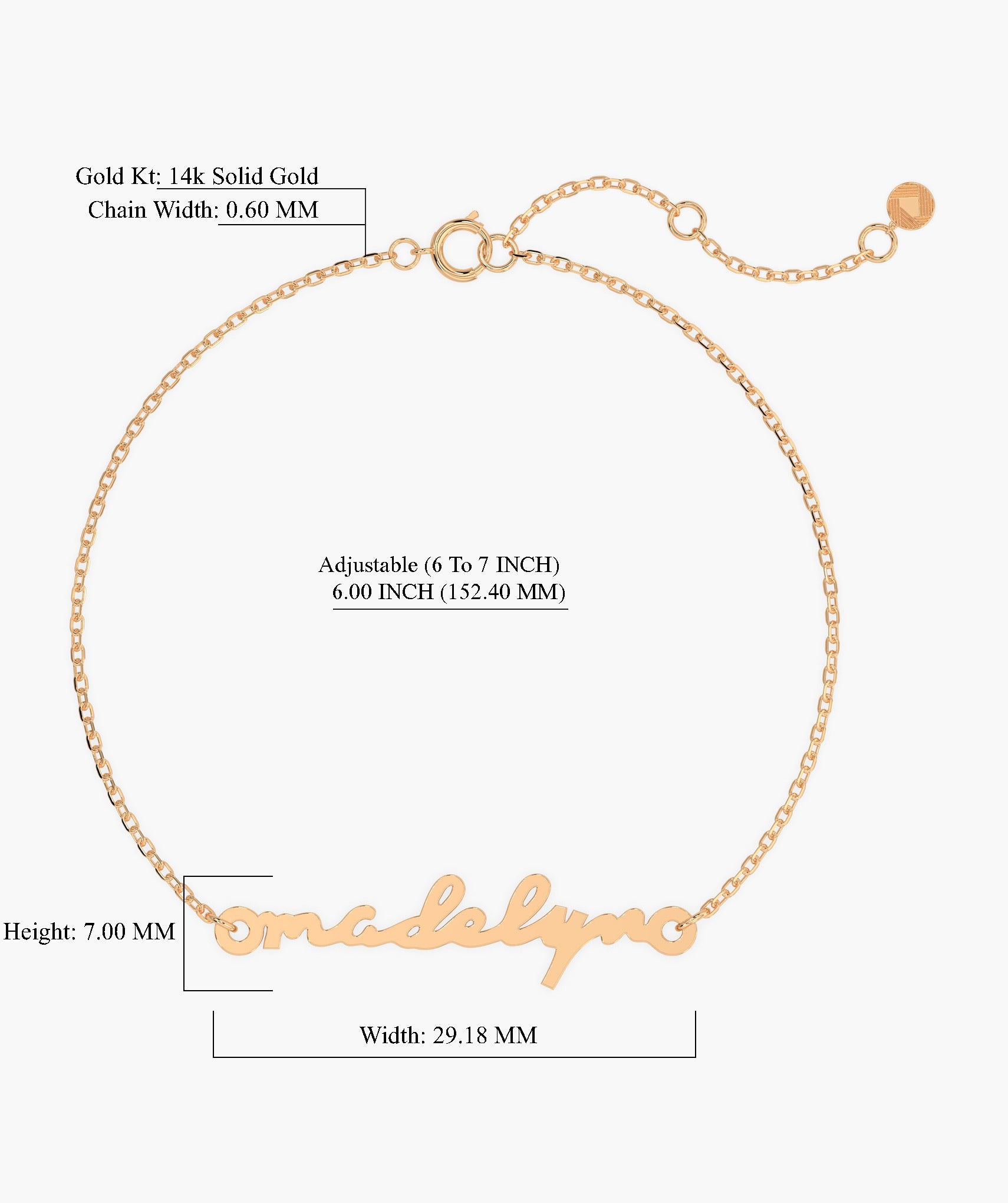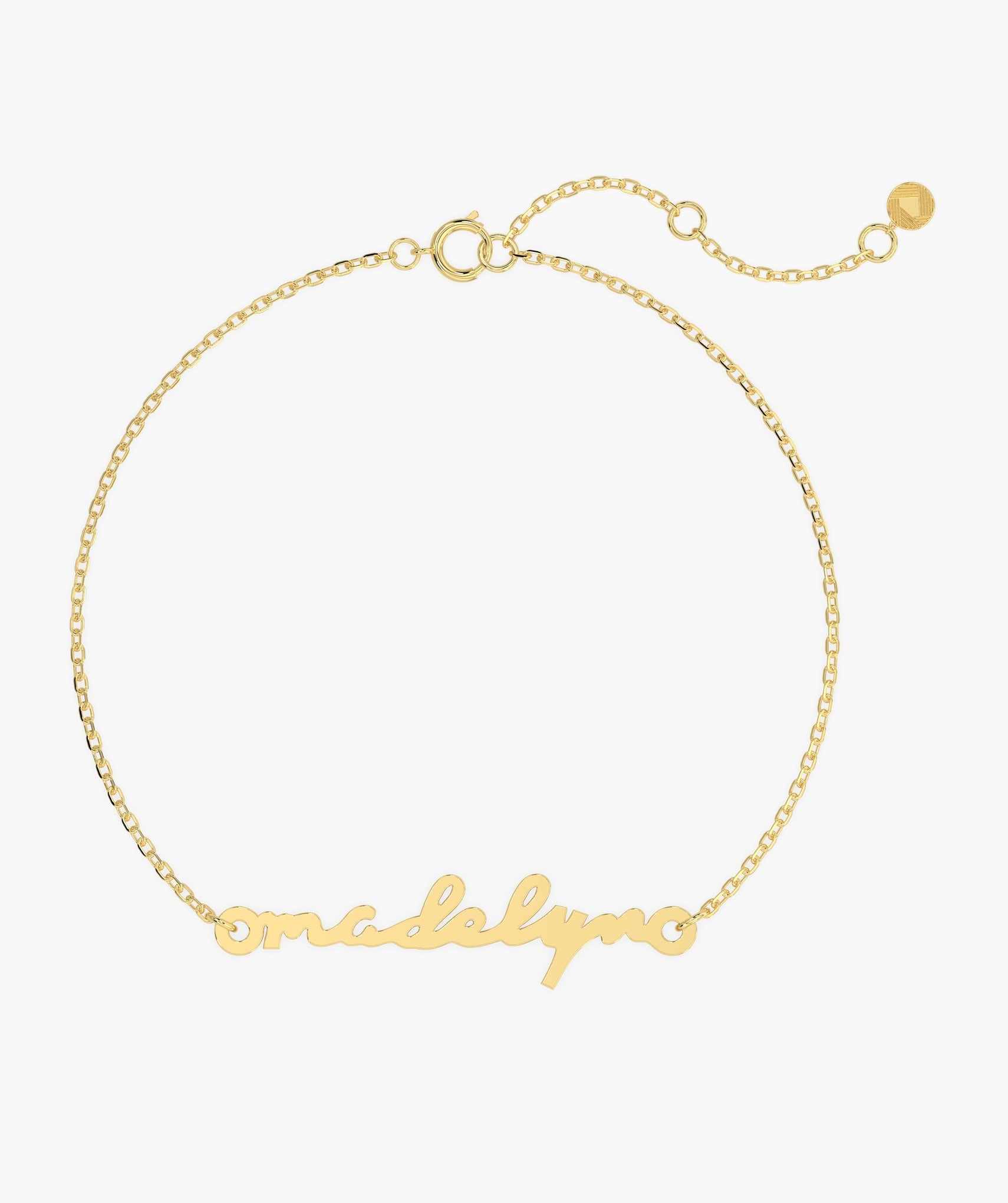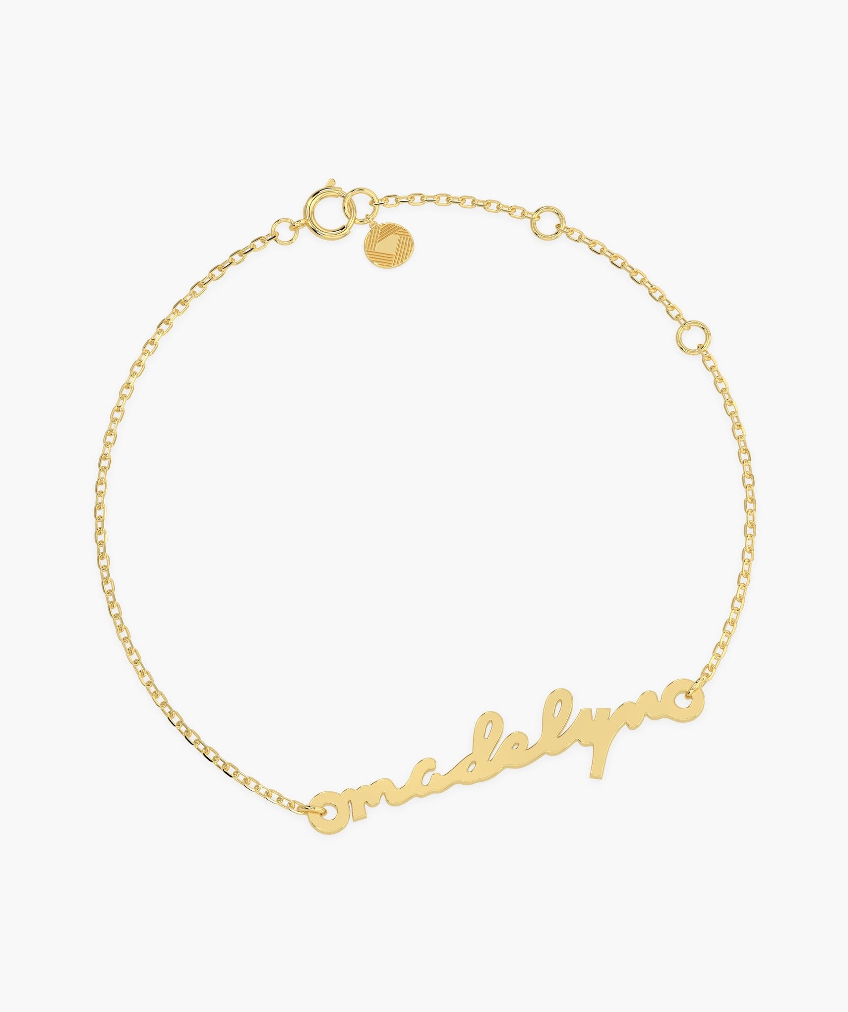 Elegantly crafted, this 14K gold bracelet features the name 'madelynn' in a beautiful cursive script.