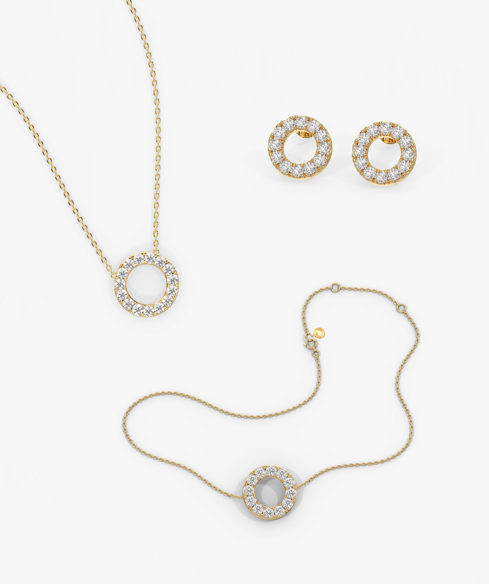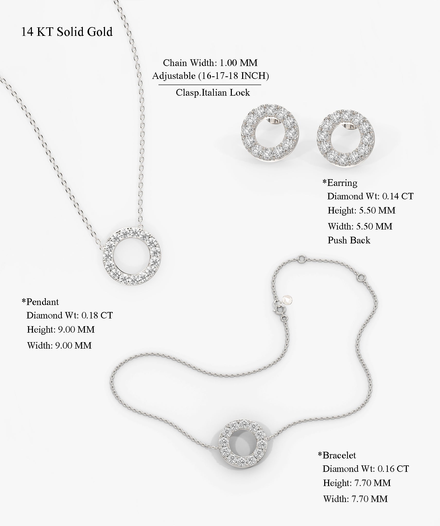 Elevate your style with this 14K solid gold circle diamond jewelry set. Featuring a sleek open-circle pendant, sparkling bracelet, and classic studs, each piece is crafted with natural diamonds—making it a sophisticated gift or everyday staple.