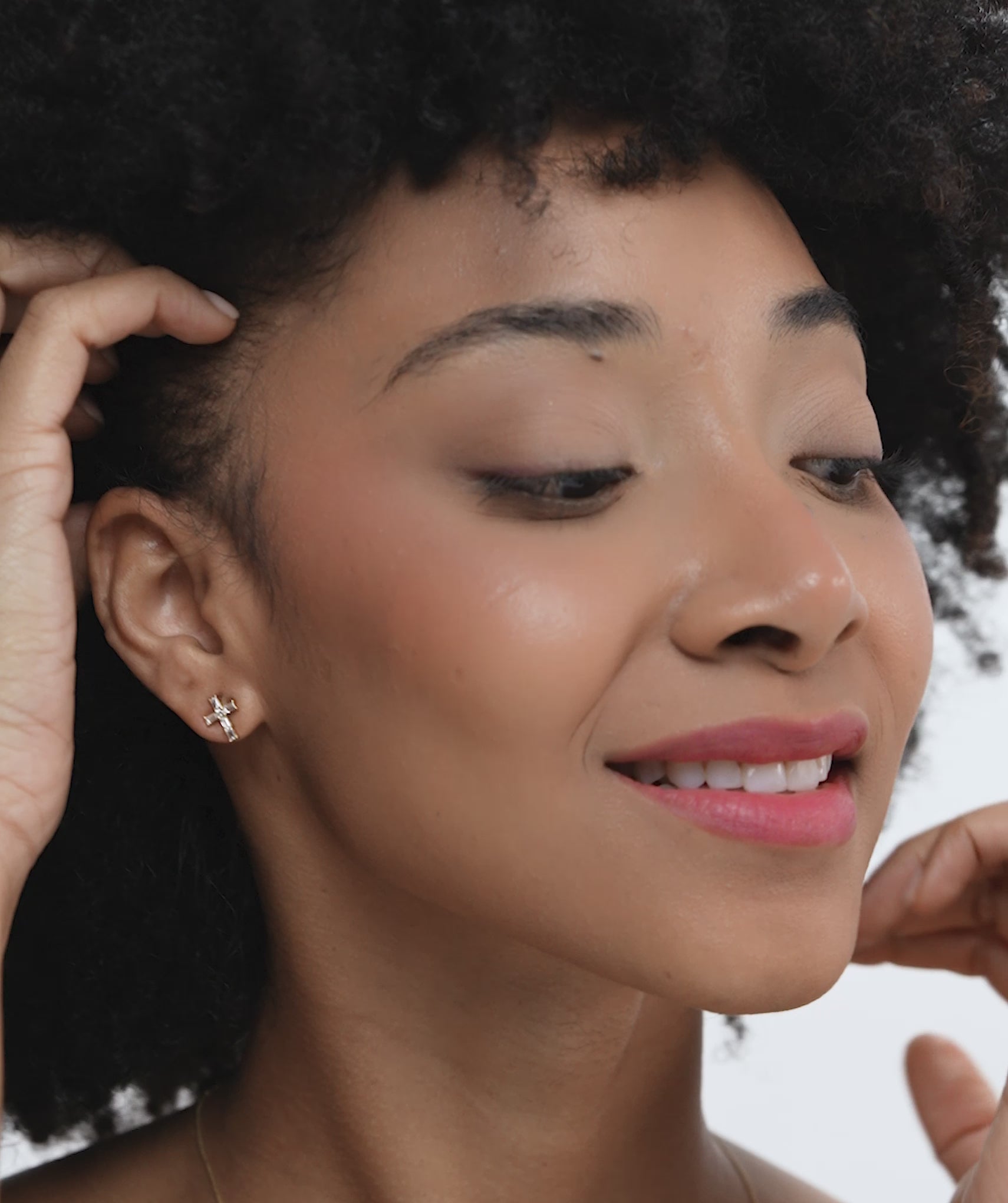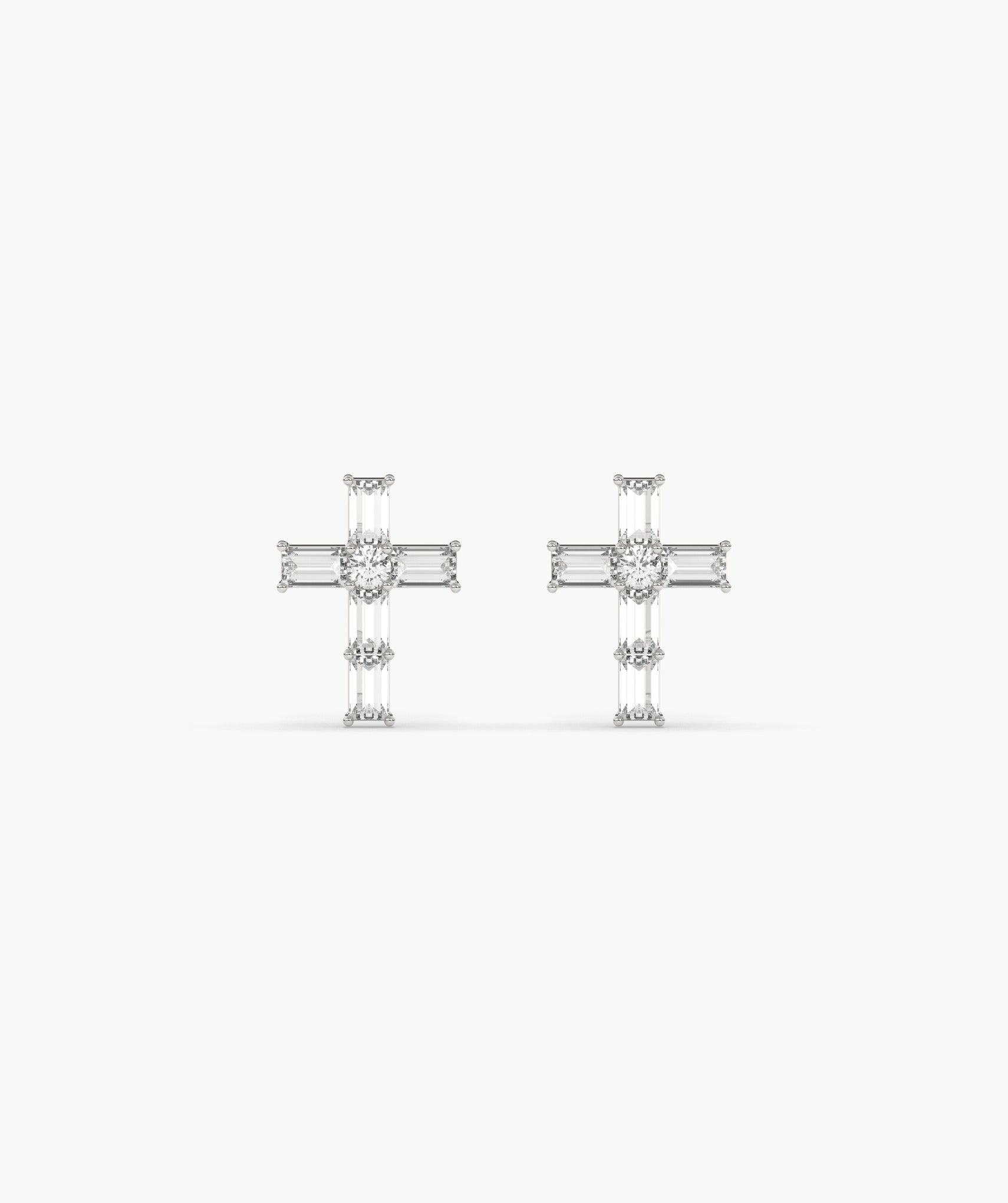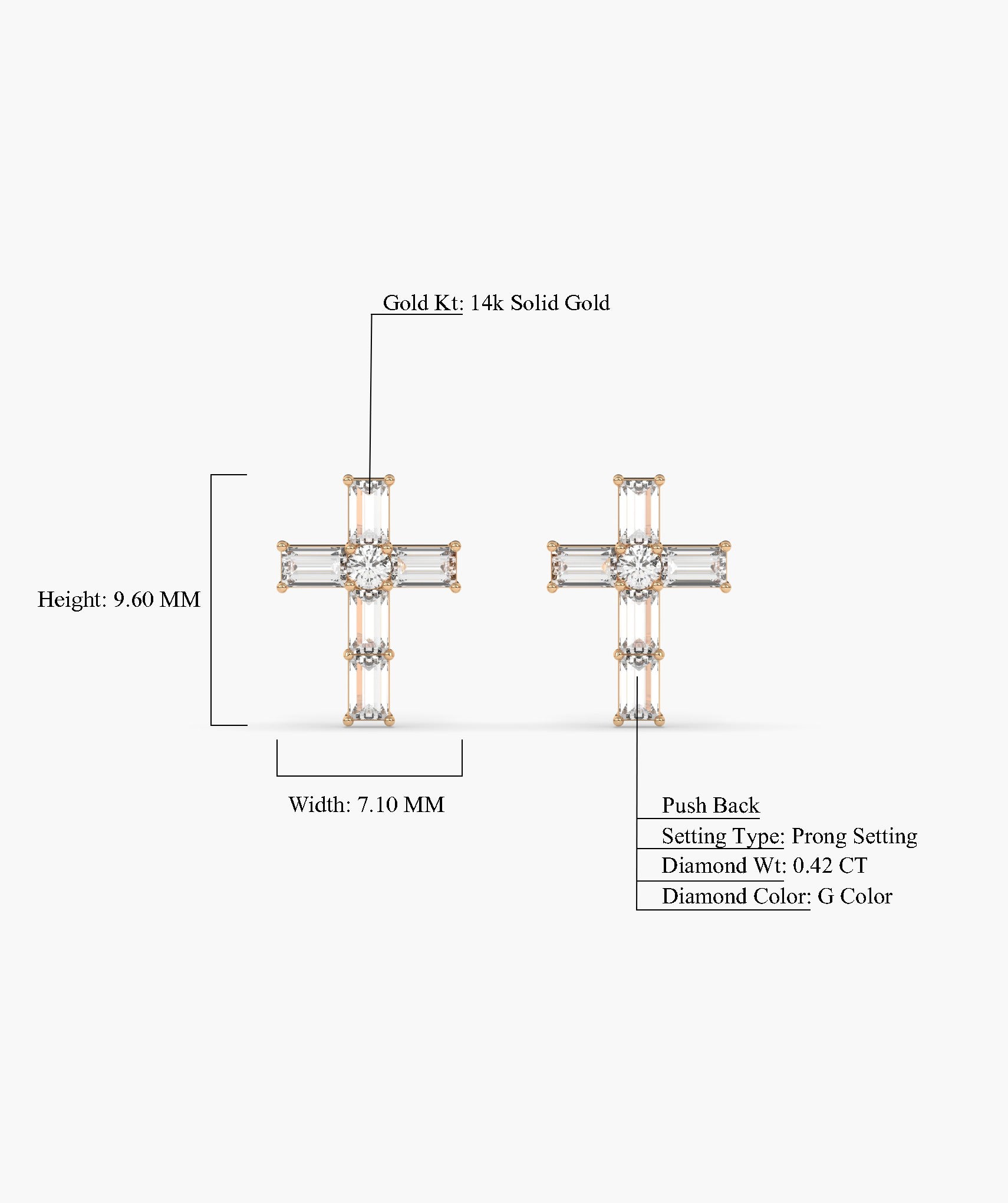 Crafted in 14K solid gold, these cross-shaped stud earrings shine with a mix of baguette and round diamonds, blending devotion with luxury.