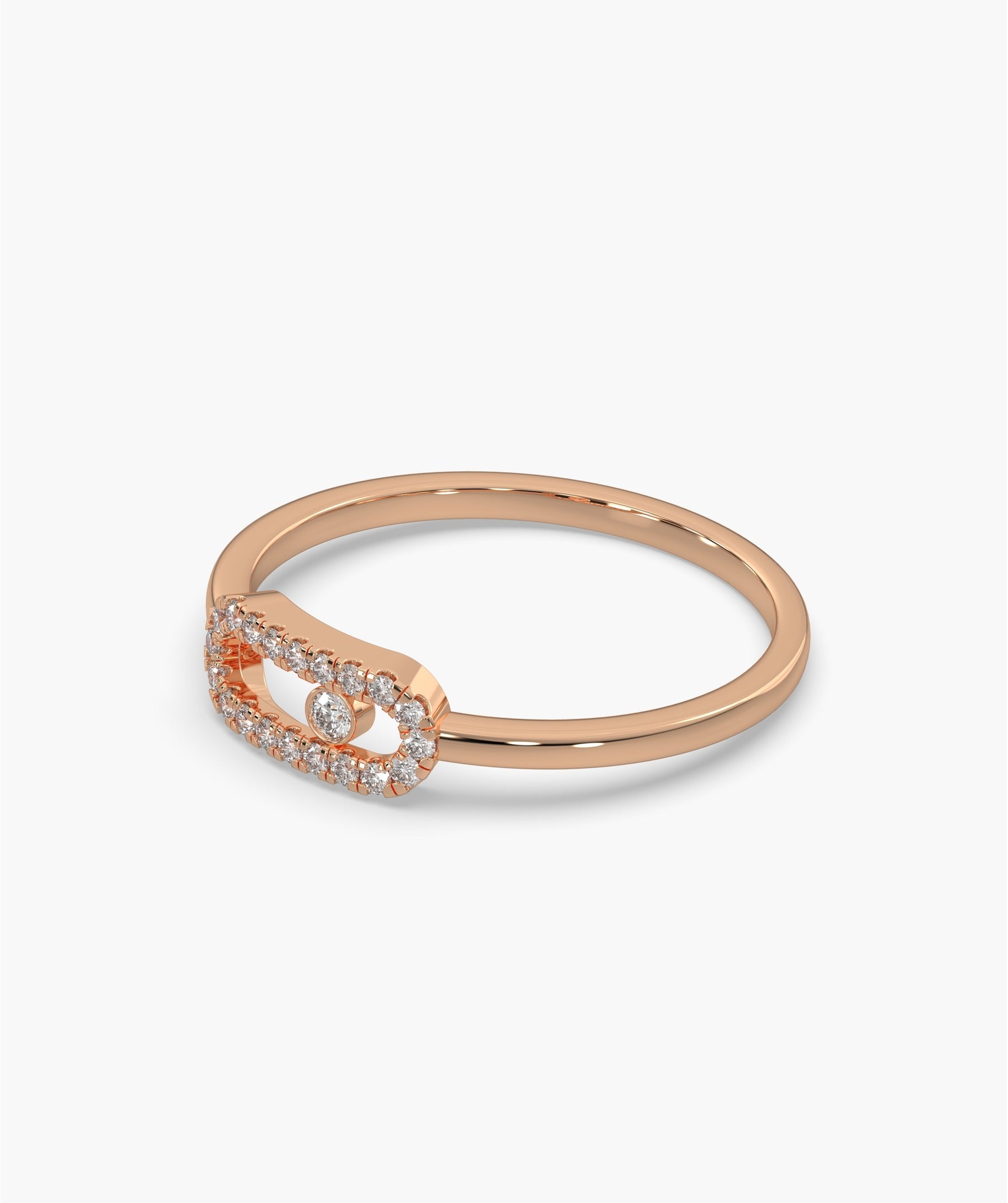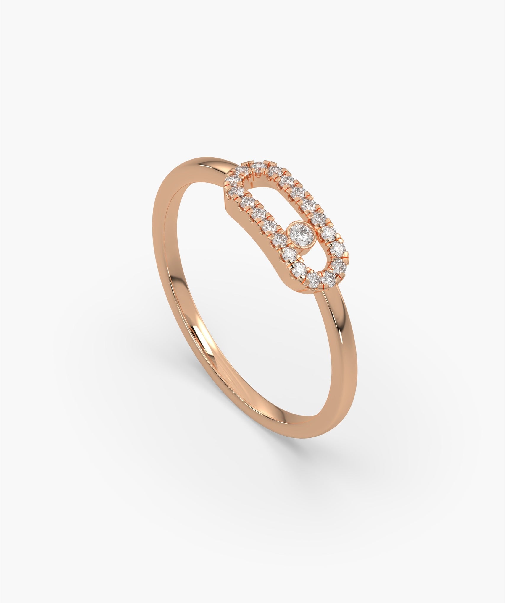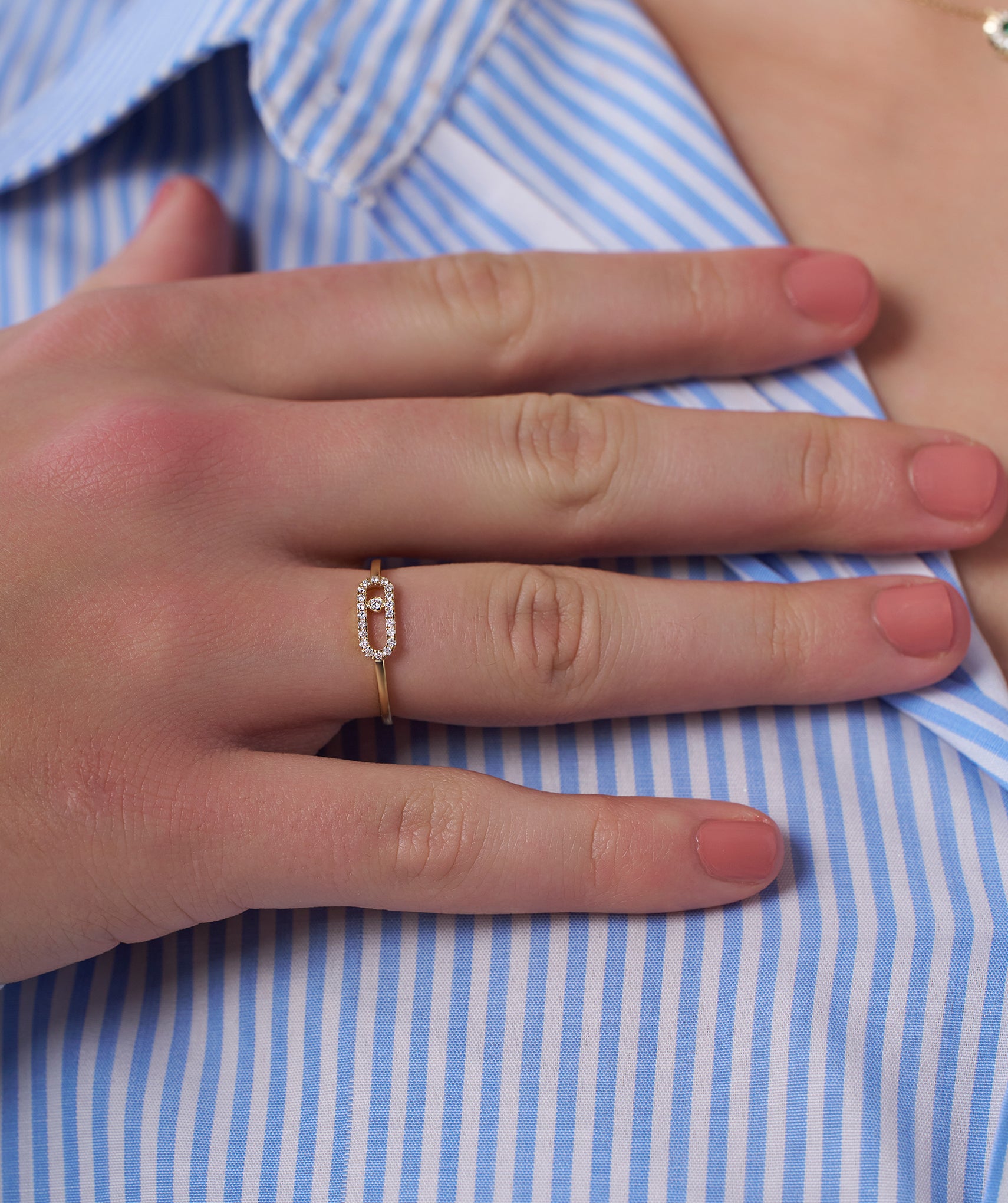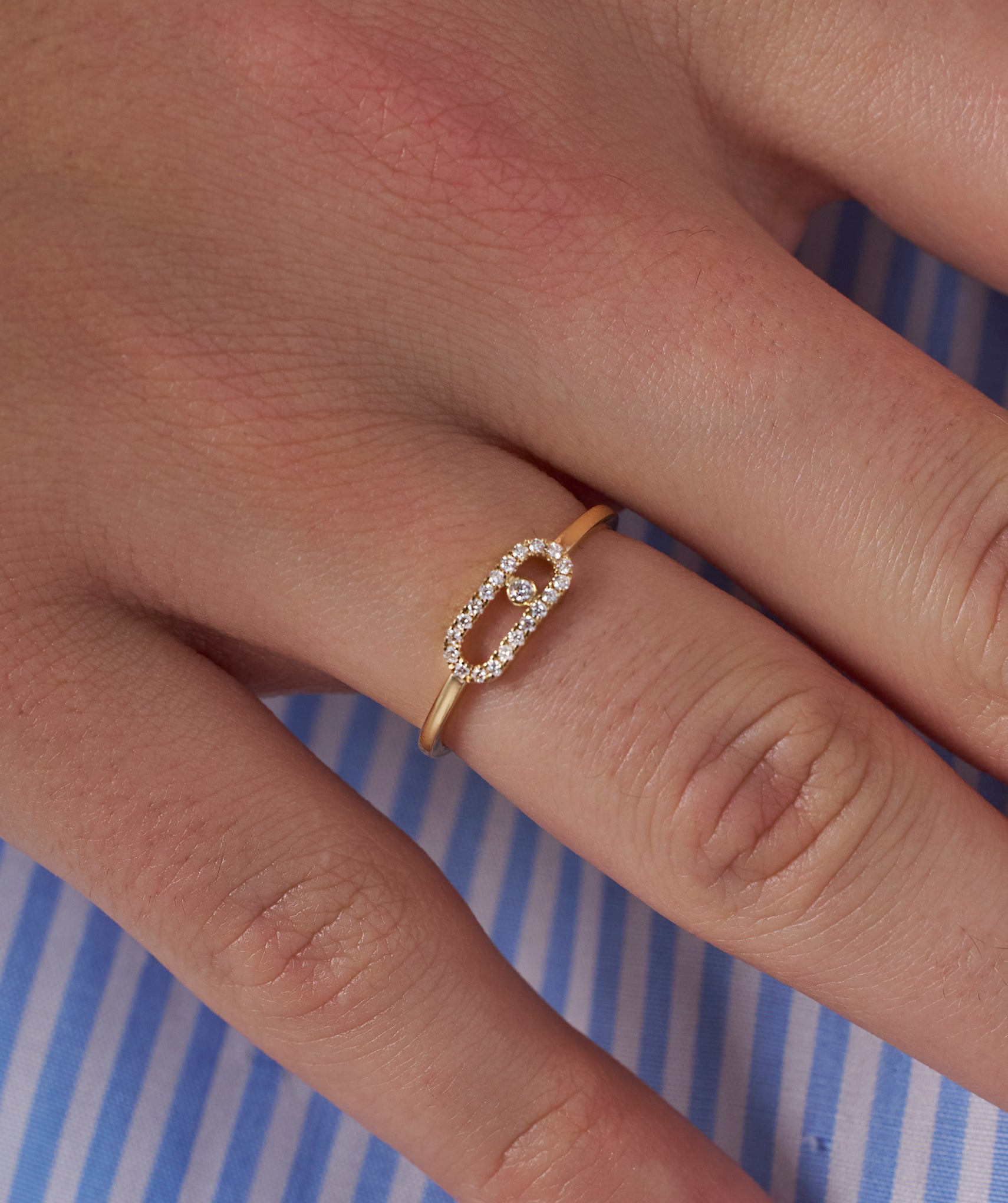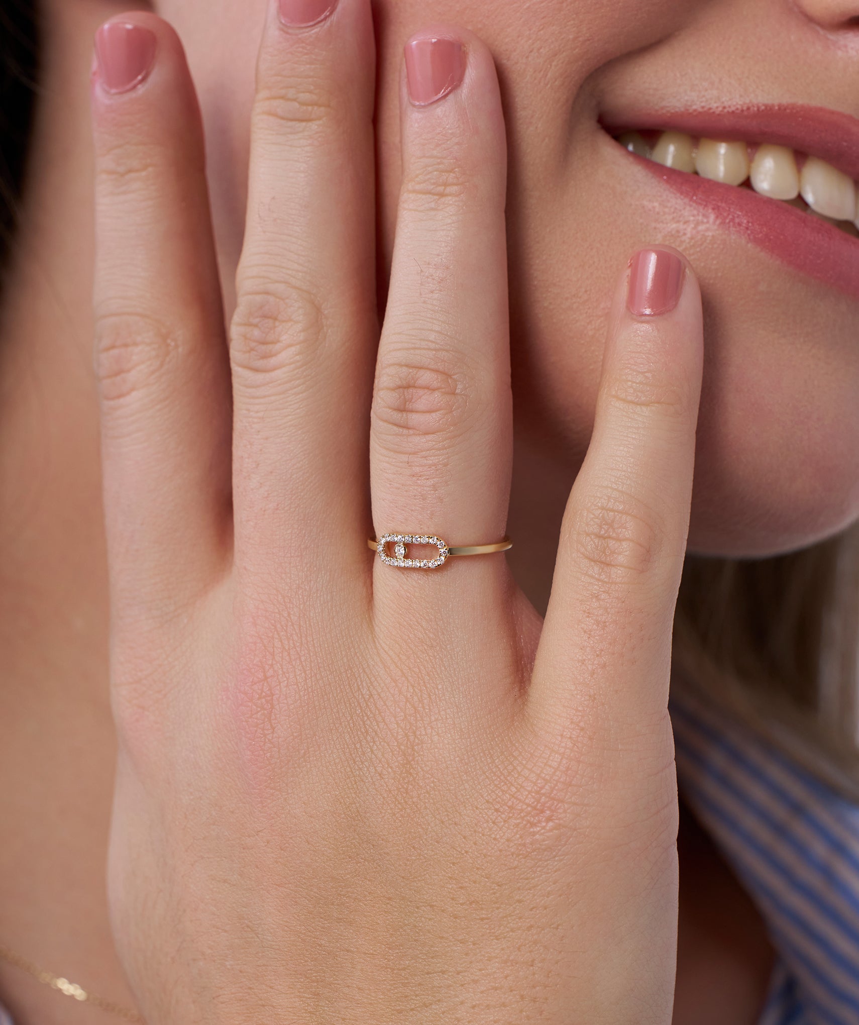 A chic 14K gold ring featuring a diamond-studded link design with a central sparkling diamonds.