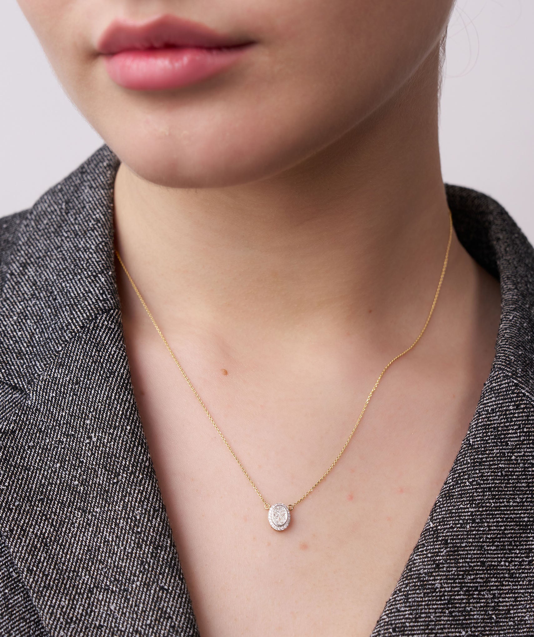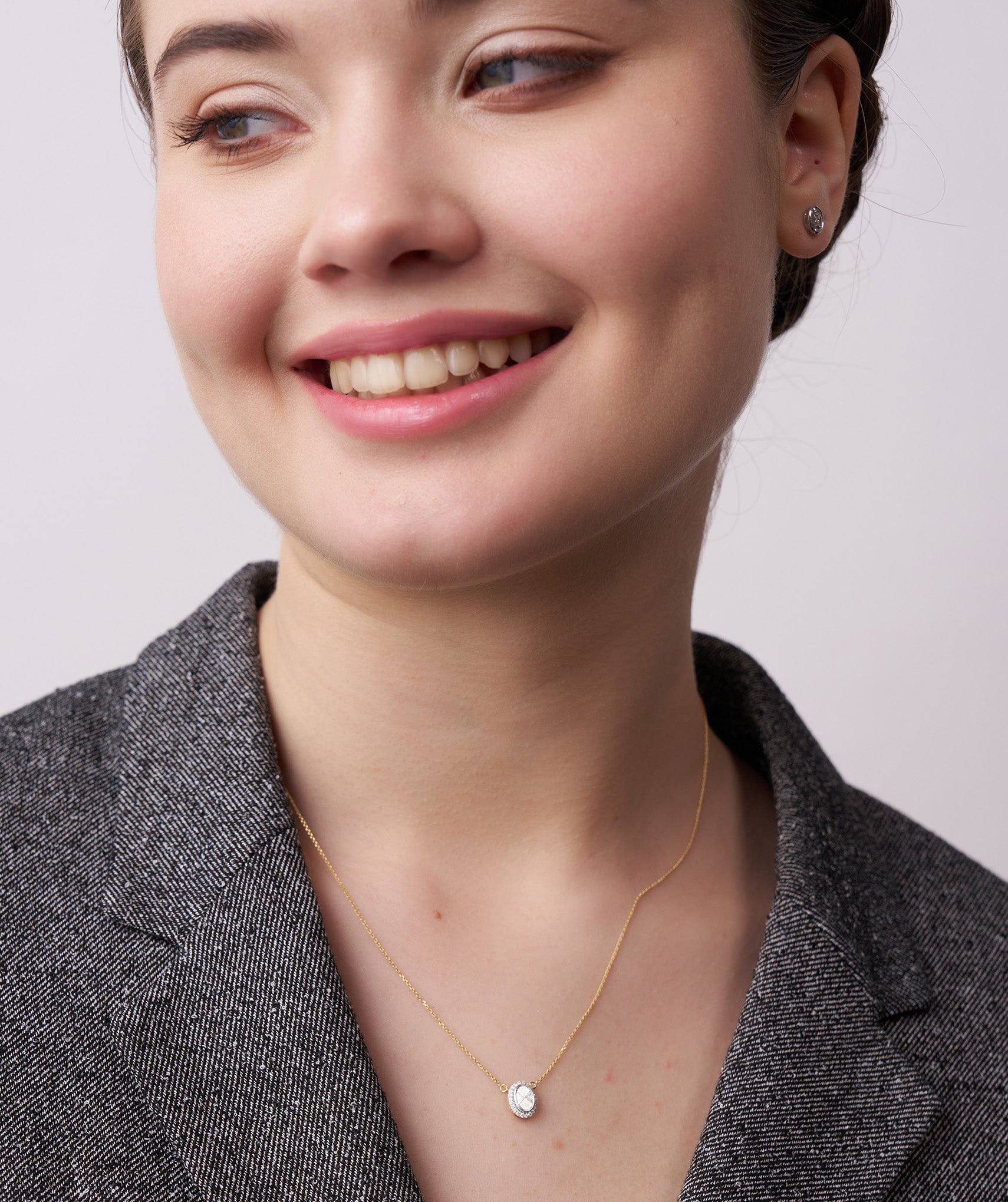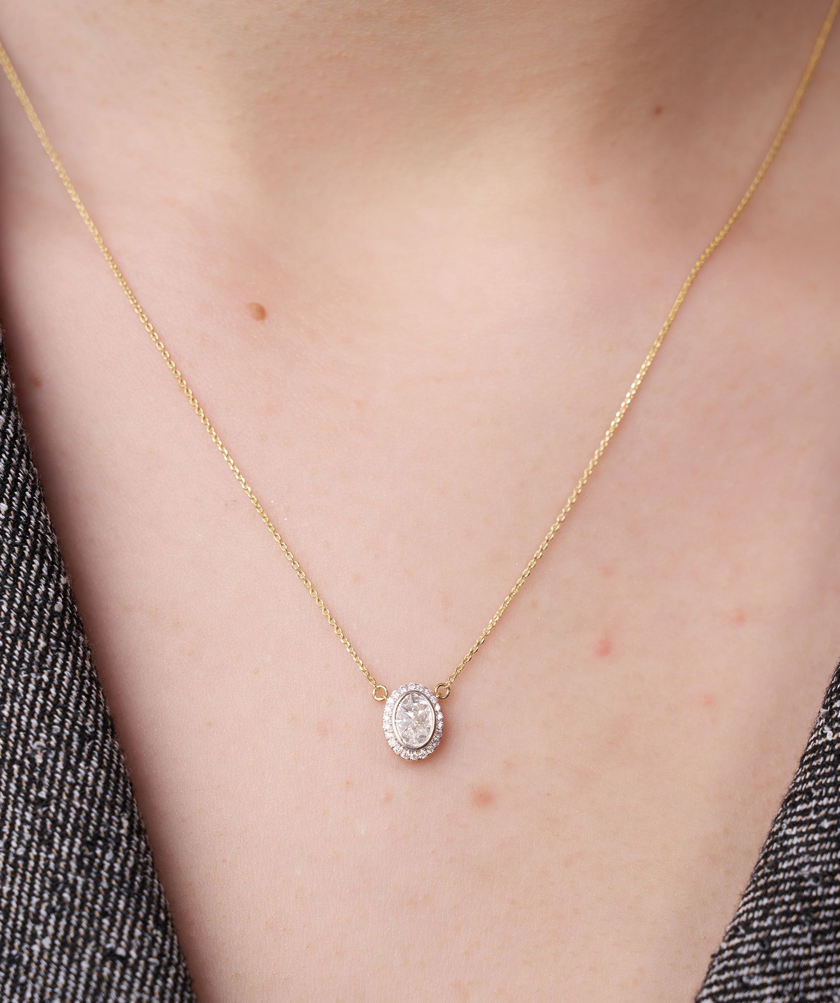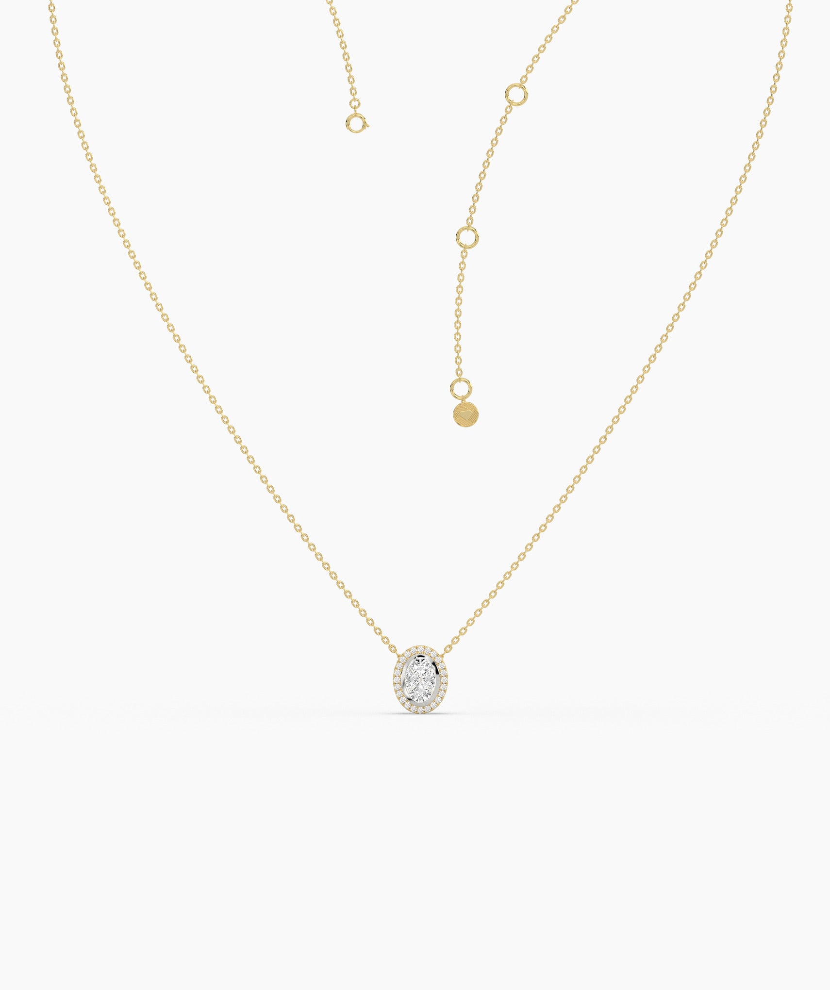Embrace classic elegance with this 14K gold necklace, showcasing a dazzling oval diamond framed by a halo of smaller stones.
