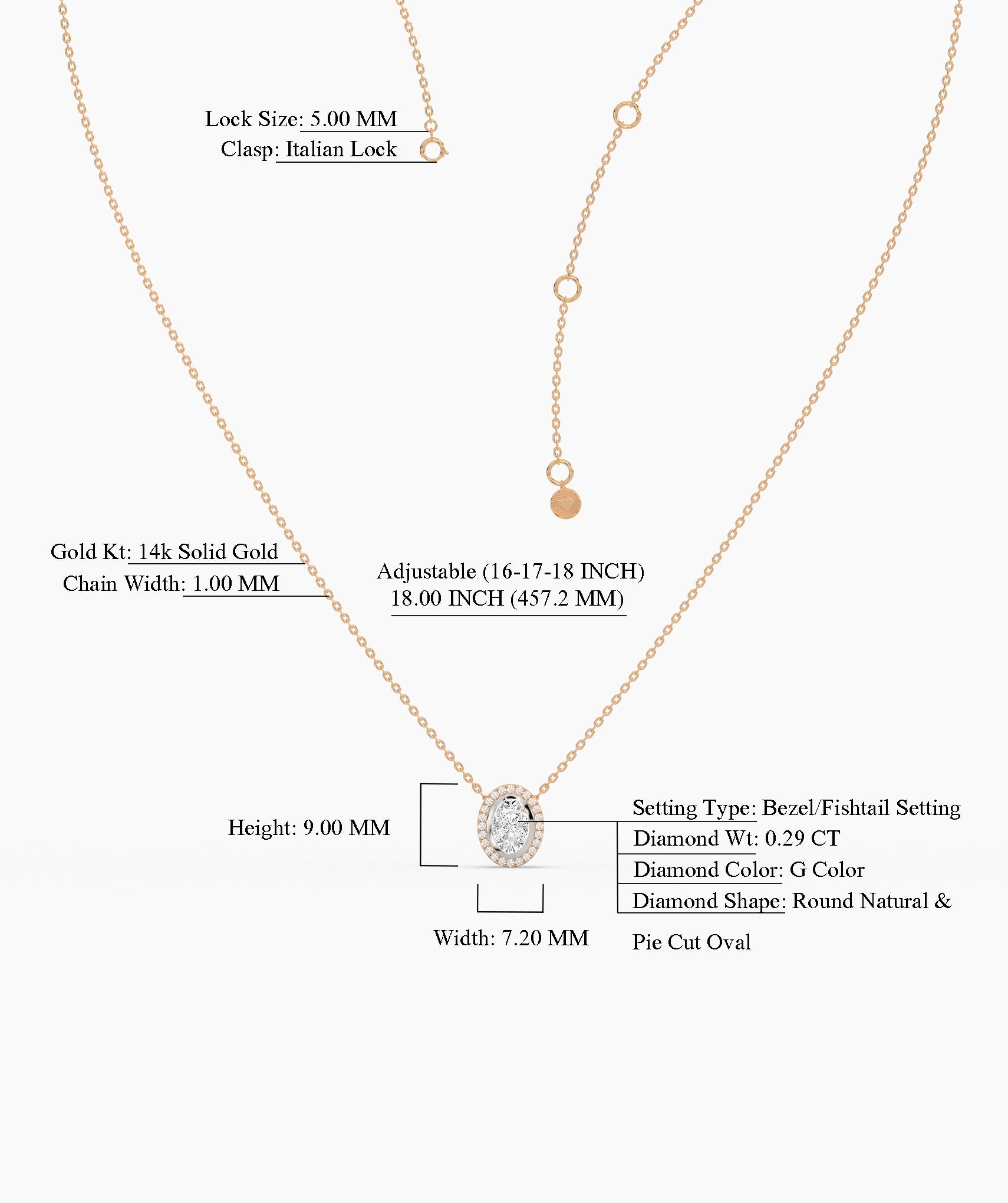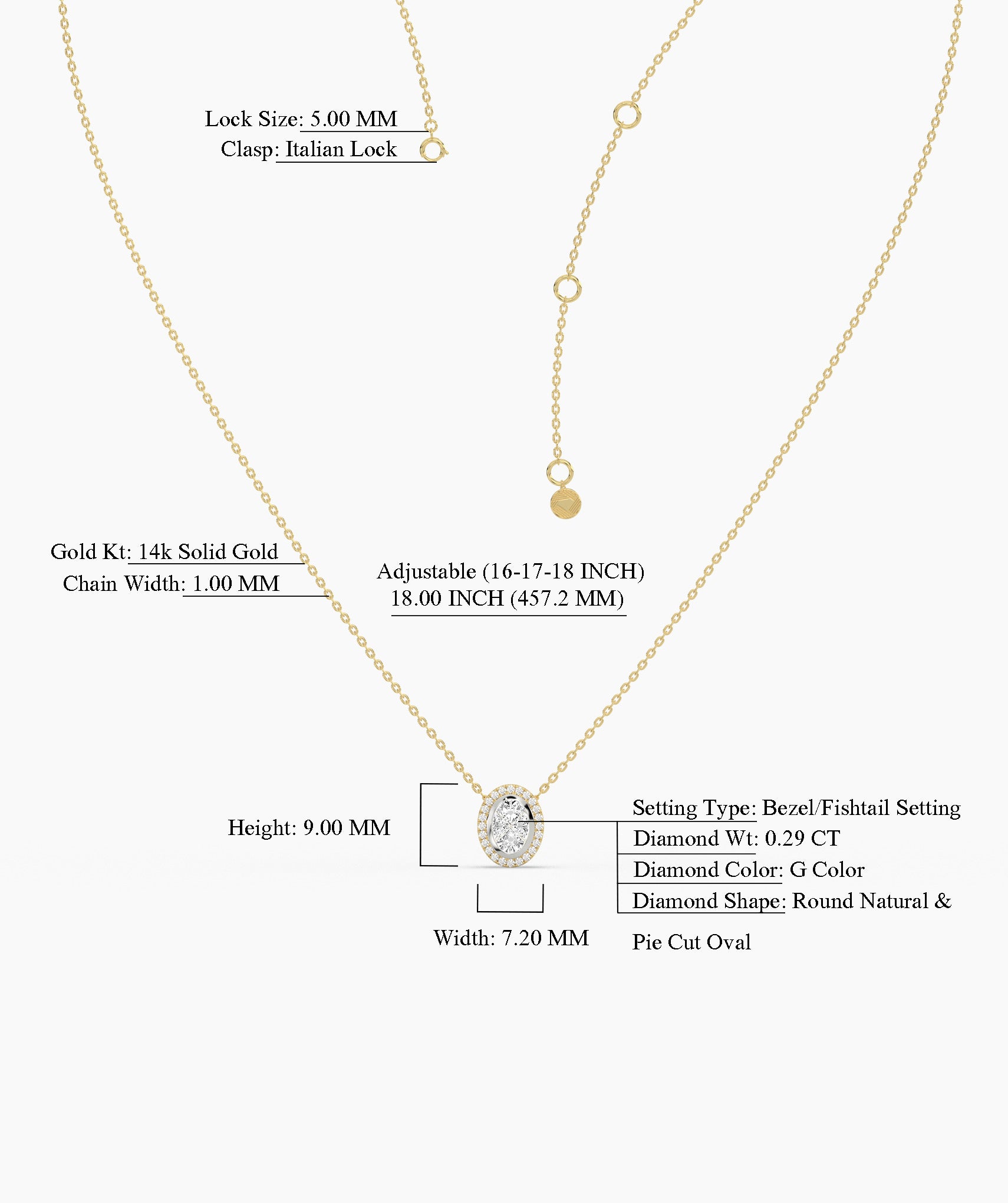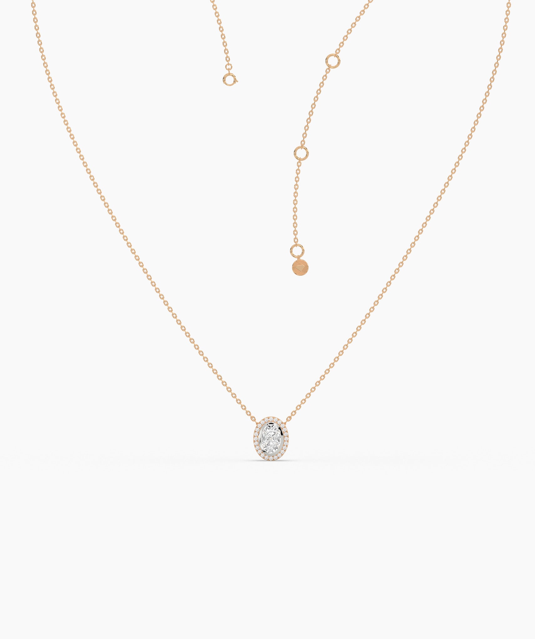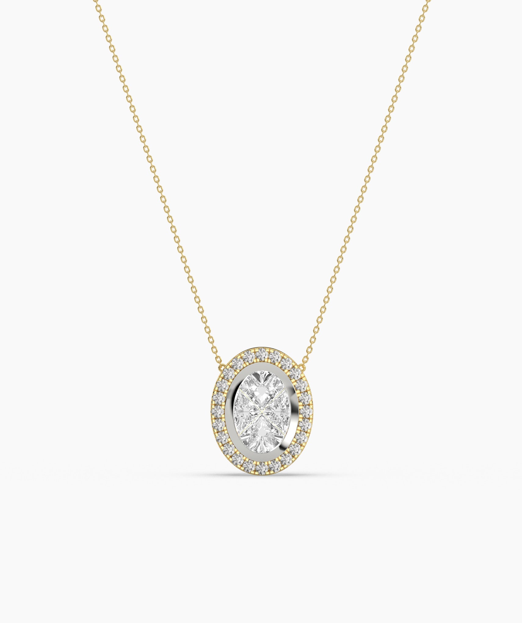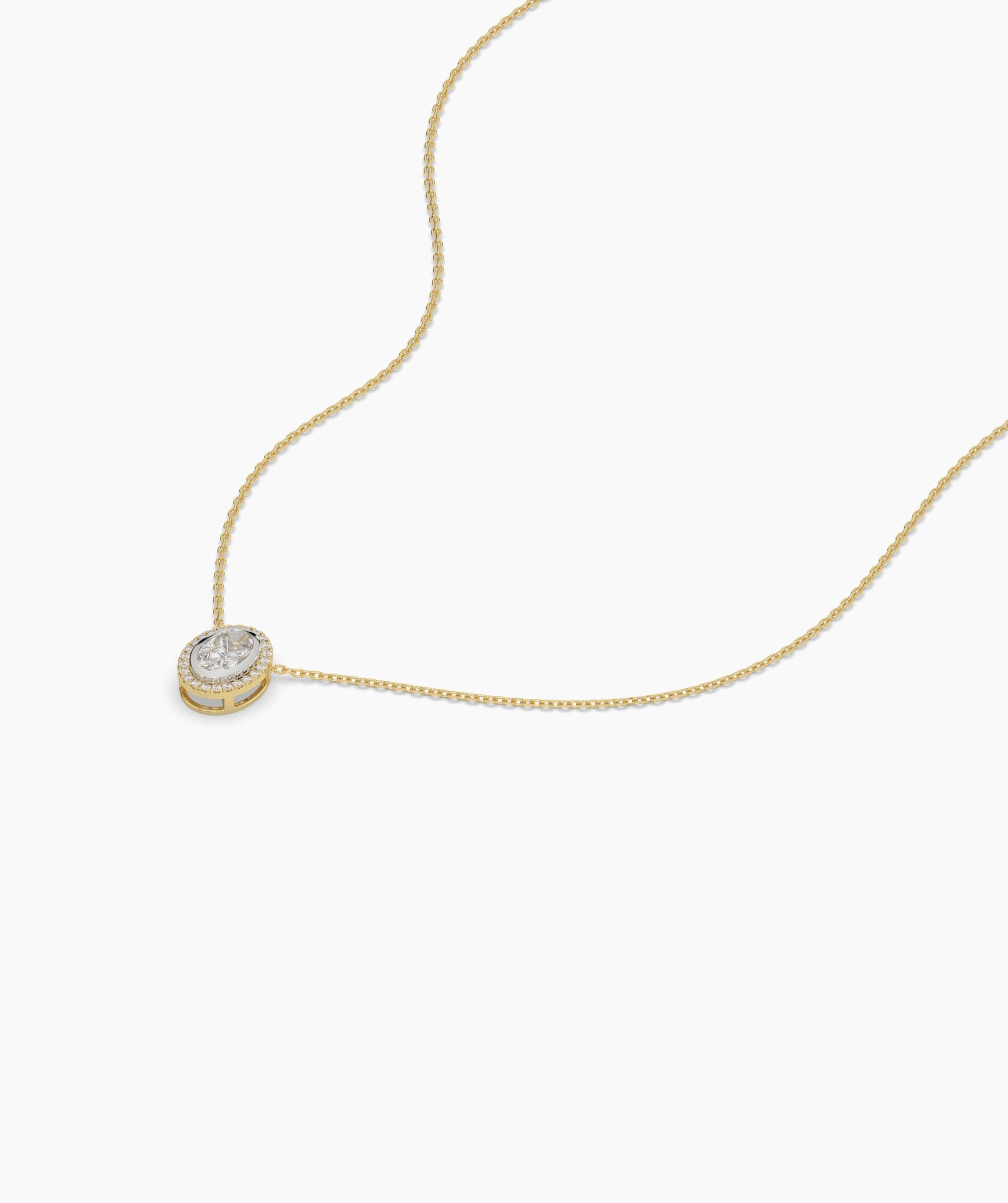 Embrace classic elegance with this 14K gold necklace, showcasing a dazzling oval diamond framed by a halo of smaller stones.