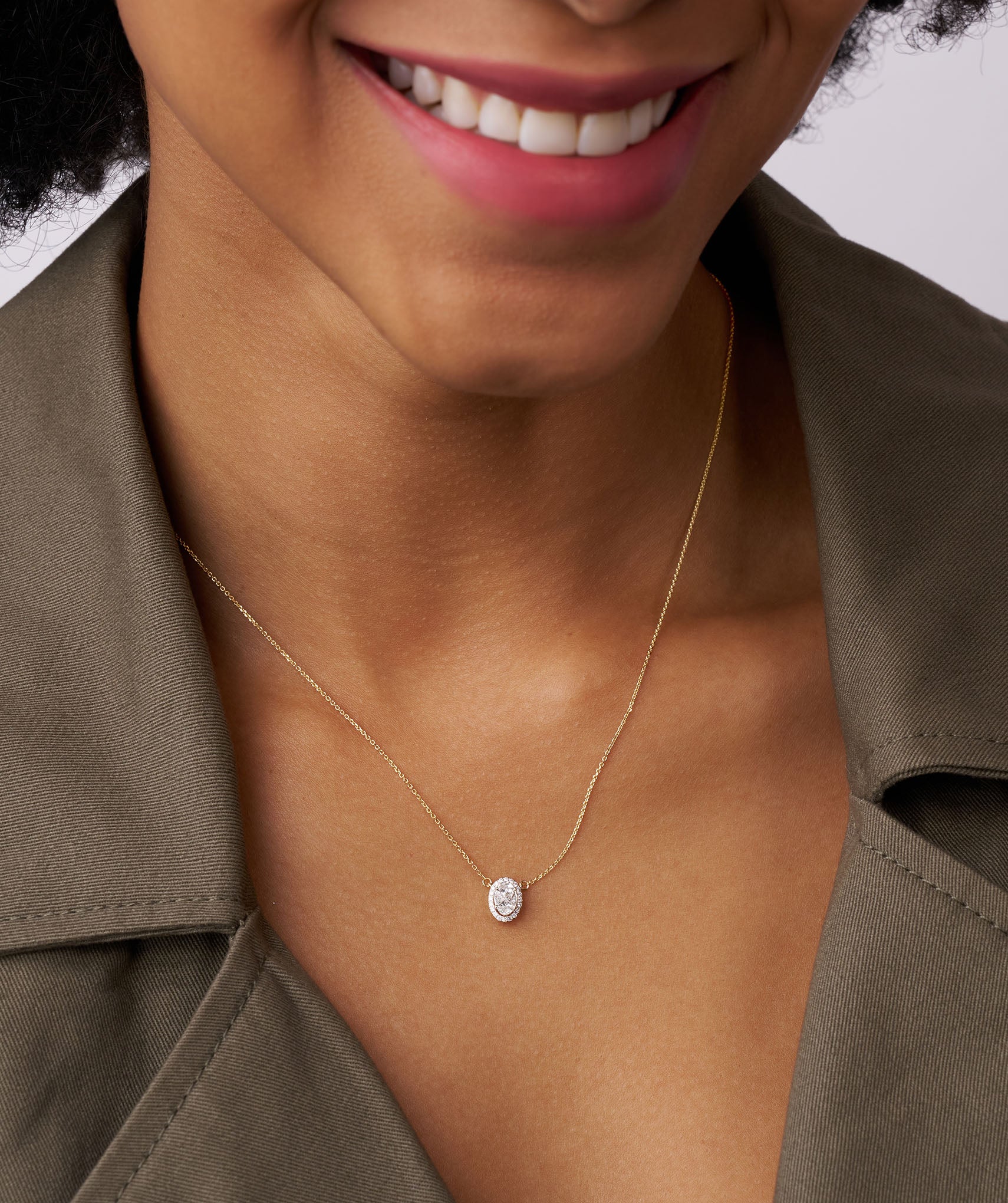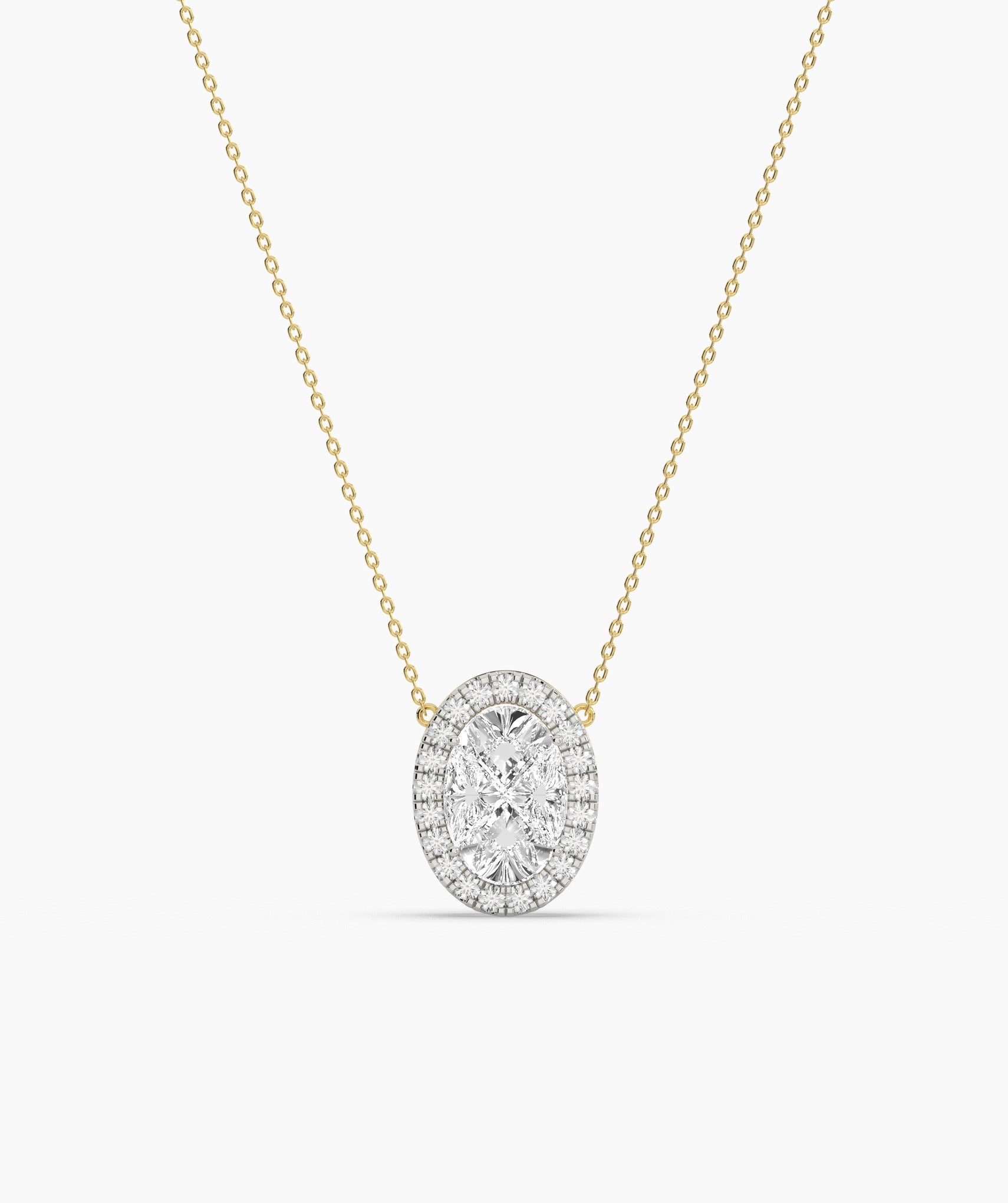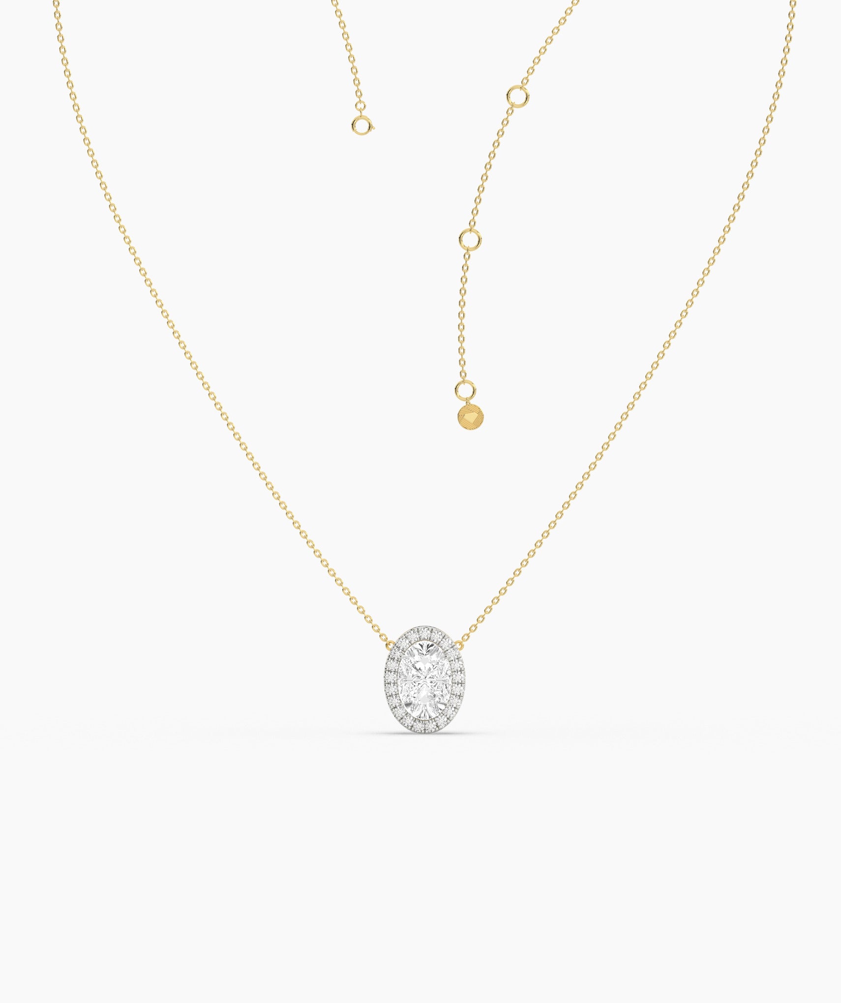 A timeless statement piece—this oval-cut diamond pendant features a luminous halo design set in warm gold.