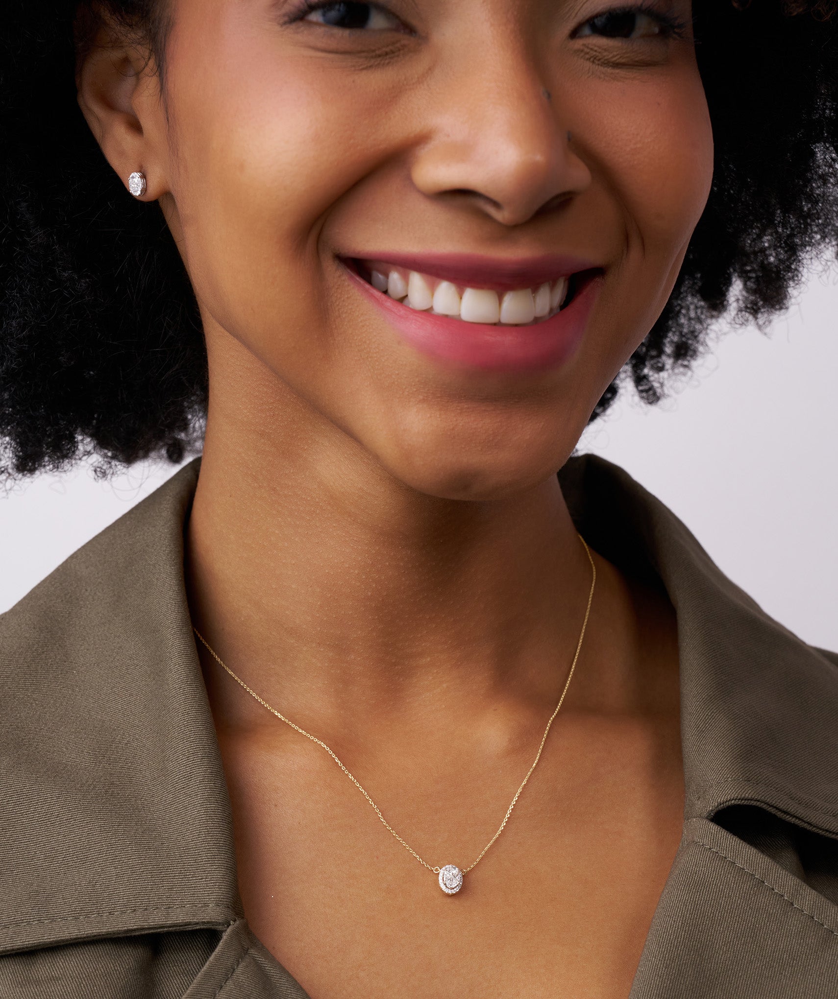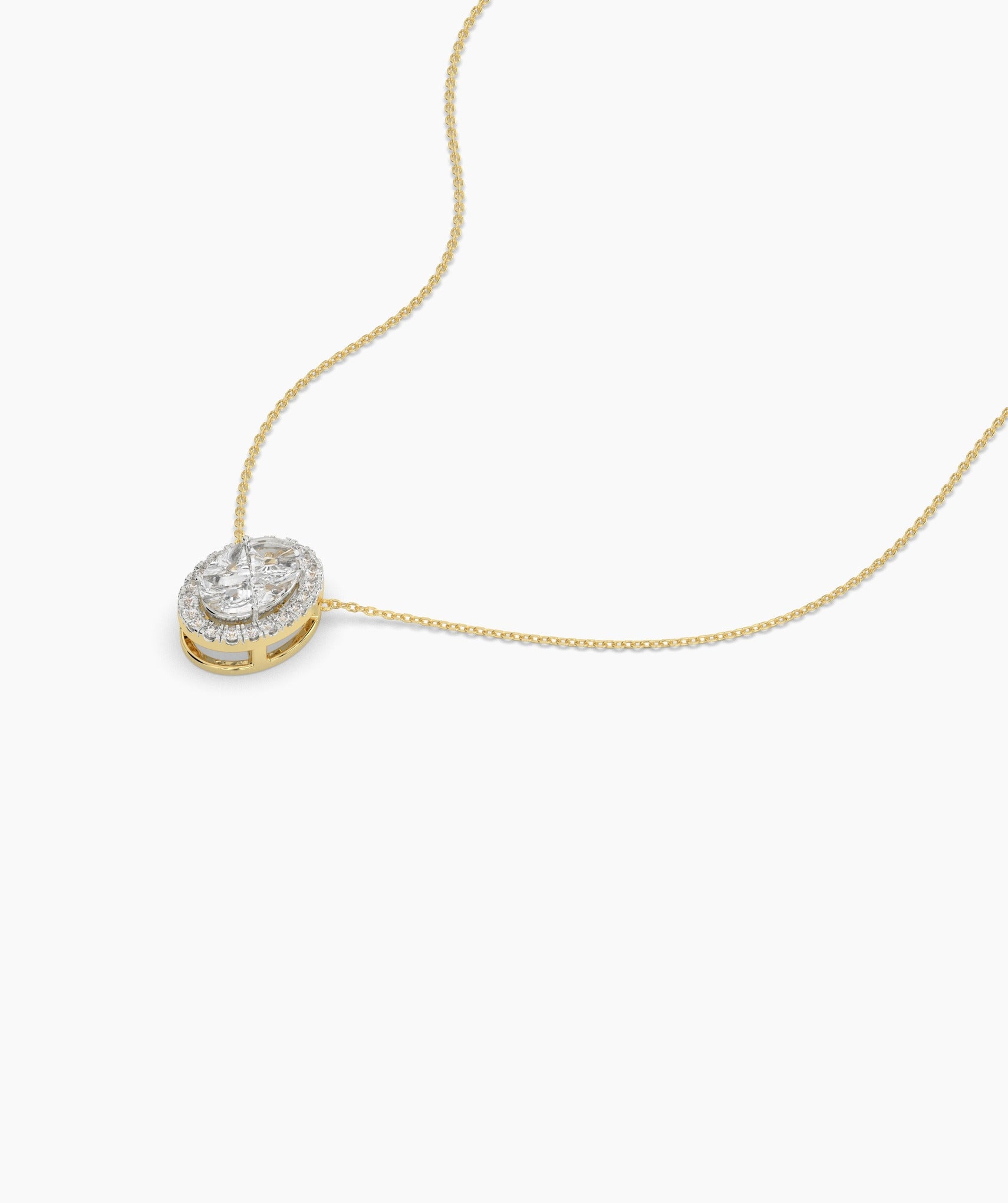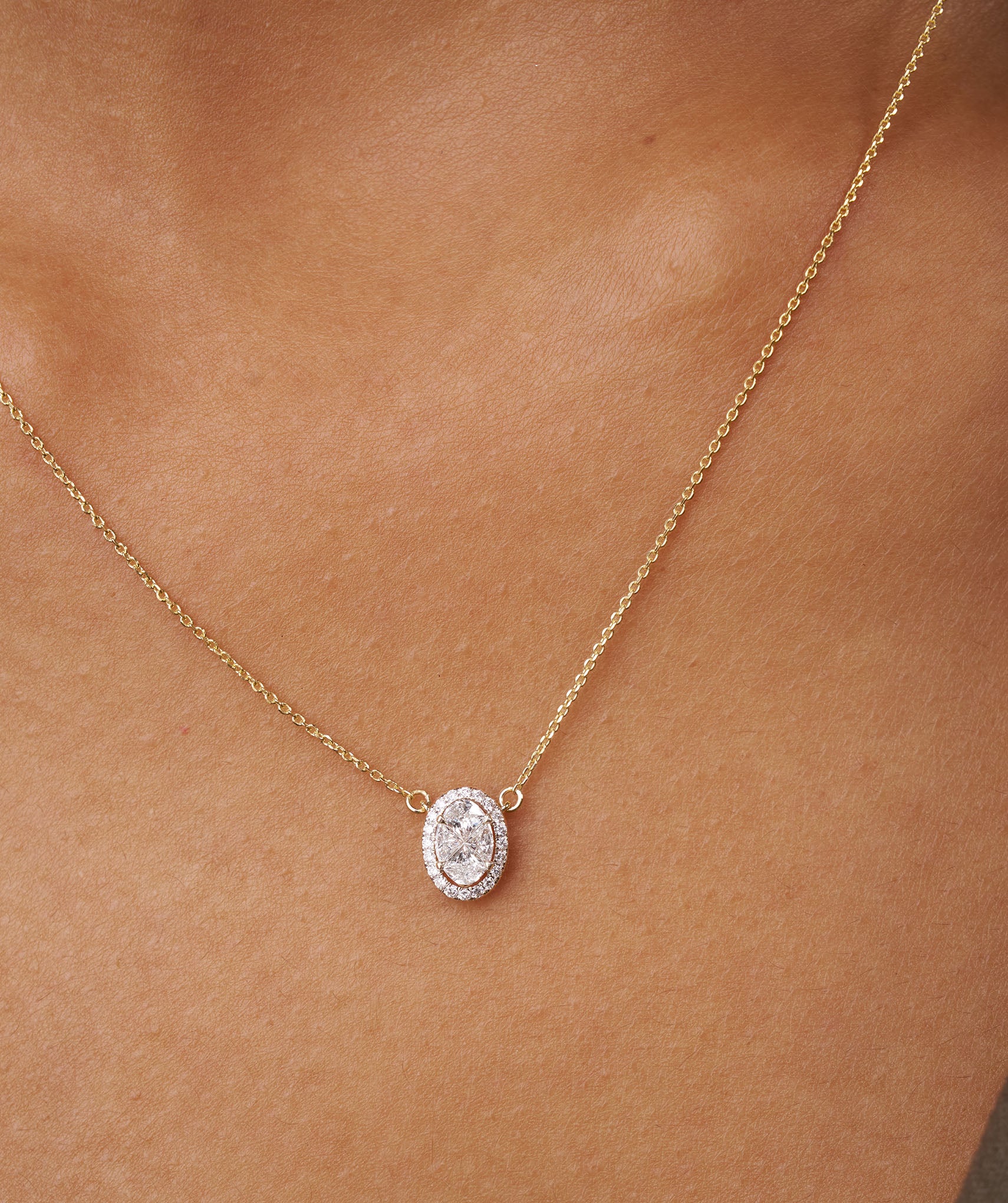 A timeless statement piece—this oval-cut diamond pendant features a luminous halo design set in warm gold.