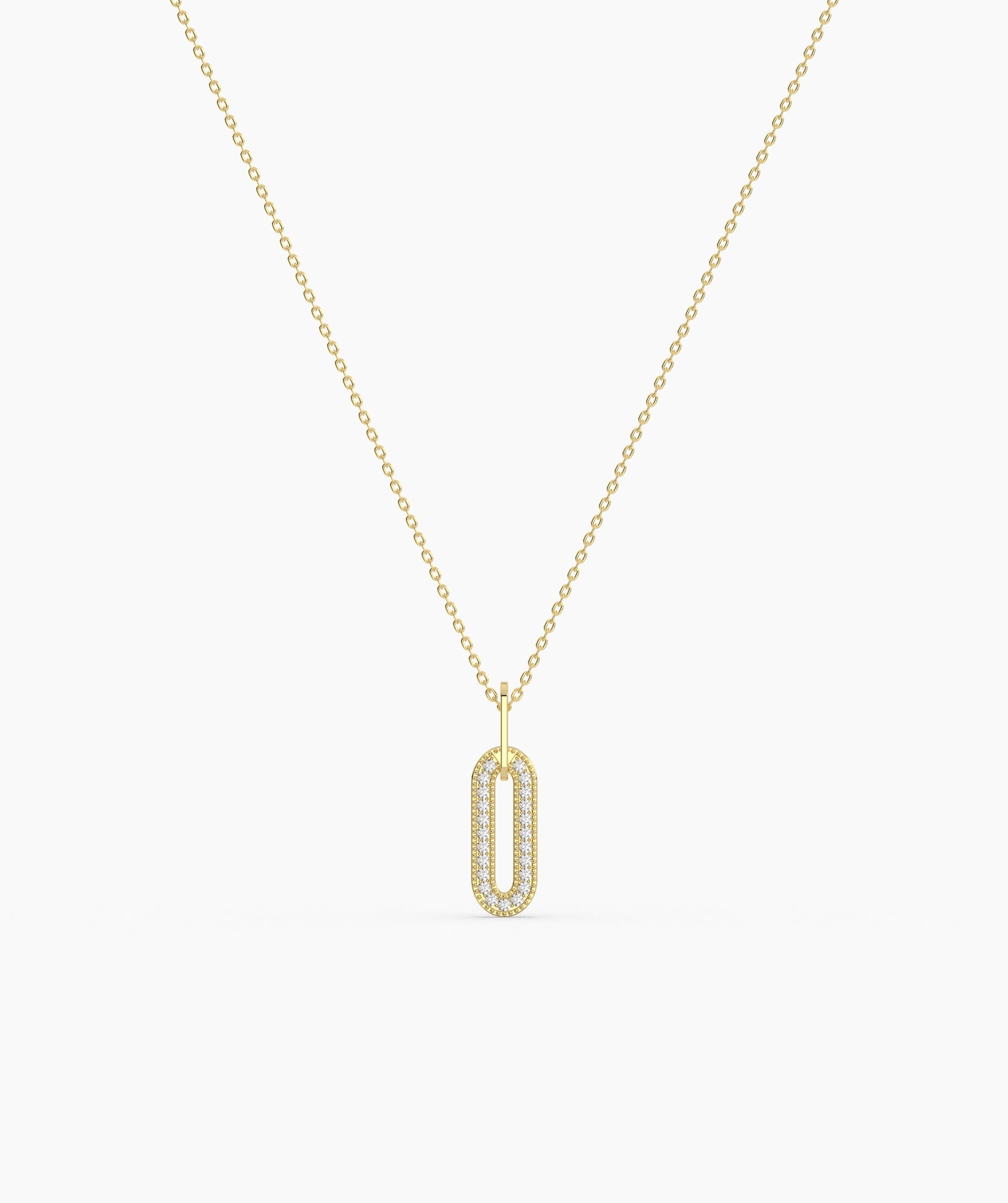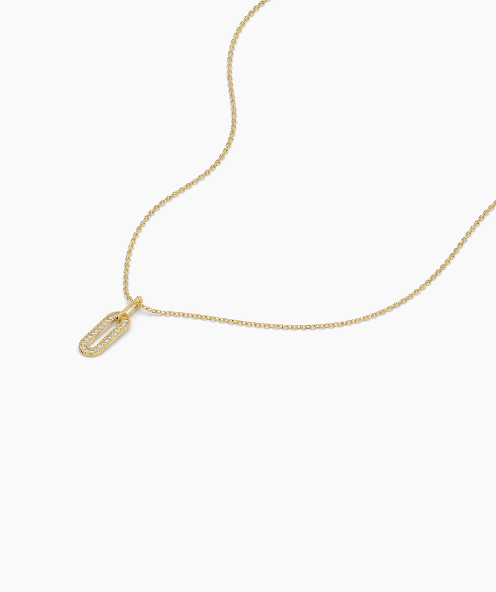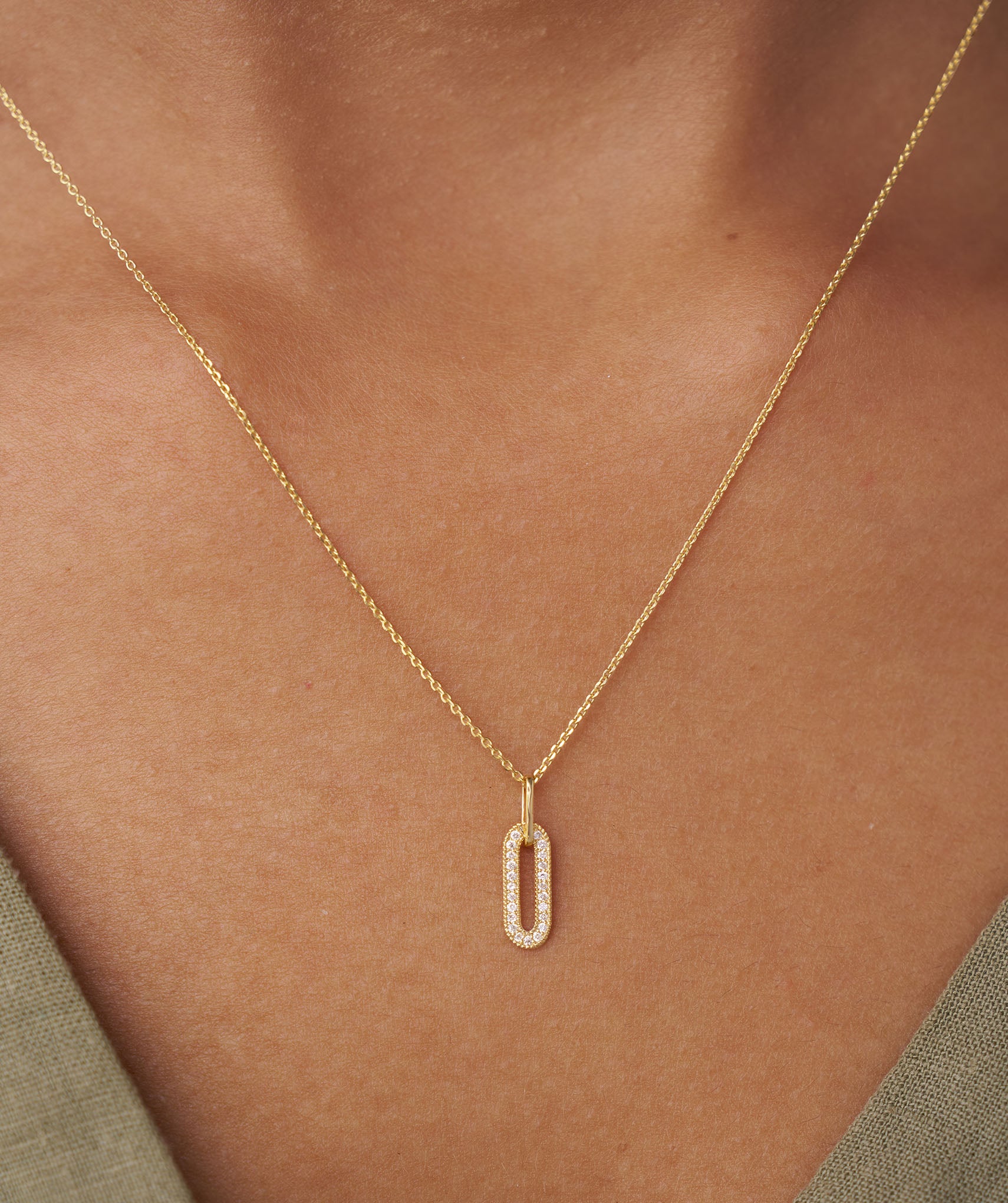 A fresh twist on everyday elegance—this elongated link pendant sparkles with pavé diamonds, suspended from a sleek gold chain.