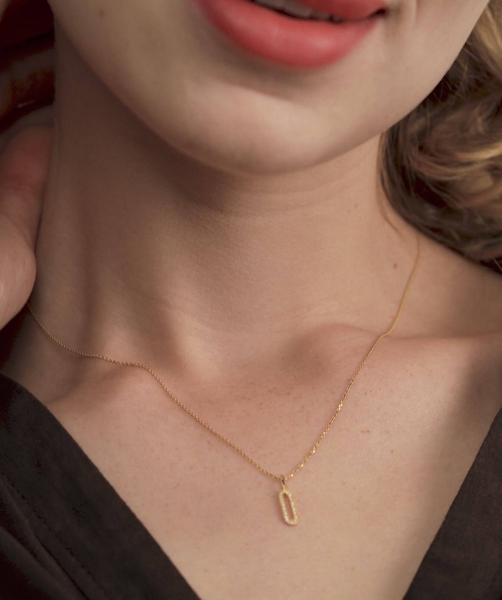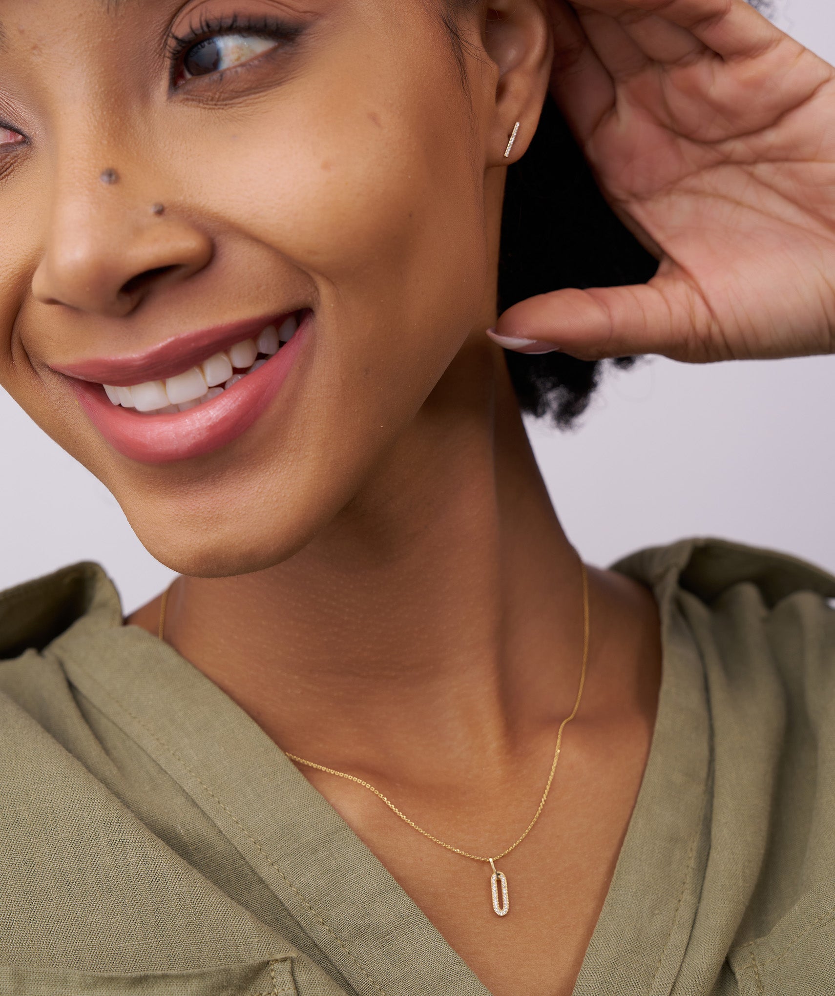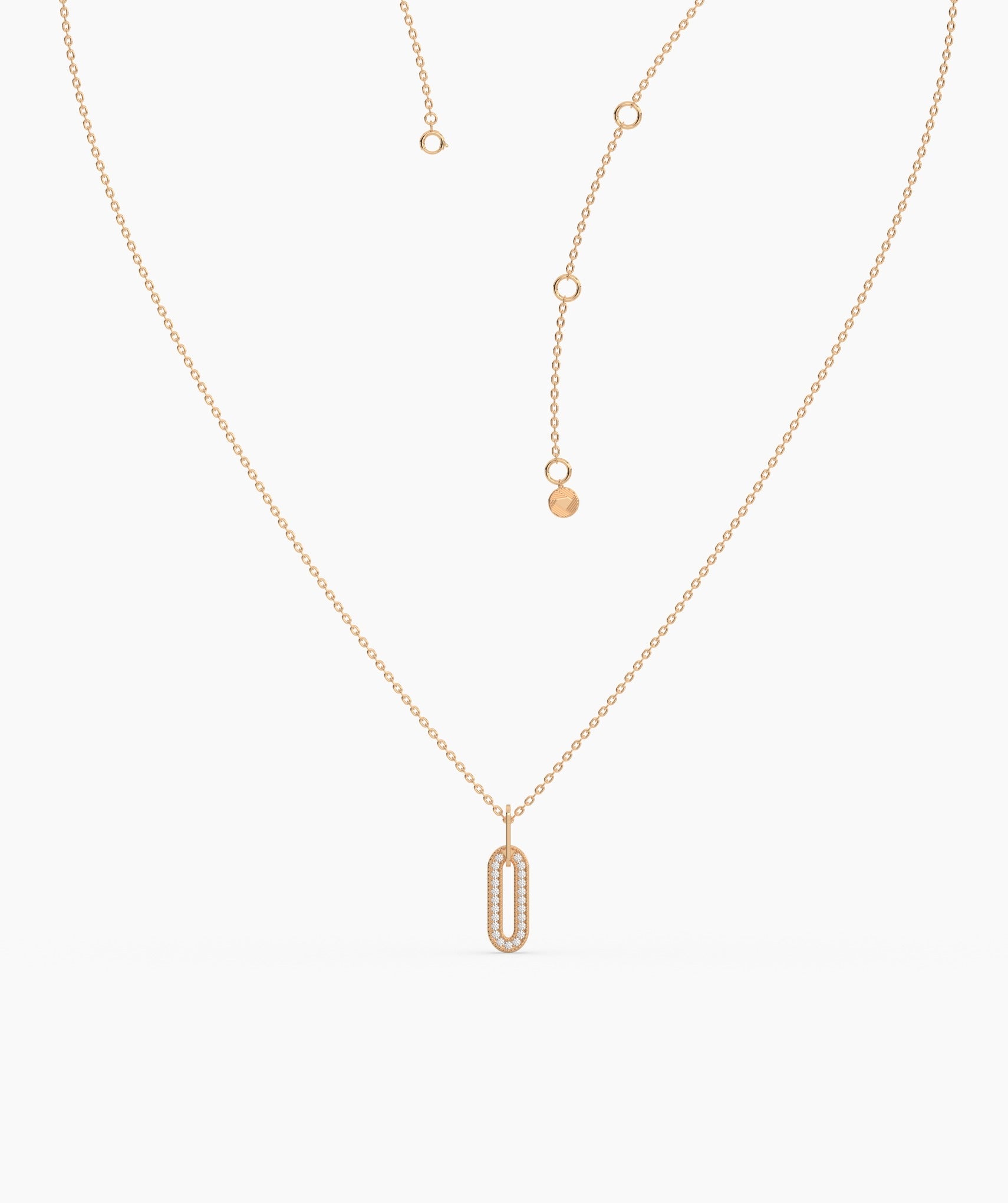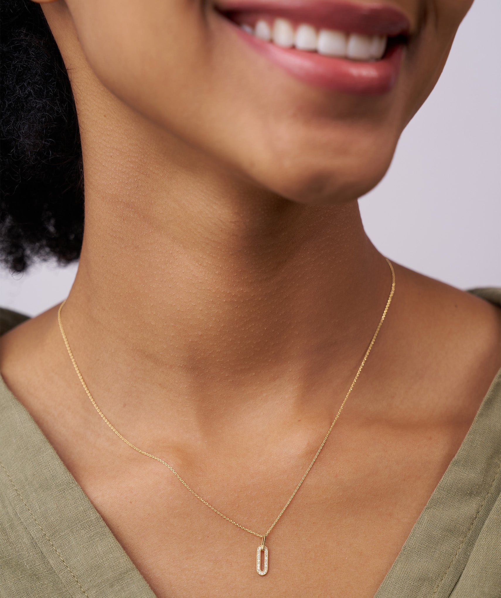 A fresh twist on everyday elegance—this elongated link pendant sparkles with pavé diamonds, suspended from a sleek gold chain.