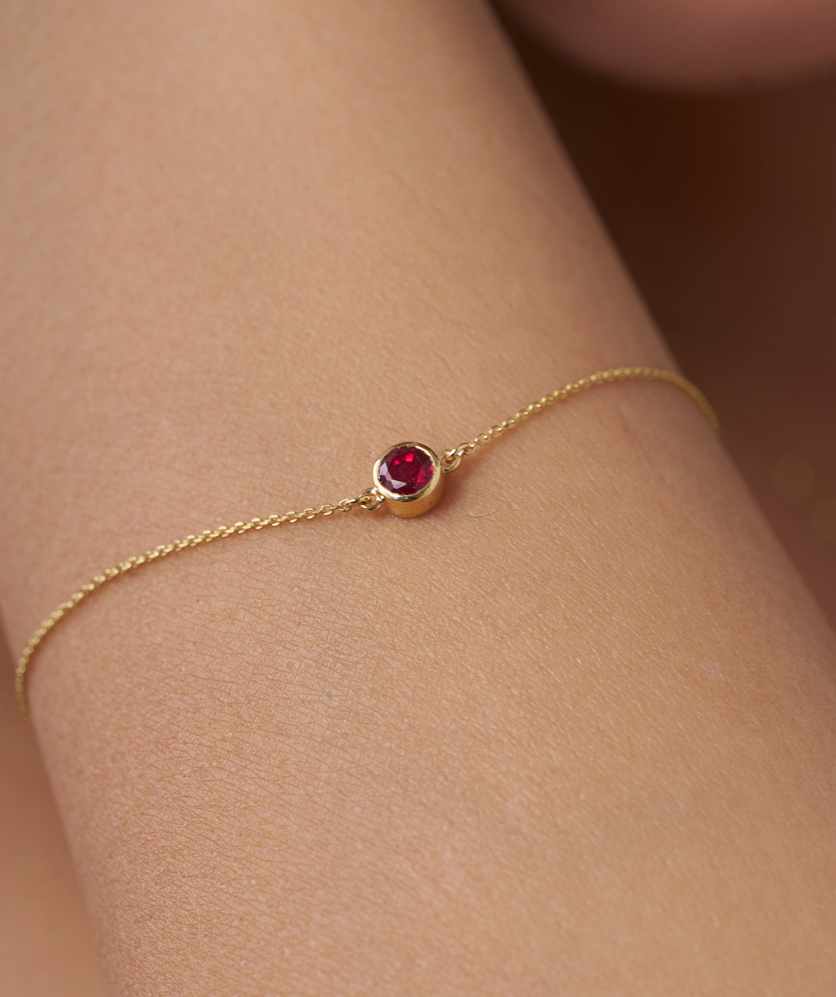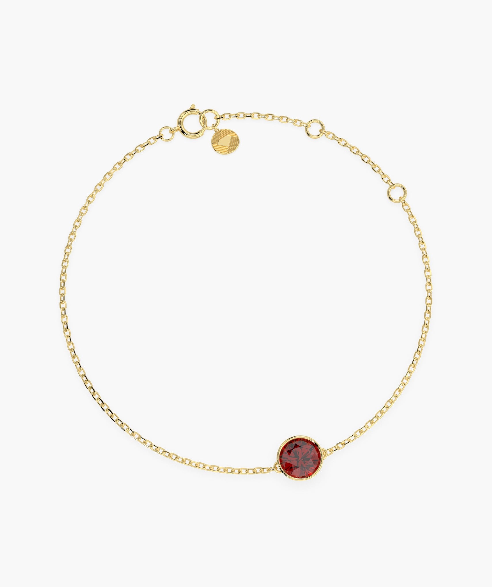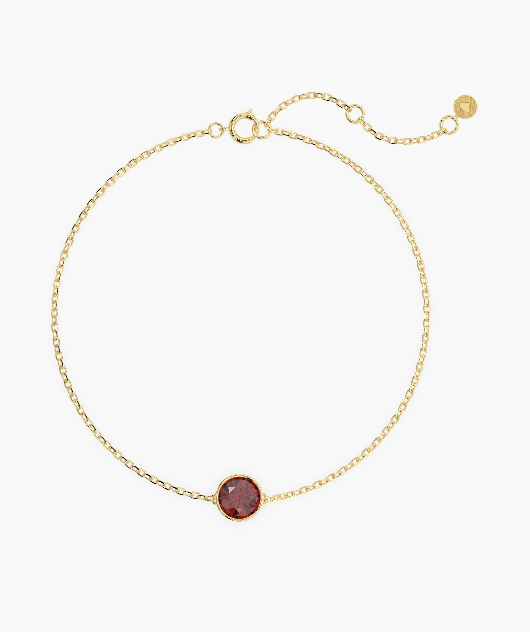 Delicate and elegant, this 14K yellow gold bracelet features a striking round-cut garnet in a bezel setting.