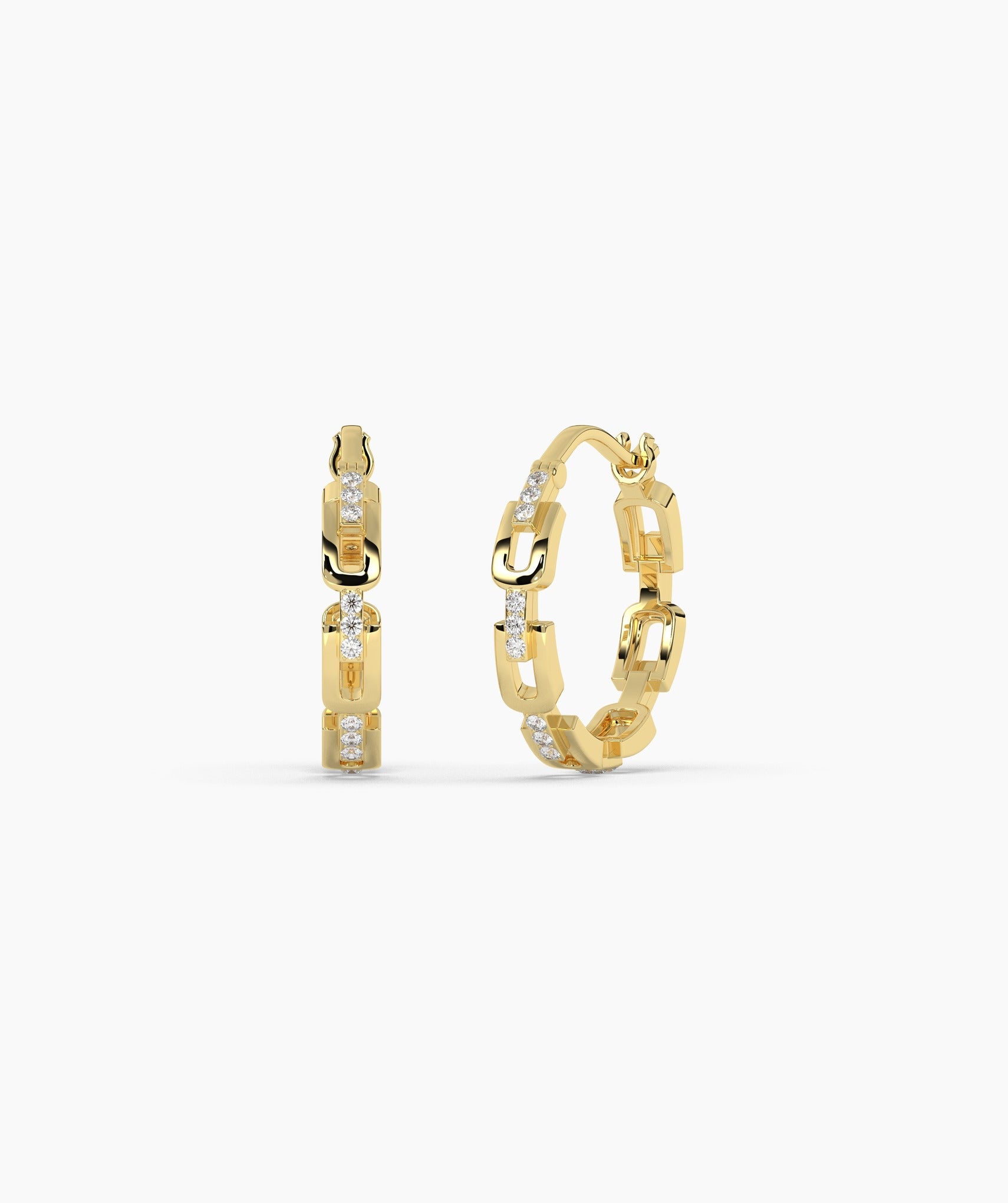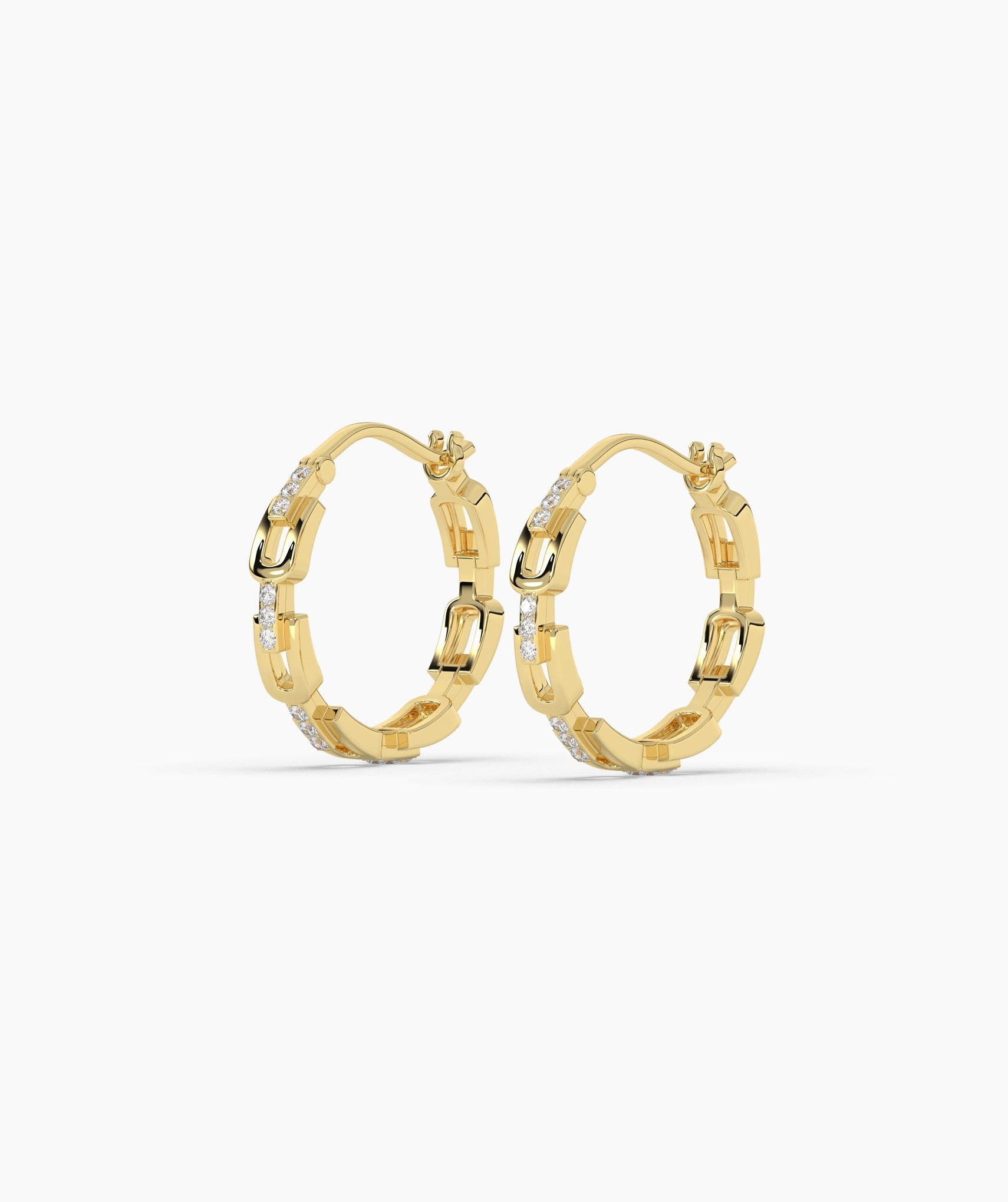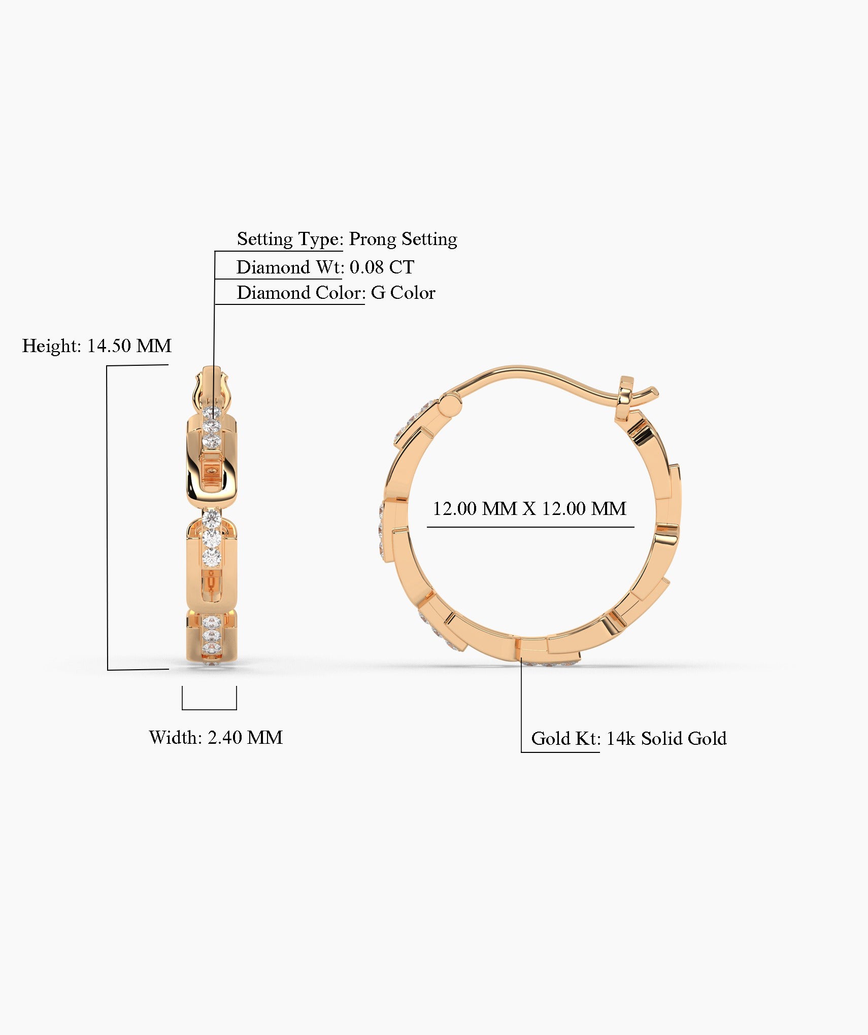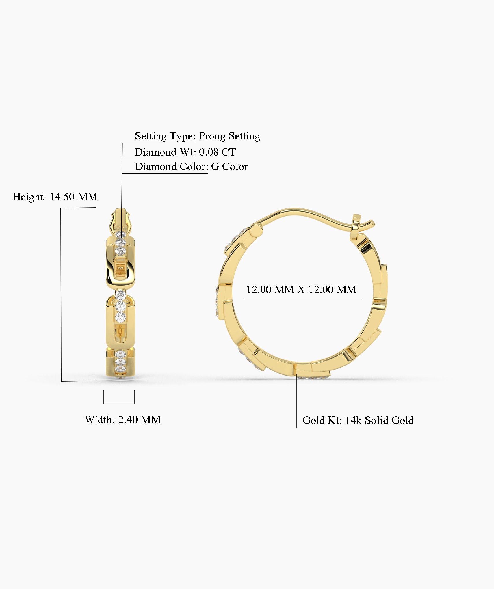 Elevate your style with these captivating 14K solid gold hoop earrings, designed with unique link patterns and sparkling diamond accents.