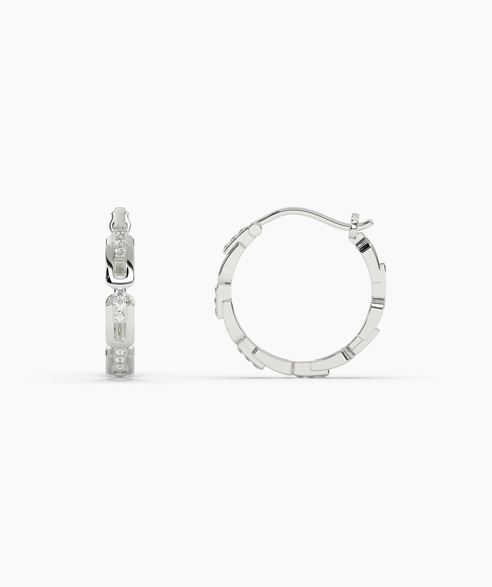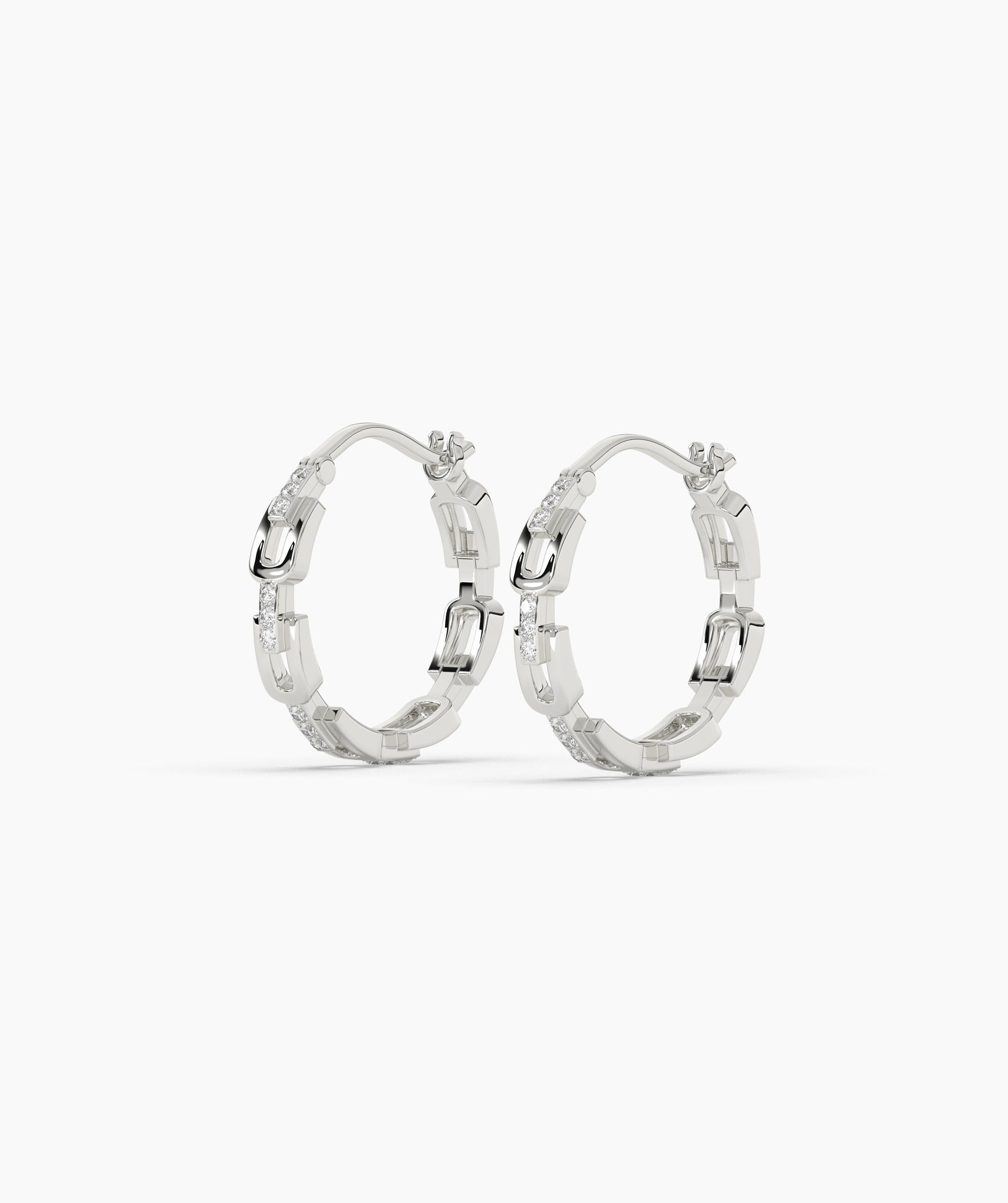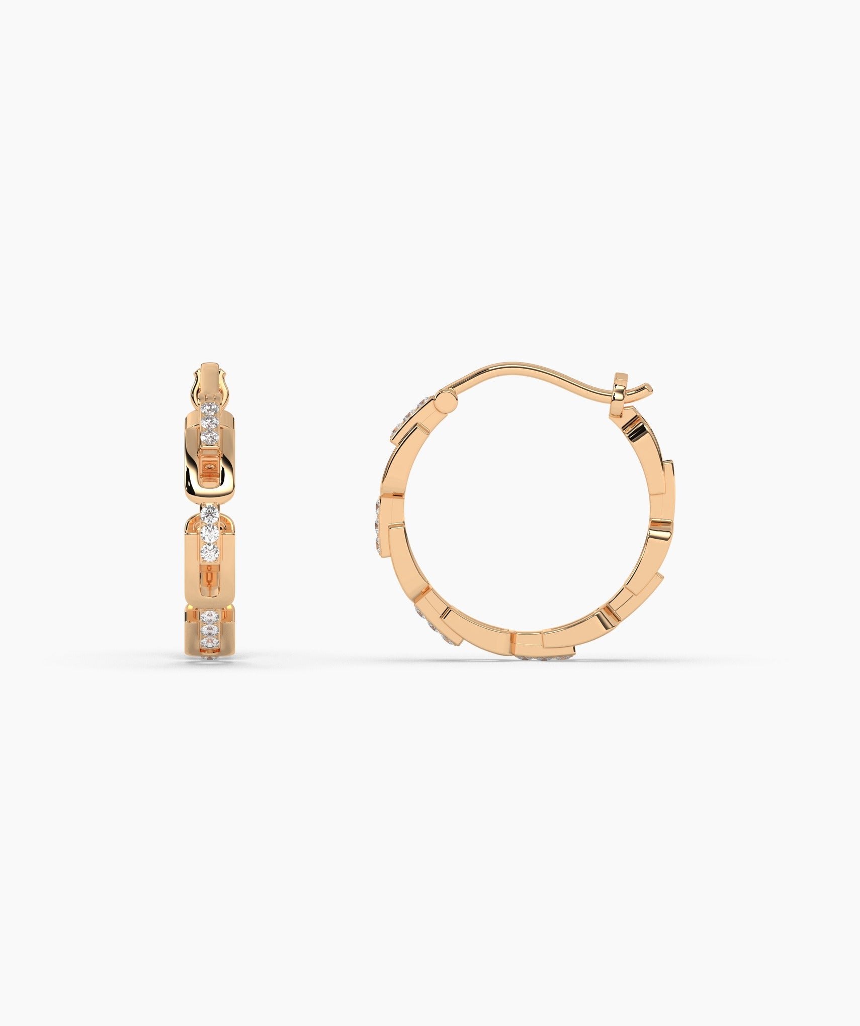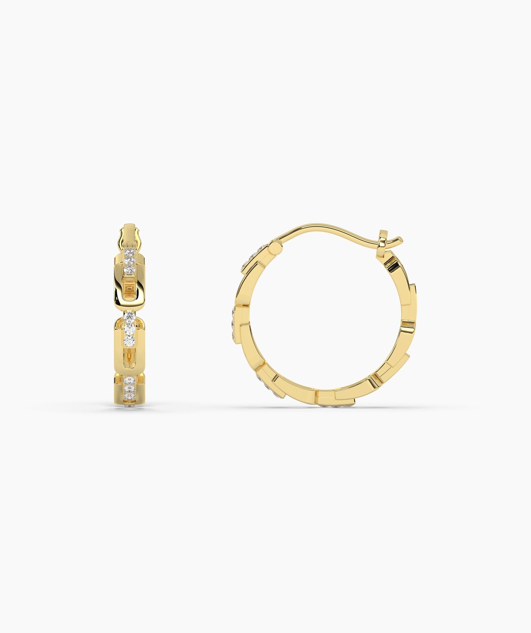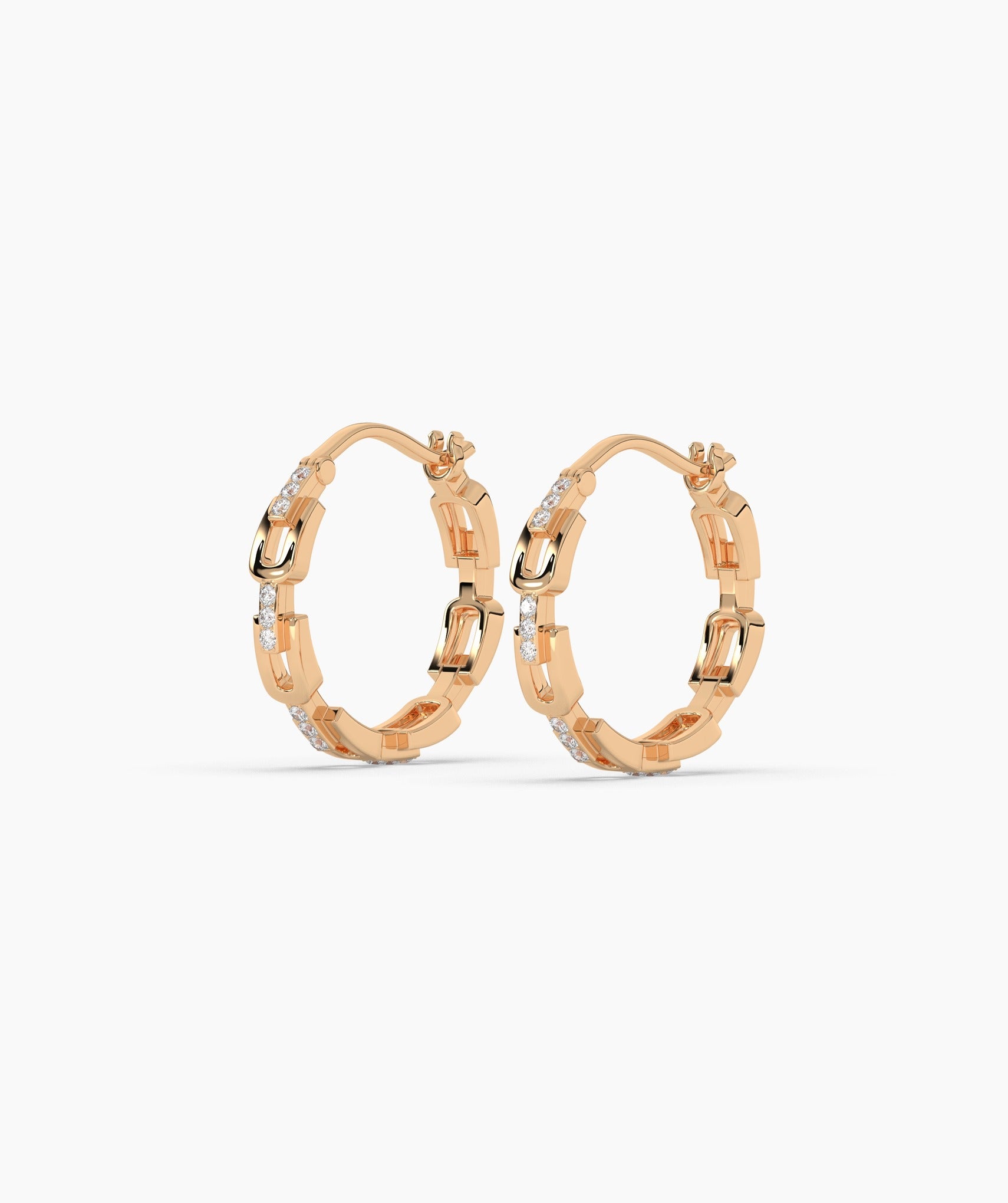 Elevate your style with these captivating 14K solid gold hoop earrings, designed with unique link patterns and sparkling diamond accents.