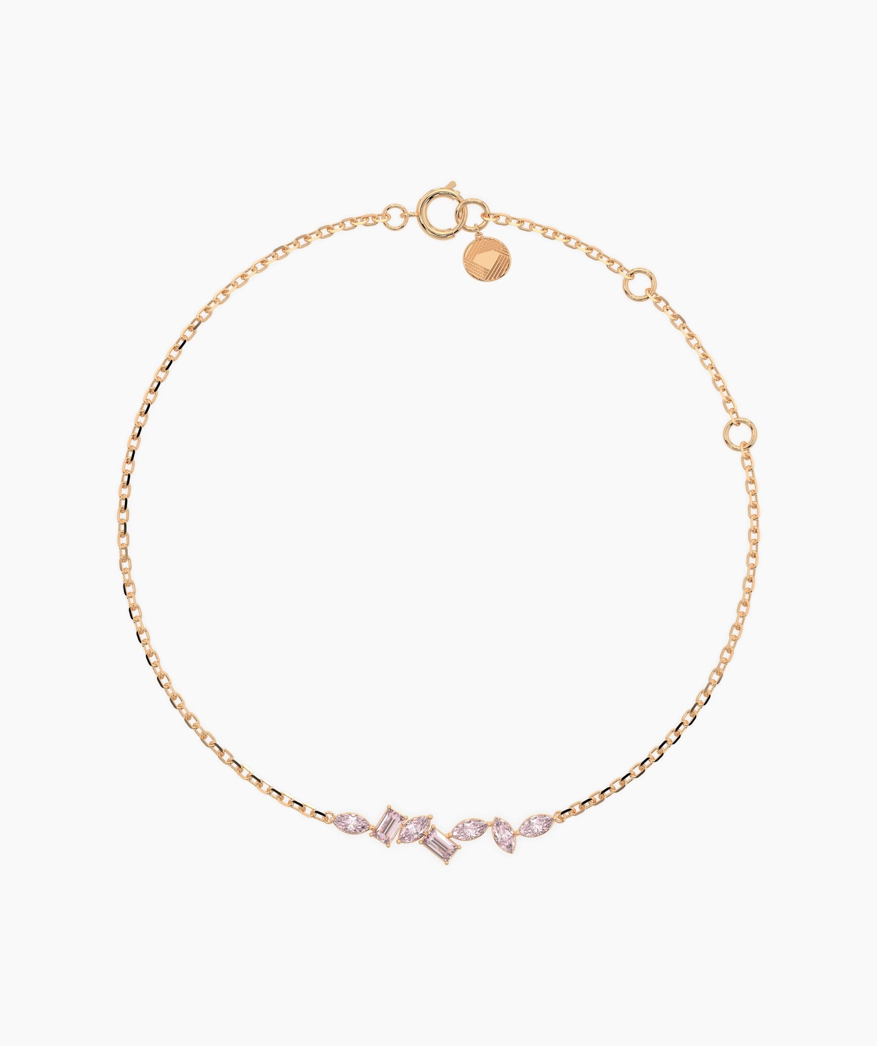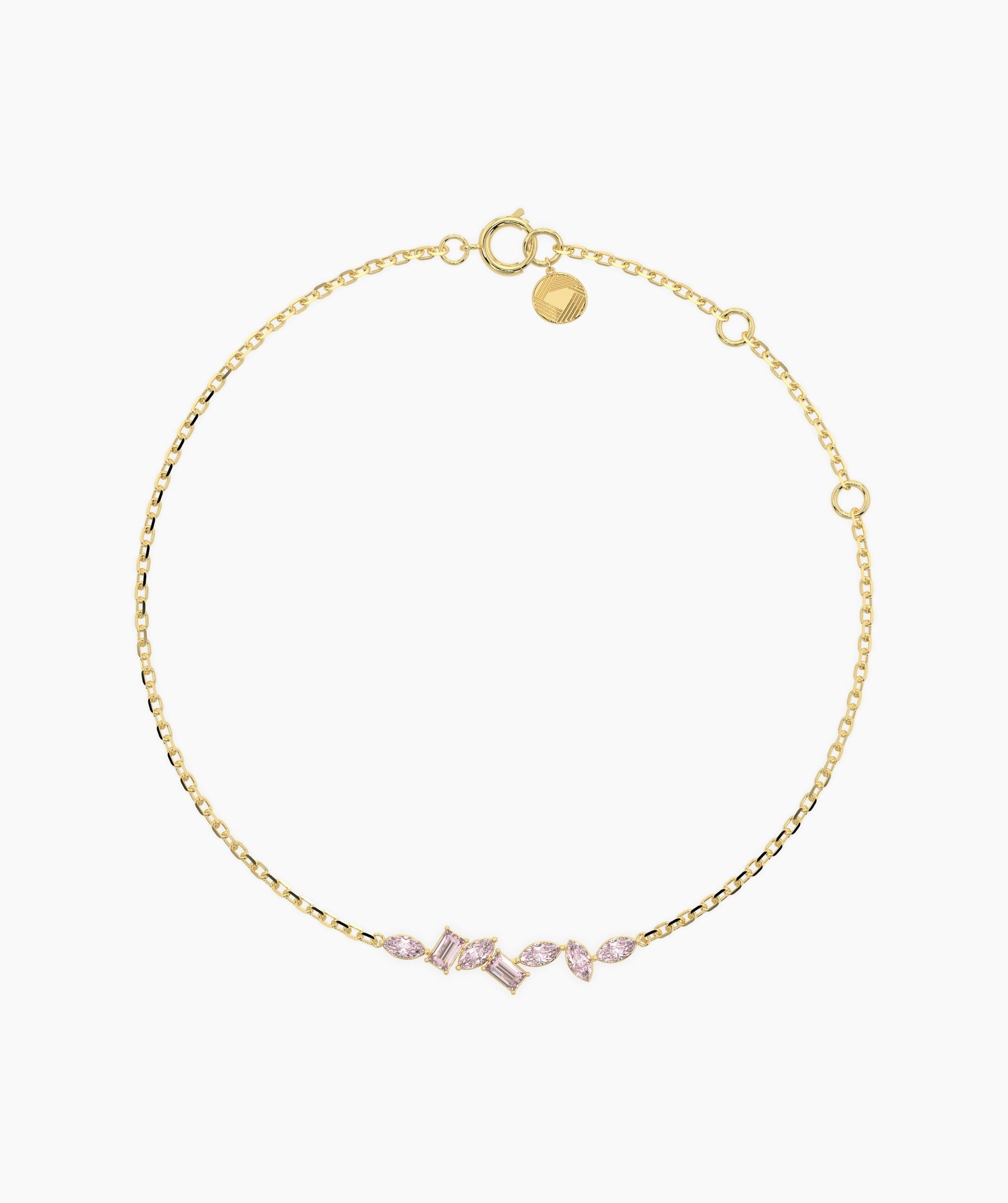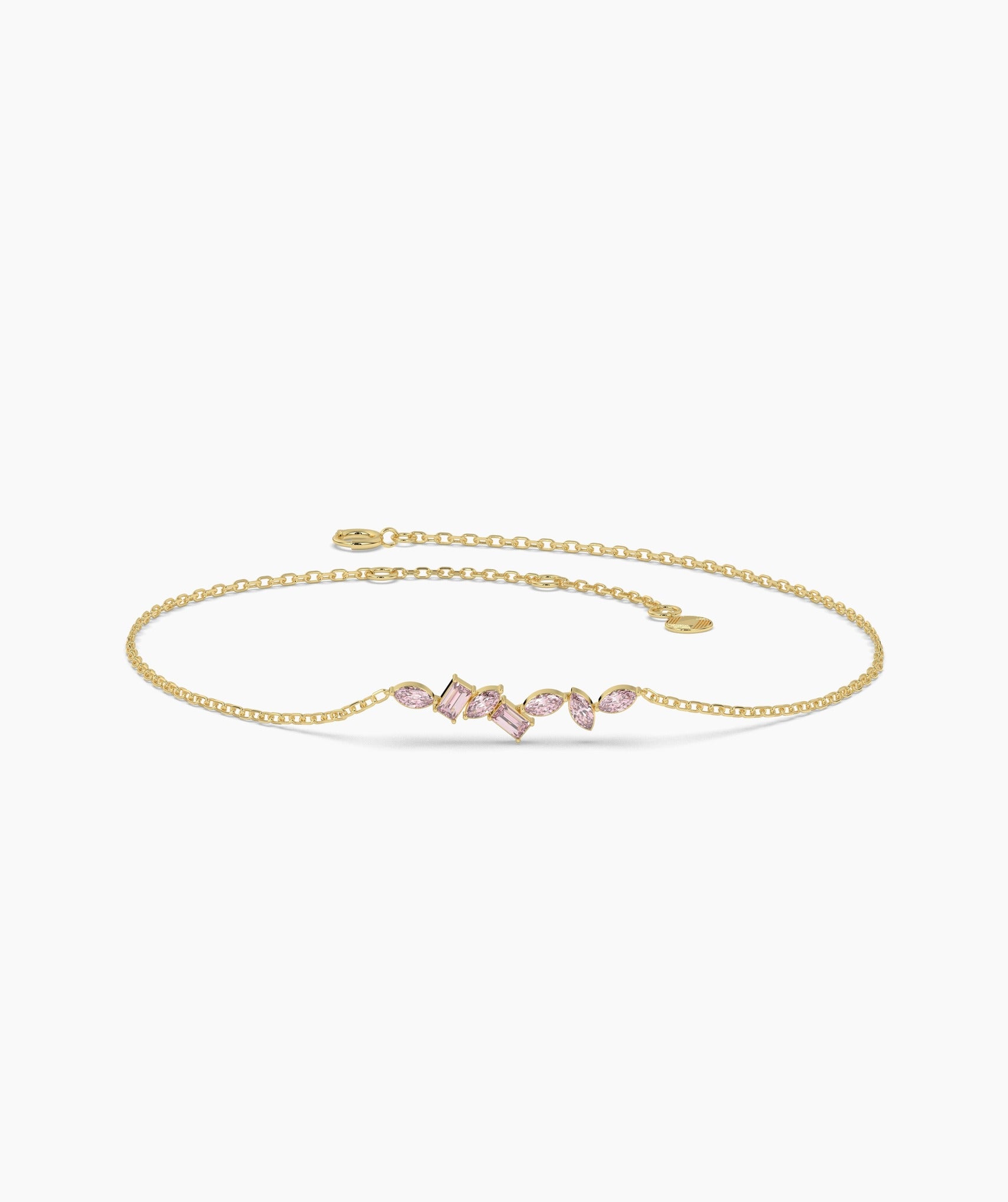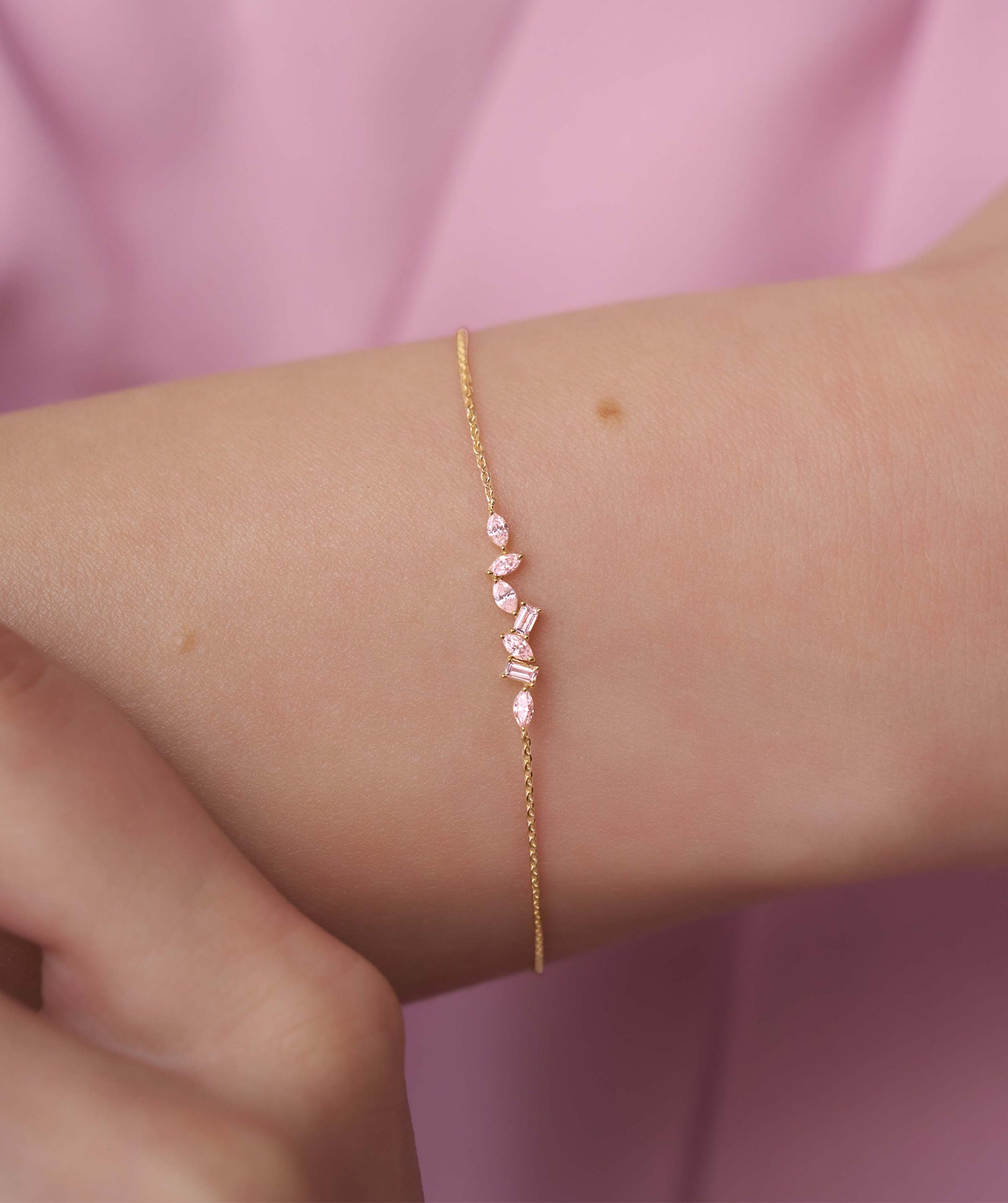 This minimalist bracelet features marquise and baguette-cut pink stones, set in 14K gold for a feminine look.