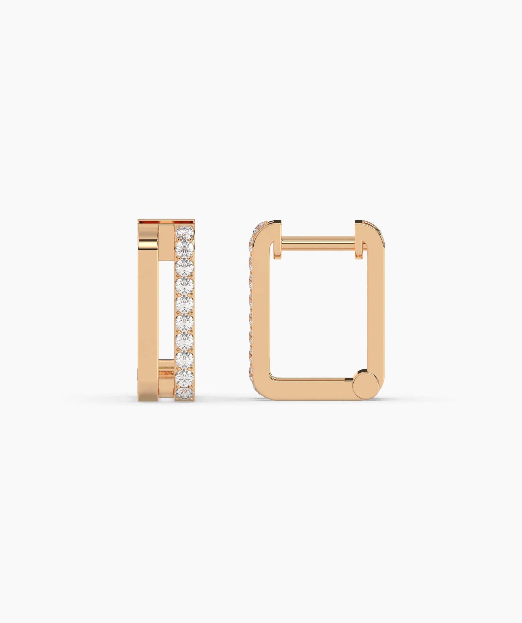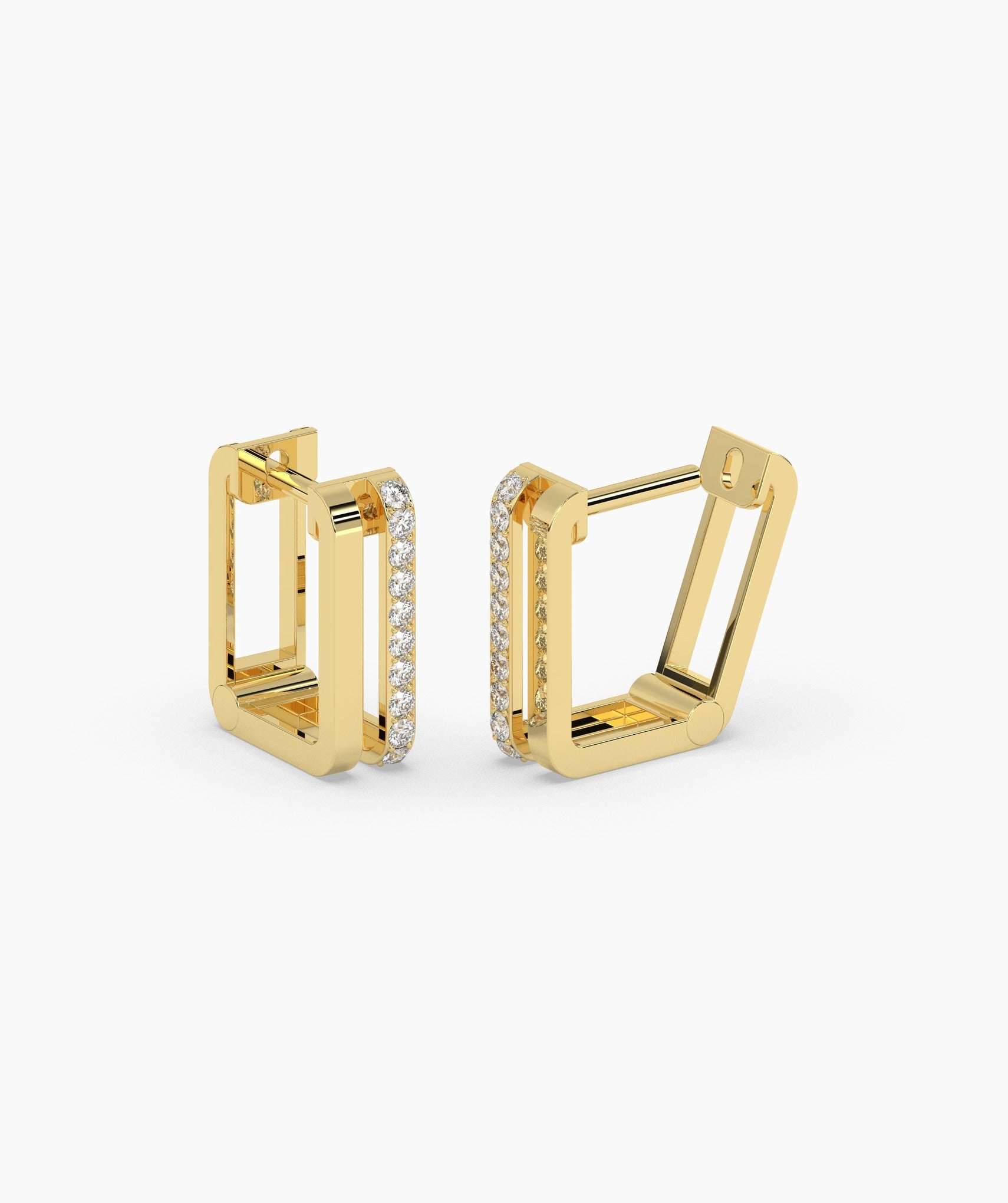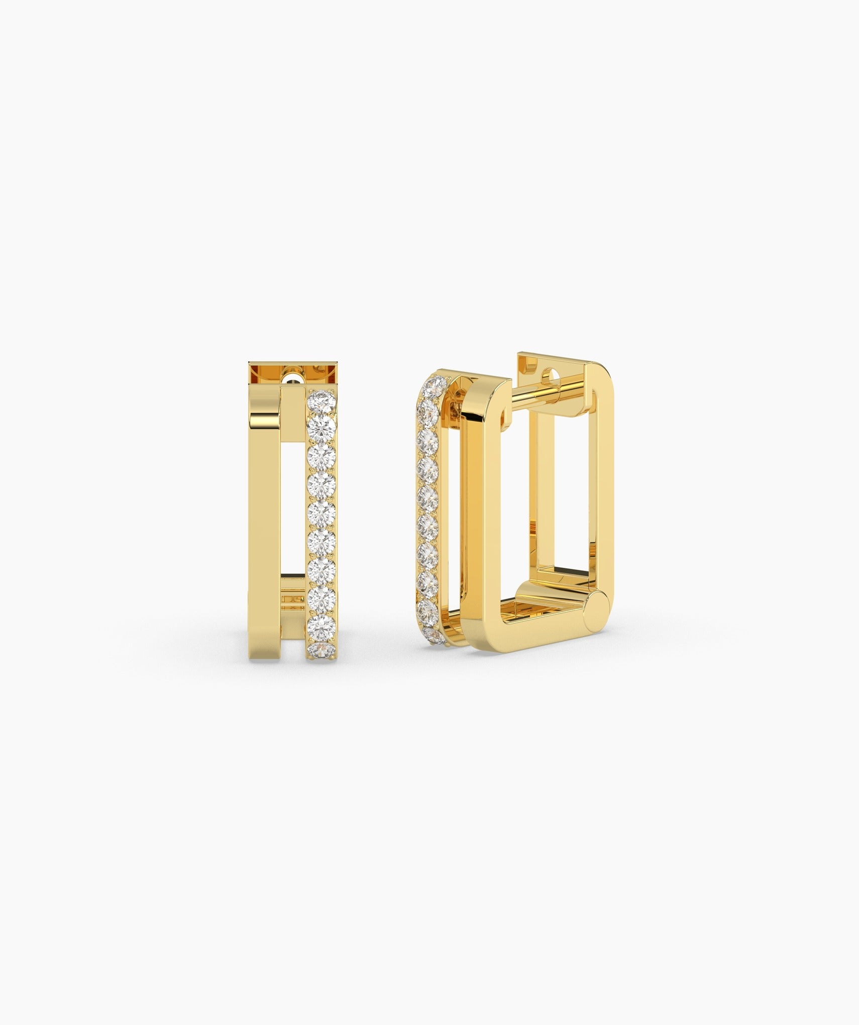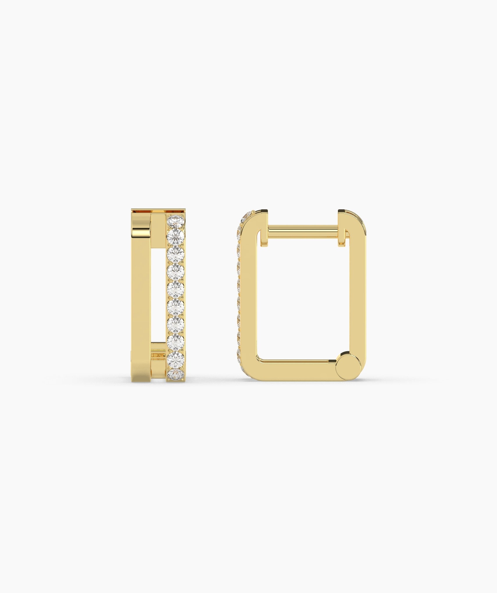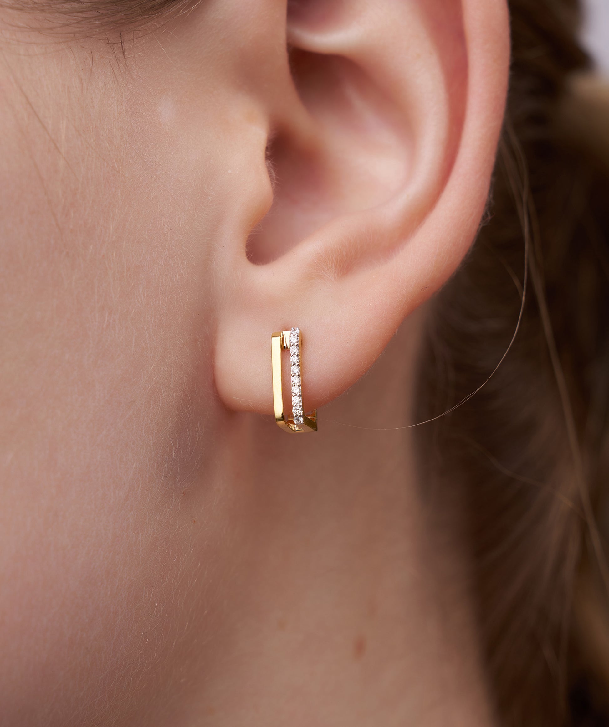 A bold take on classic hoops, these geometric huggie earrings feature a rectangle-shaped gold frame with shimmering diamonds for a modern, elegant look.
