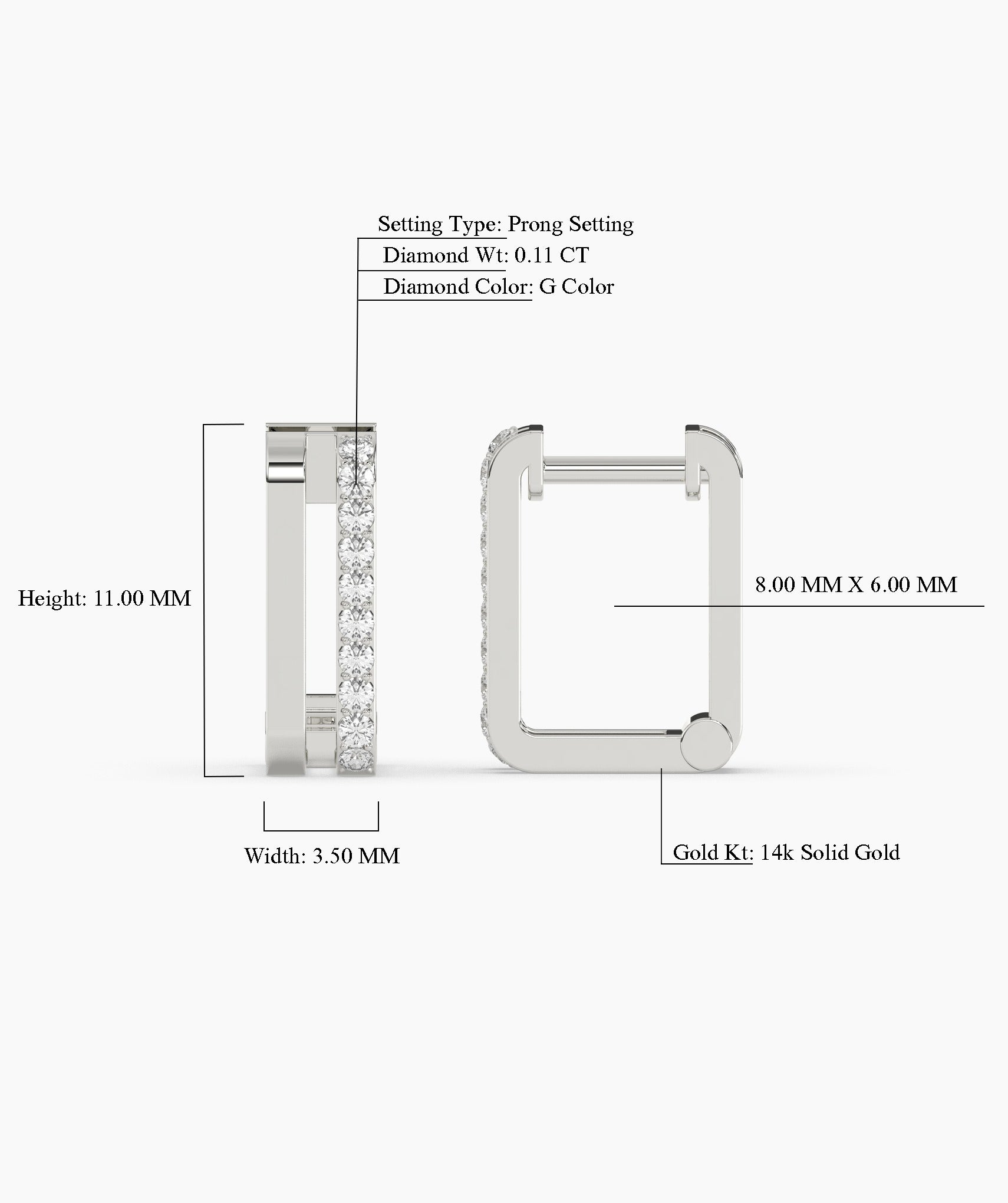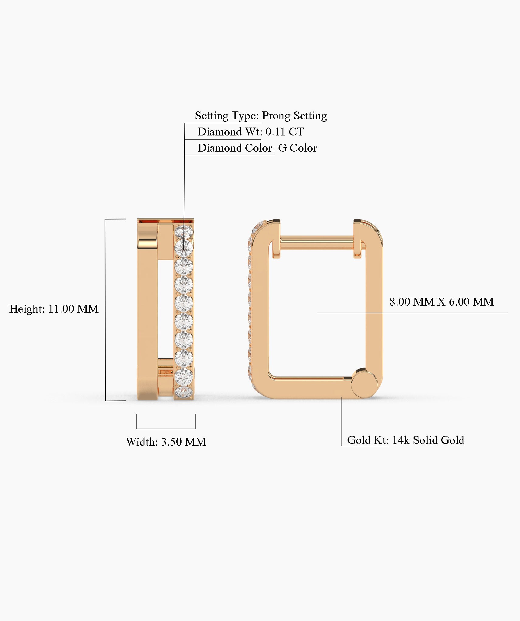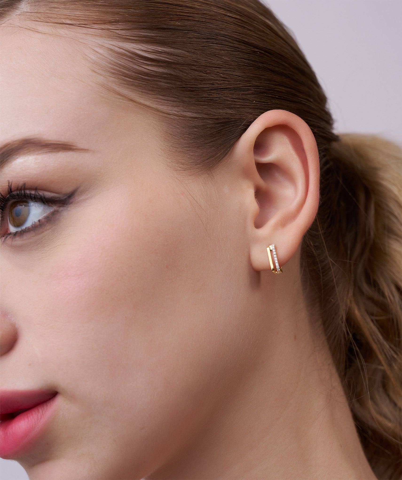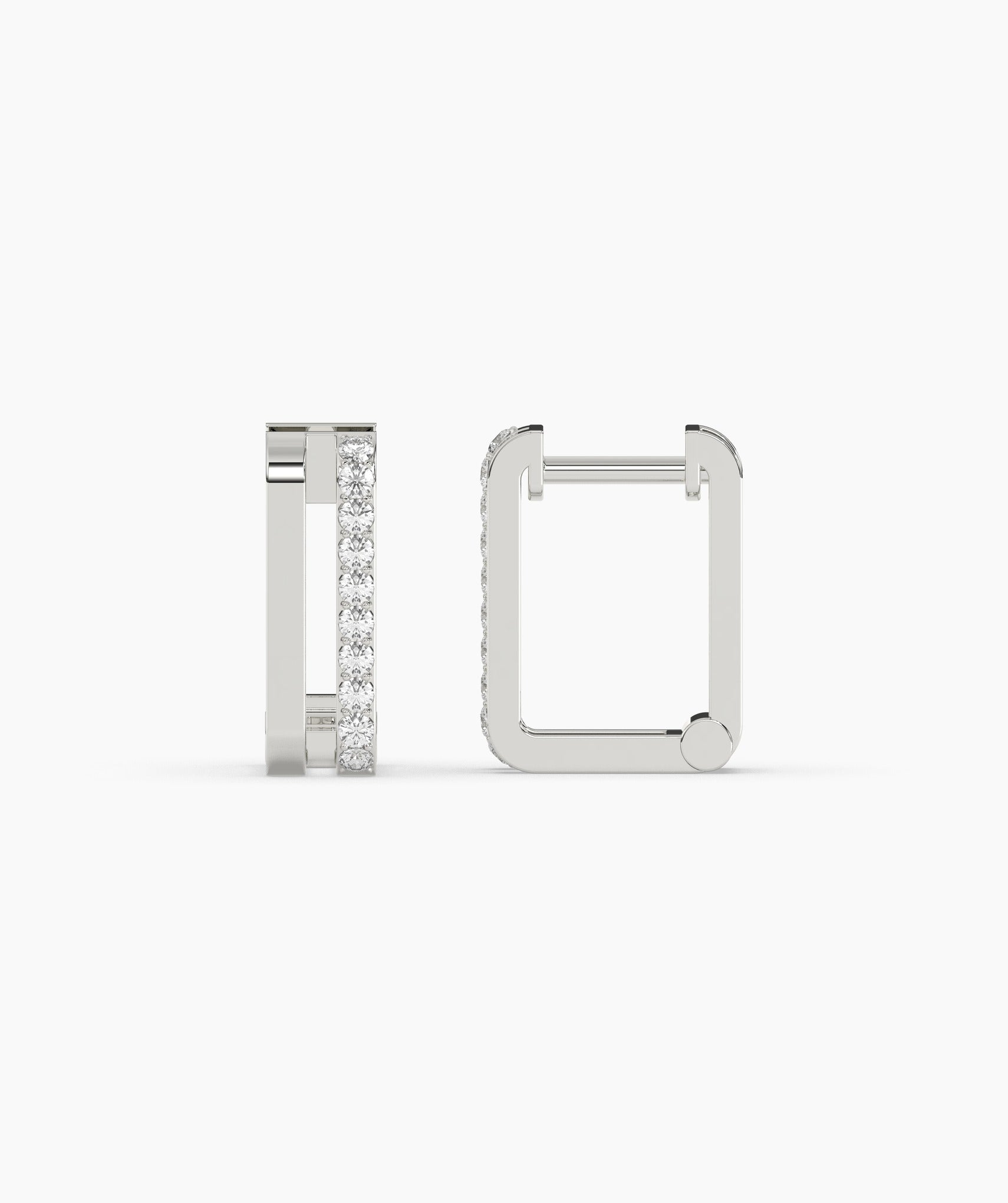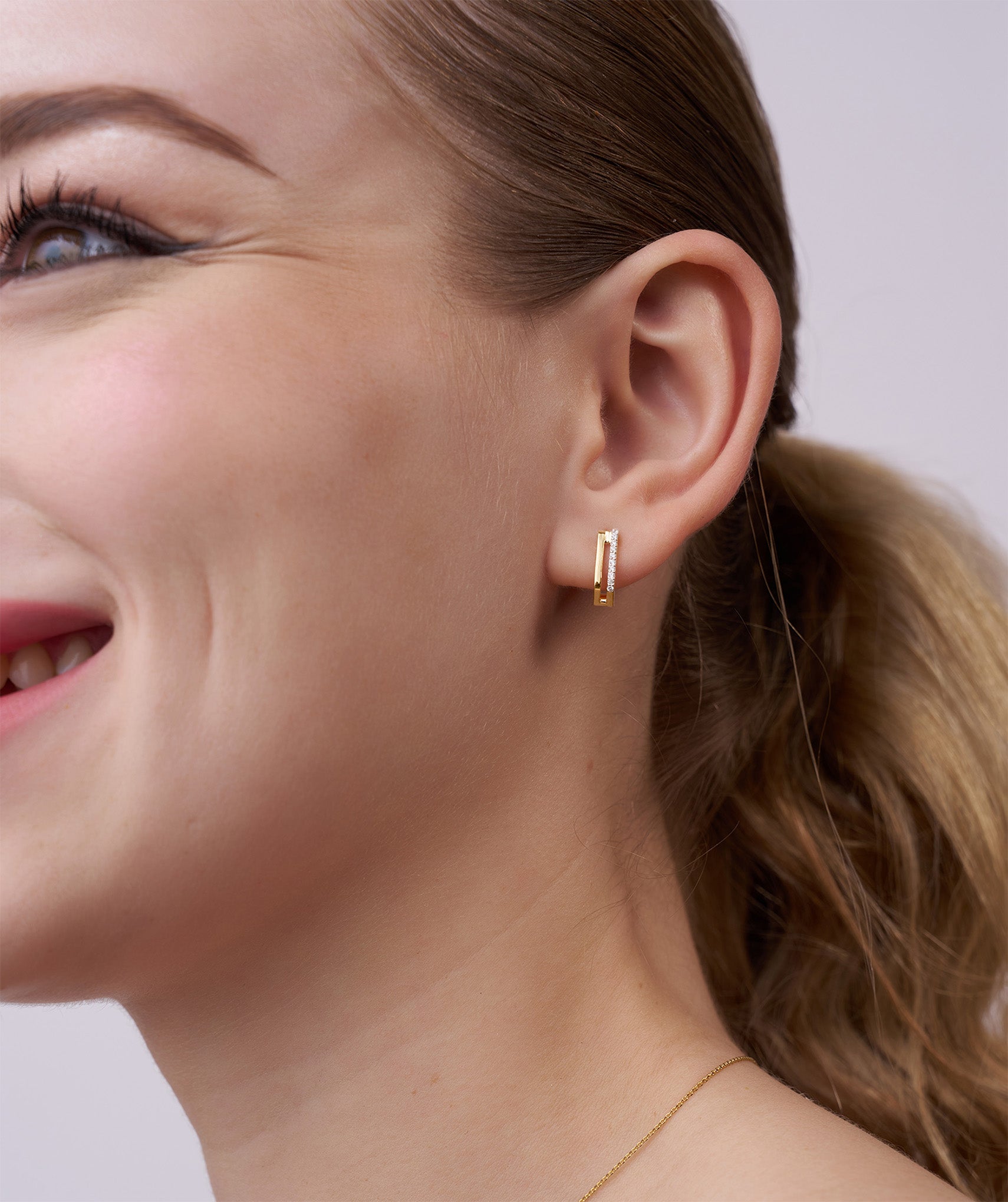 A bold take on classic hoops, these geometric huggie earrings feature a rectangle-shaped gold frame with shimmering diamonds for a modern, elegant look.