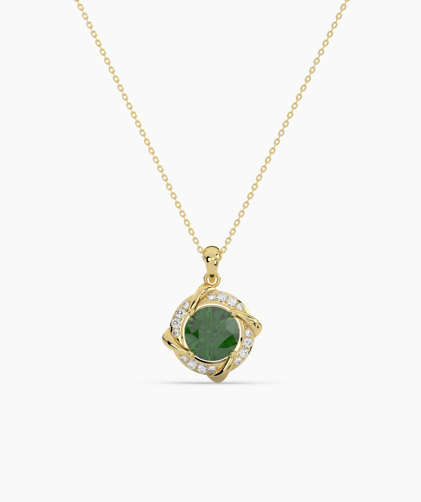 A stunning 14K gold pendant featuring a vibrant green gemstone surrounded by a halo of sparkling diamonds.