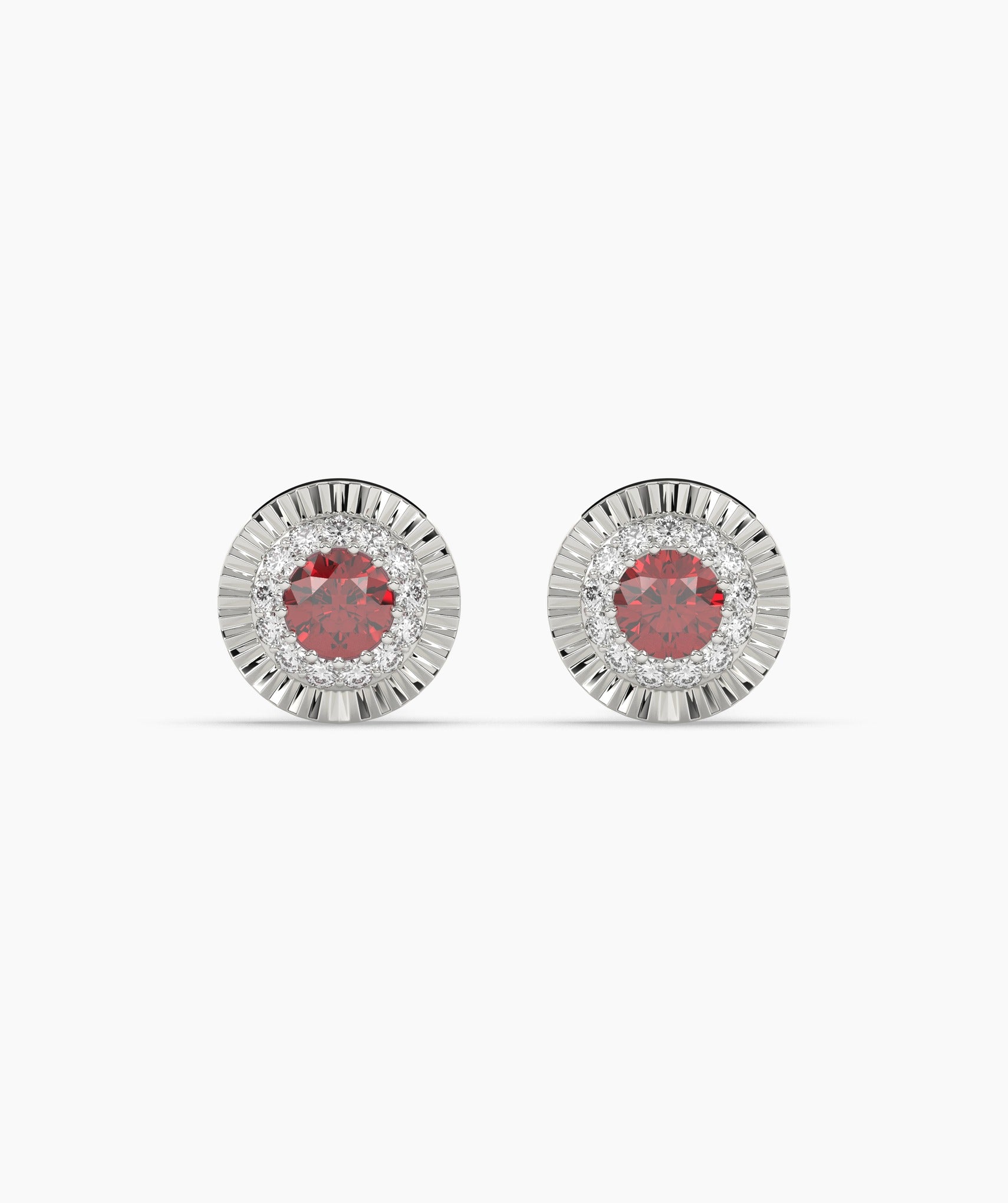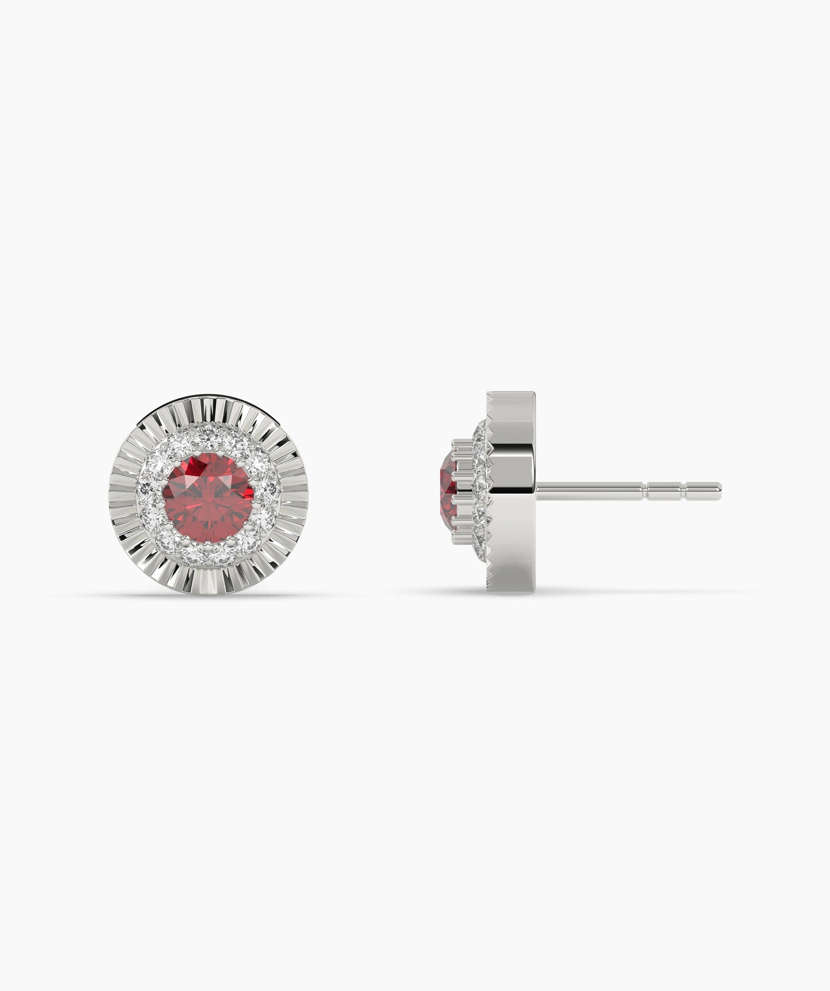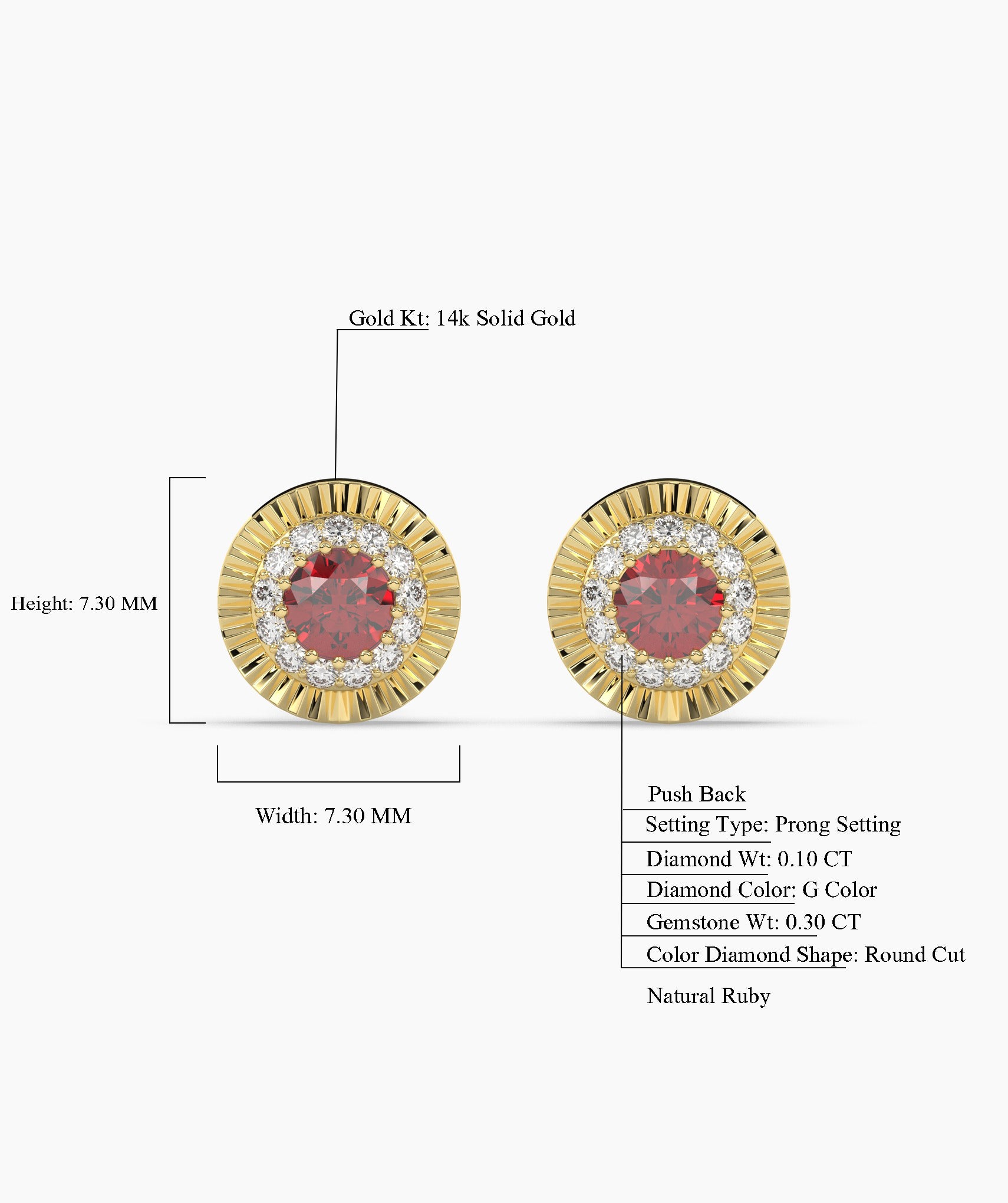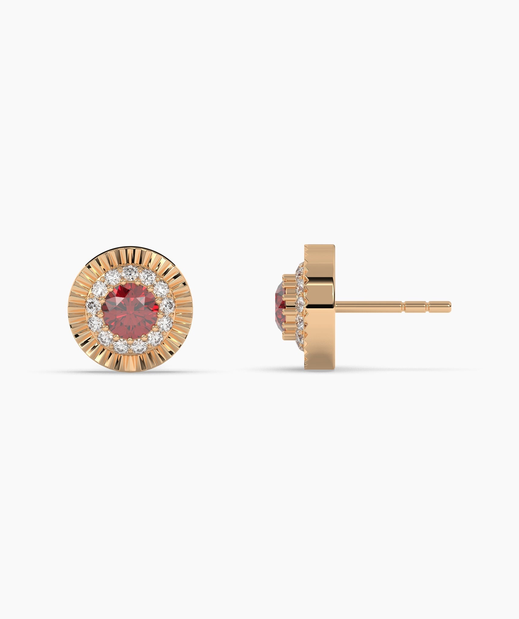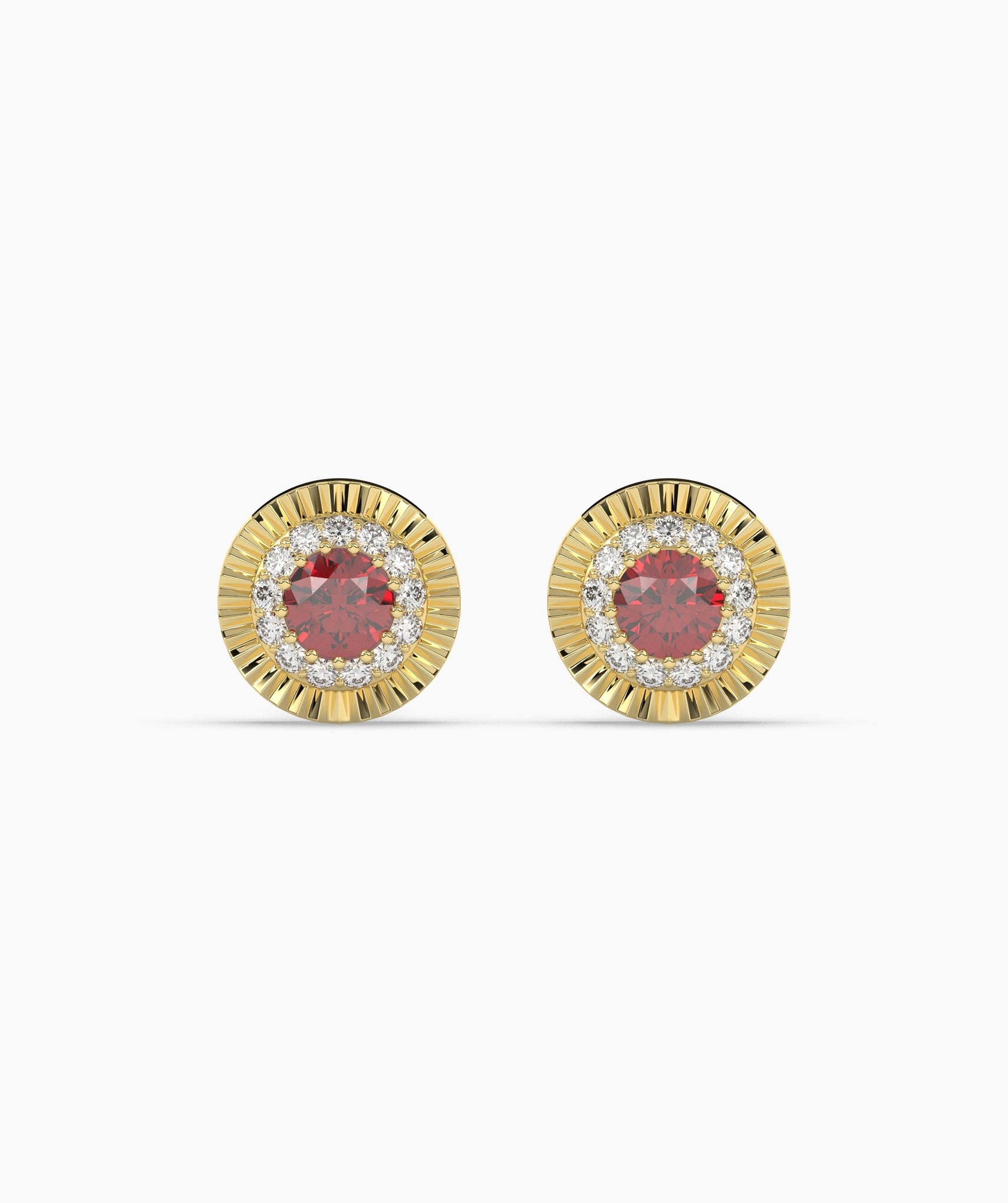 Sophisticated 14K gold stud earrings featuring vibrant ruby centers surrounded by a halo of sparkling diamonds for timeless elegance.