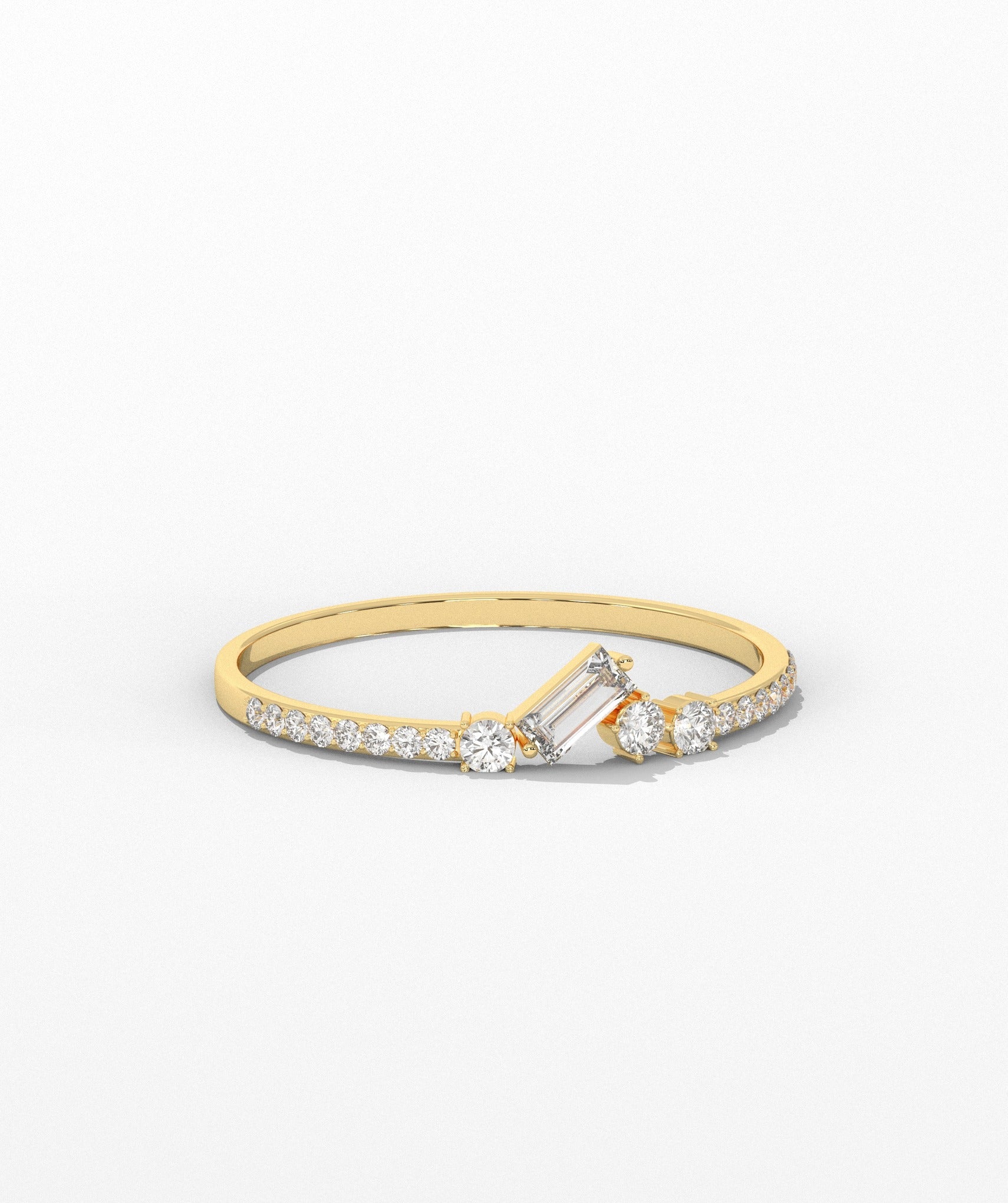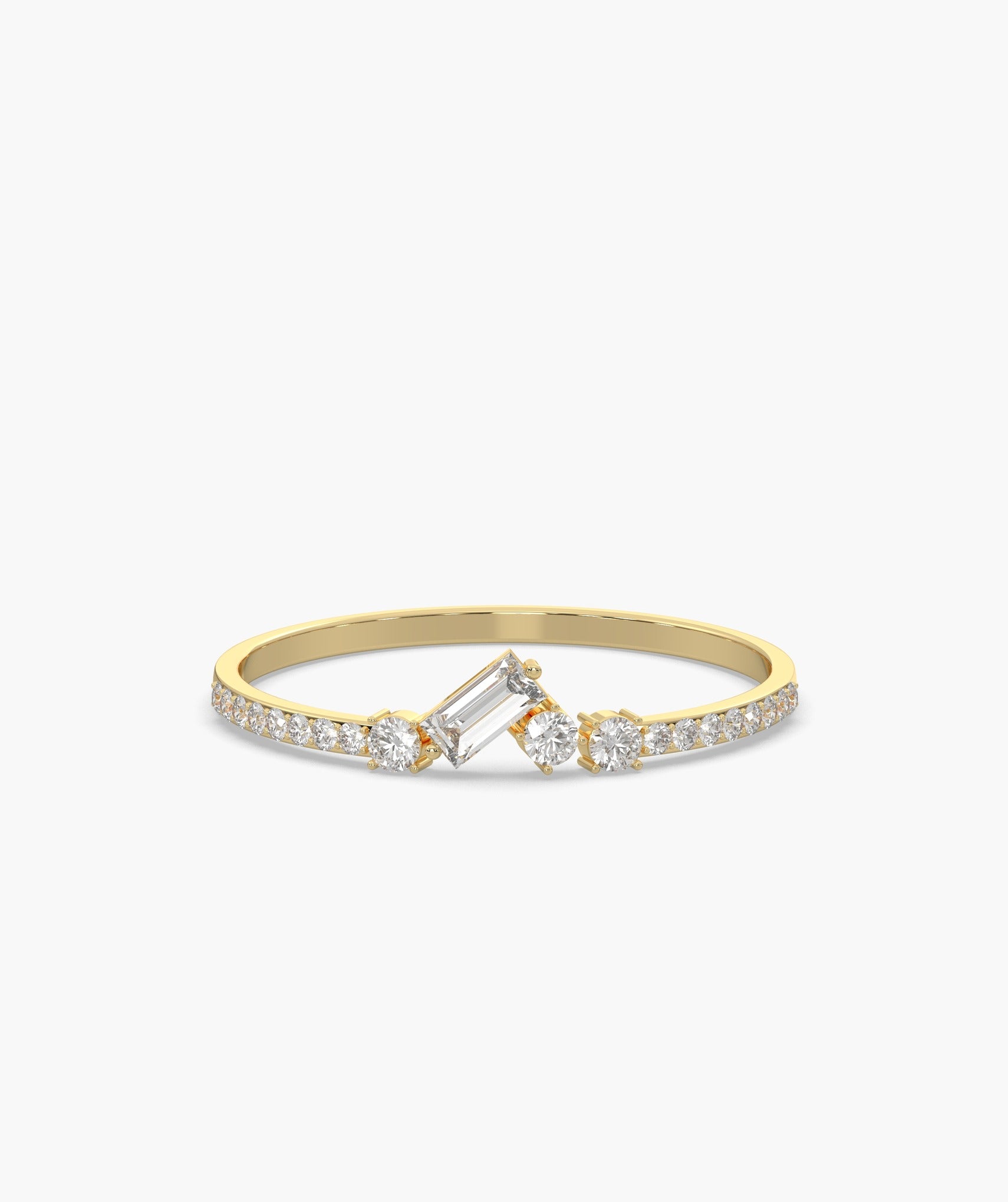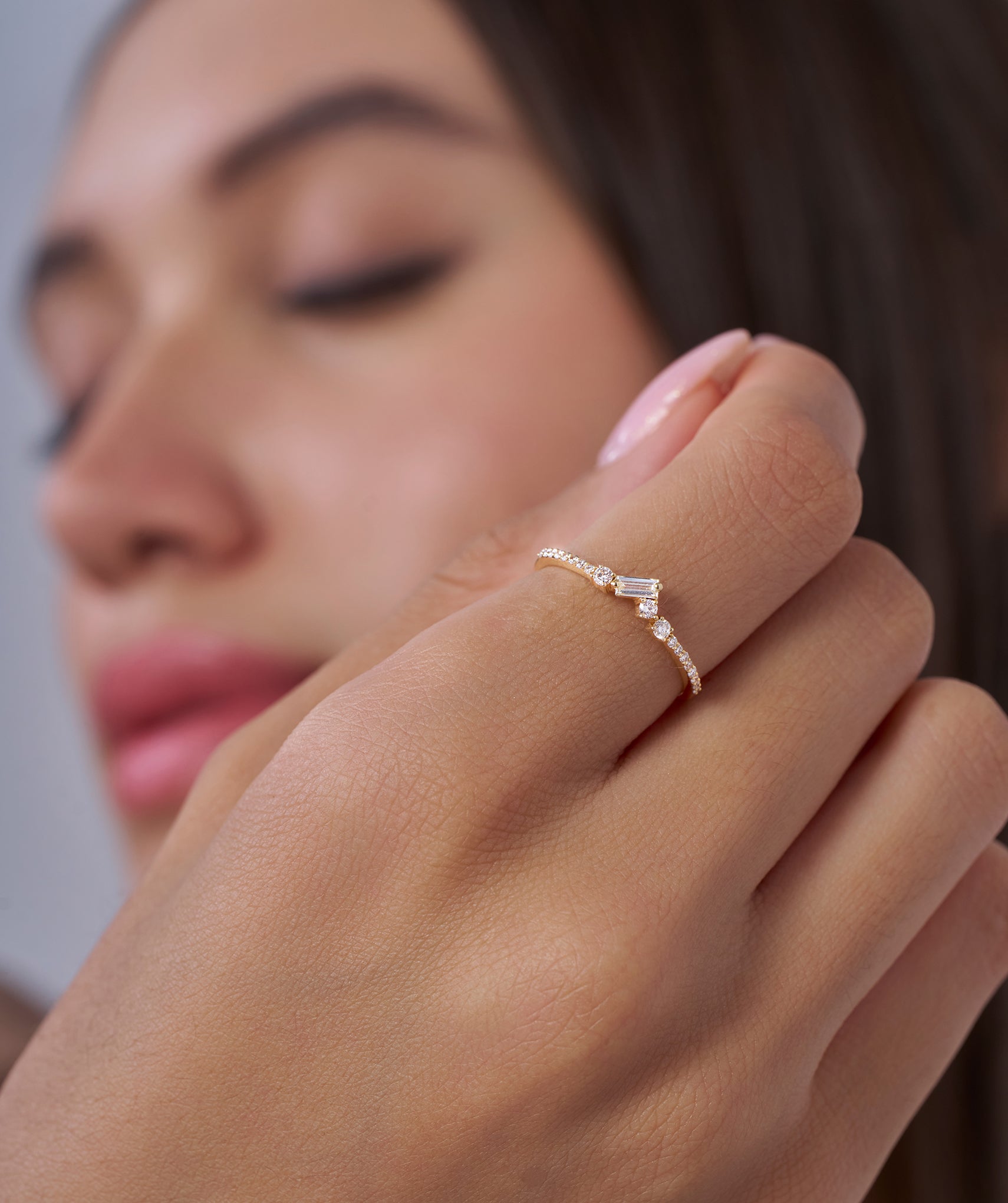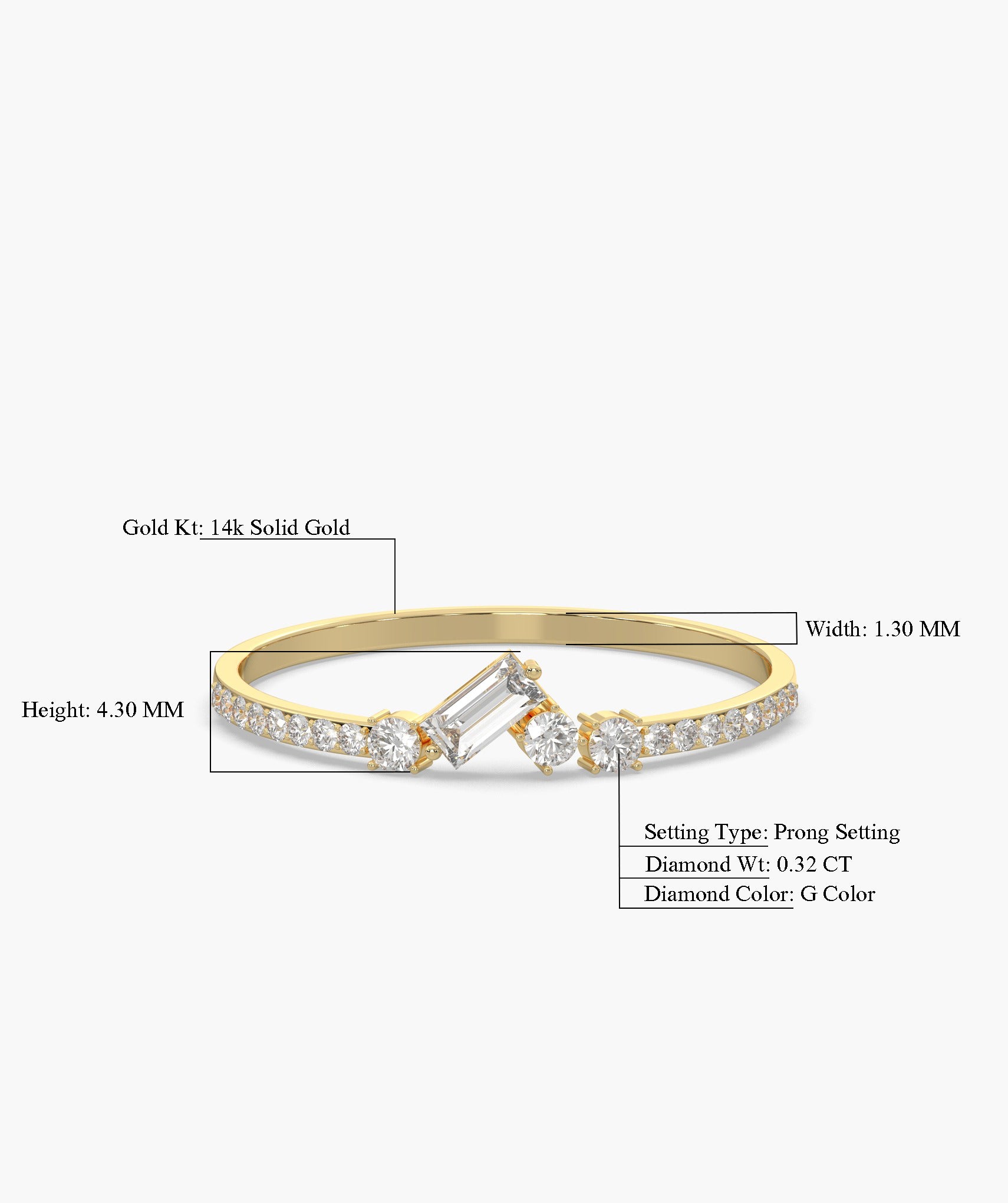 14K gold ring featuring a striking baguette diamond flanked by sparkling round diamonds, blending classic charm with modern brilliance.