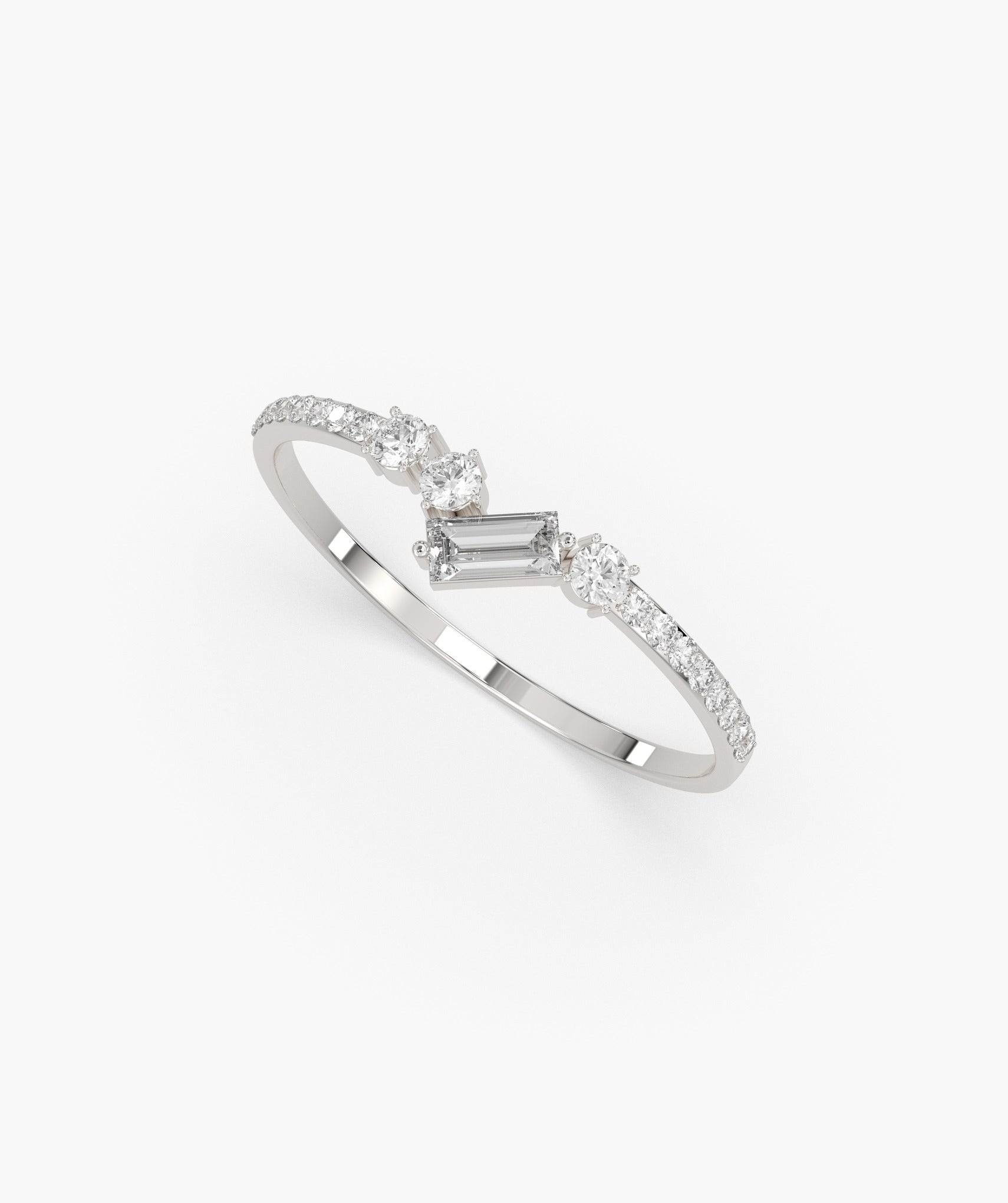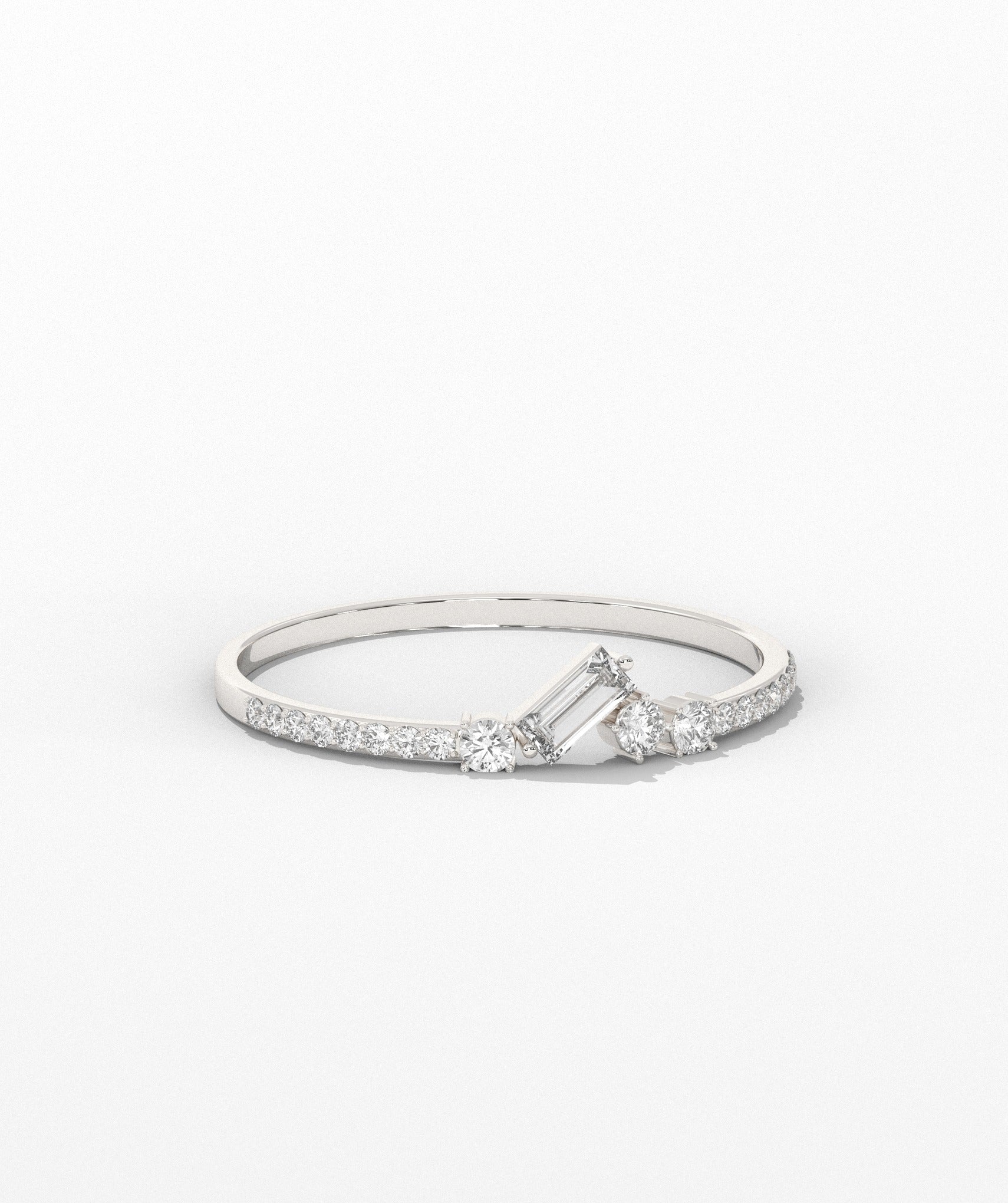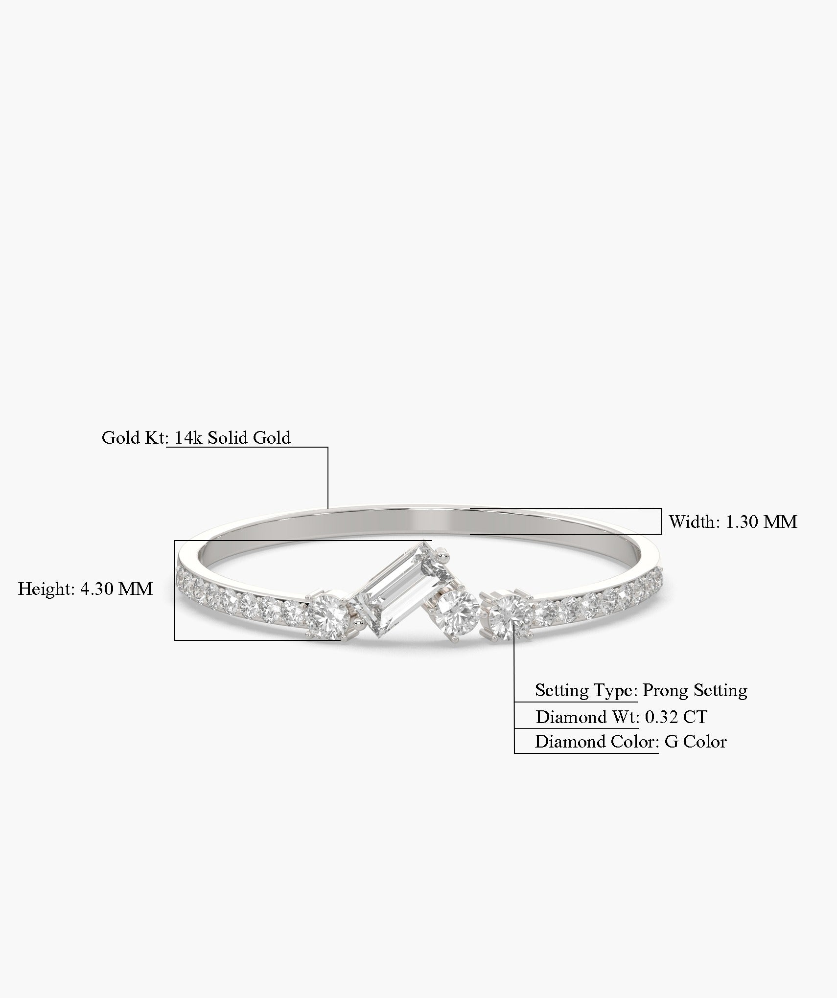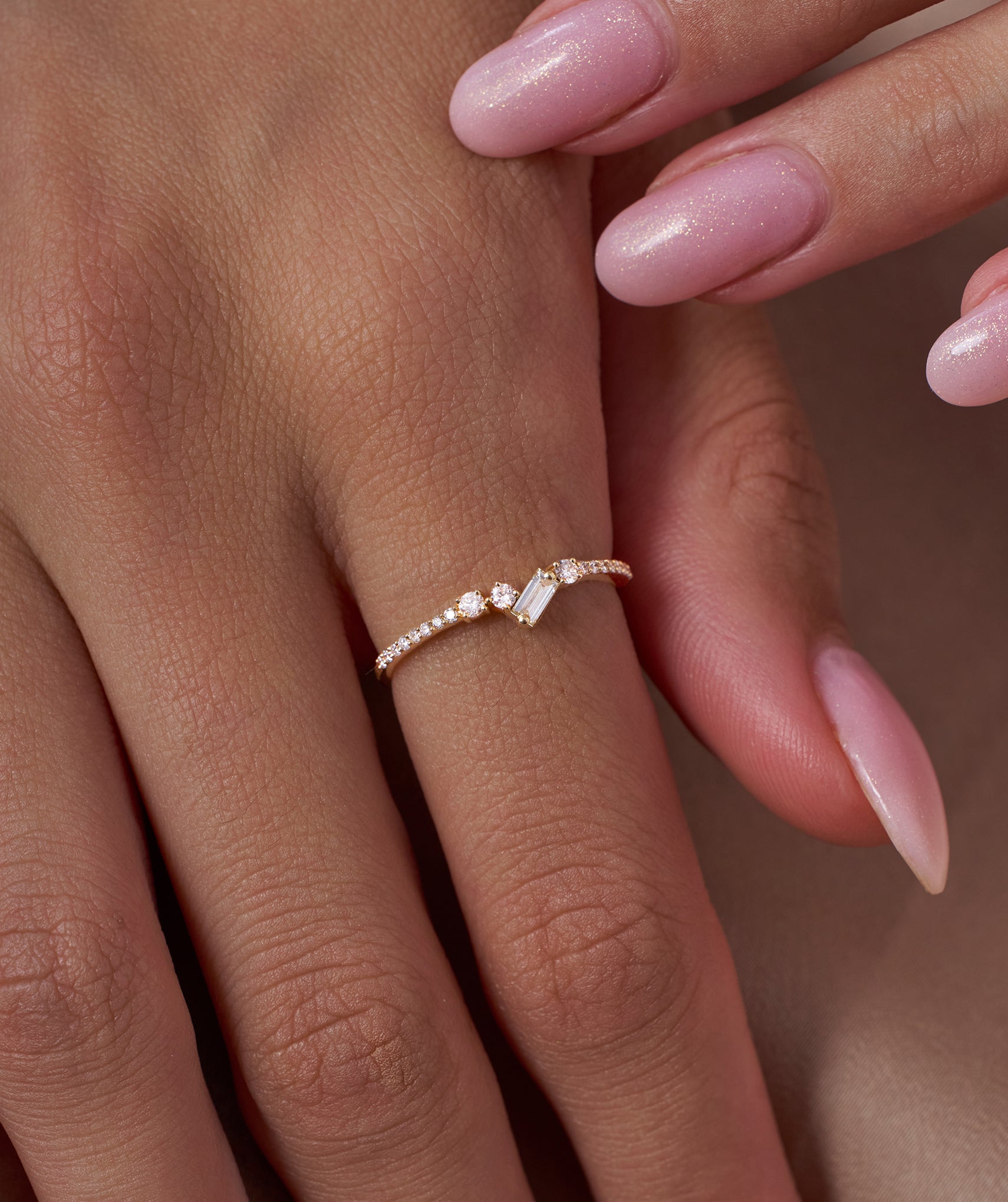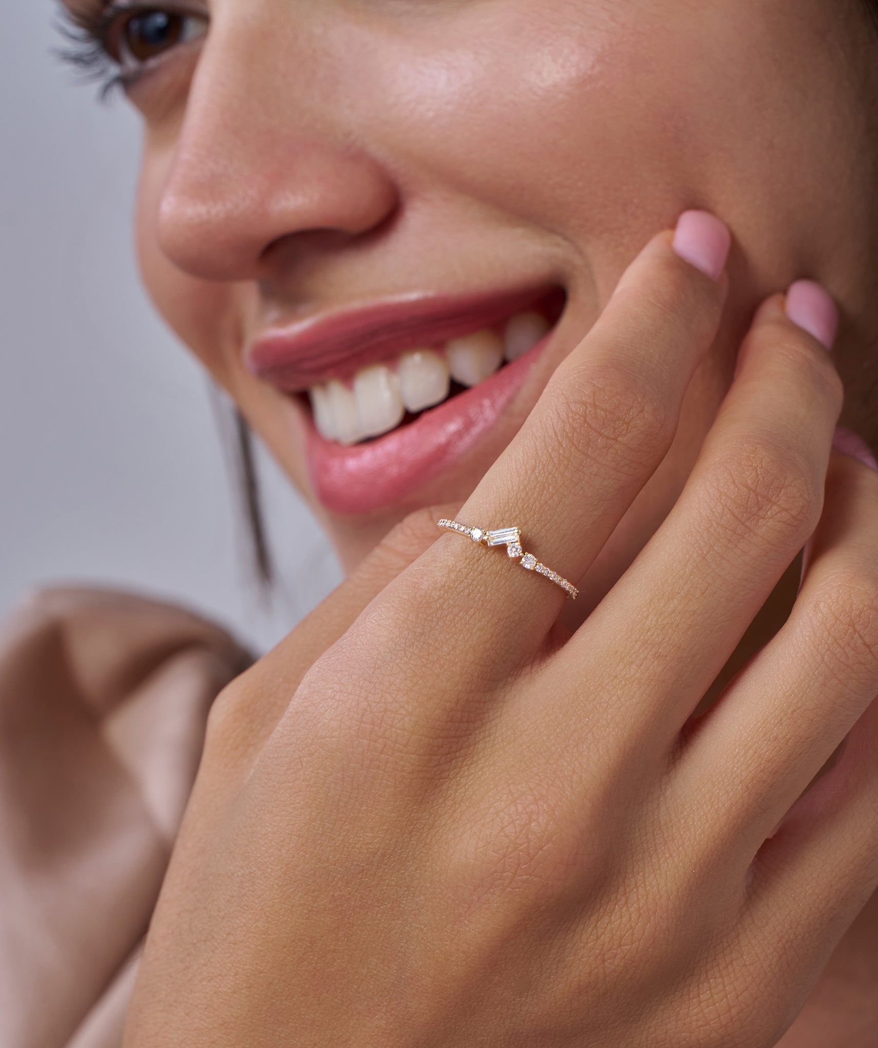 14K gold ring featuring a striking baguette diamond flanked by sparkling round diamonds, blending classic charm with modern brilliance.