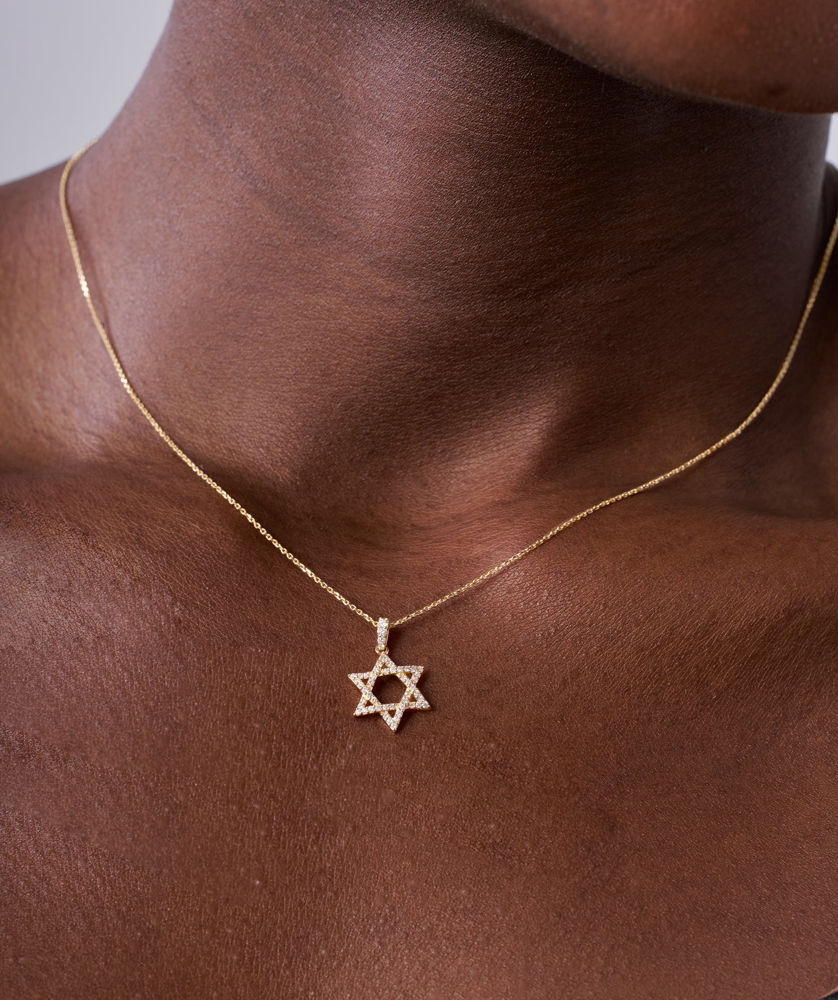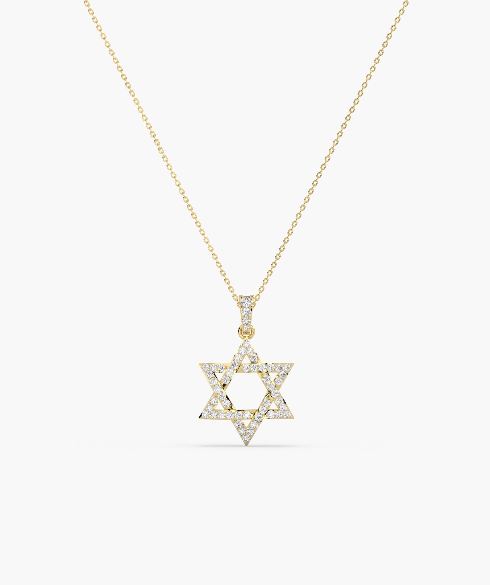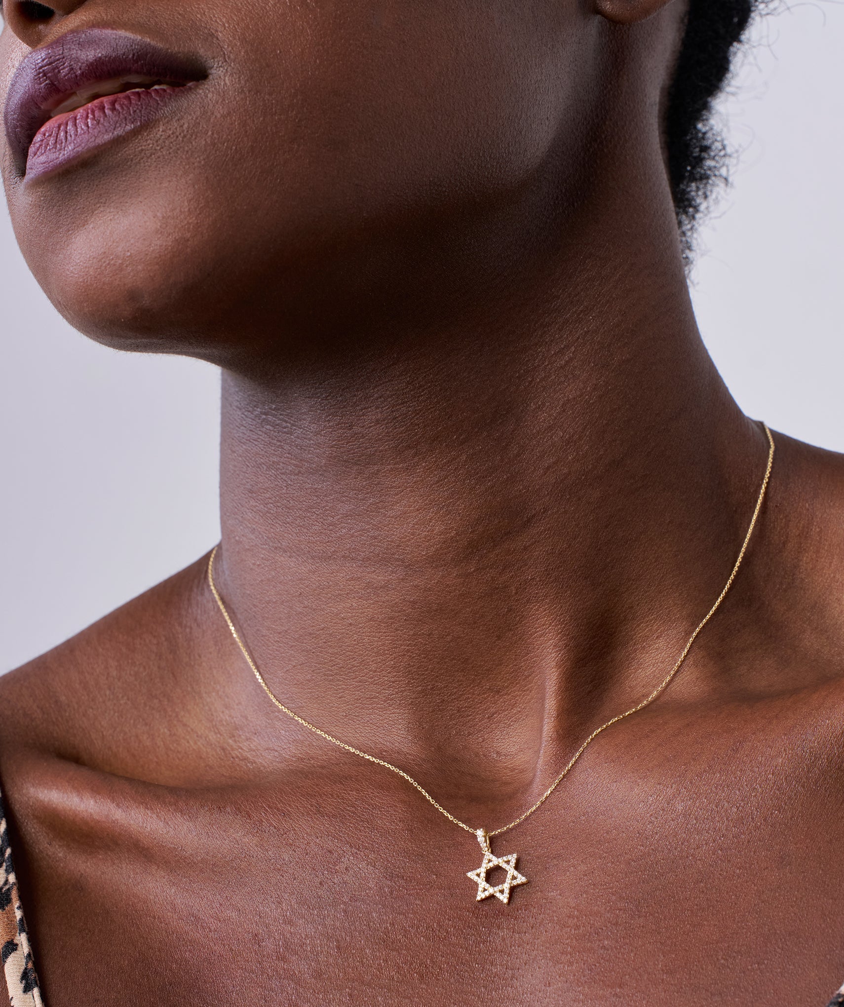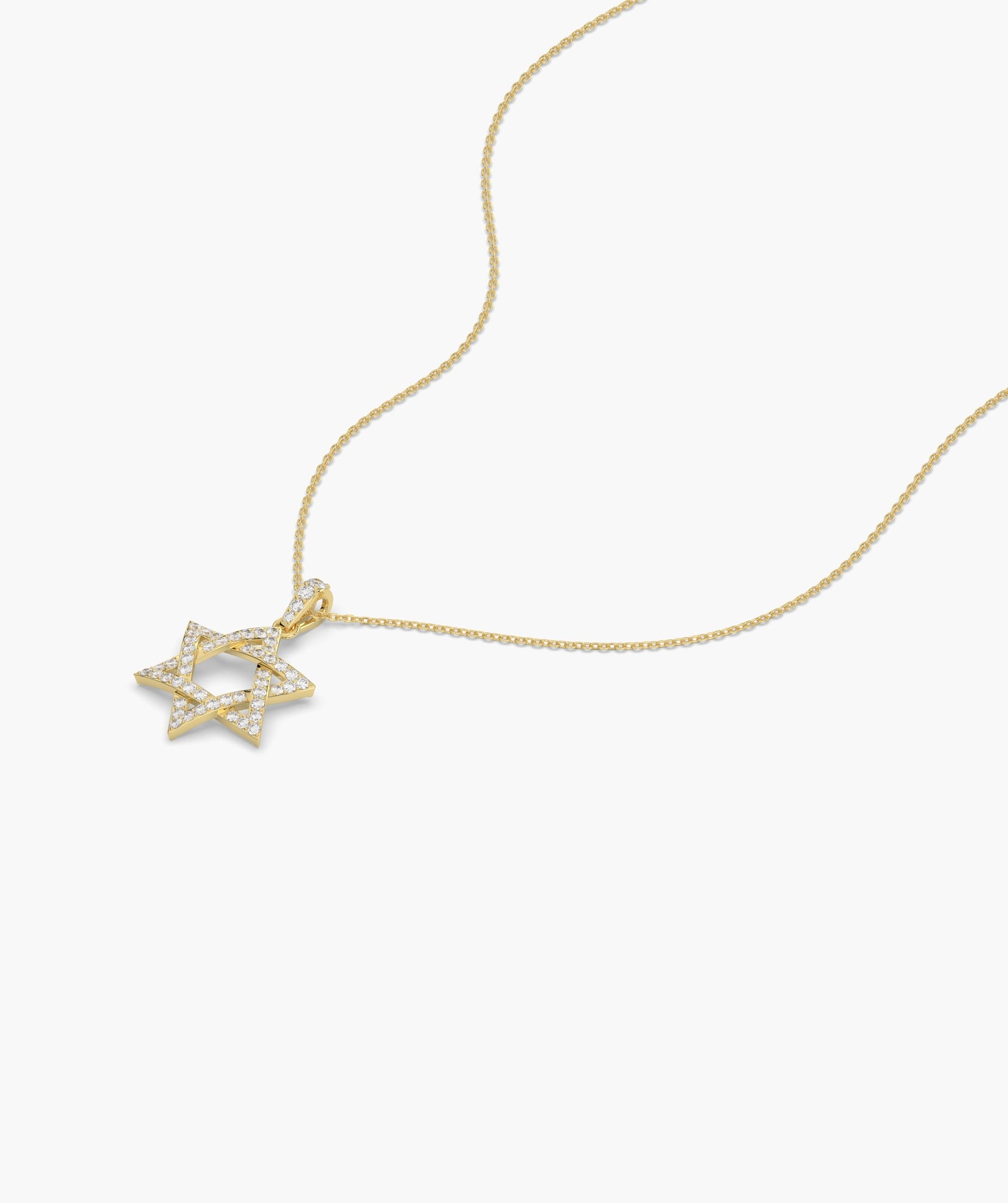 This 14K gold Star of David pendant dazzles with a detailed diamond setting, elegantly crafted to enhance any ensemble with a touch of heritage and sparkle.