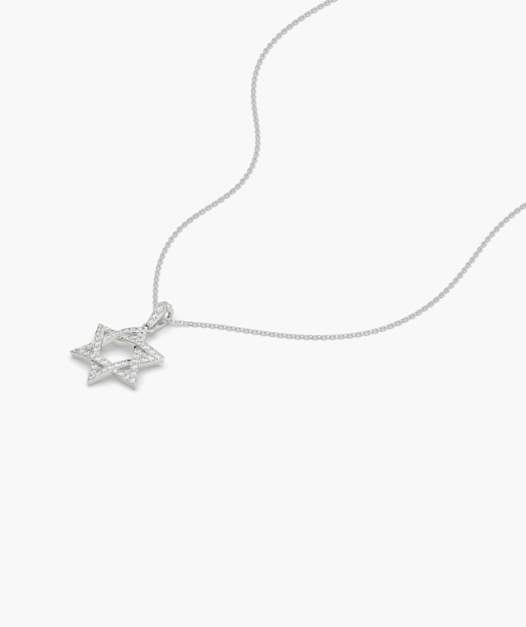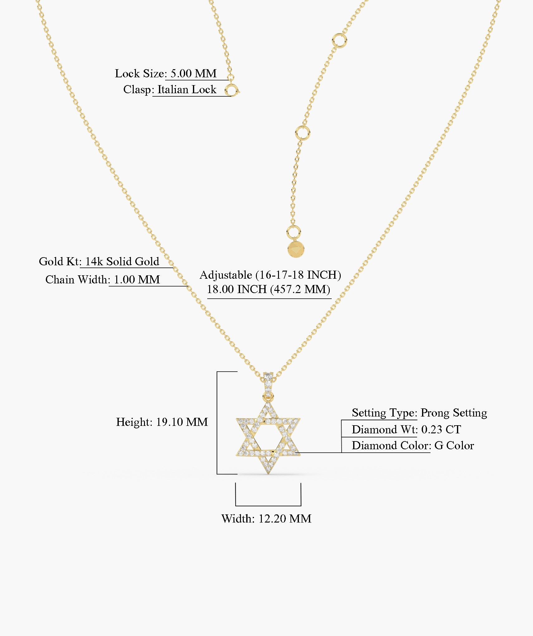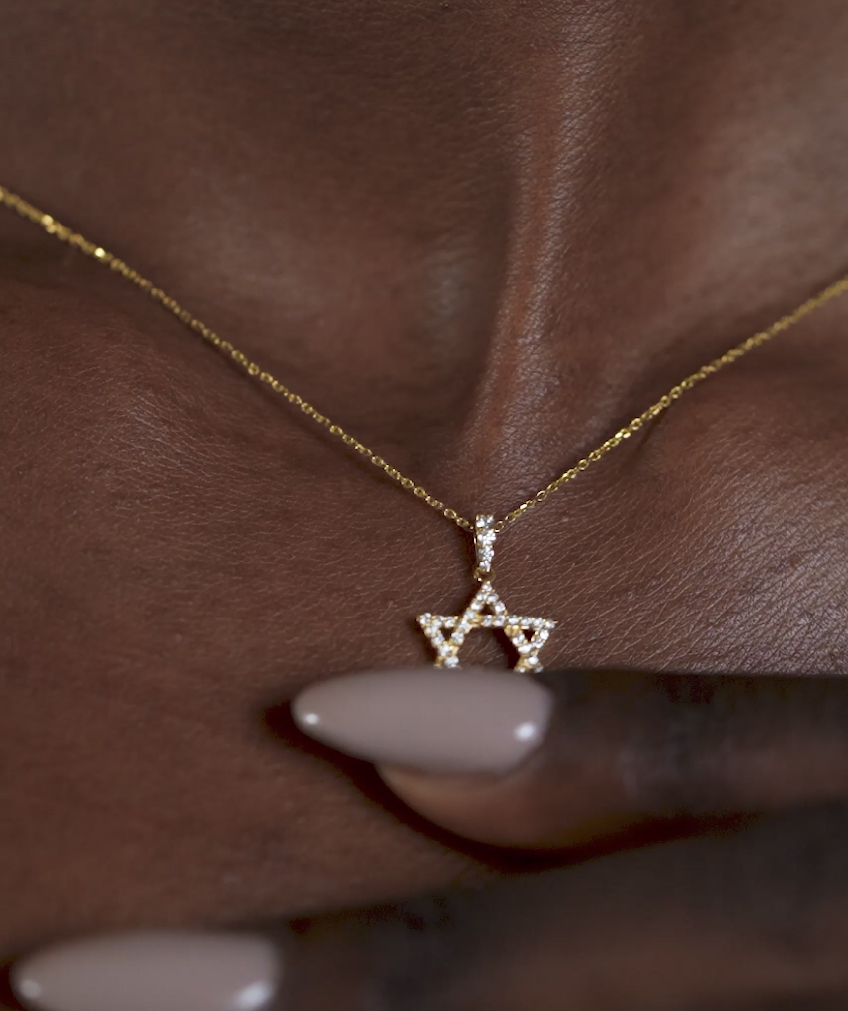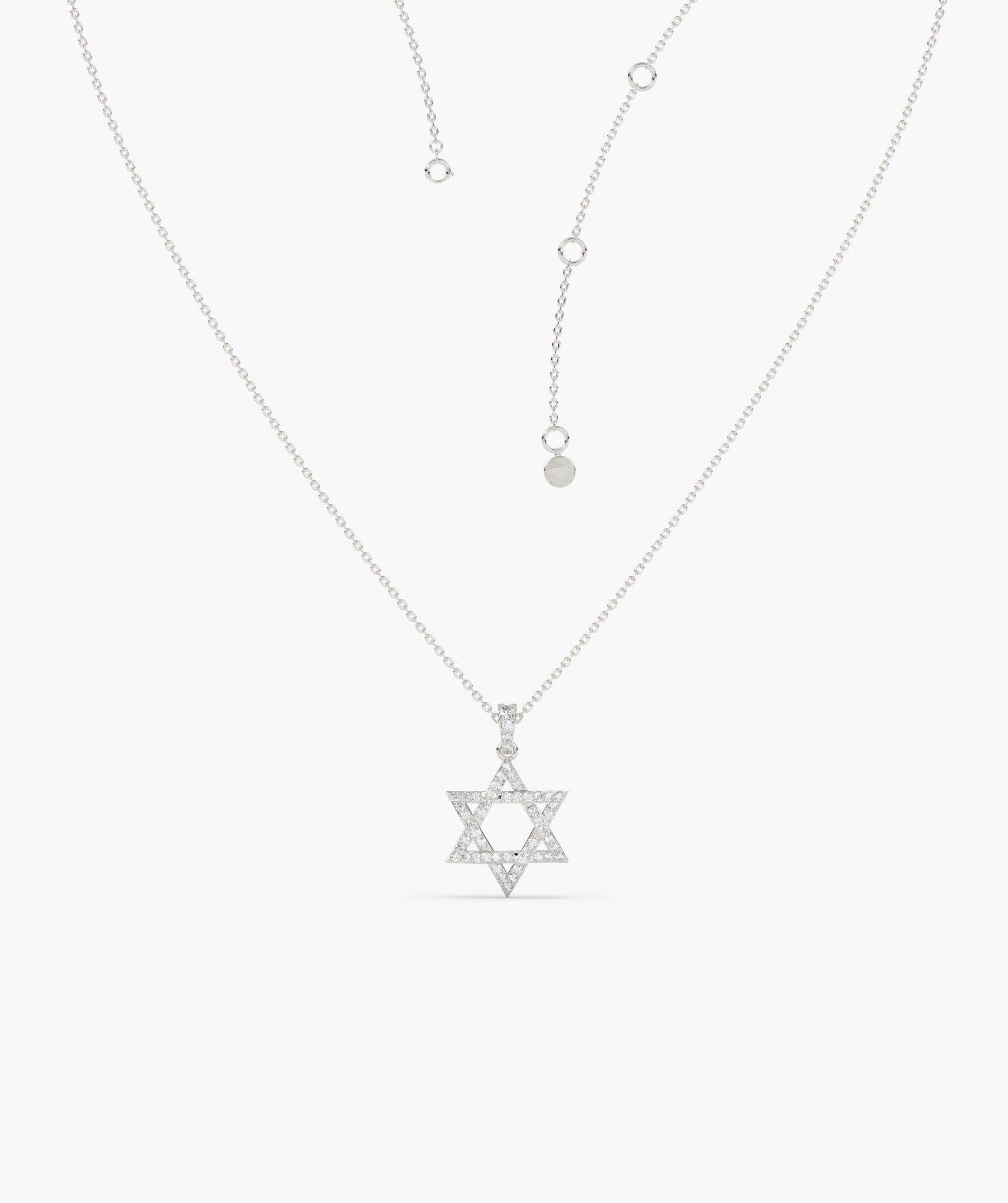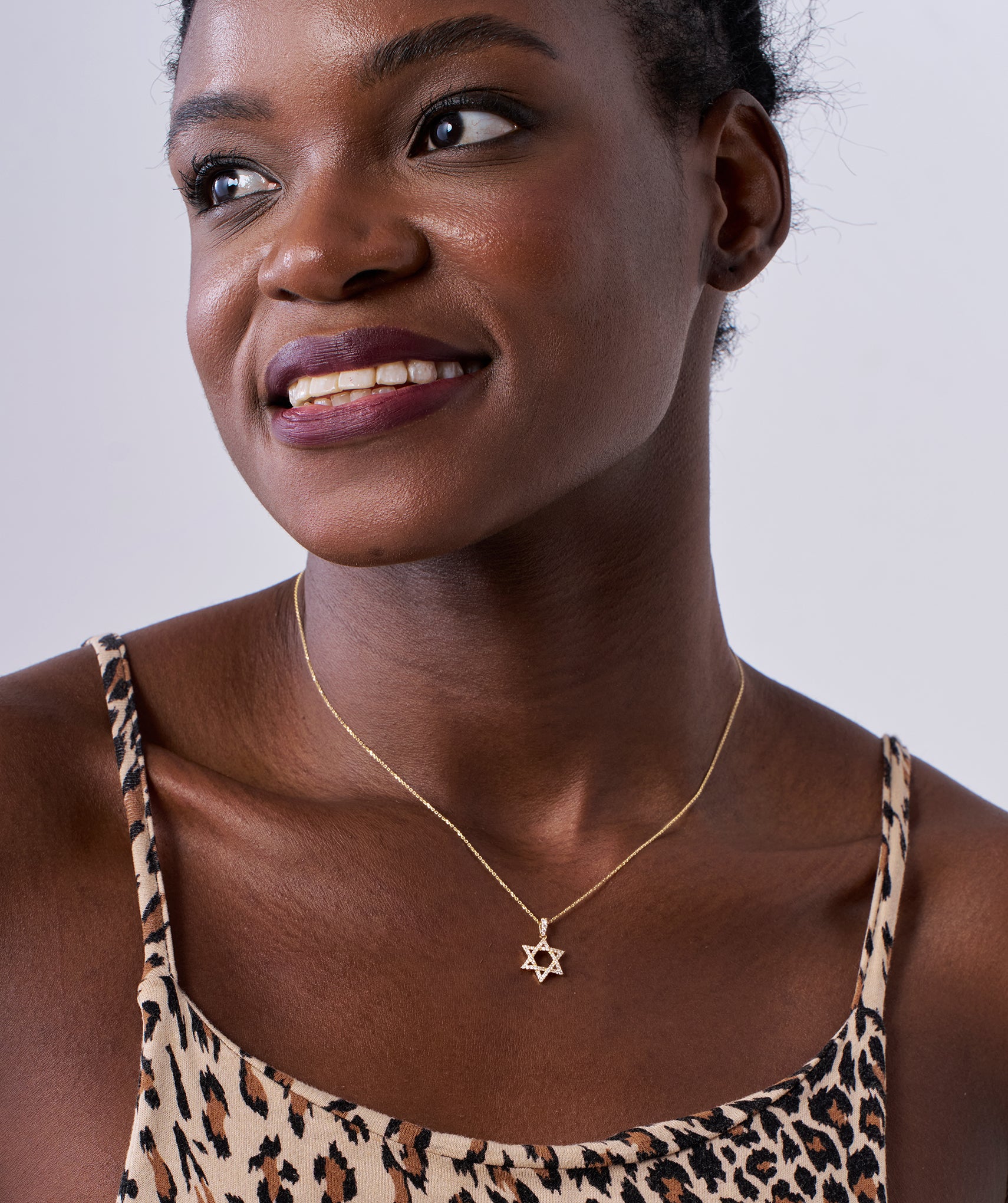 This 14K gold Star of David pendant dazzles with a detailed diamond setting, elegantly crafted to enhance any ensemble with a touch of heritage and sparkle.
