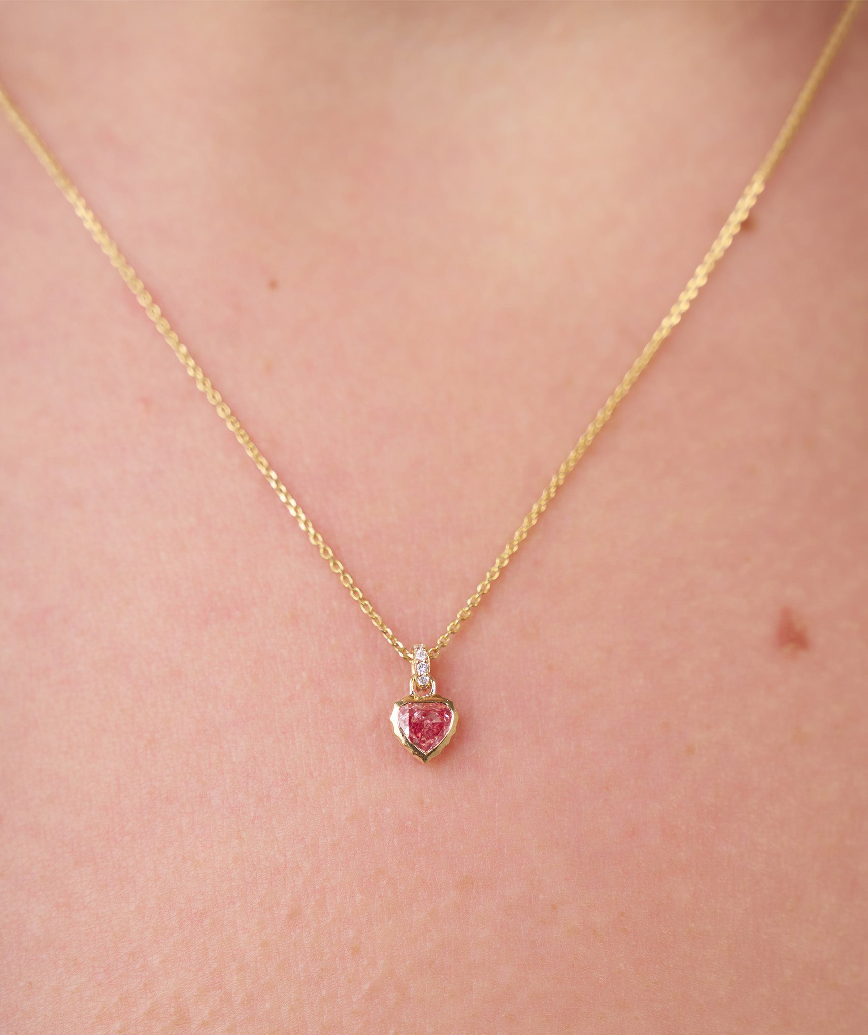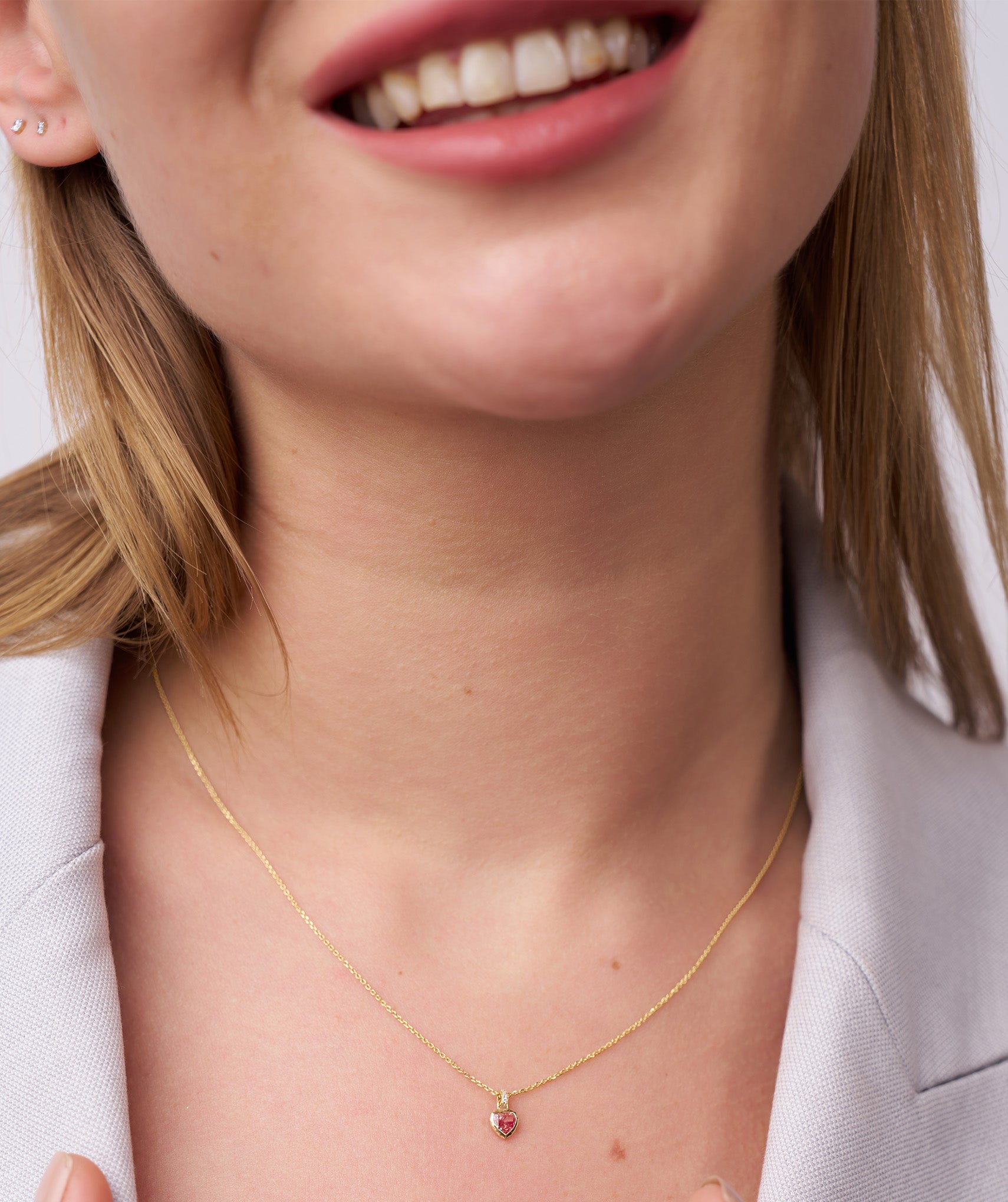 A modern twist on timeless elegance, this 14K solid gold necklace showcases a vivid red gem embraced by dazzling pavé stones.
