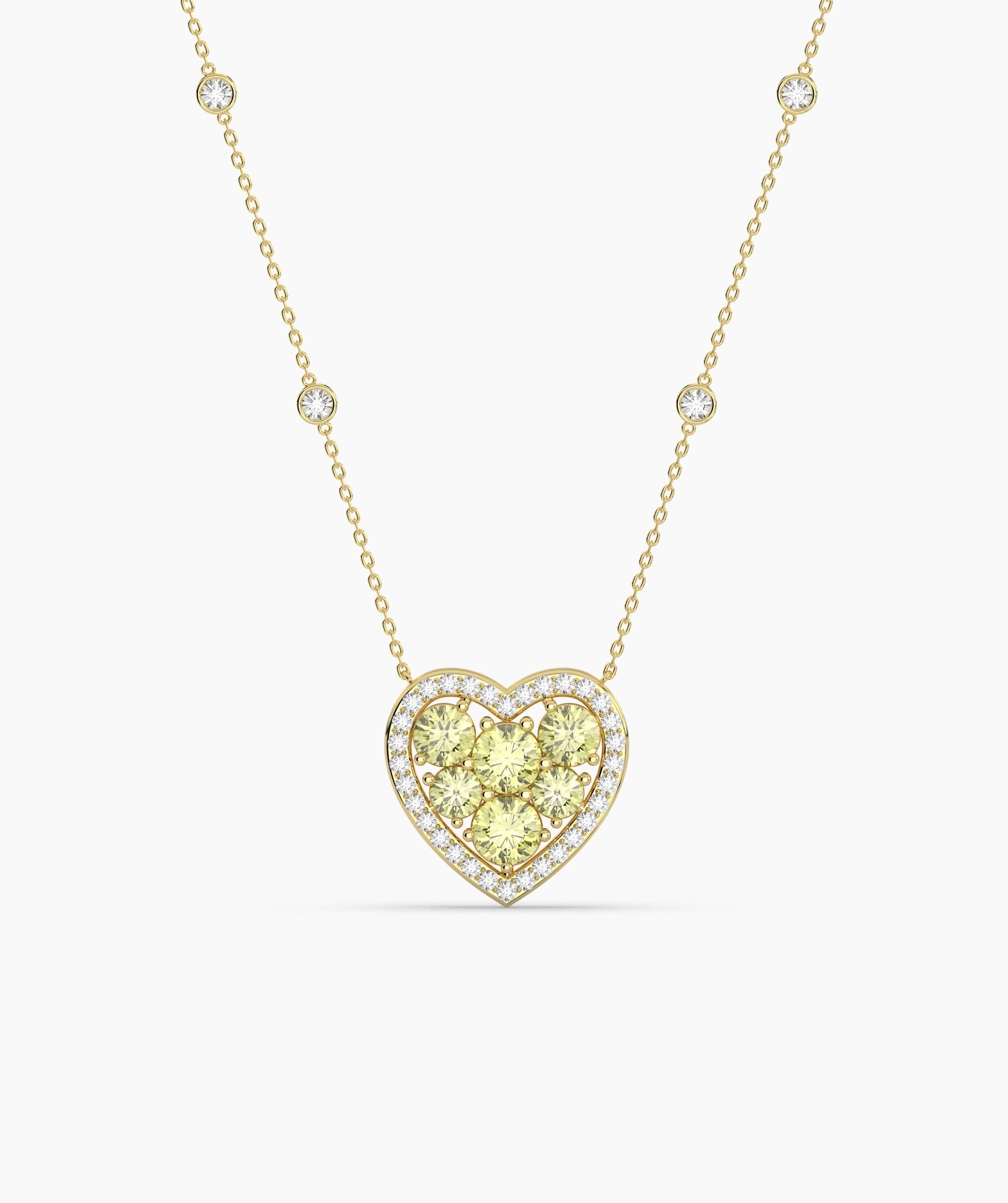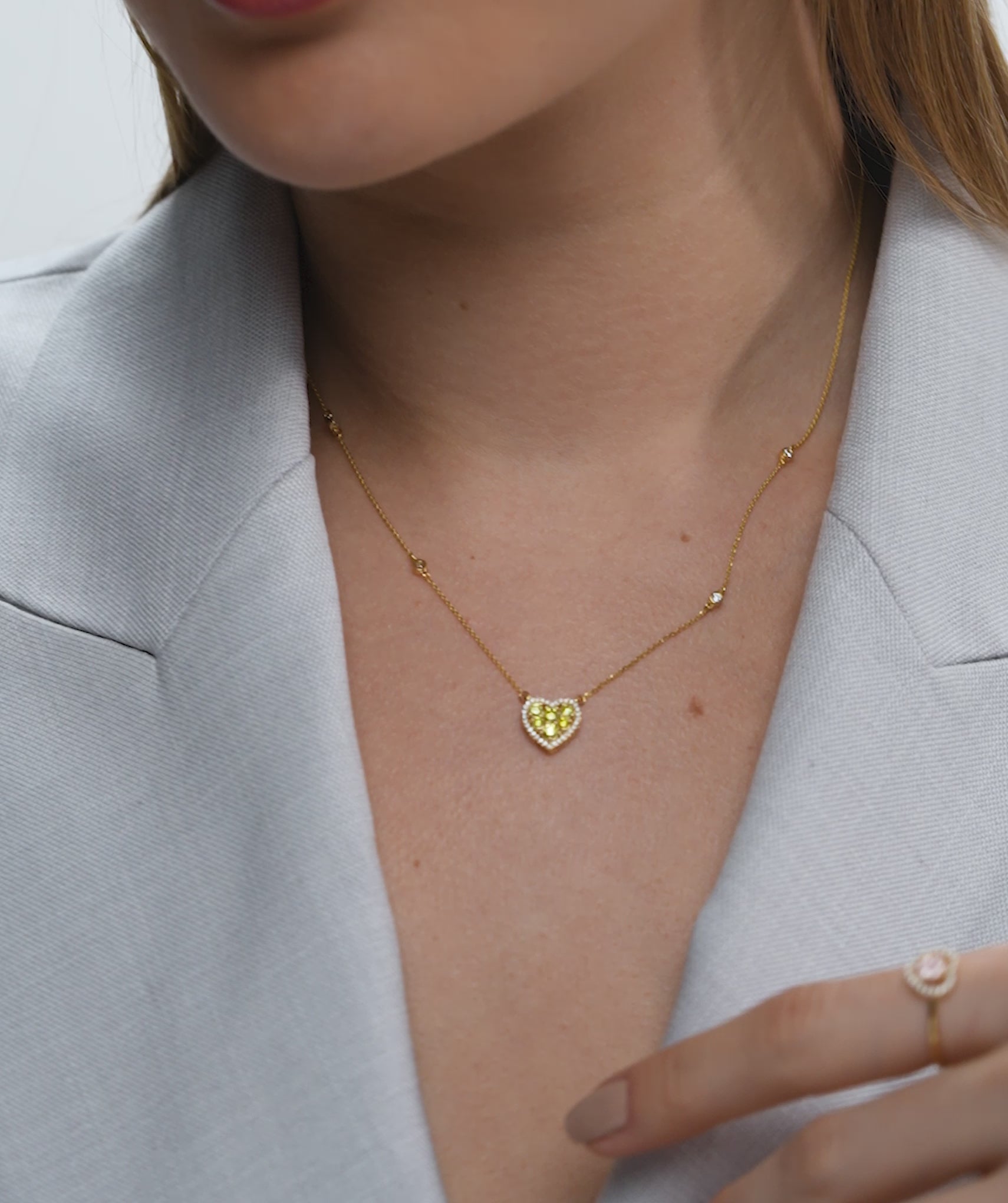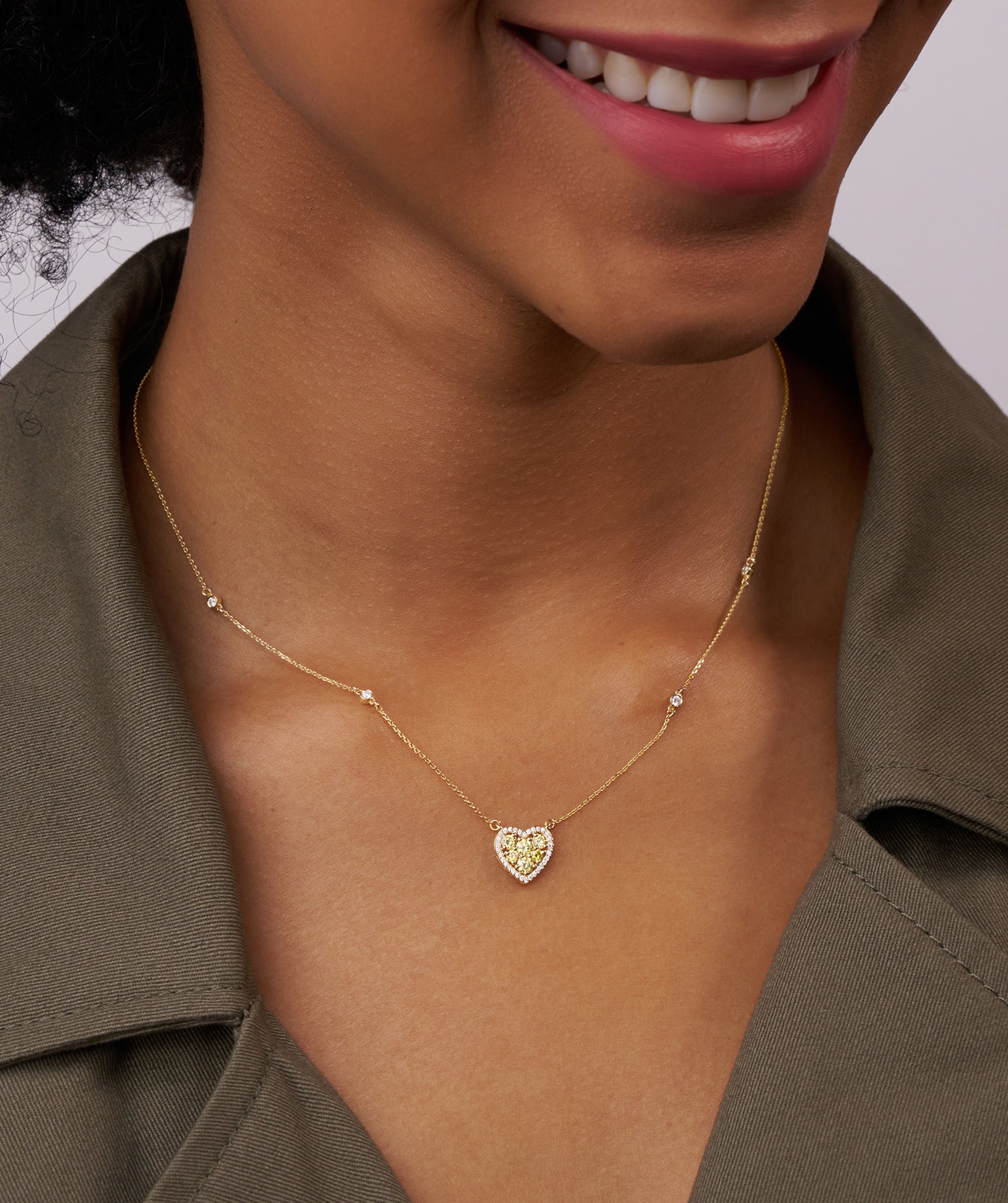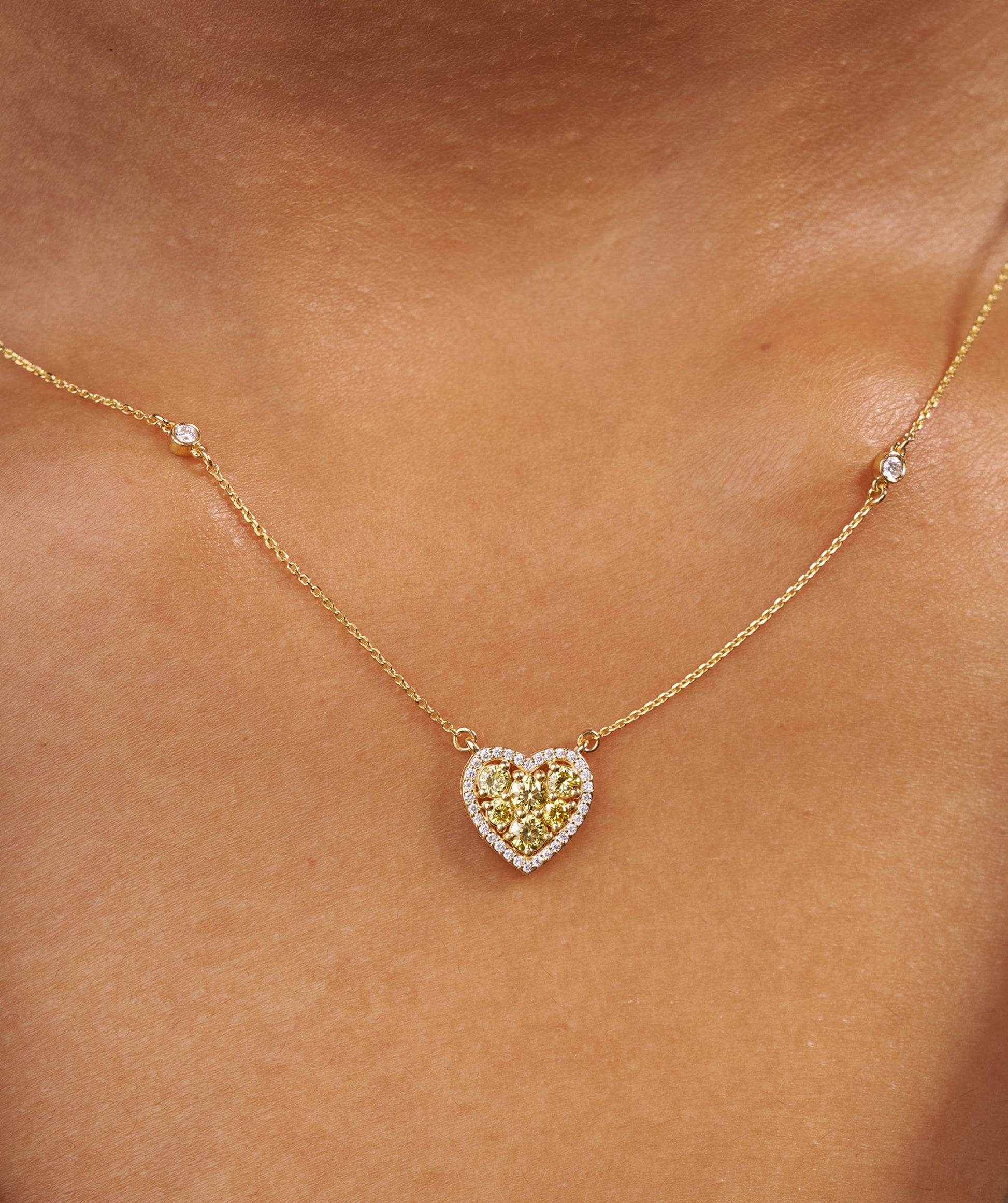 This exquisite necklace features a cluster of sparkling yellow diamonds in a heart silhouette, symbolizing love and elegance.