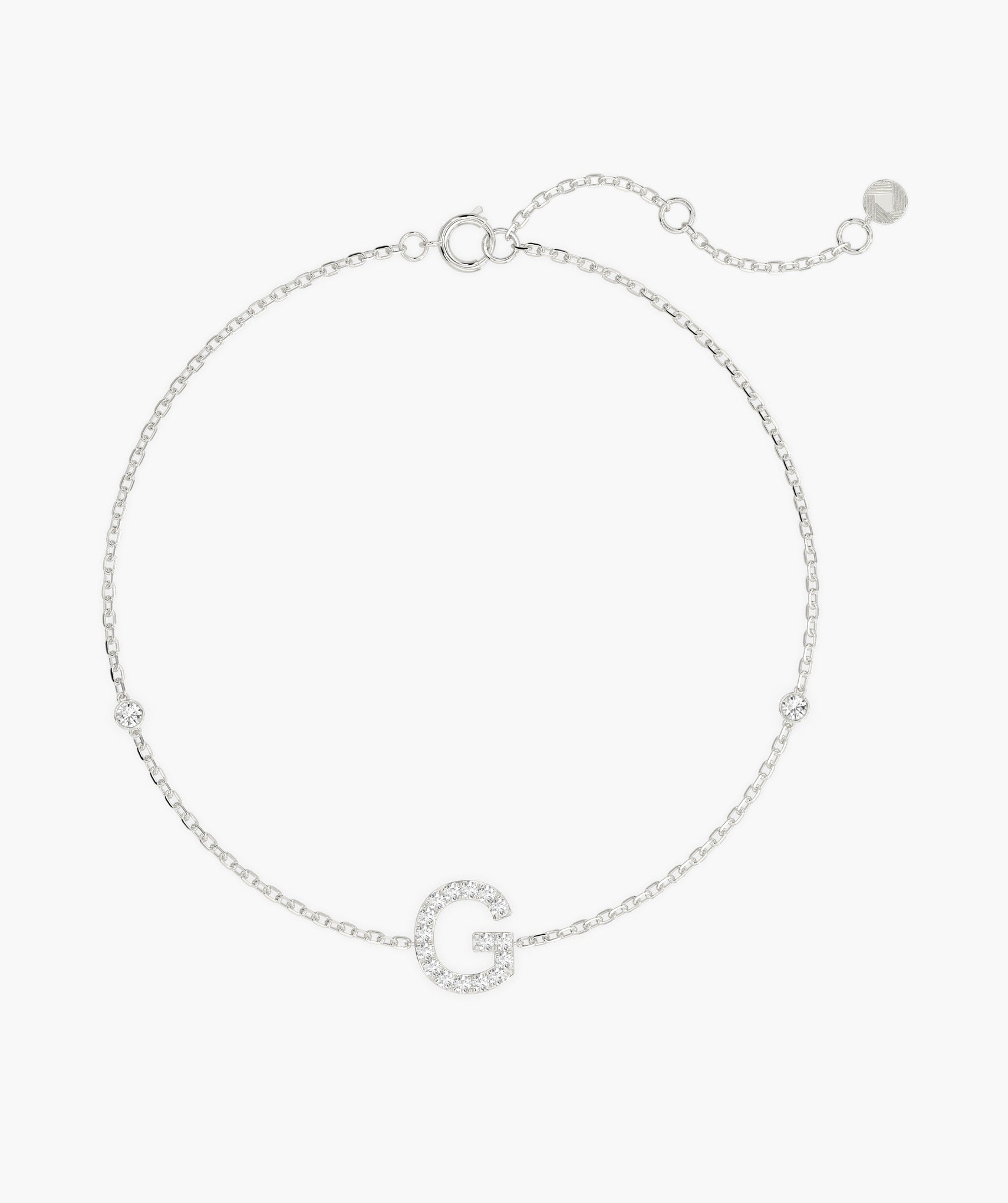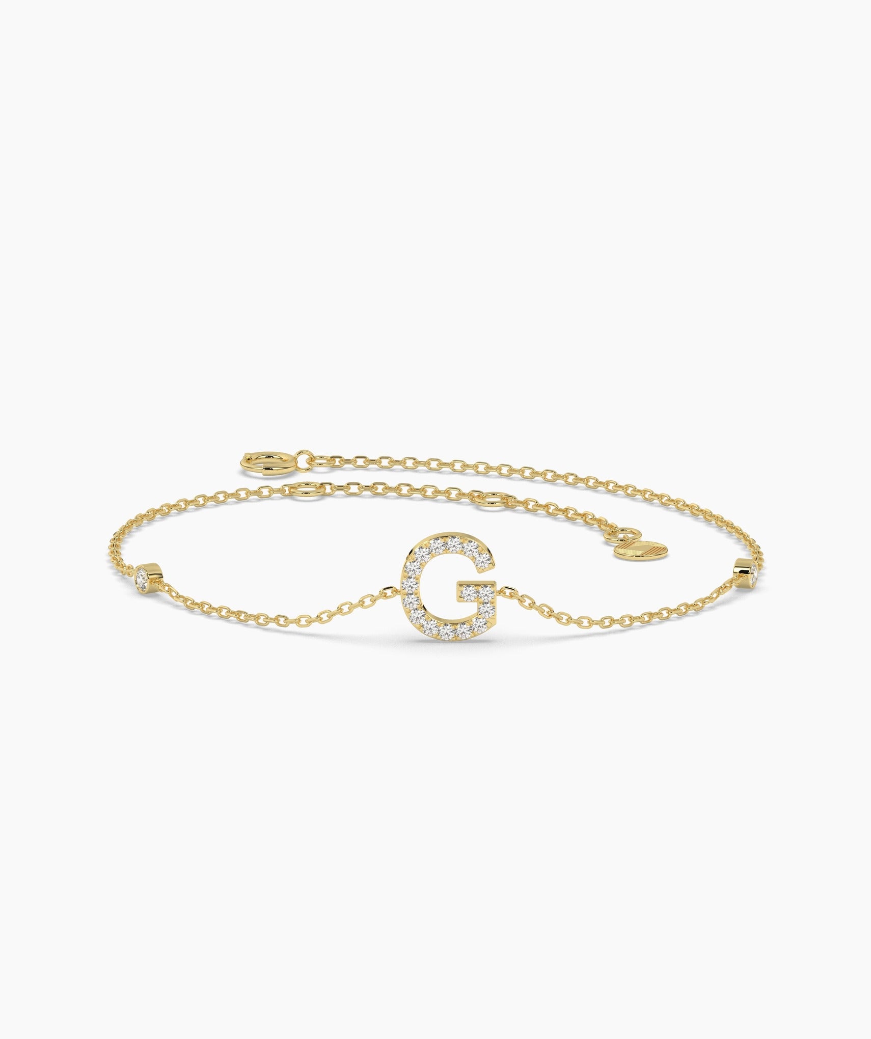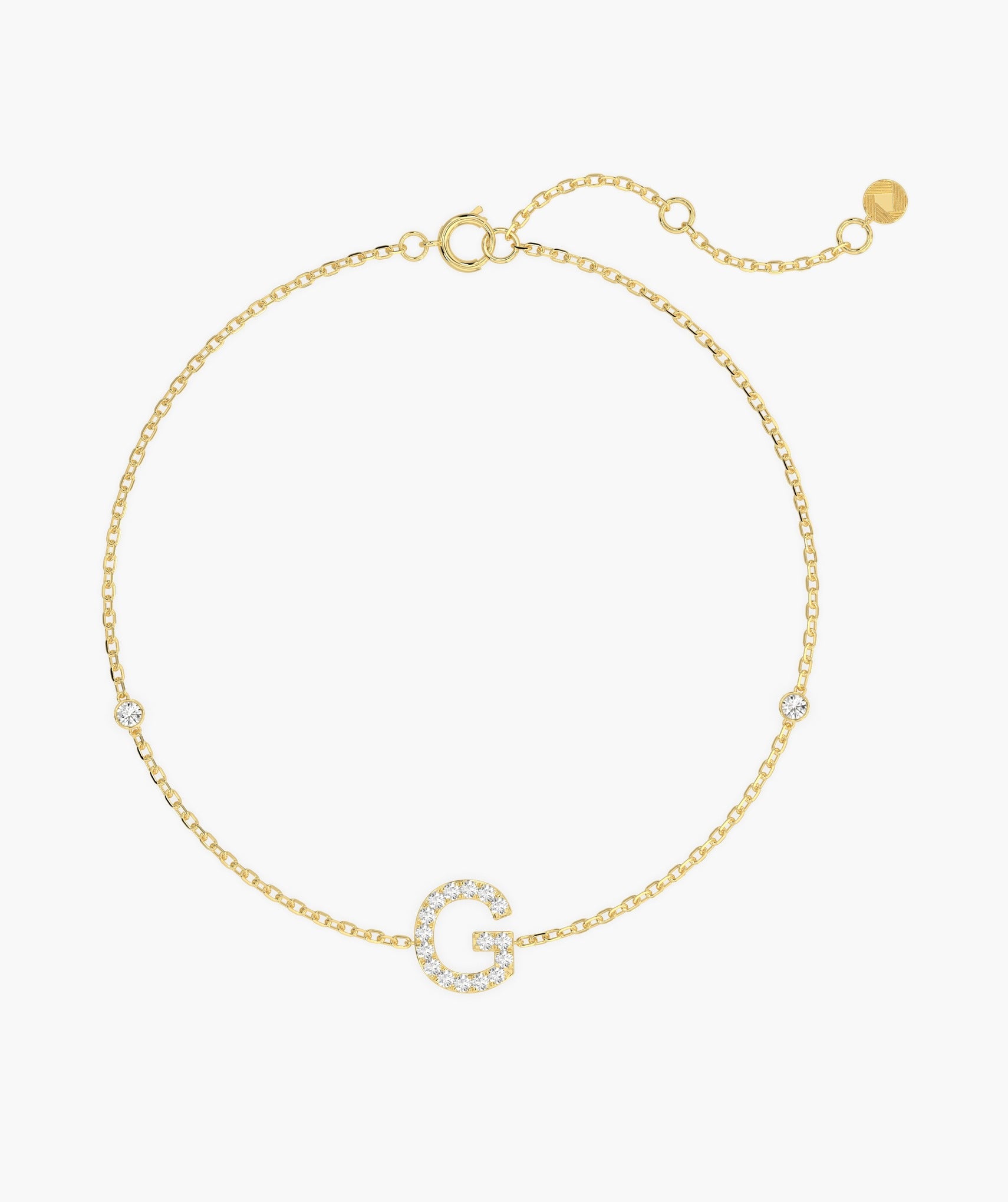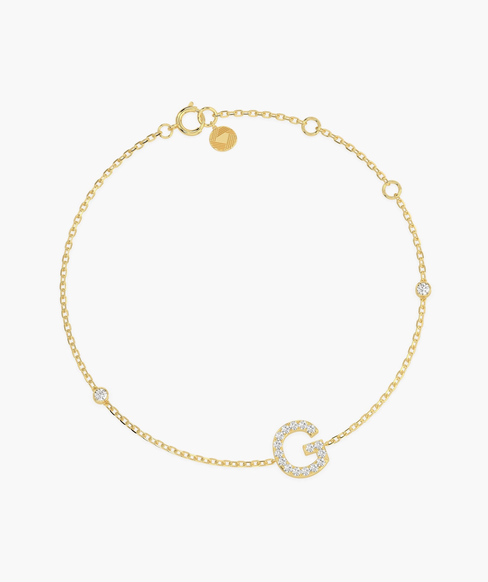 A minimal yet chic bracelet, featuring the initial 'G' in a 14K gold setting adorned with bright diamonds, perfect for personalization and everyday wear.