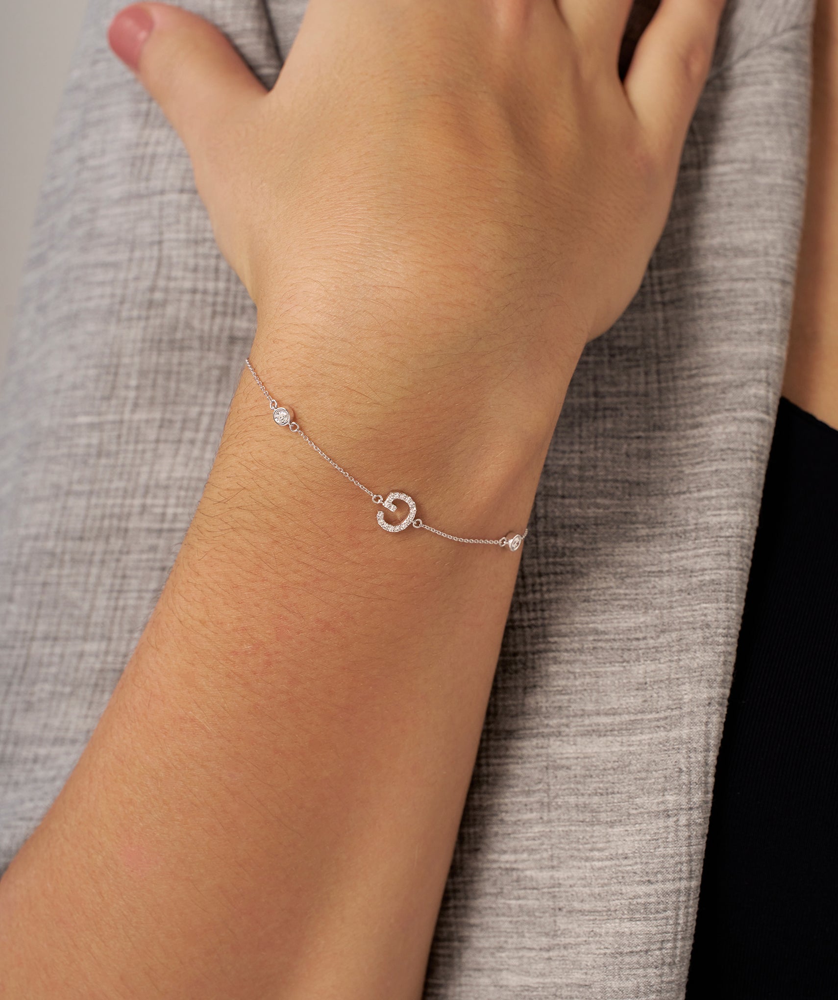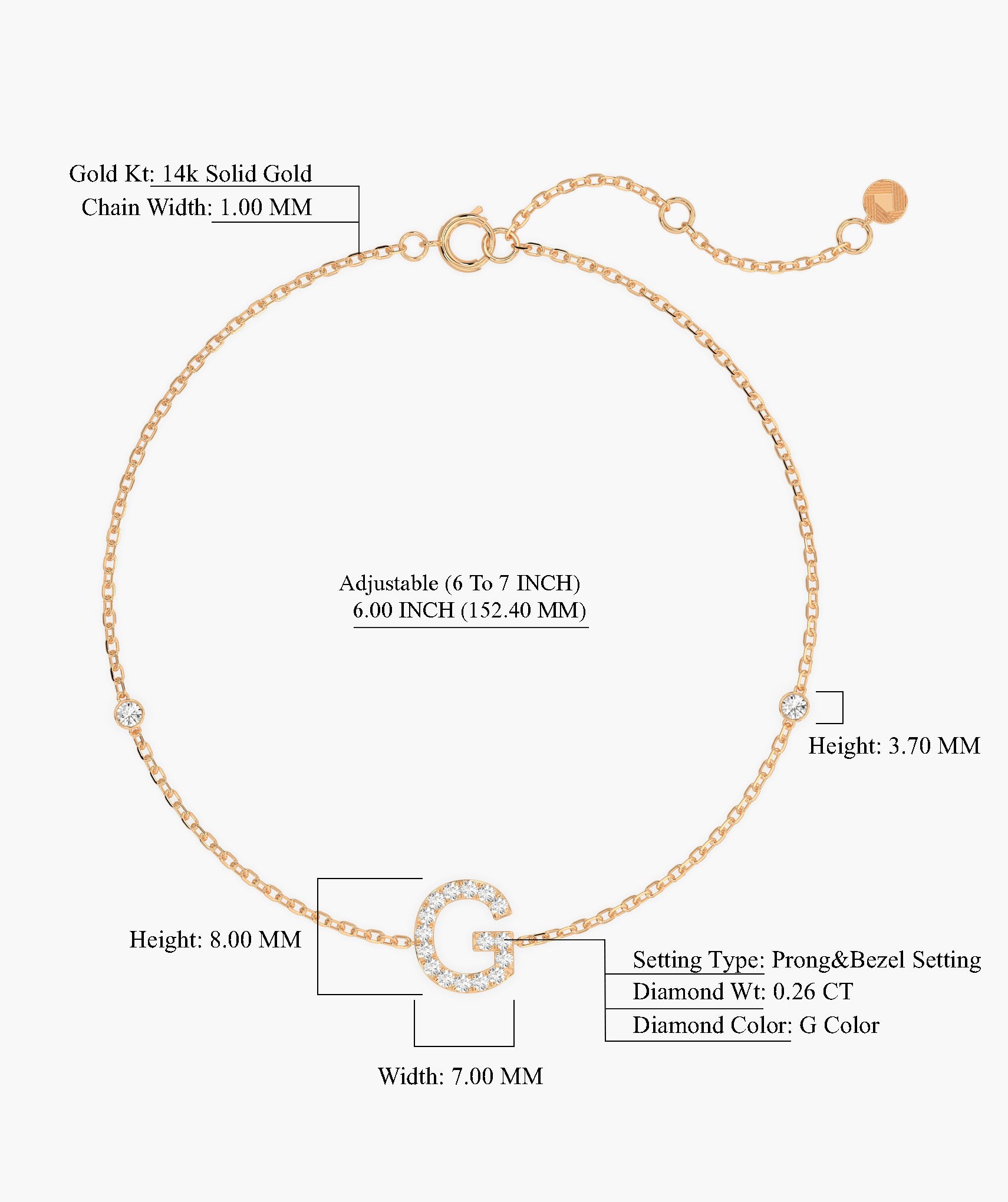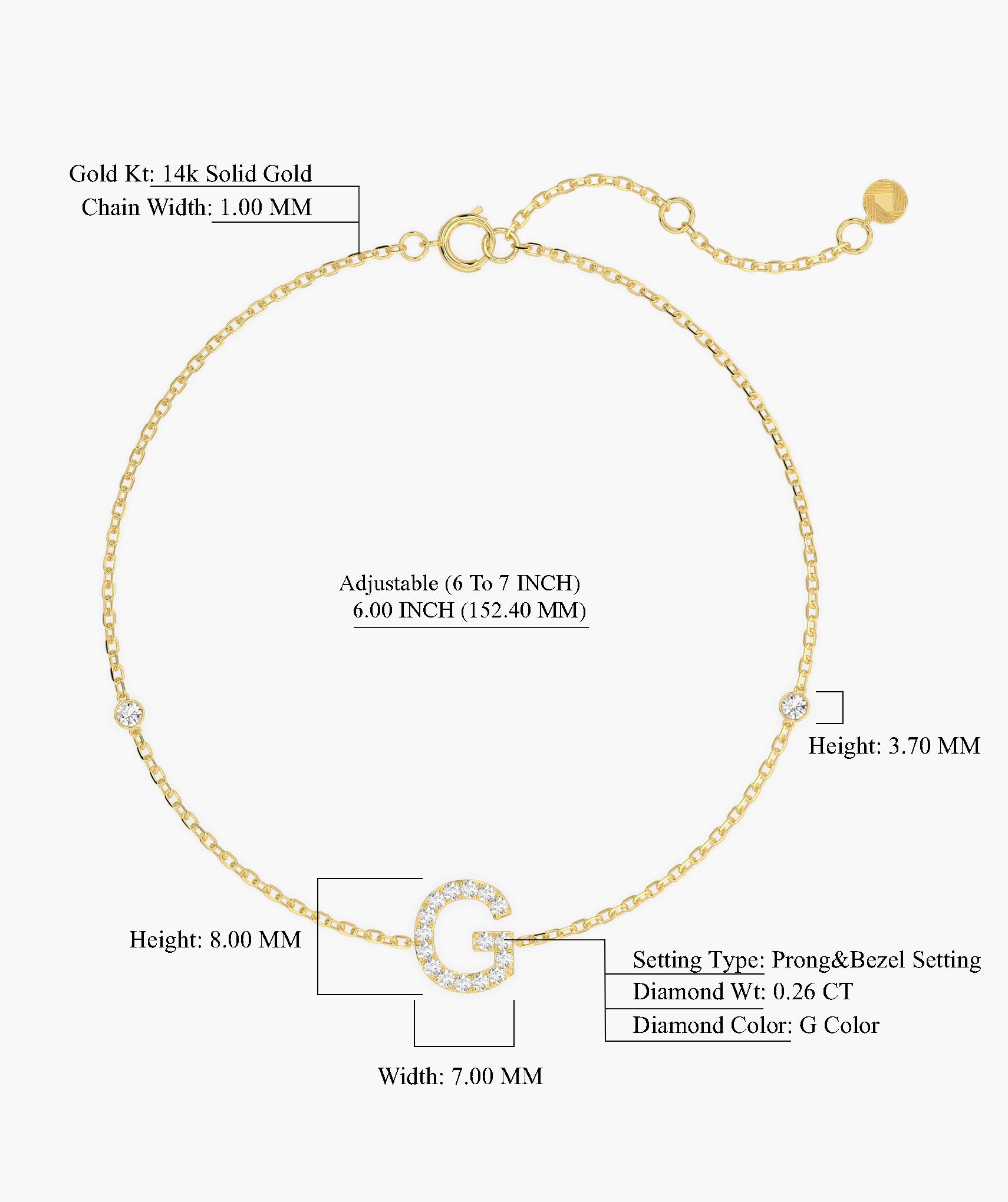 A minimal yet chic bracelet, featuring the initial 'G' in a 14K gold setting adorned with bright diamonds, perfect for personalization and everyday wear.