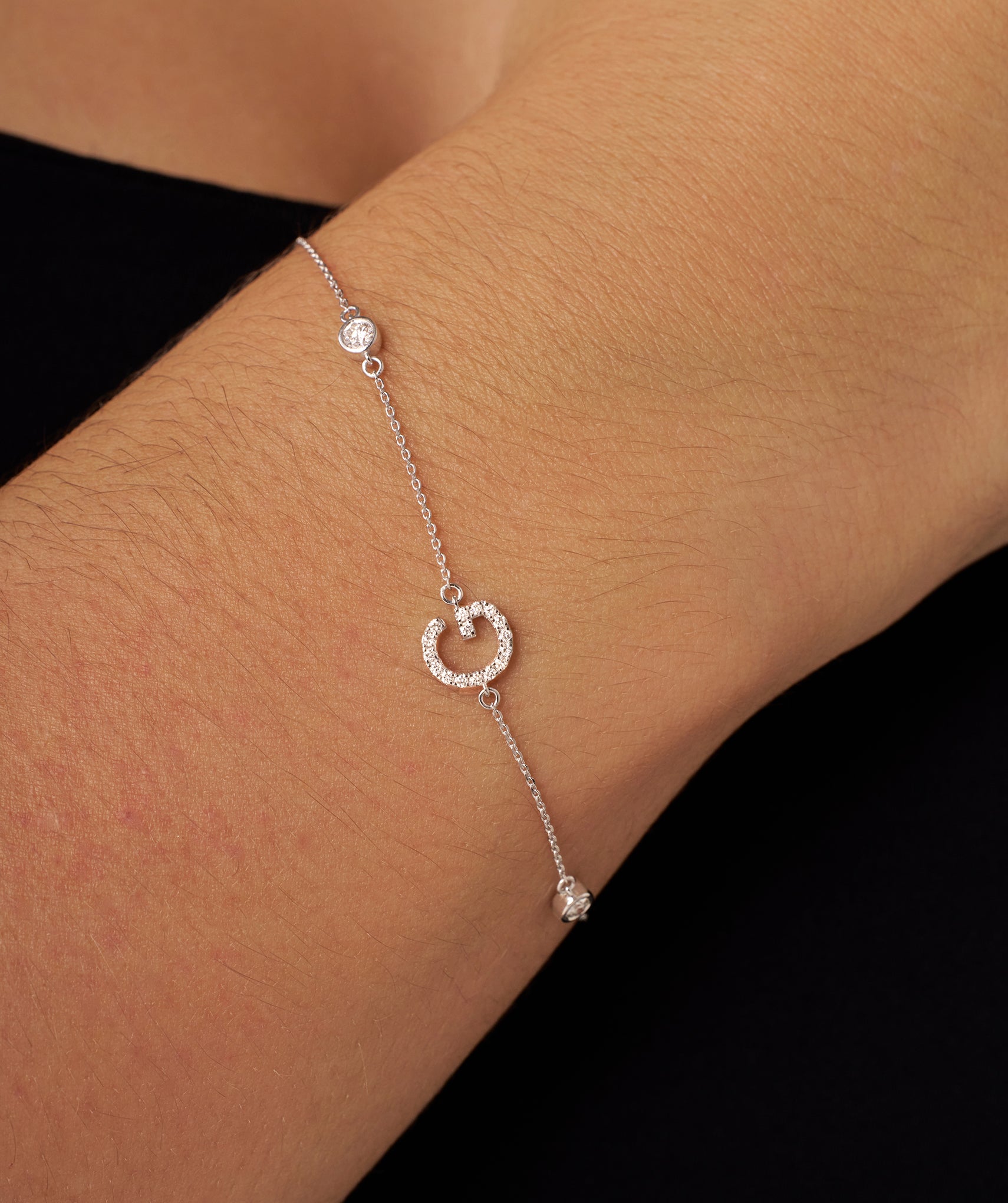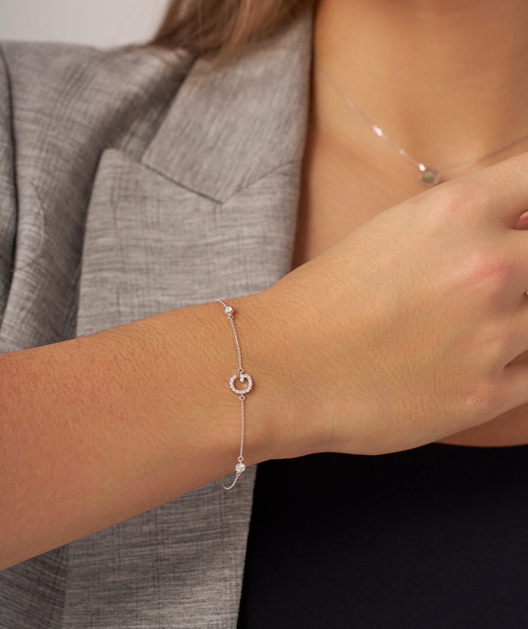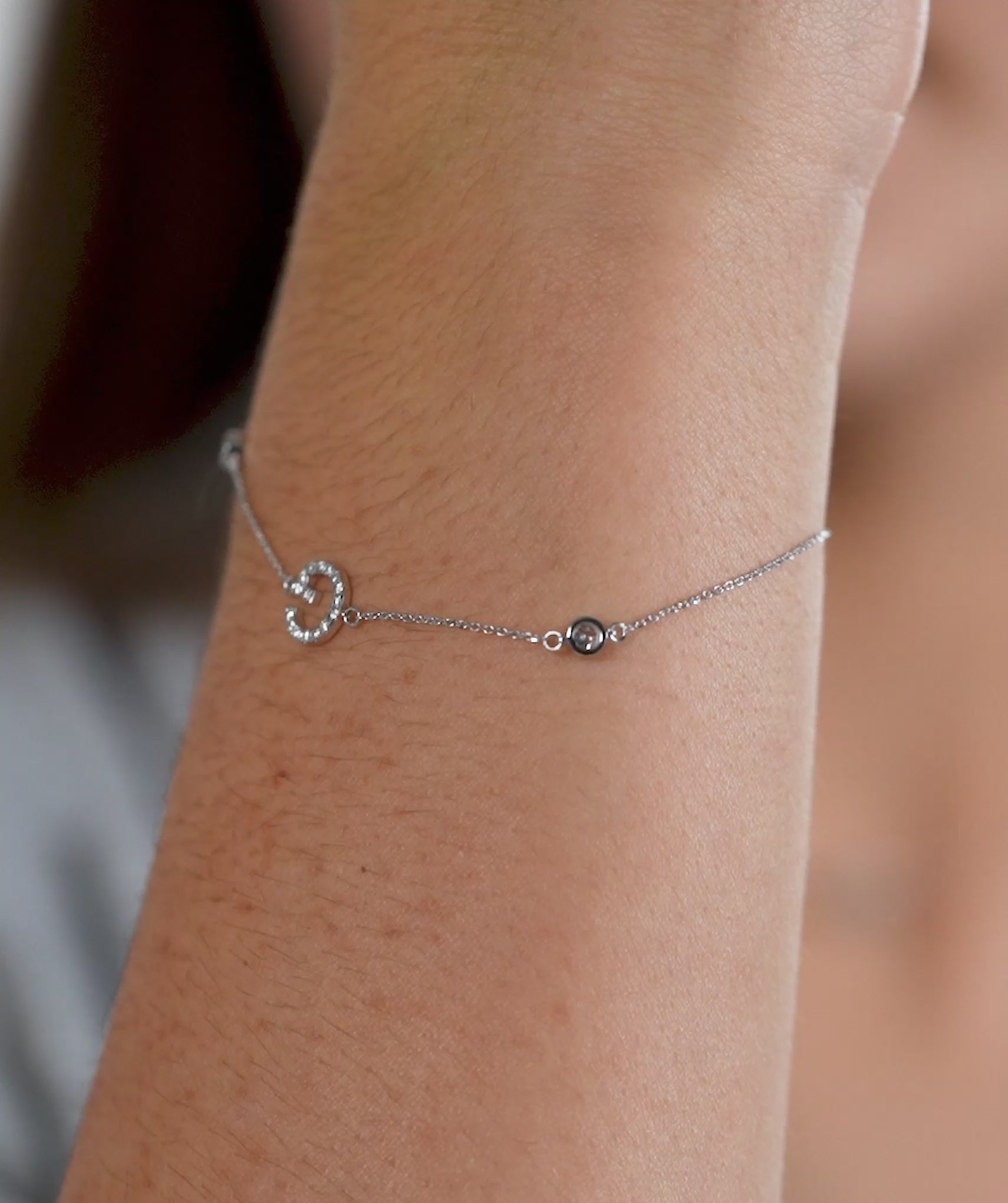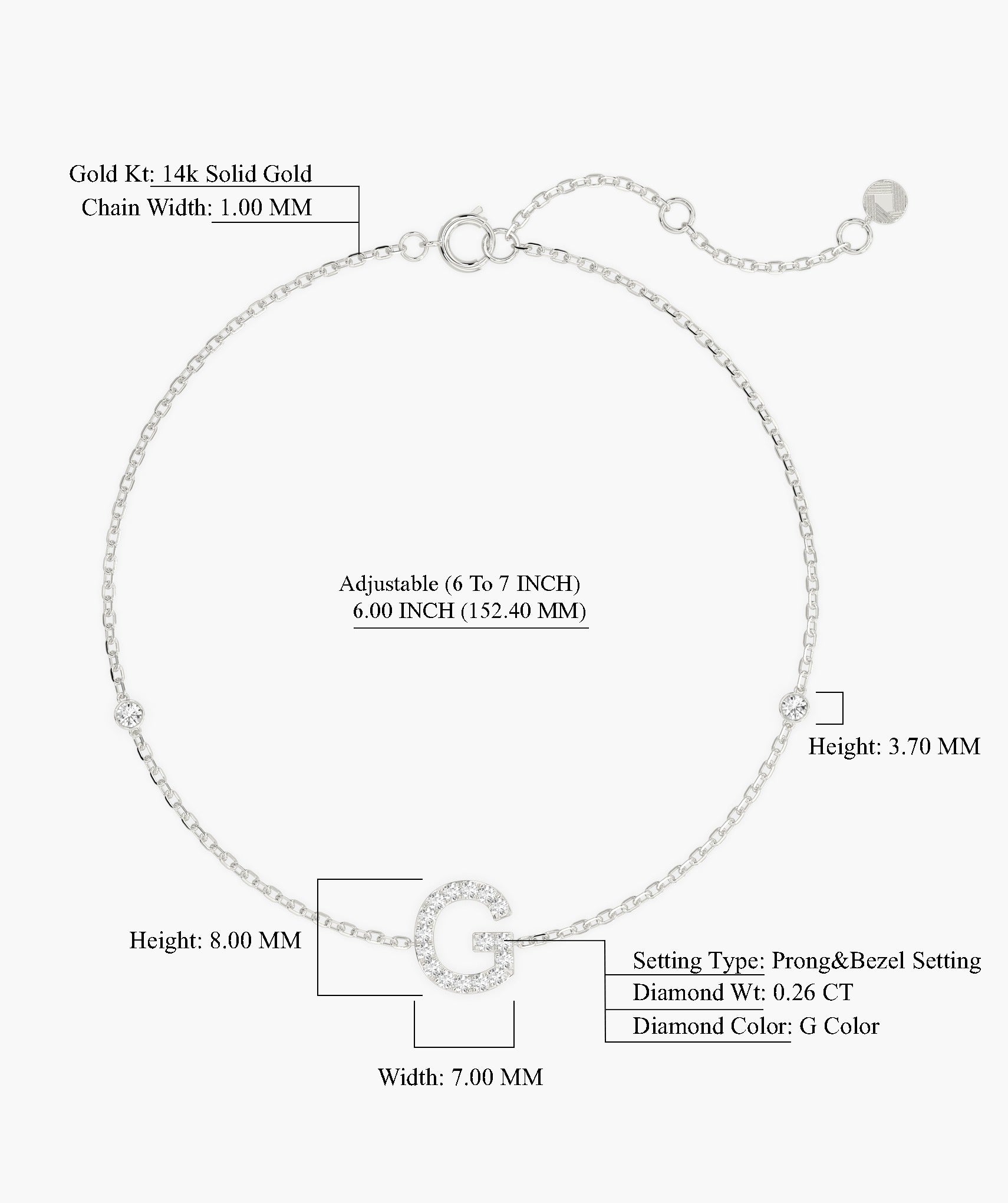 A minimal yet chic bracelet, featuring the initial 'G' in a 14K gold setting adorned with bright diamonds, perfect for personalization and everyday wear.