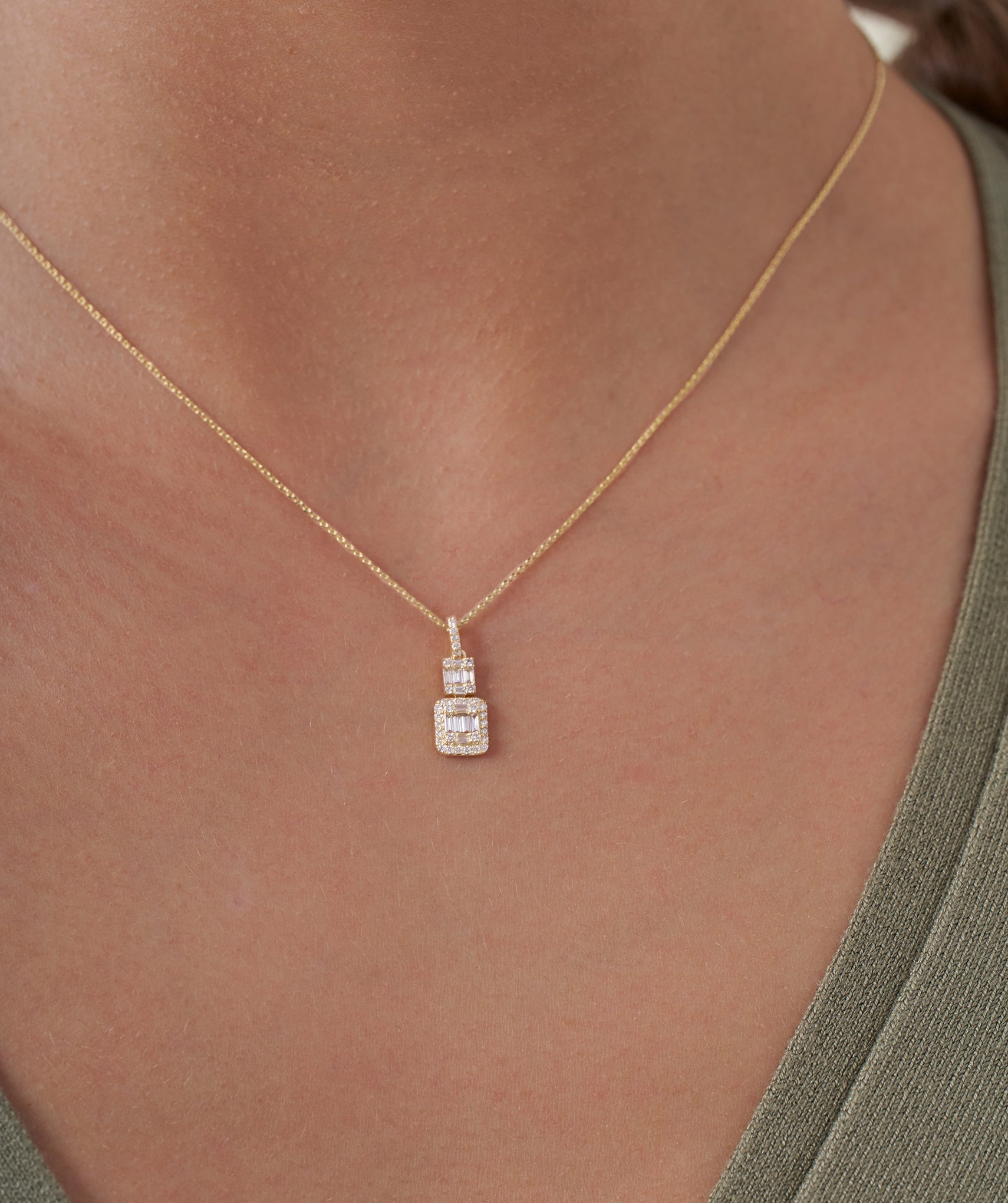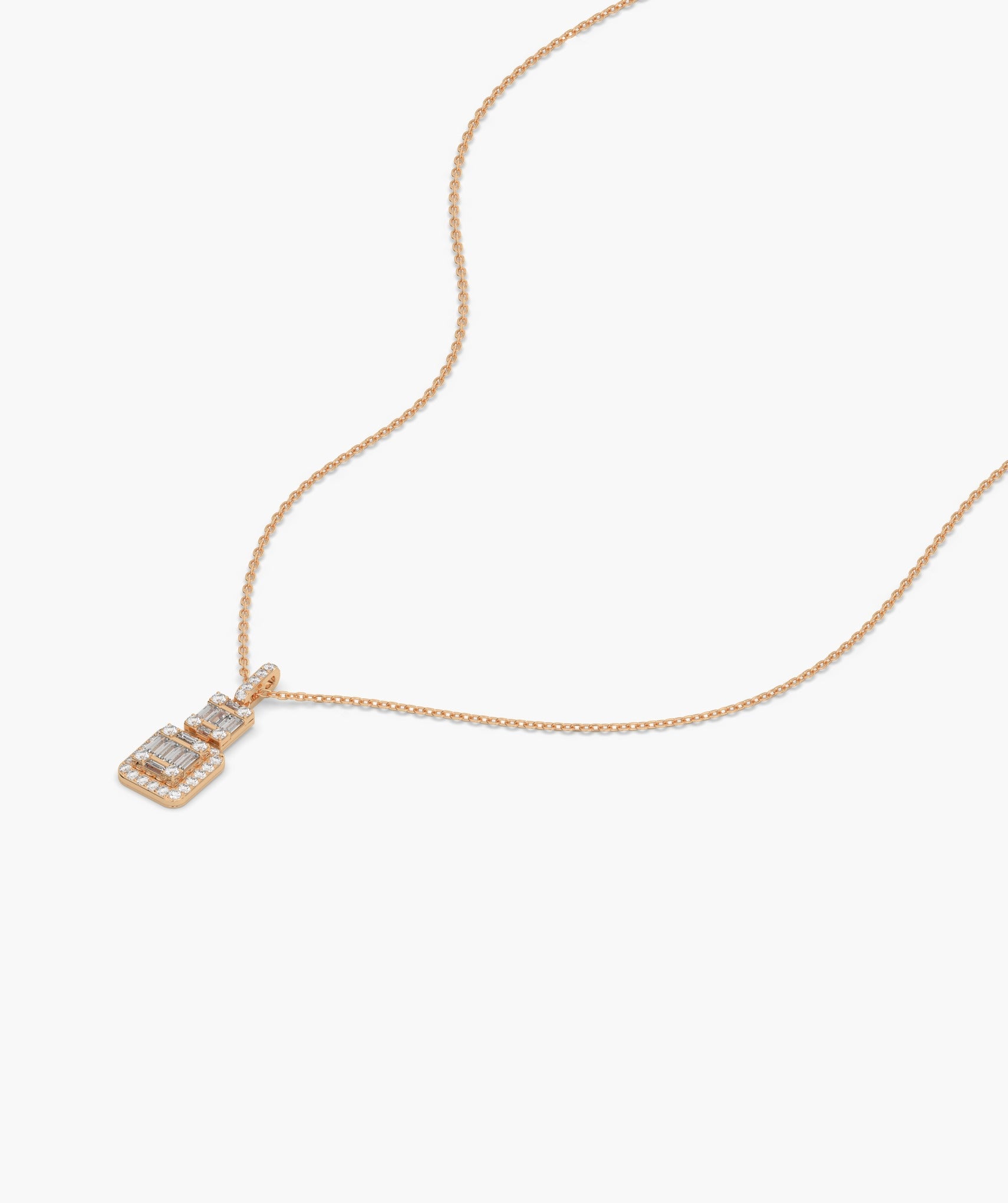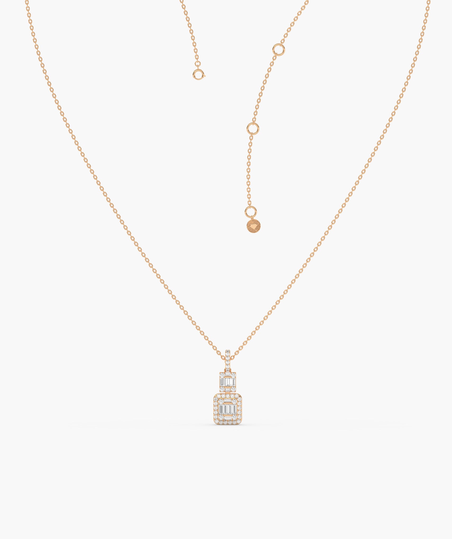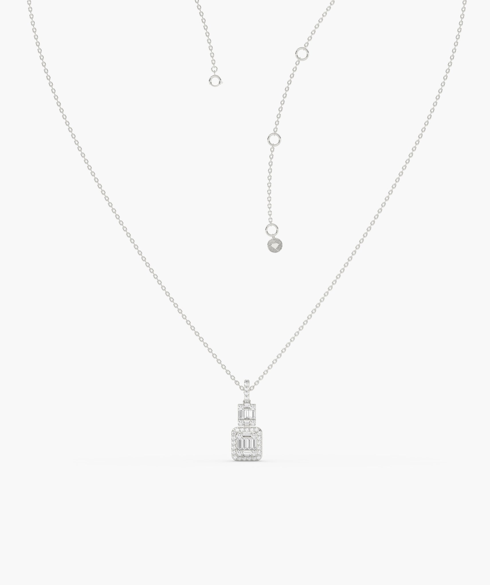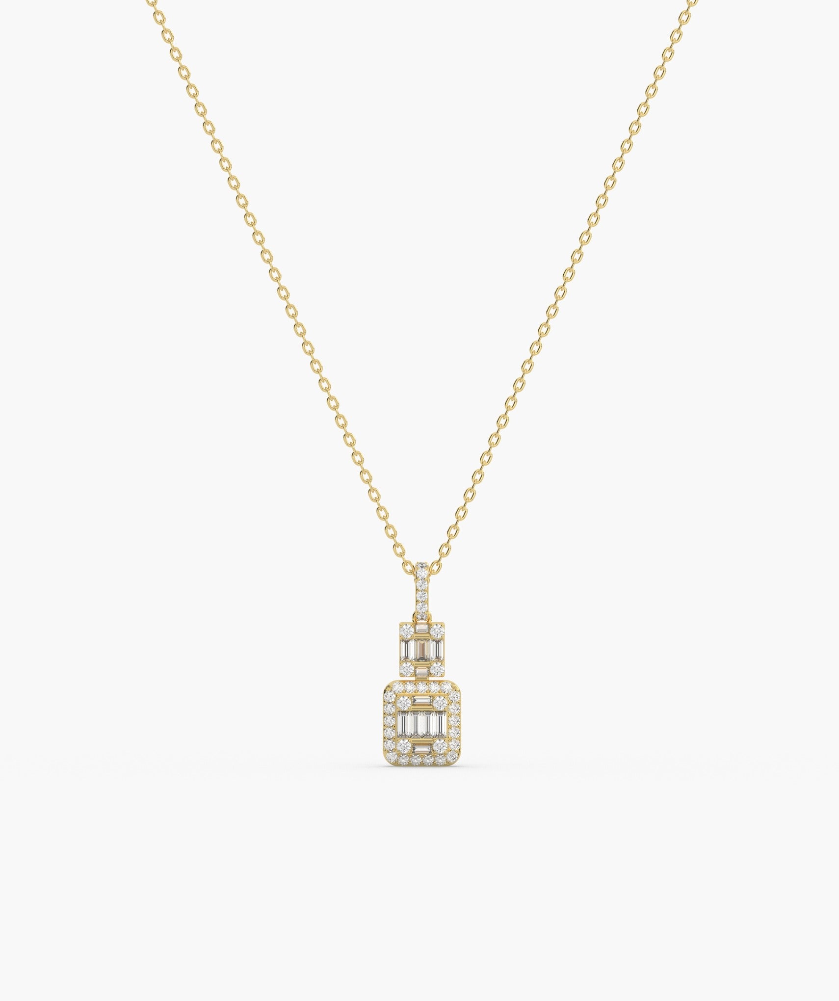Sophisticated 14K gold necklace with a geometric pendant, adorned with tiers of baguette and round diamonds, offering sleek, modern elegance.