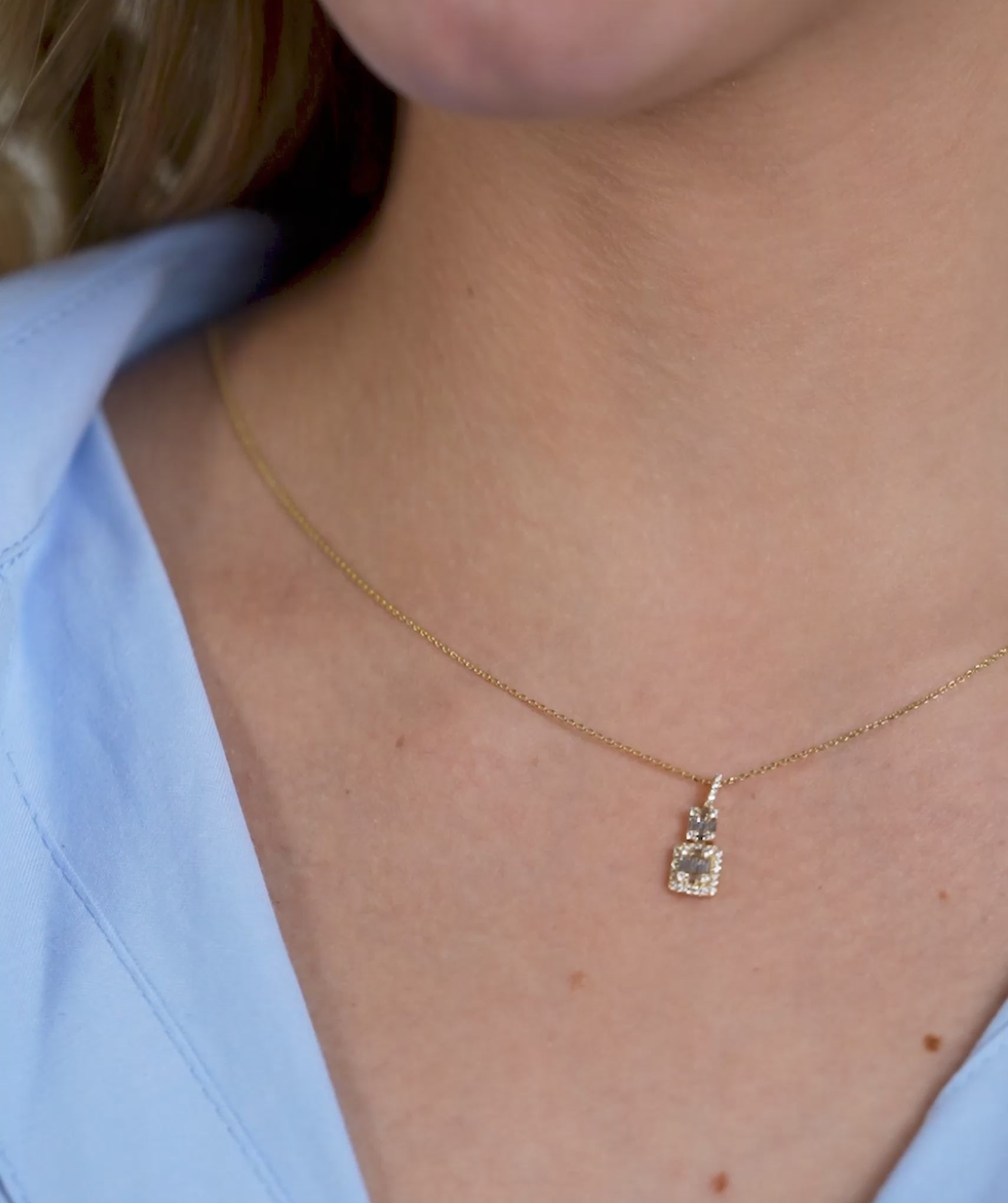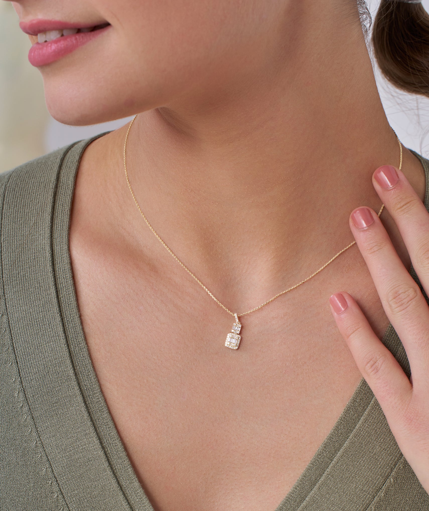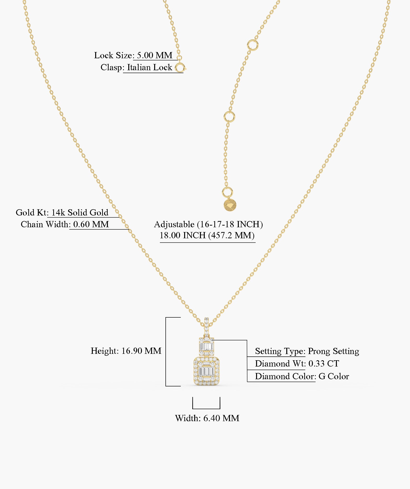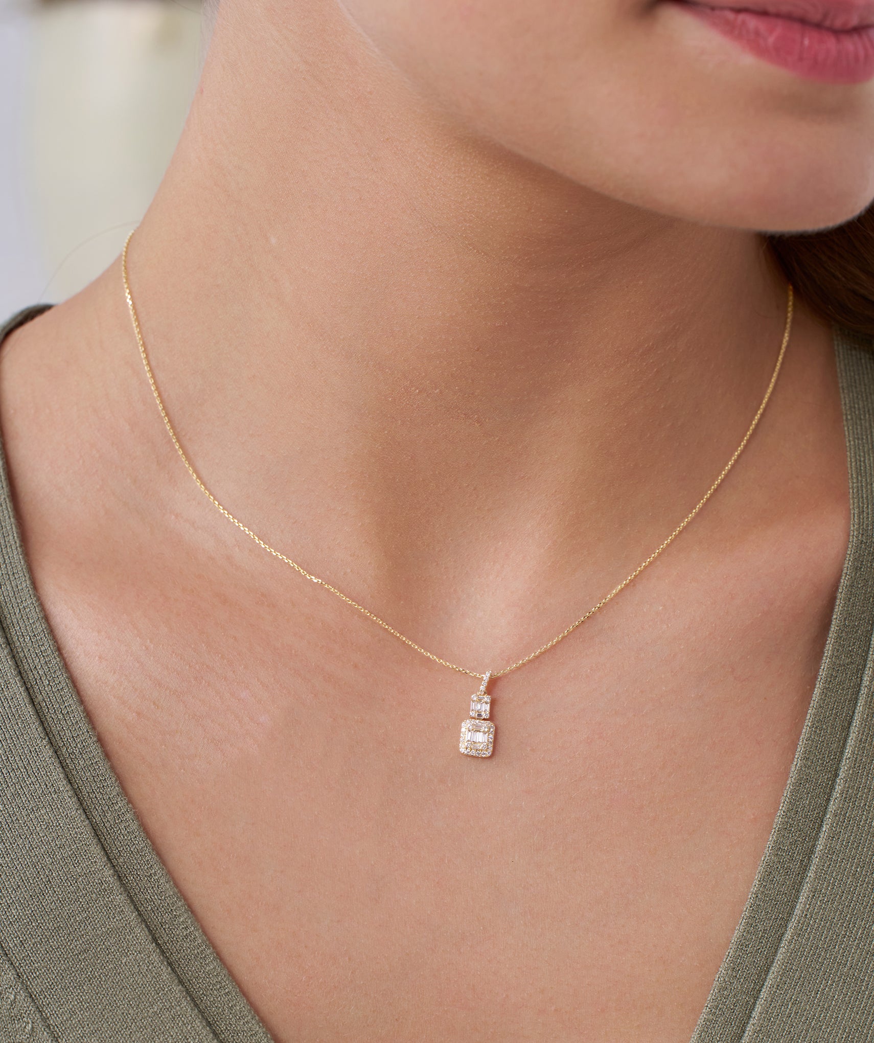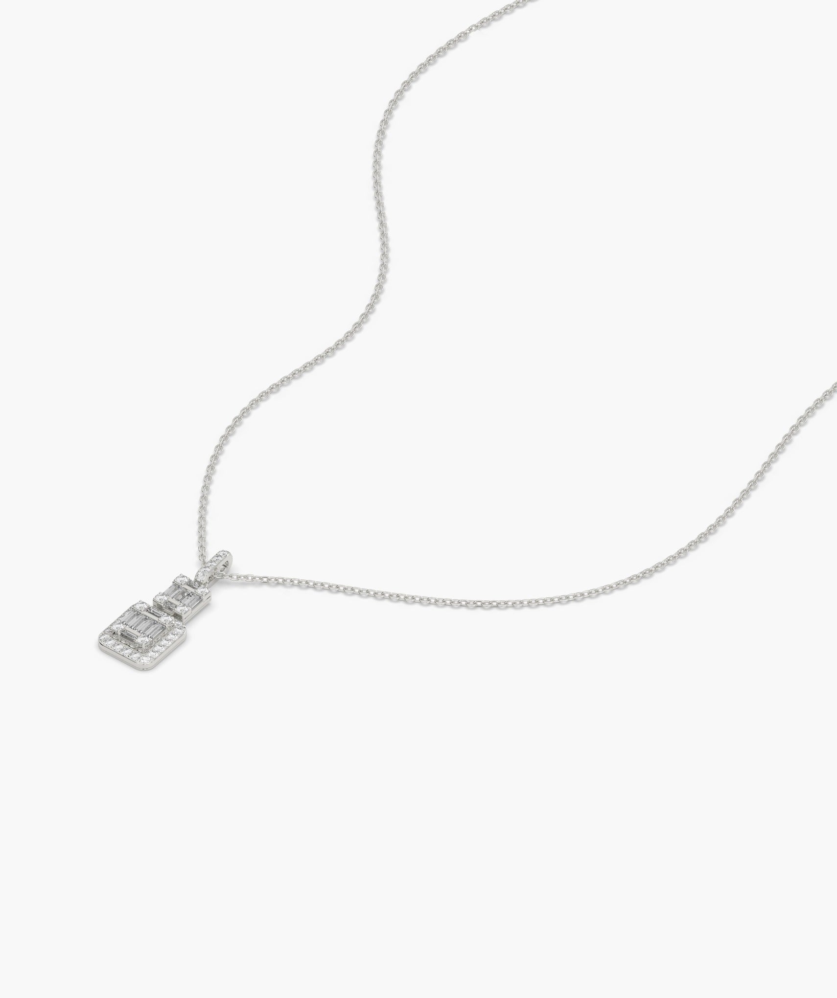 Sophisticated 14K gold necklace with a geometric pendant, adorned with tiers of baguette and round diamonds, offering sleek, modern elegance.