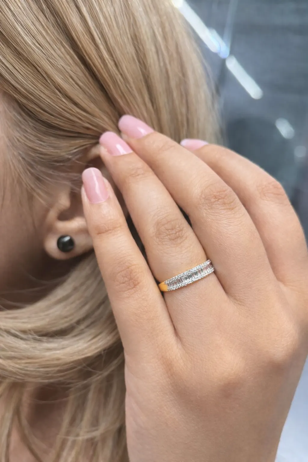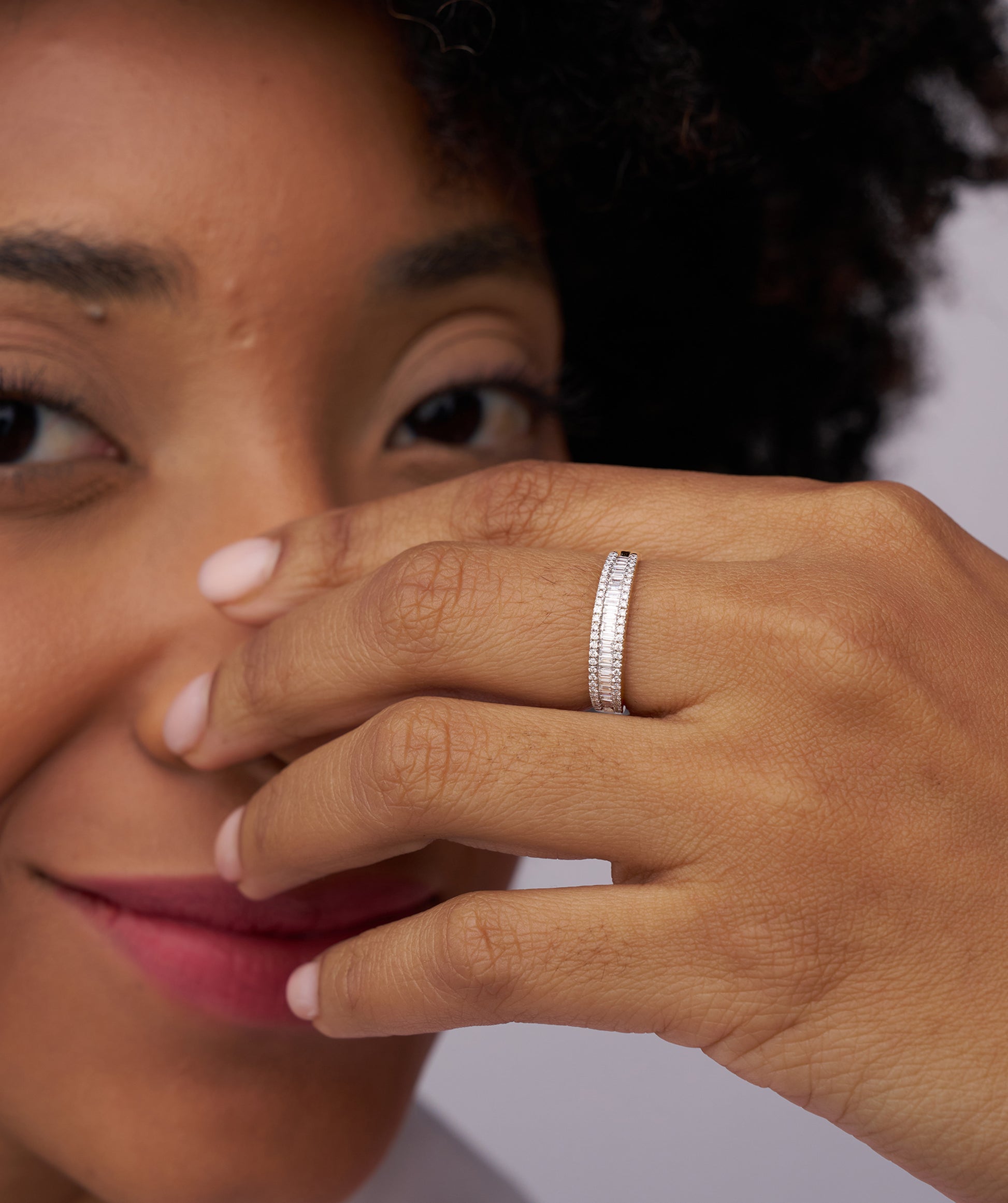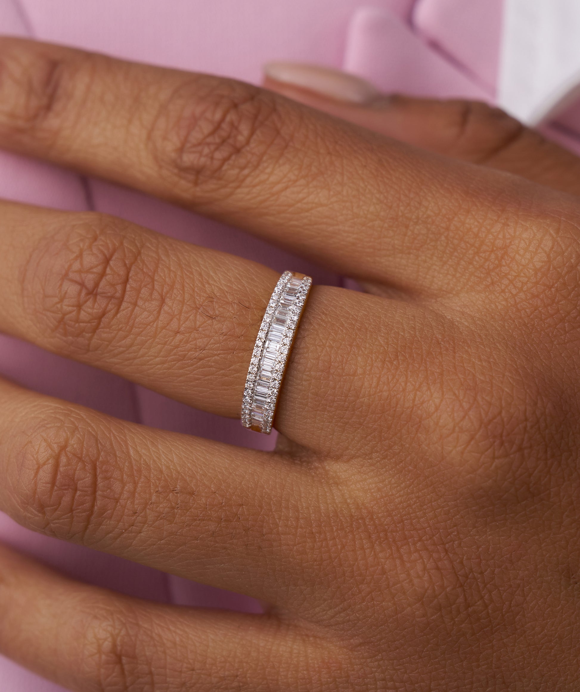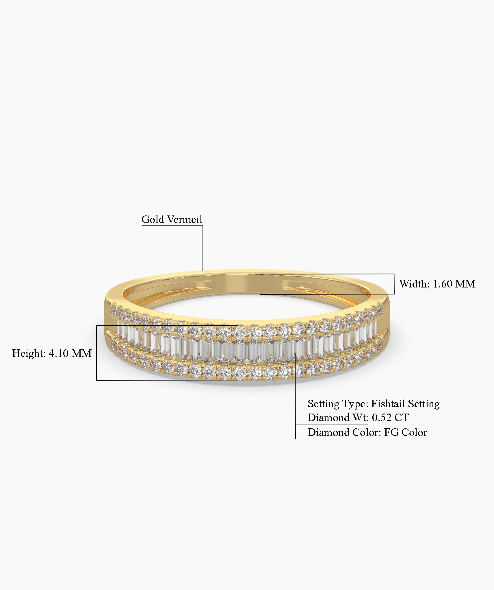 Defined by a striking architectural contrast, this triple row band is for the woman who isn't afraid to make a statement while keeping things effortless. The design features a central channel of crisp baguette cut VS-SI lab-grown diamonds, framed by two shimmering outer rows of round pave stones for a multi-dimensional sparkle. Hand-finished in polished gold vermeil, this piece offers a substantial look with a low-profile fit that remains comfortable through back-to-back meetings and late night gallery openings. It is available in yellow, white, and rose gold to perfectly complement your signature jewelry style. Whether worn as the centerpiece of a stack or a standalone bold accent, this band captures the rebellious yet refined spirit of fine jewelry made for daily life.