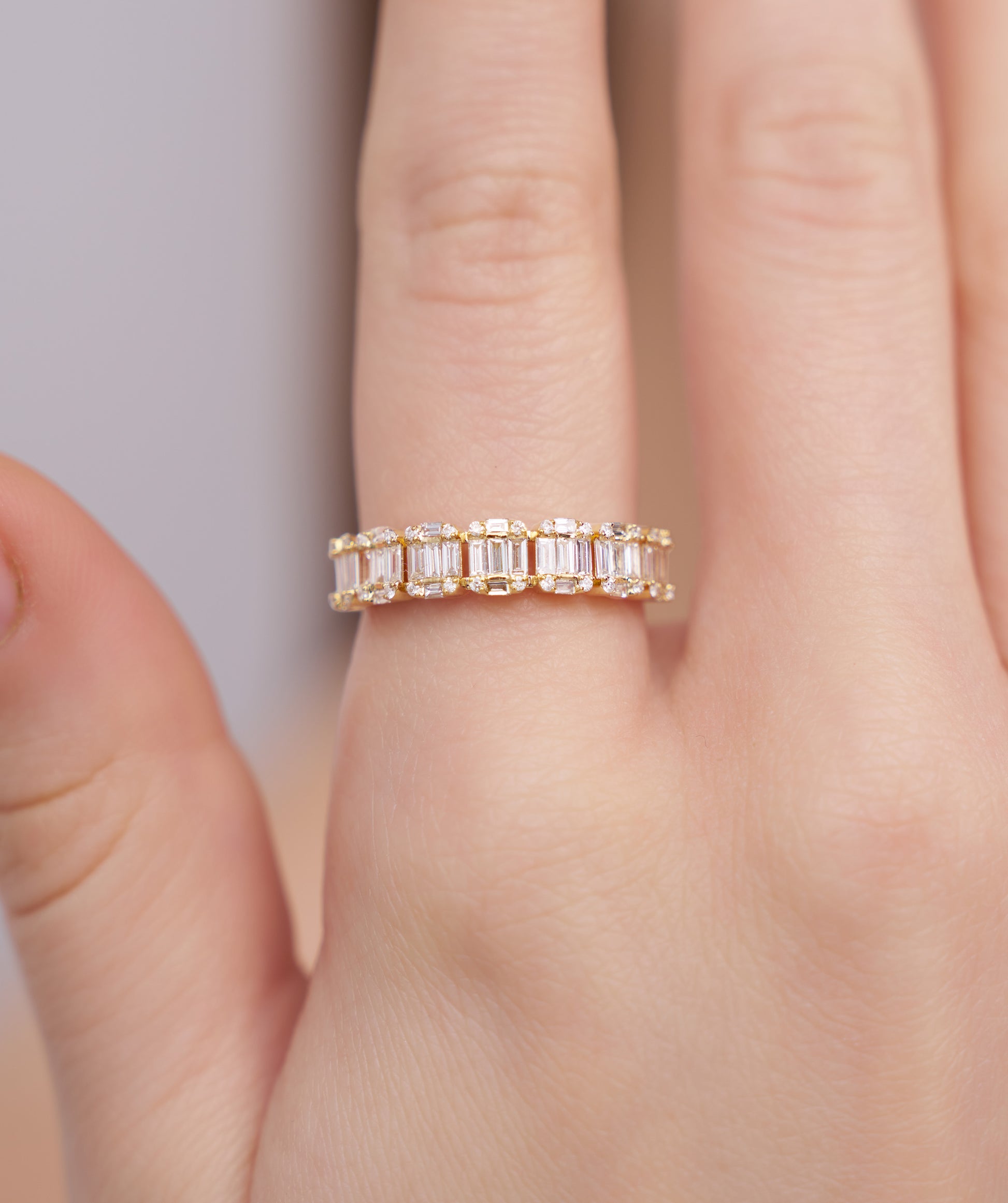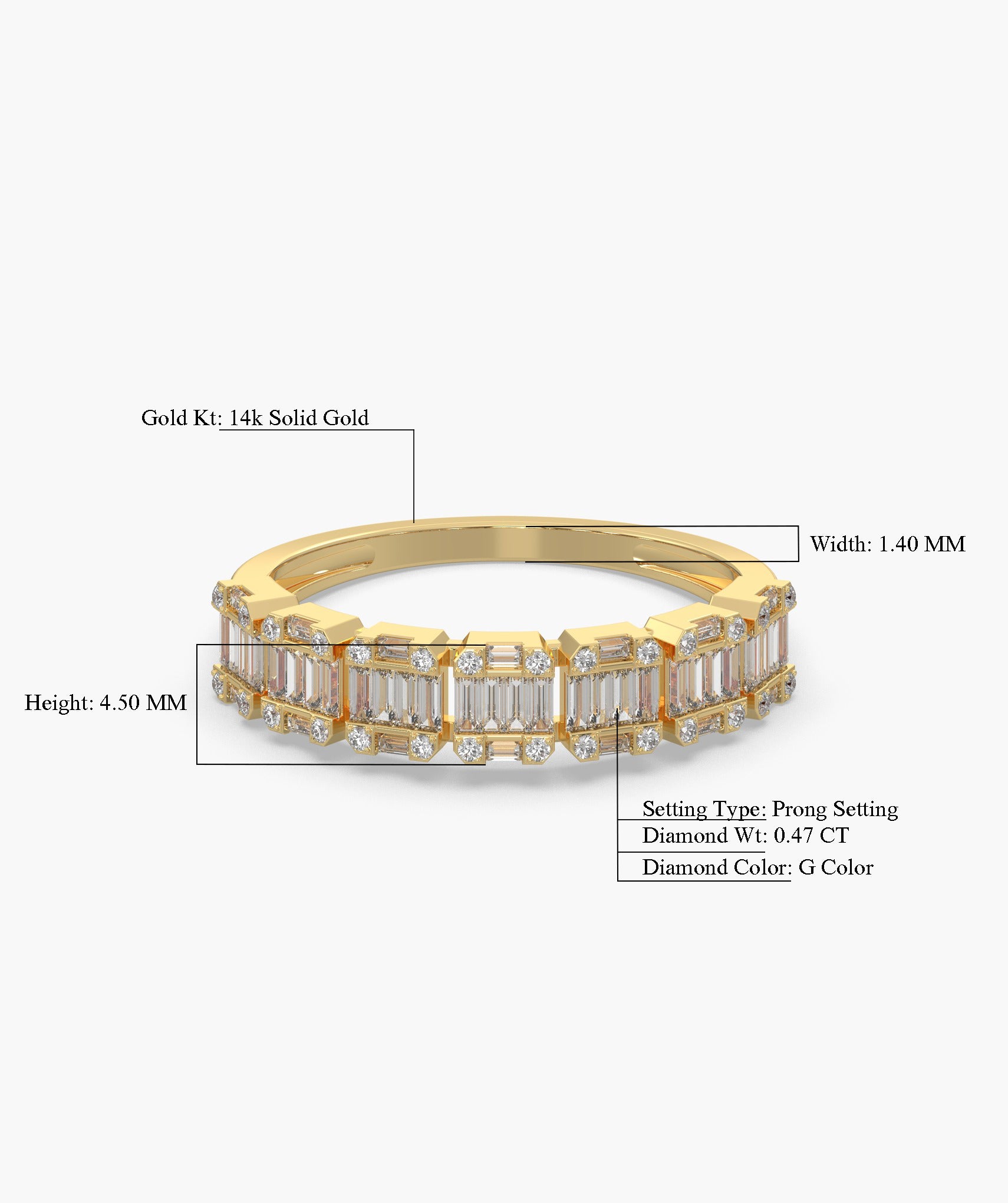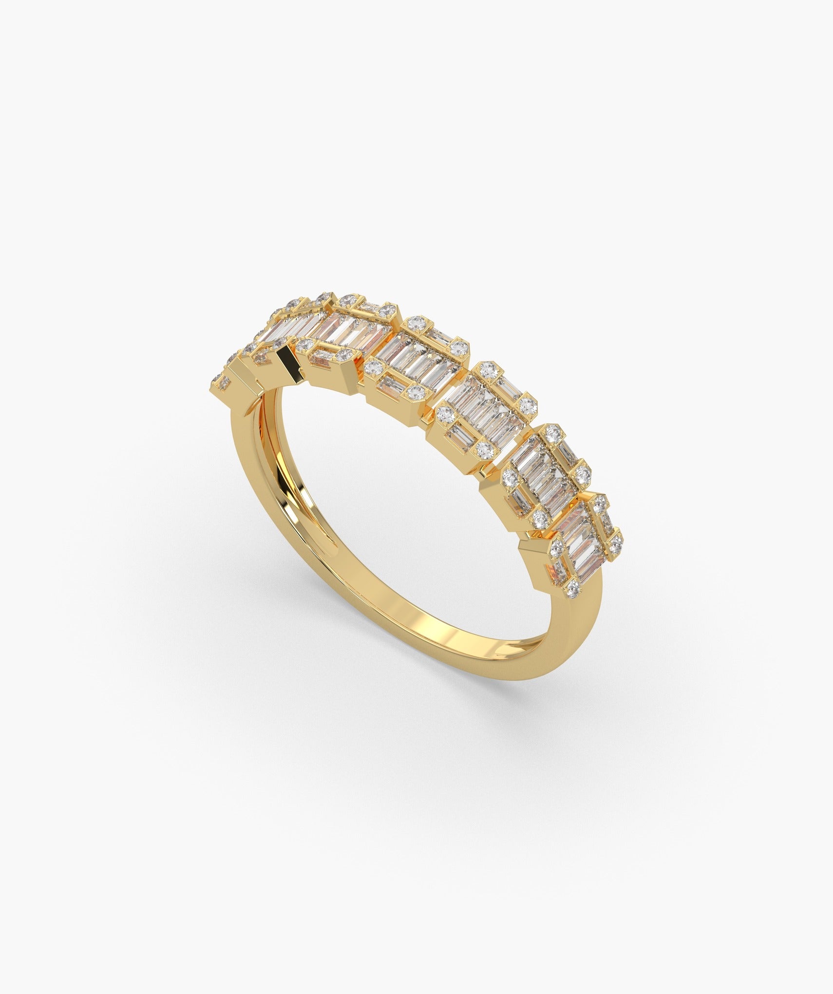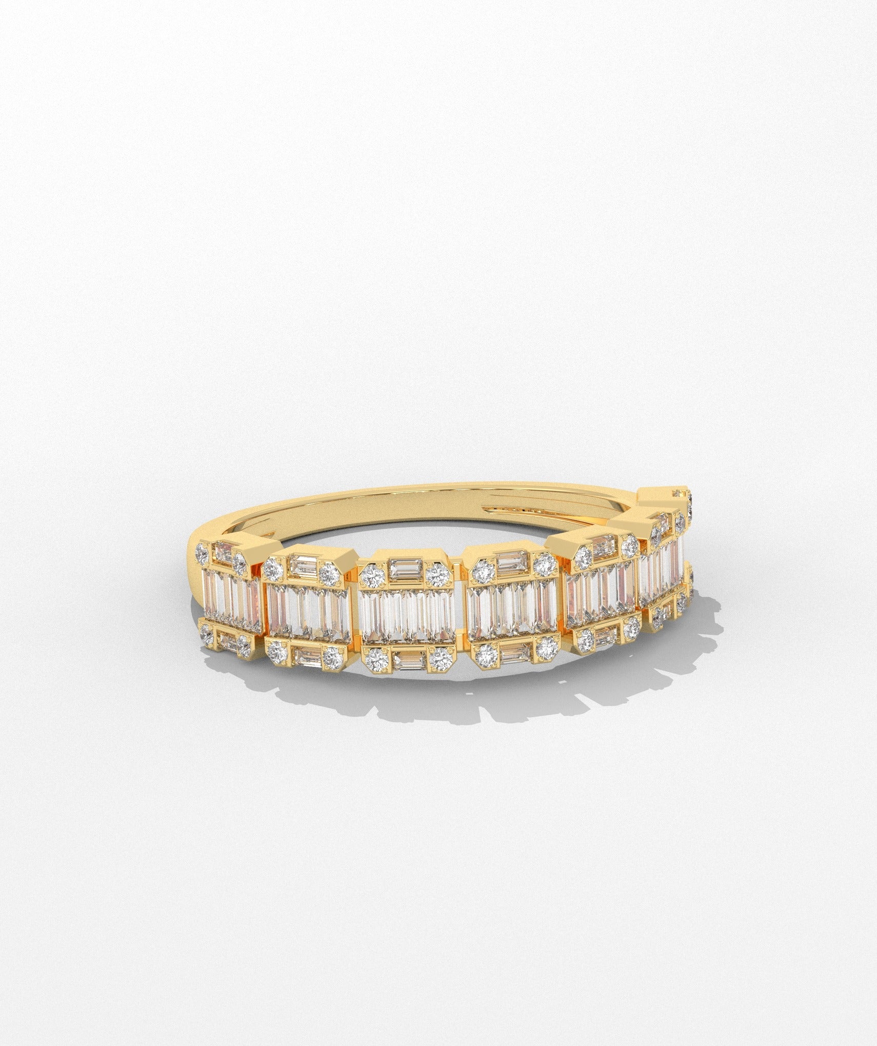 Exquisitely crafted in 14K yellow gold, this eternity band showcases alternating baguette and round-cut diamonds in a modern geometric pattern.
