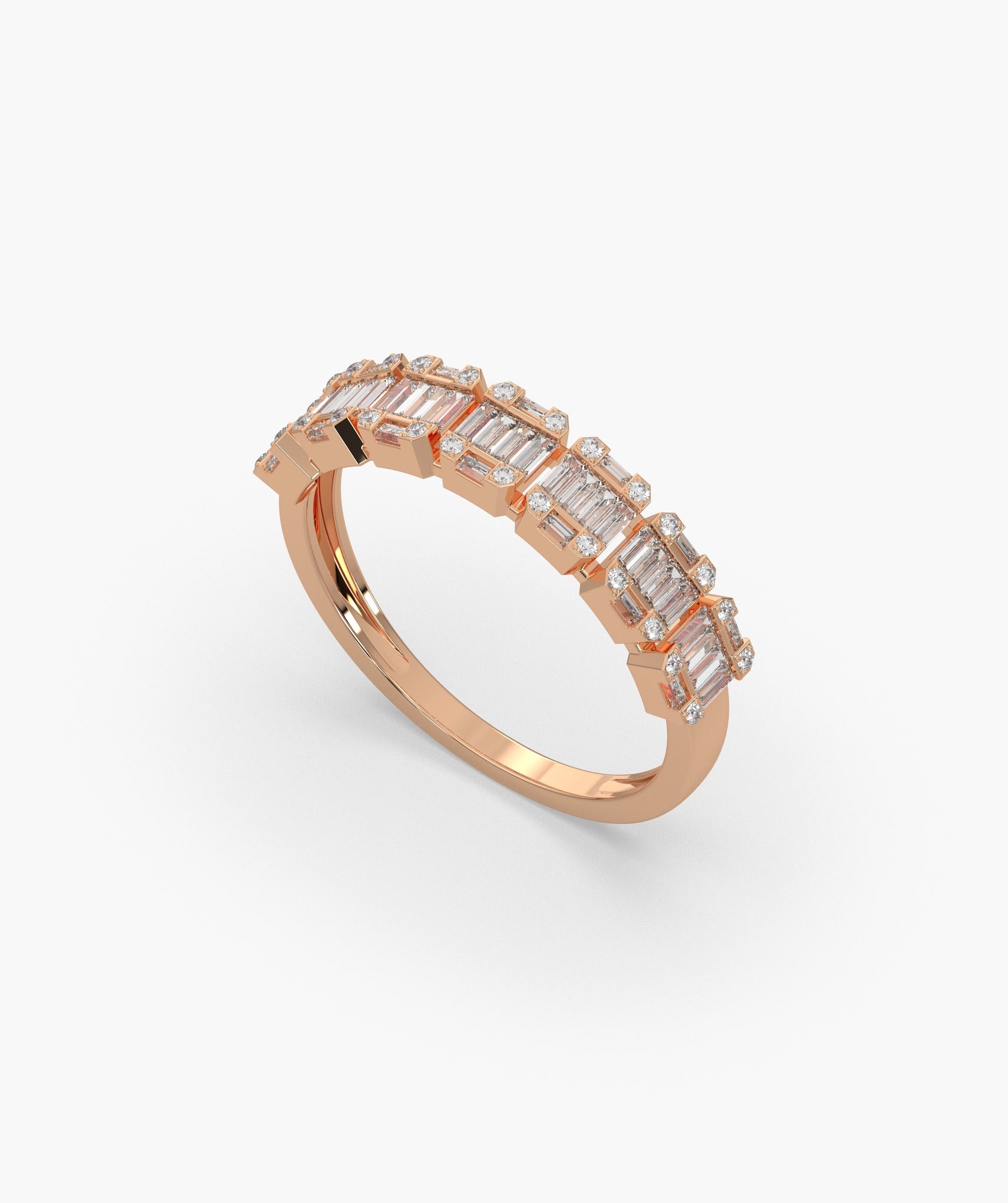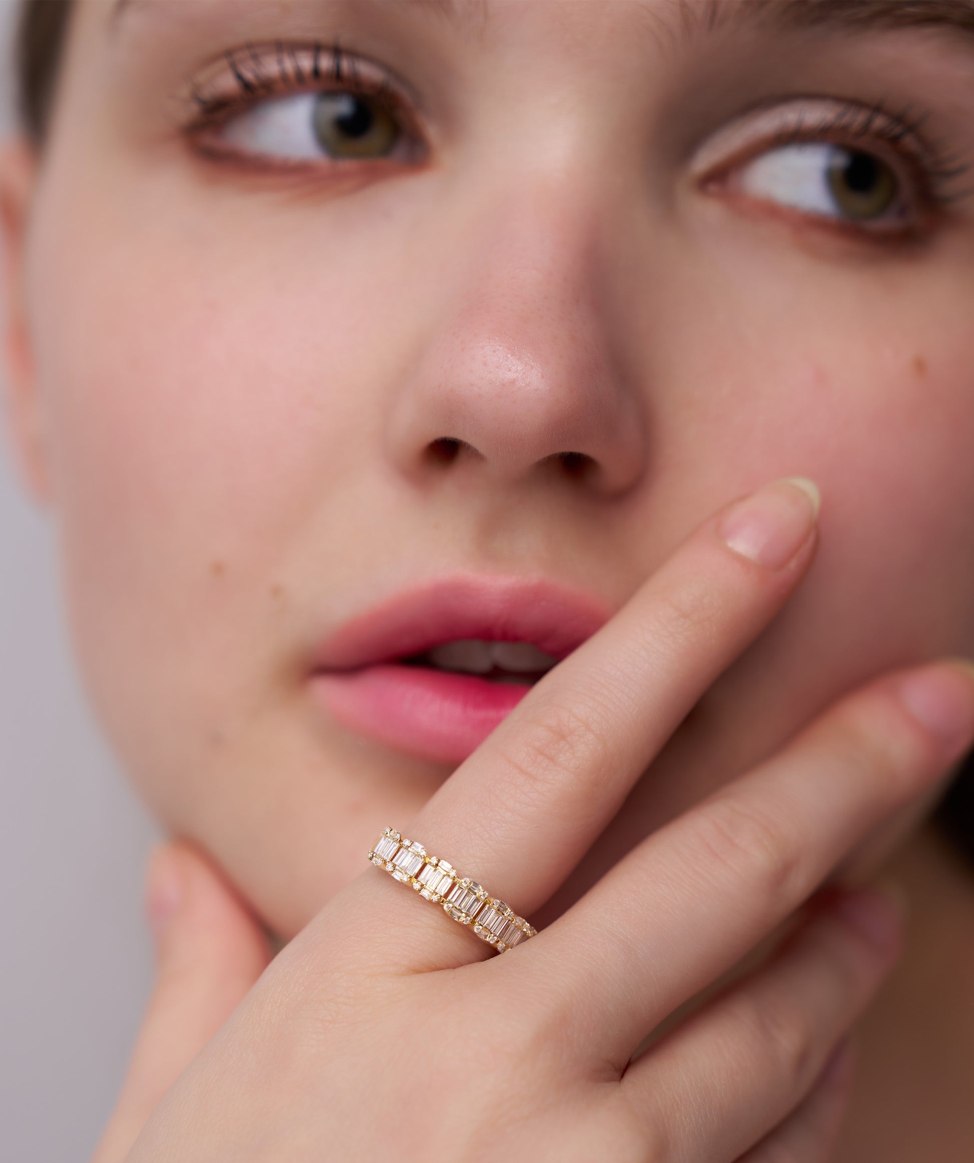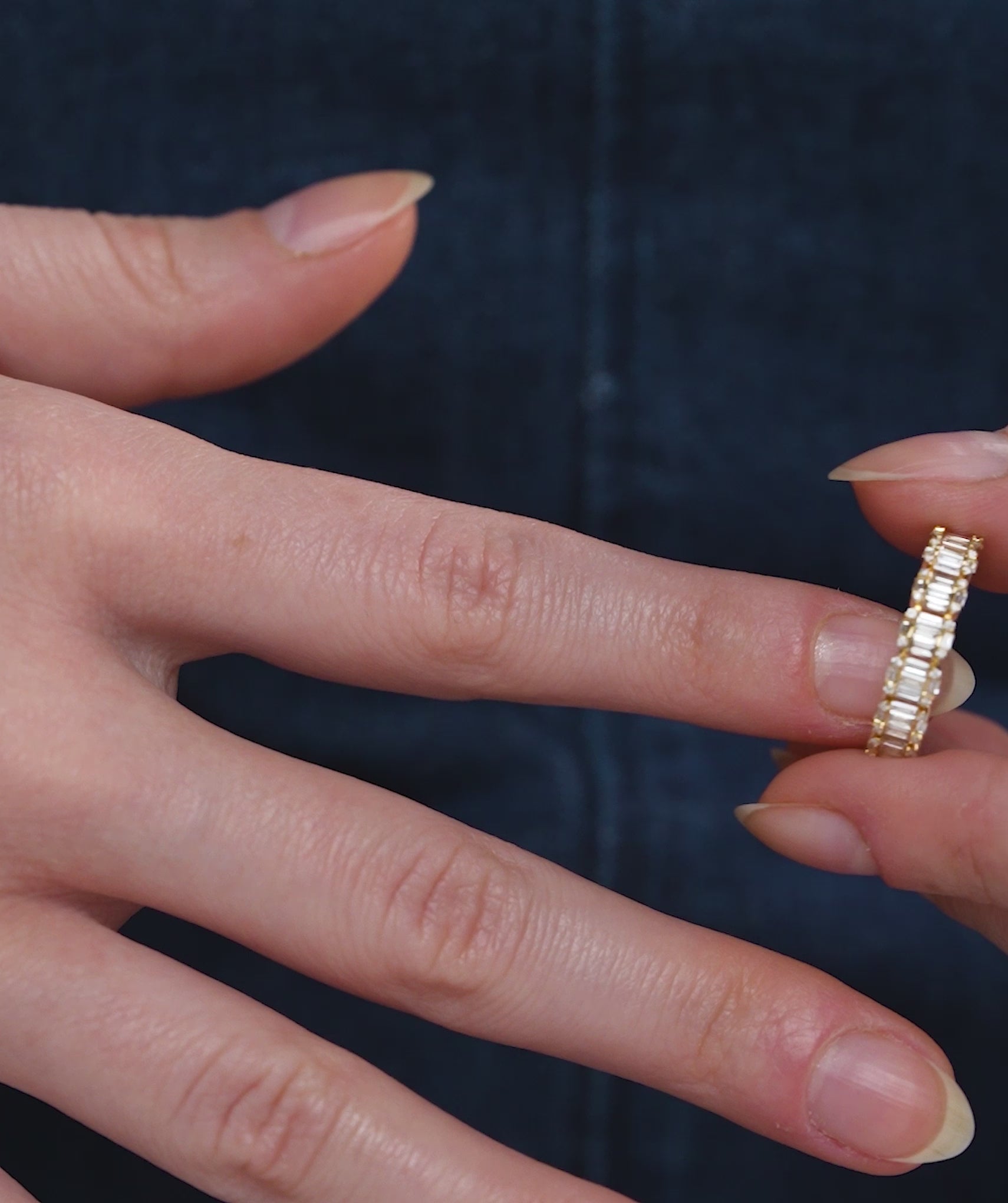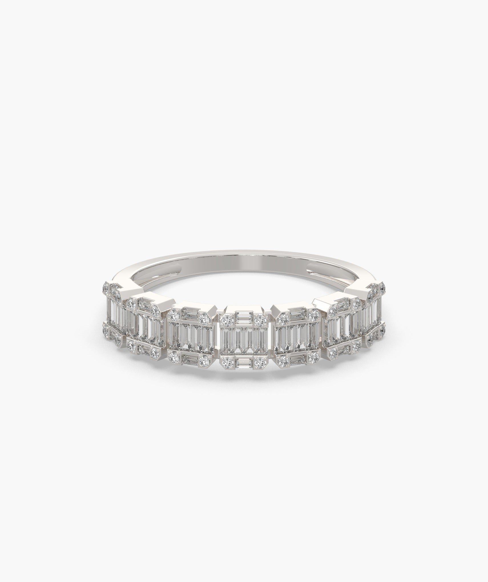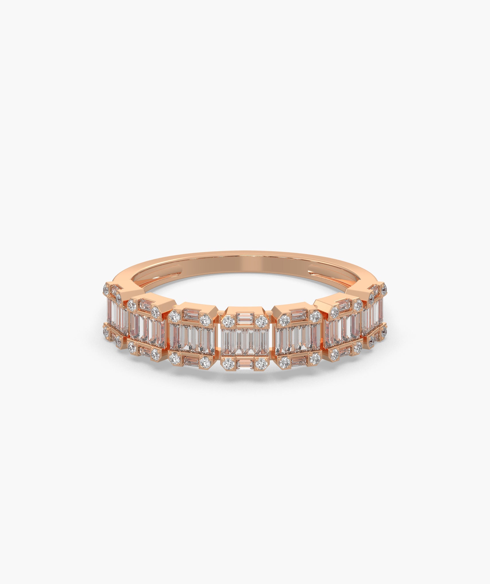 Exquisitely crafted in 14K yellow gold, this eternity band showcases alternating baguette and round-cut diamonds in a modern geometric pattern.