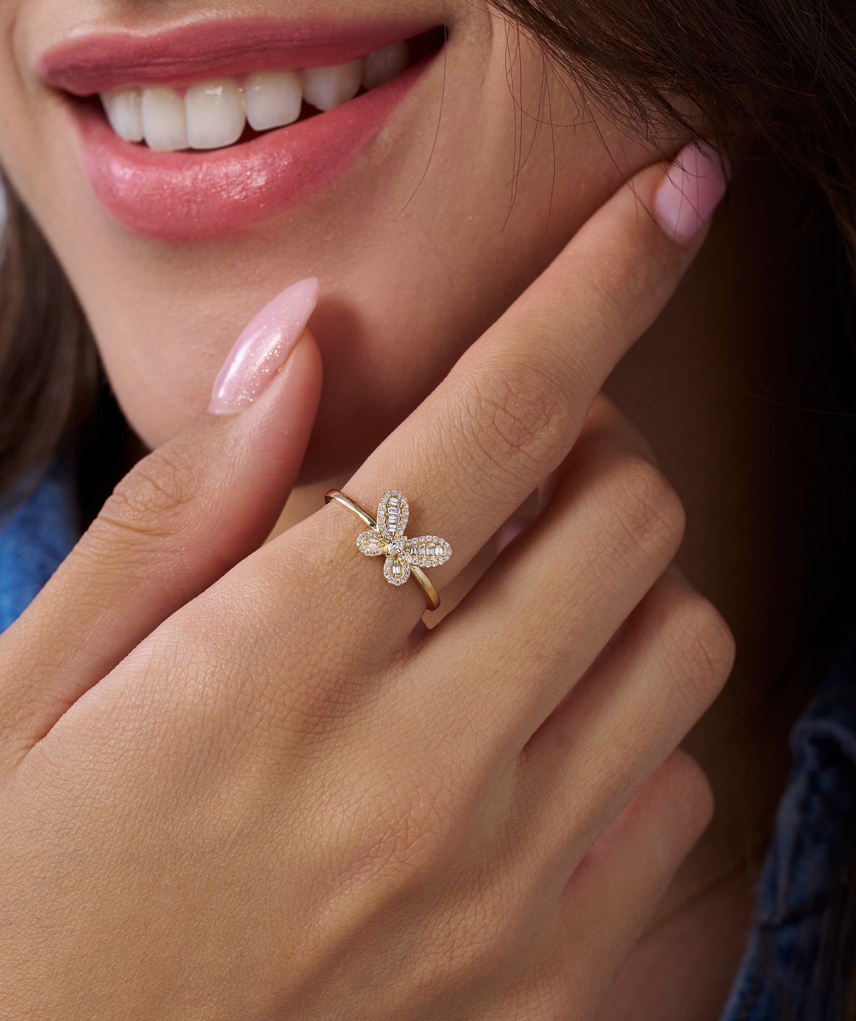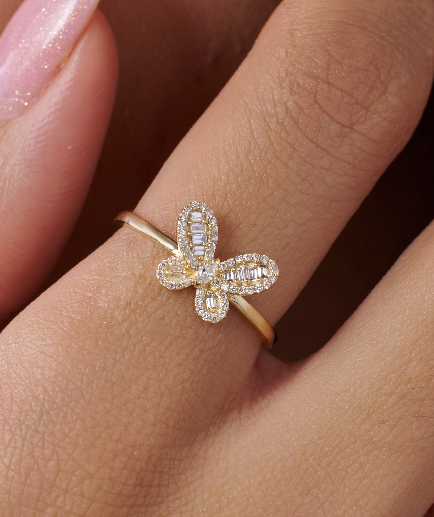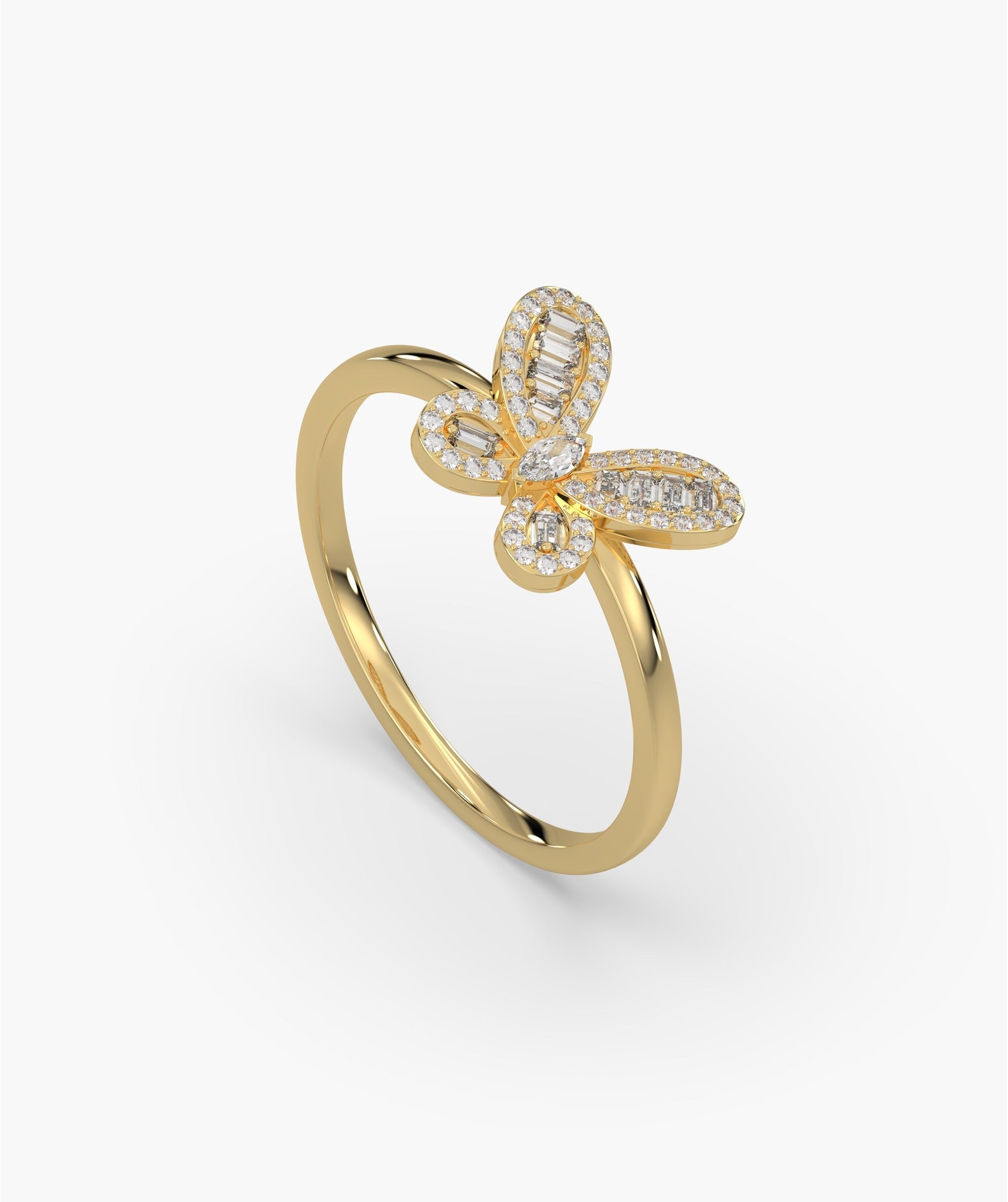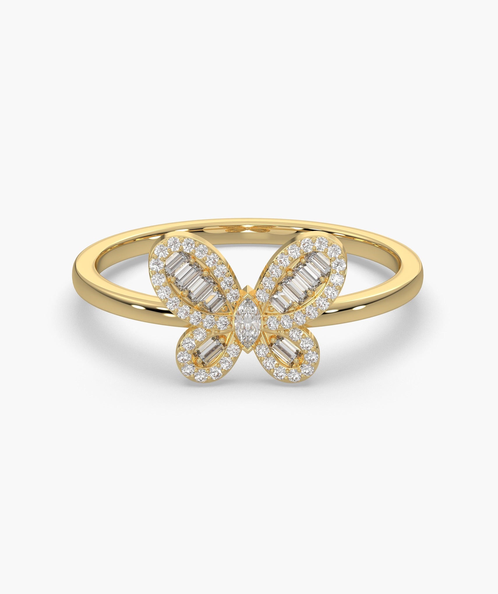 Let your style take flight with a design that blends whimsical charm and serious sparkle. This ring features an intricate butterfly motif crafted from tapered baguette diamonds for the wings and a marquise center, all framed by a halo of round brilliants. Set in 14K solid gold with 0.29 carats of G color diamonds, the stones are held in a detailed prong setting that maximizes light return from every angle. Resting on a slender 1.40mm band, it feels lightweight and playful perfect for adding a touch of joy to your office look or weekend stack. Available in yellow, white, and rose gold.