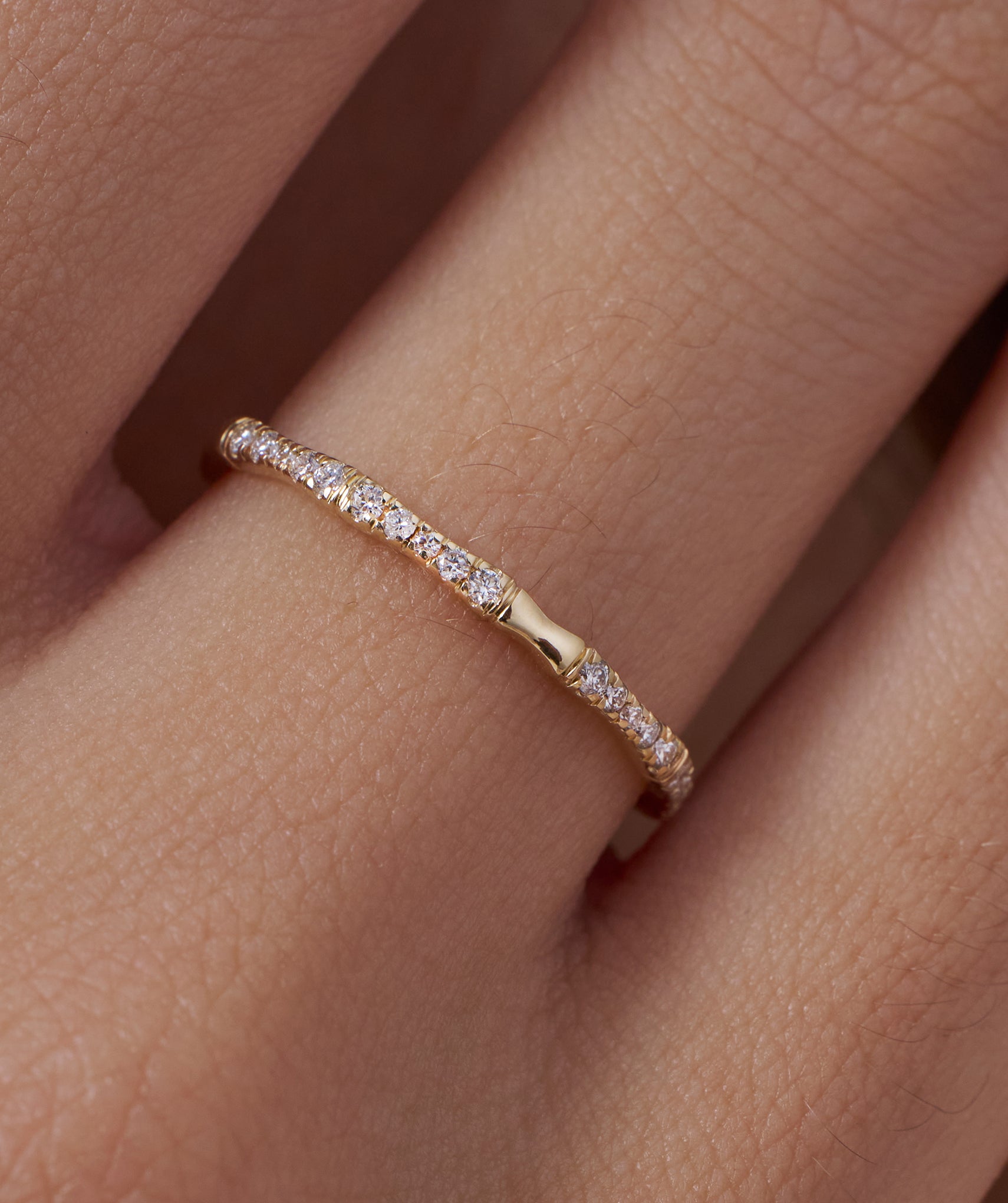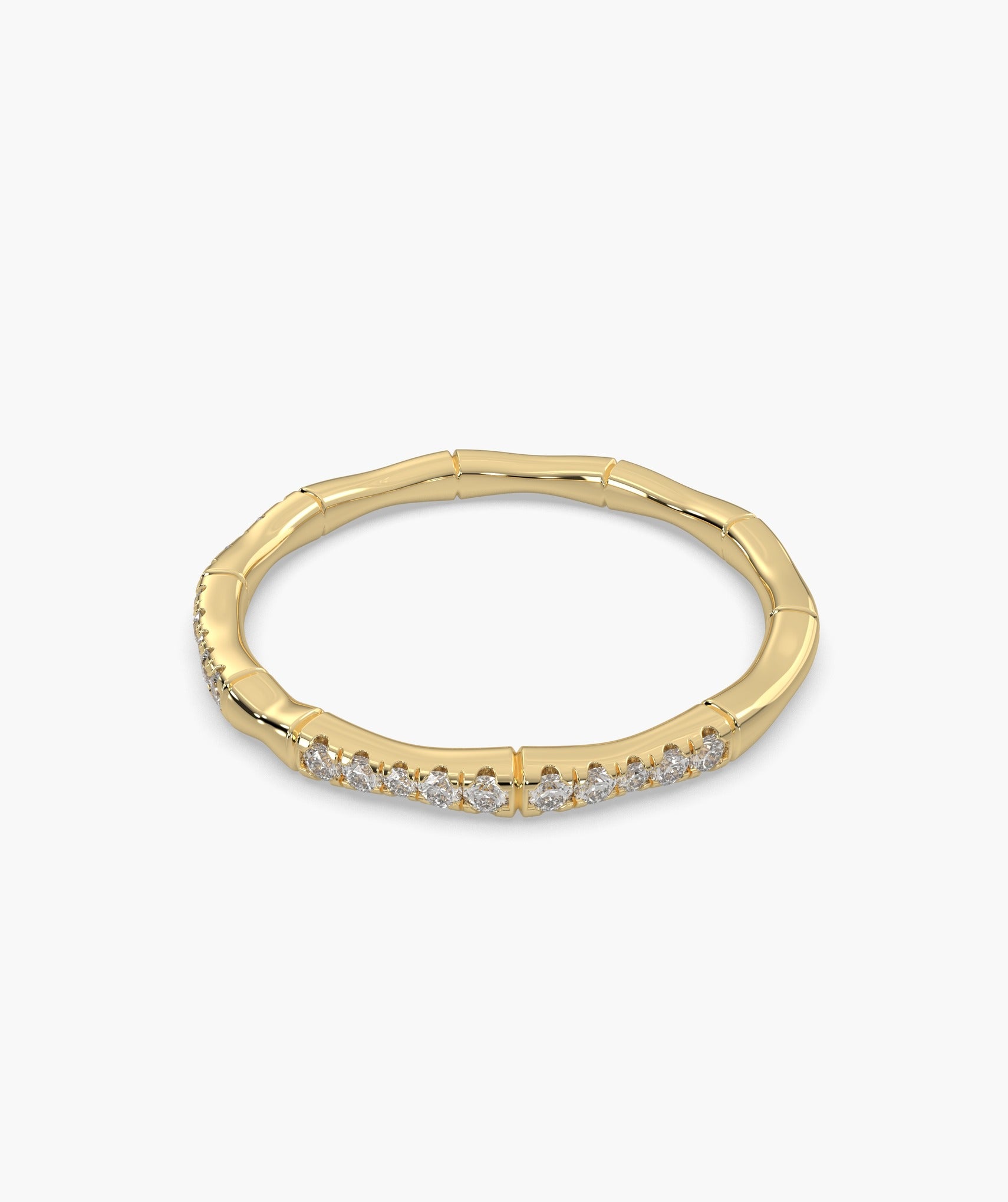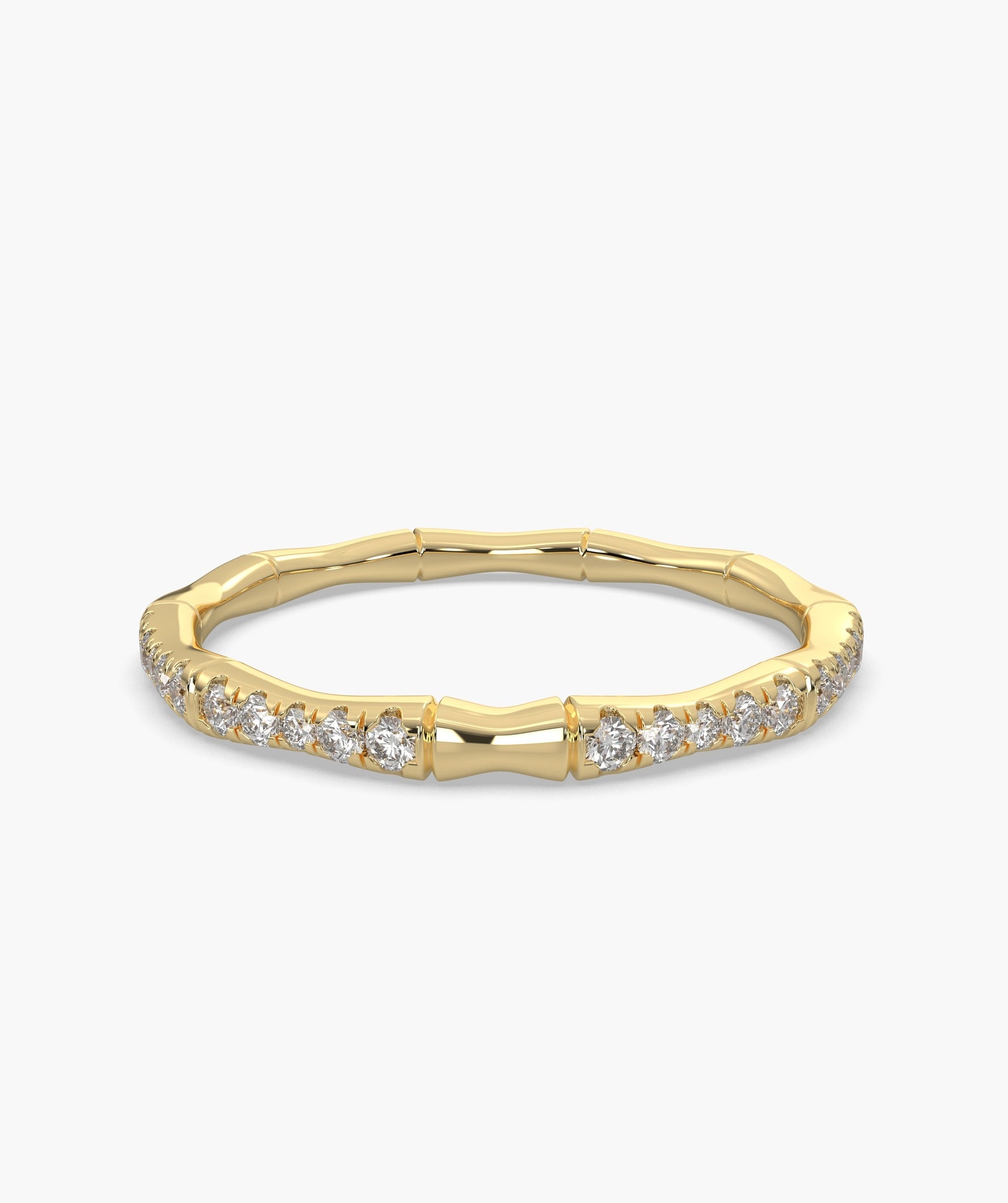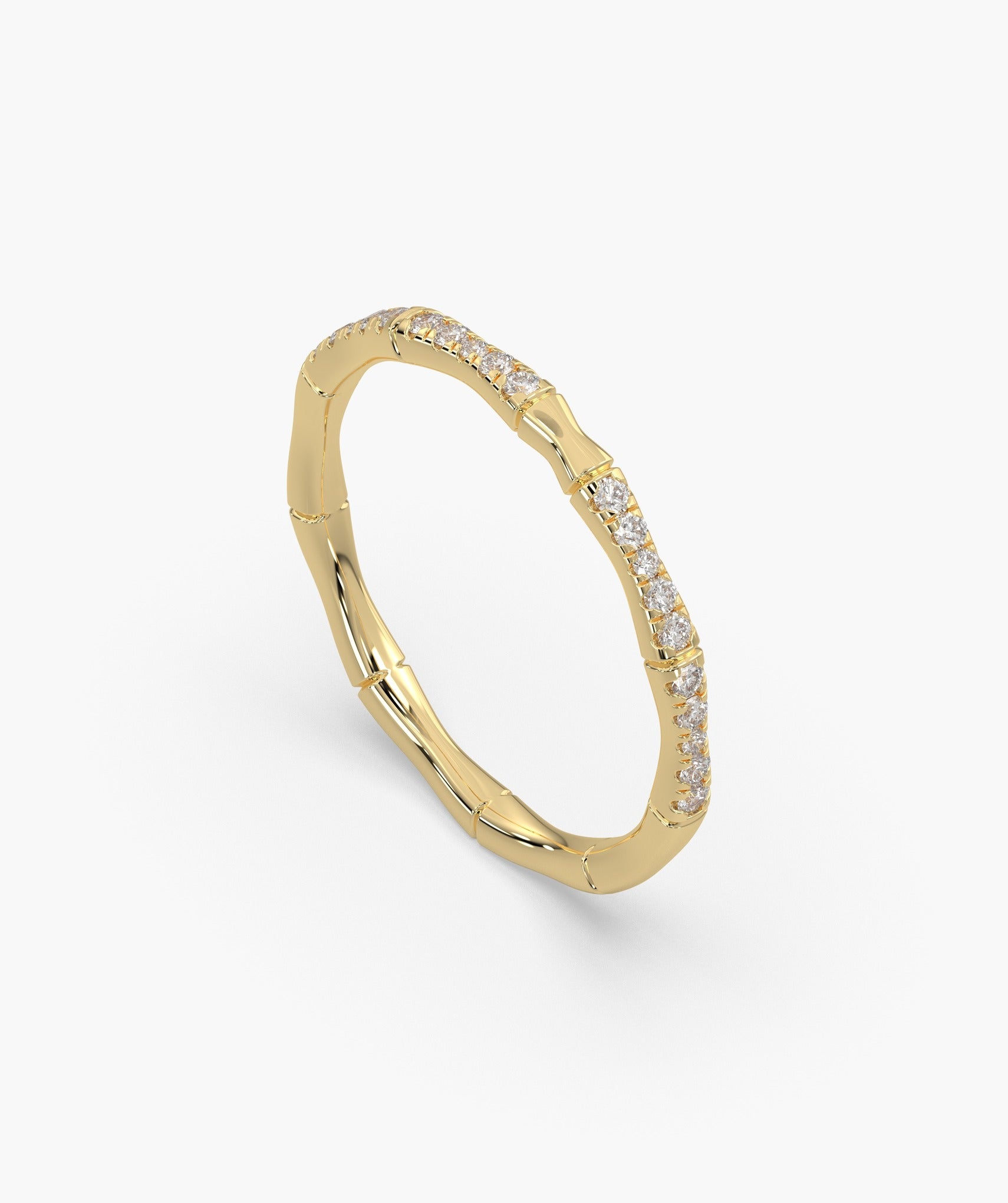 A unique bamboo-inspired band in 14K yellow gold, adorned with sparkling round diamonds. A perfect mix of nature and elegance for everyday luxury.