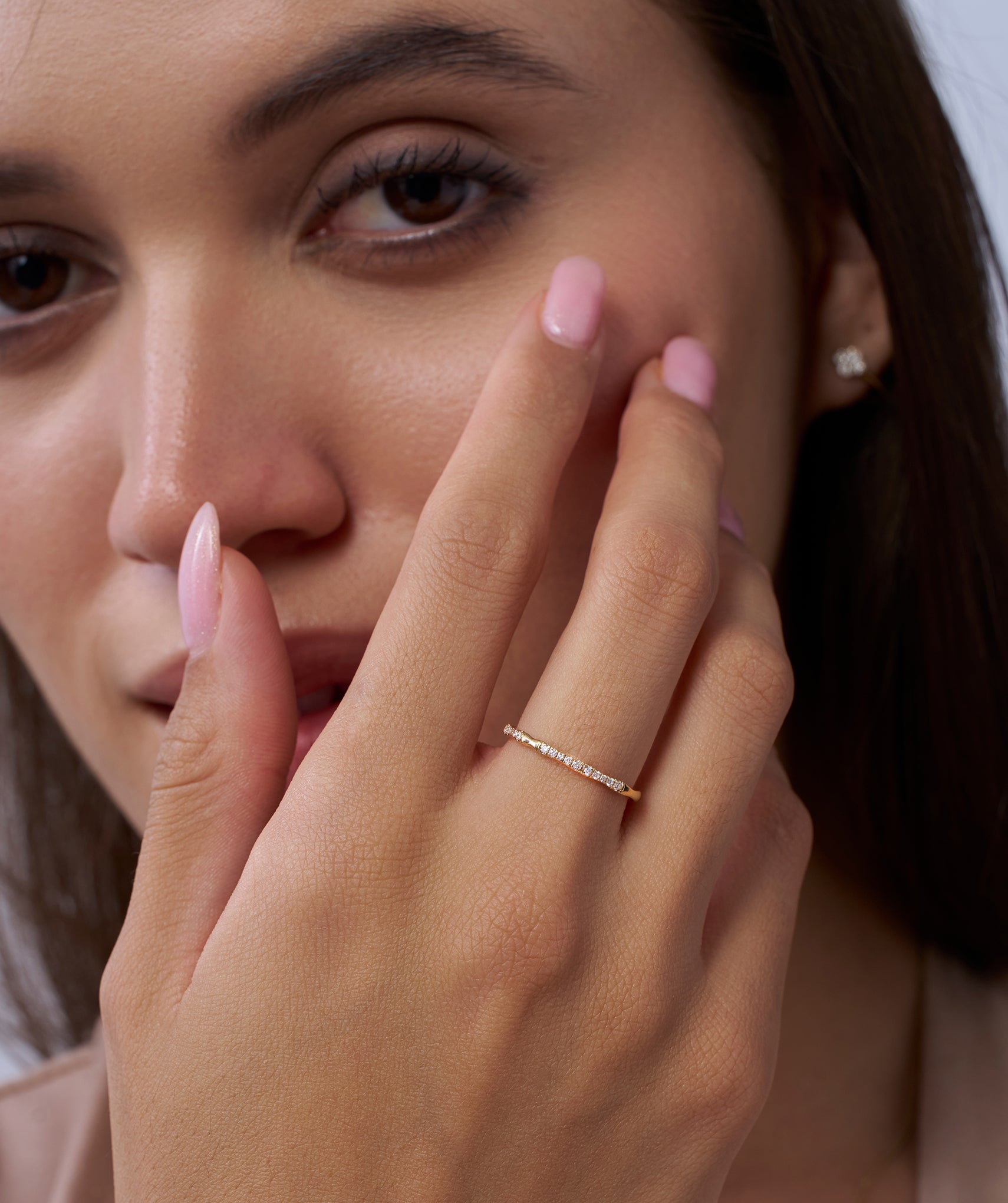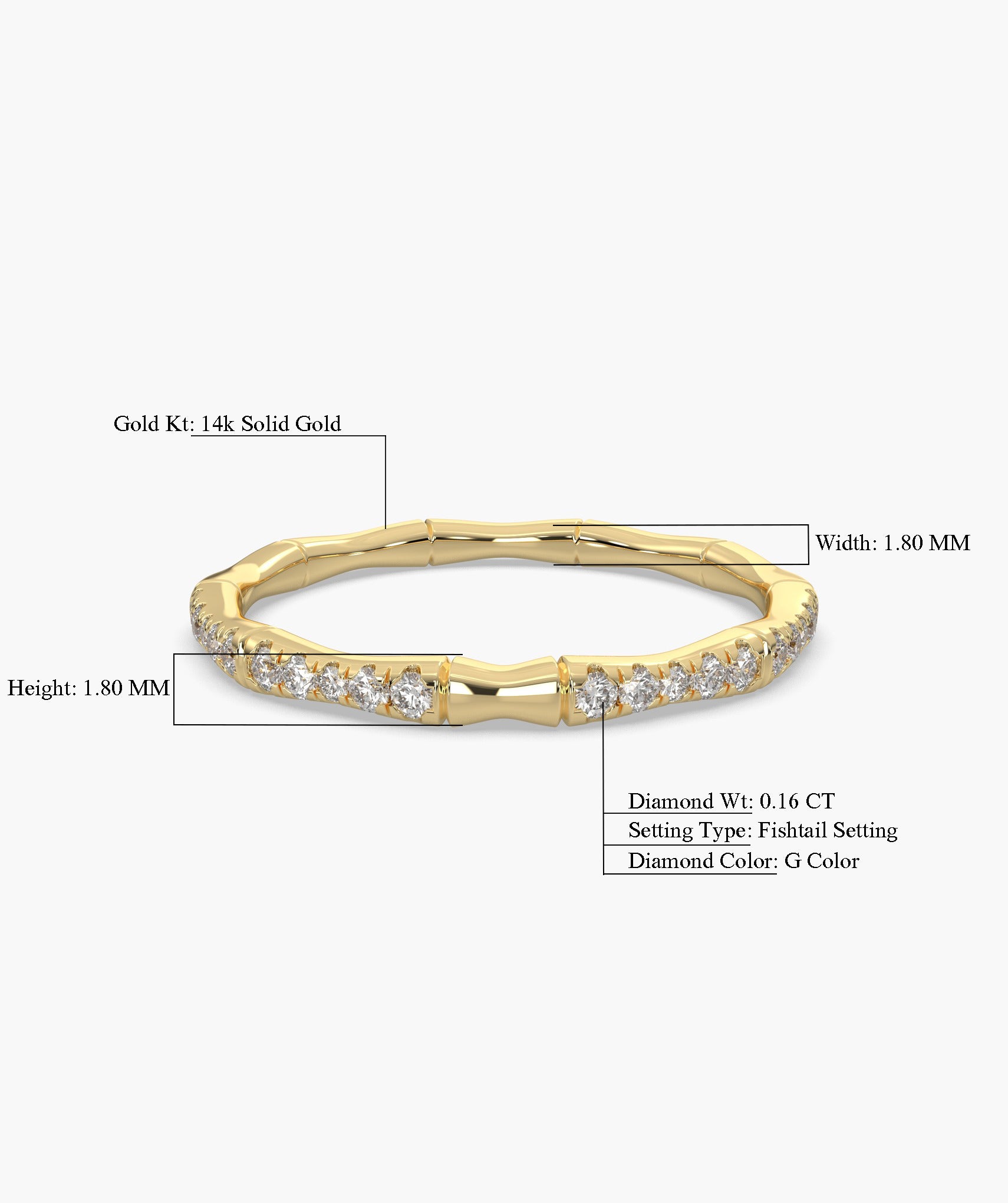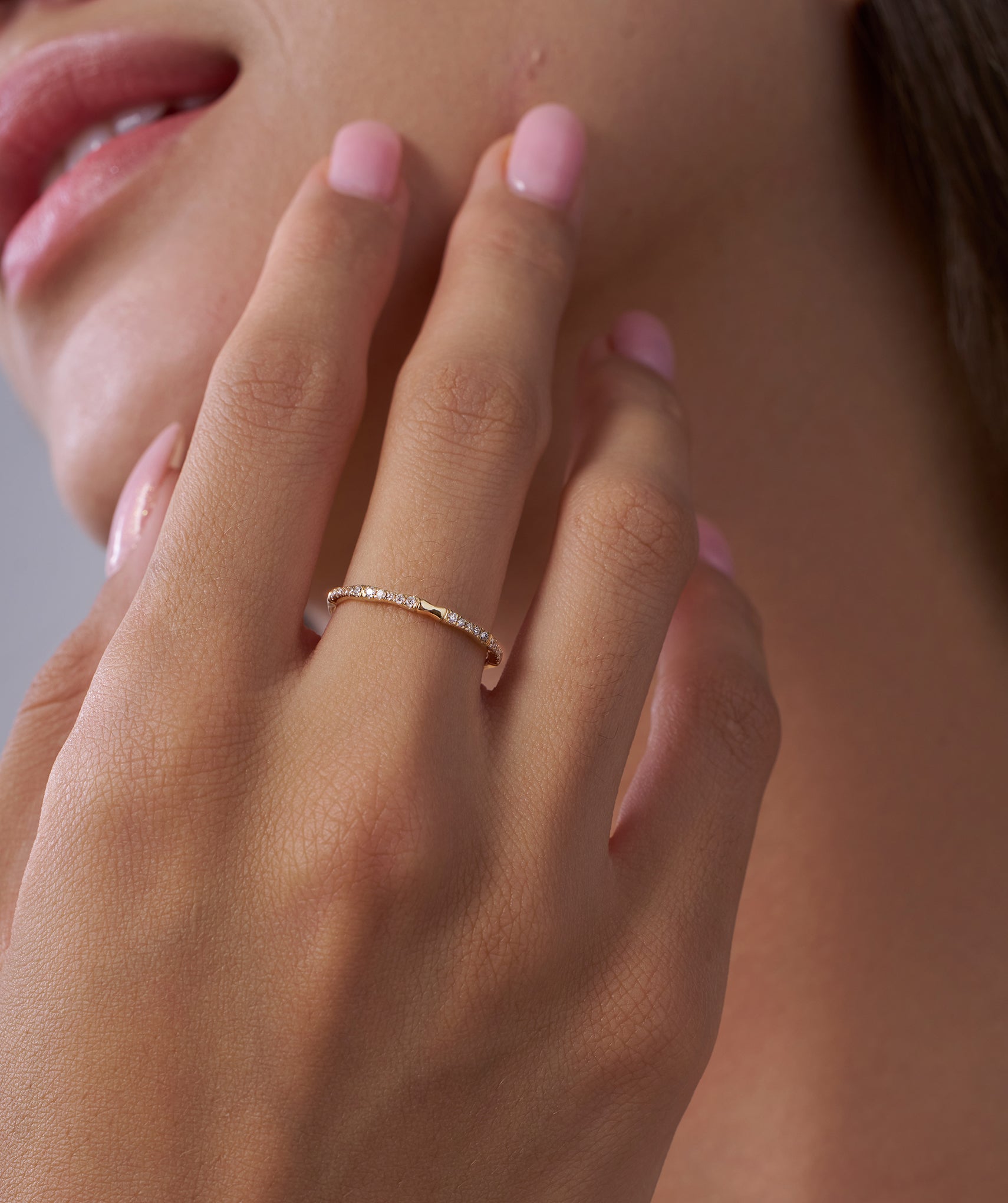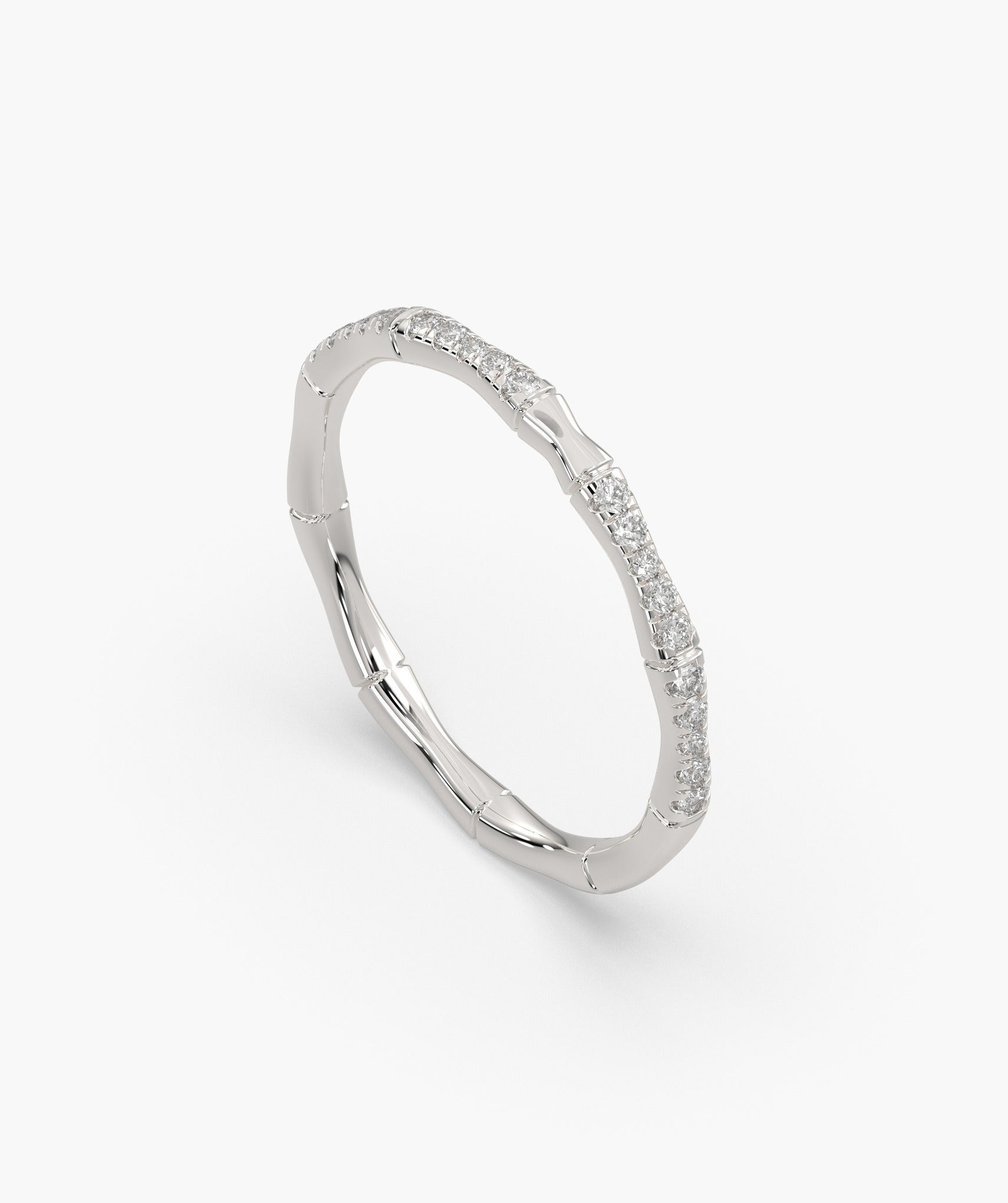 A unique bamboo-inspired band in 14K yellow gold, adorned with sparkling round diamonds. A perfect mix of nature and elegance for everyday luxury.