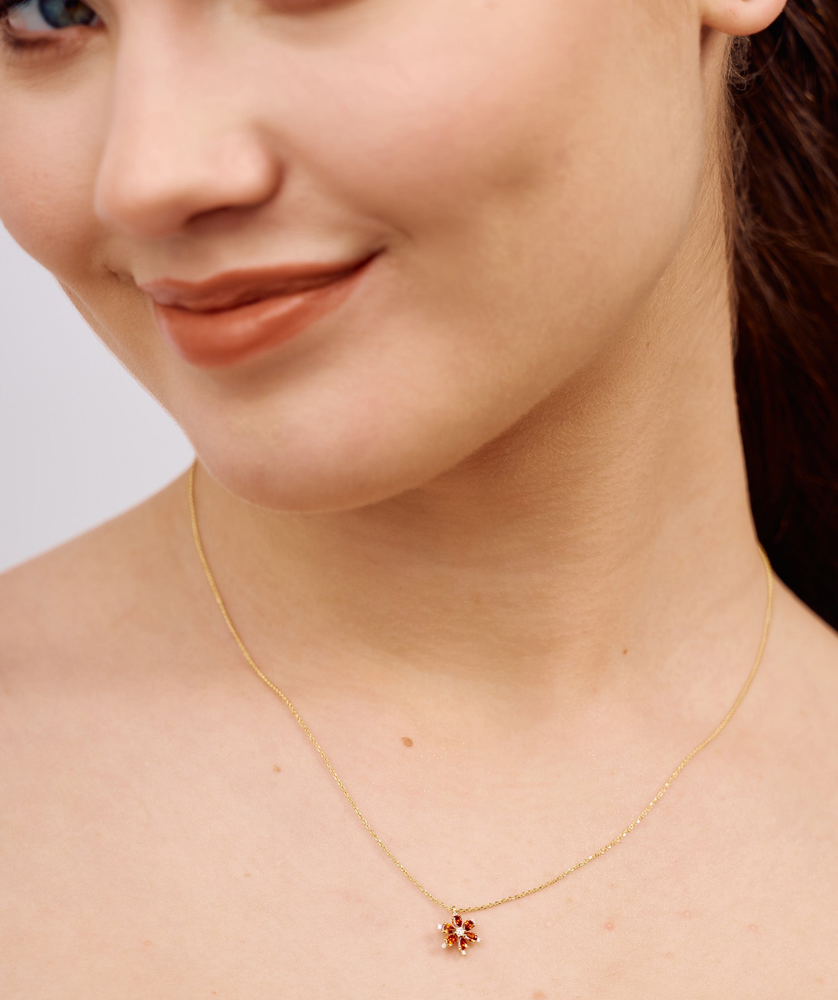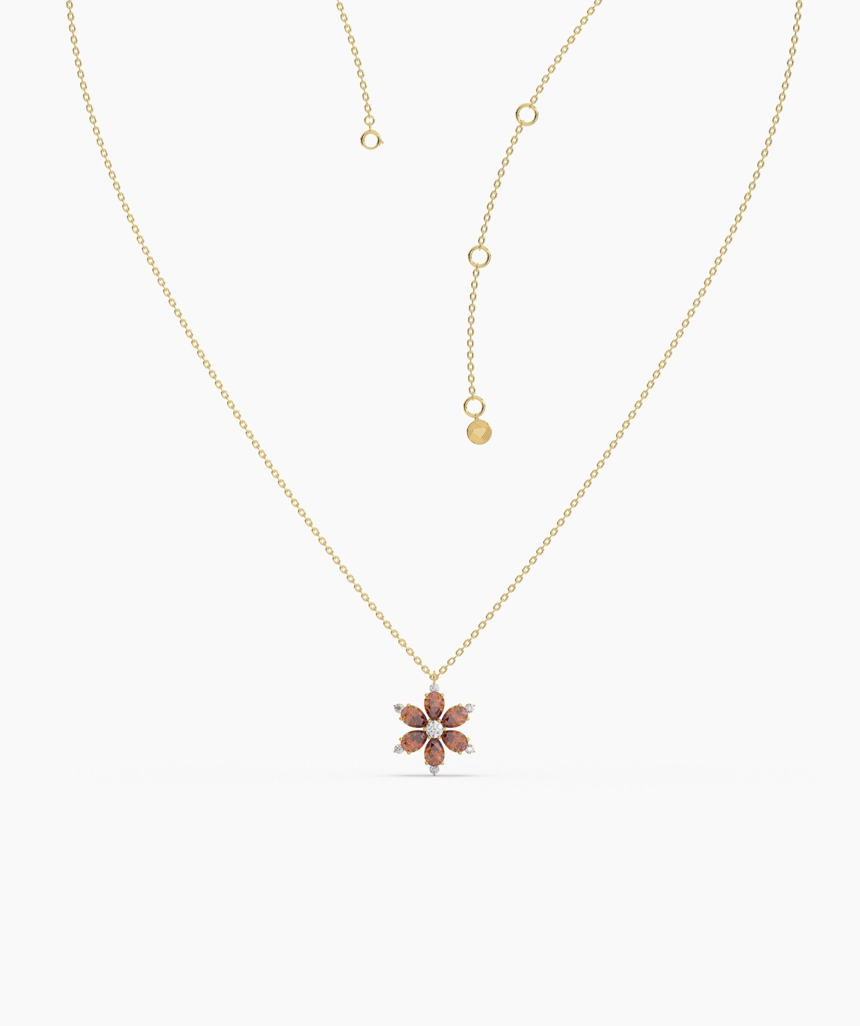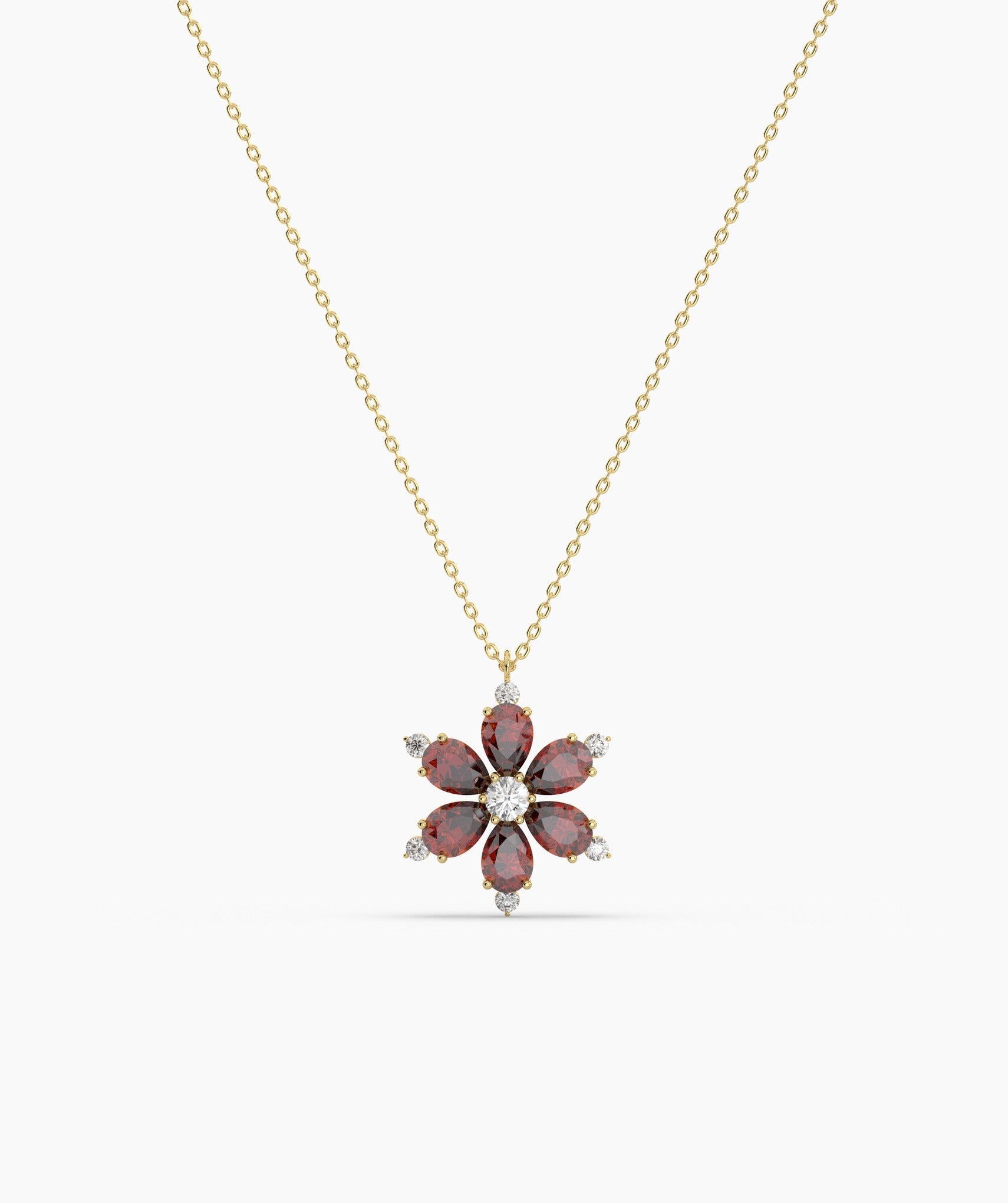 Elegant and radiant, this 14K gold floral necklace is designed with garnet petals and diamond accents for a sophisticated touch.