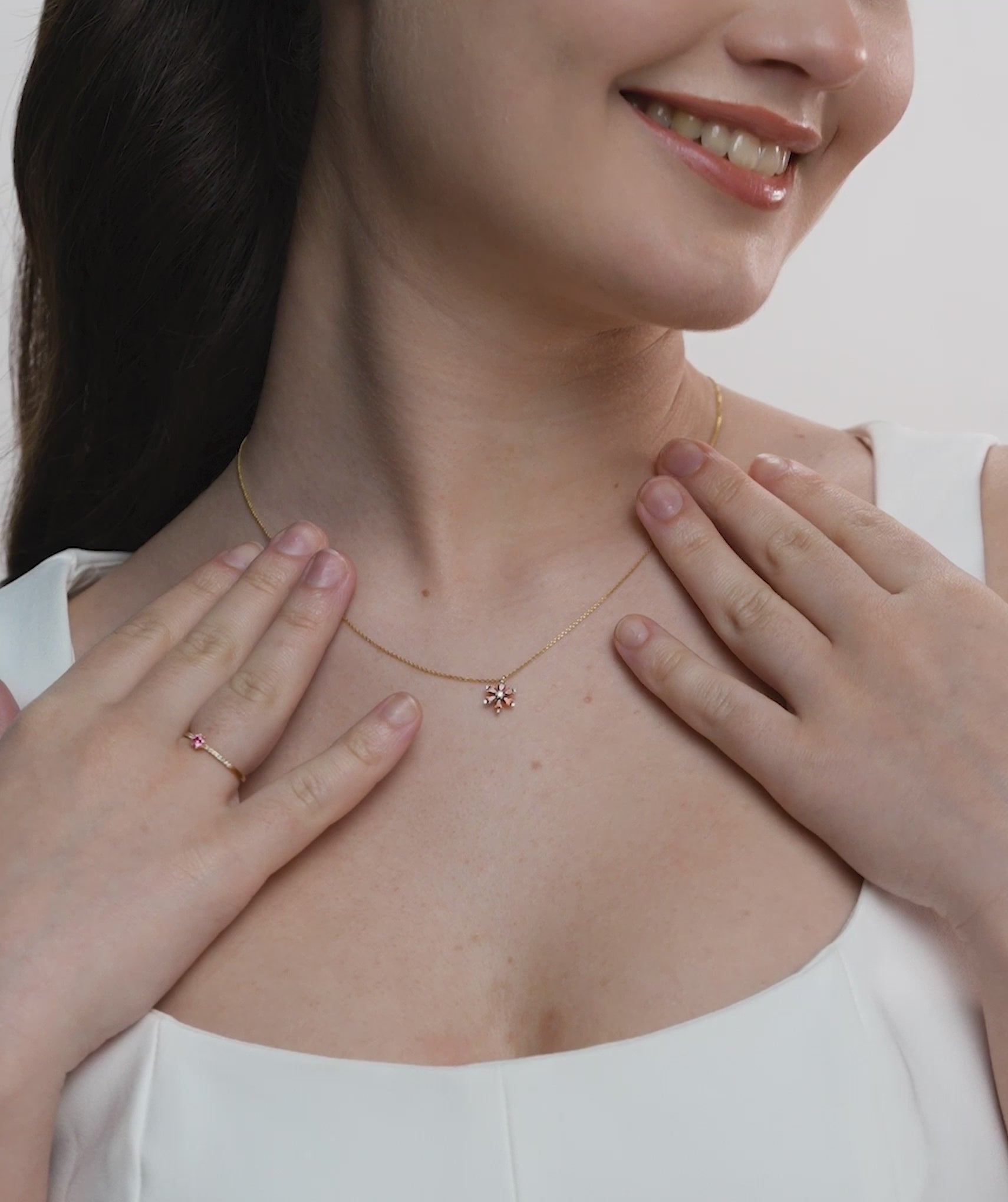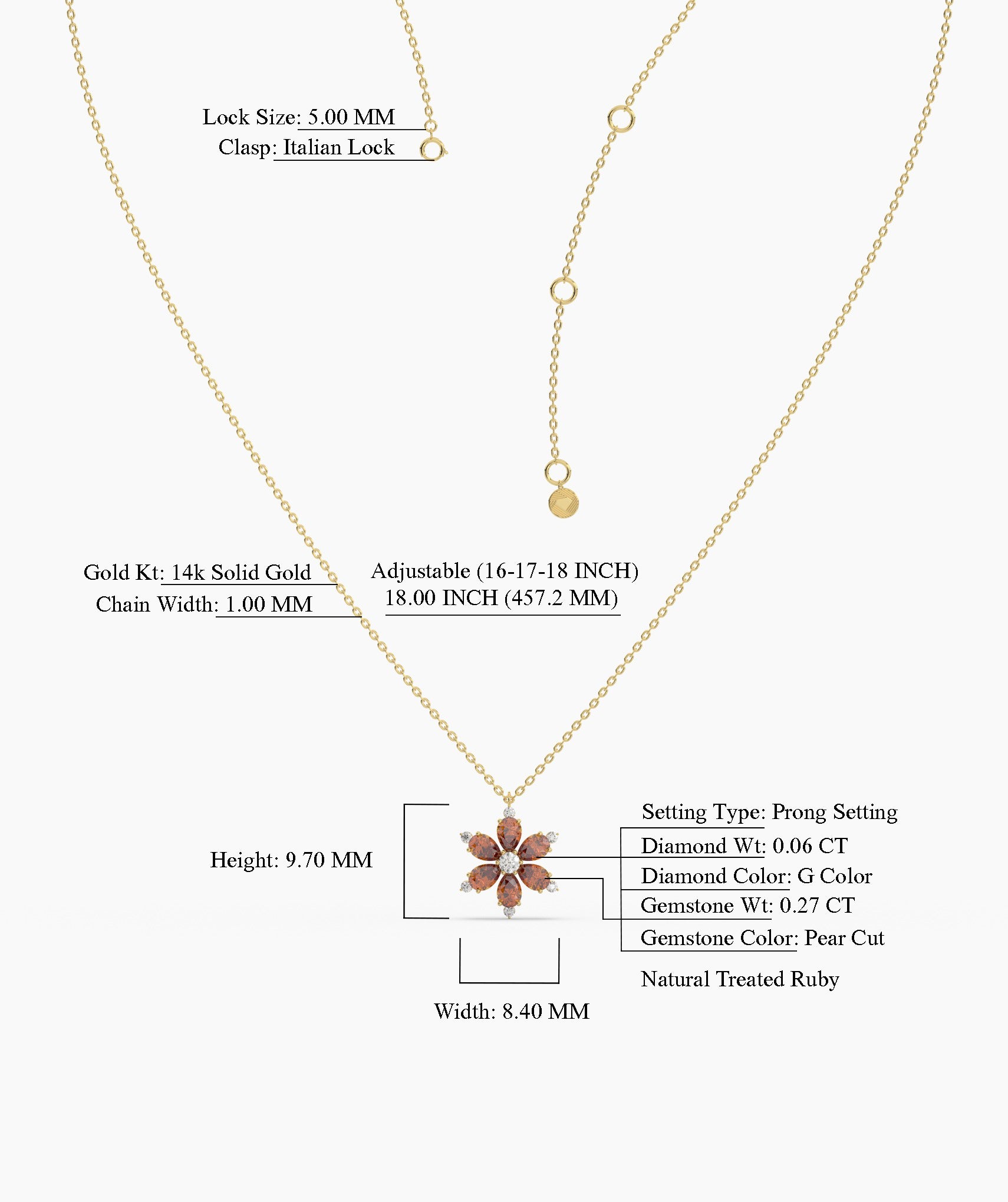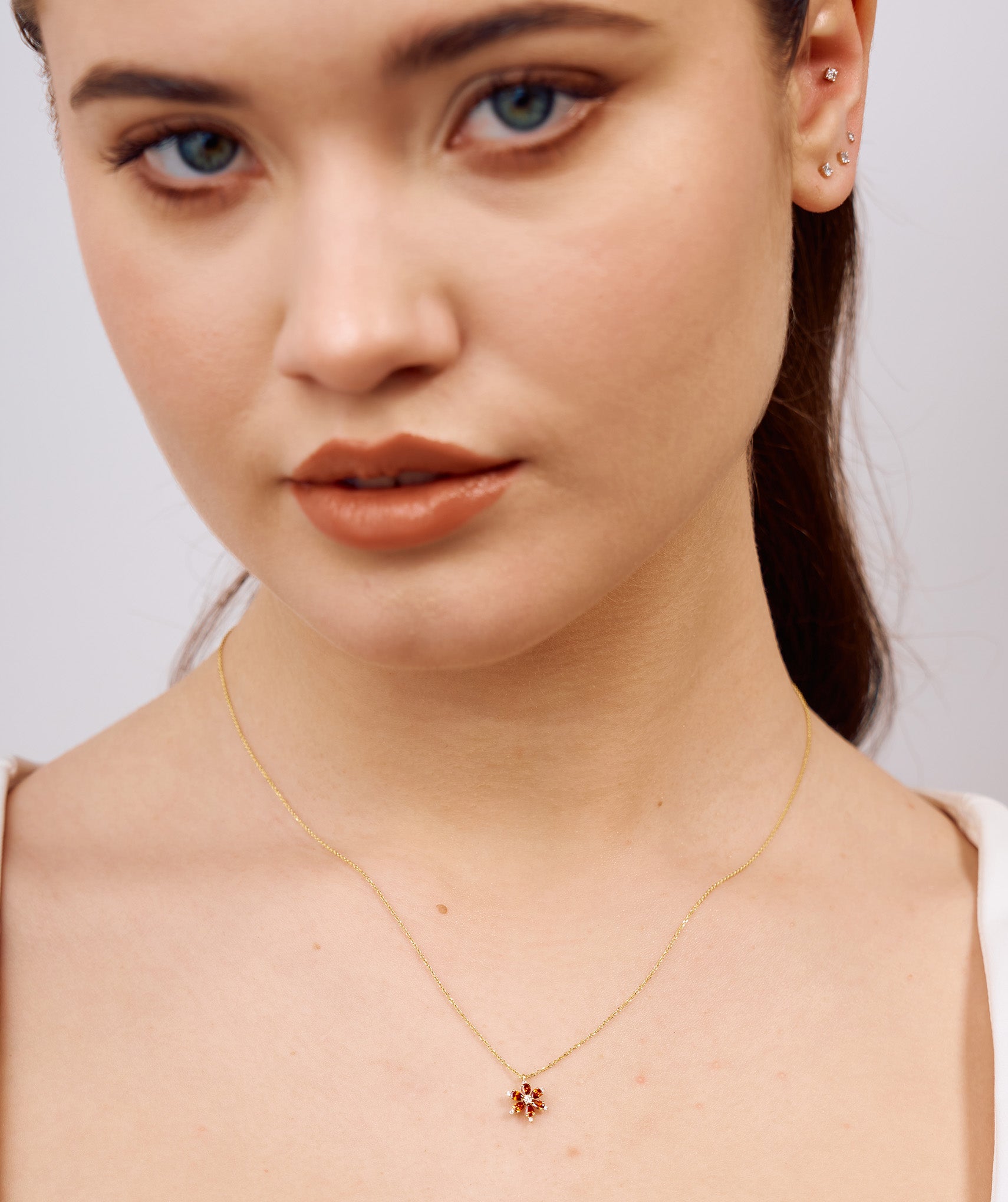 Elegant and radiant, this 14K gold floral necklace is designed with garnet petals and diamond accents for a sophisticated touch.