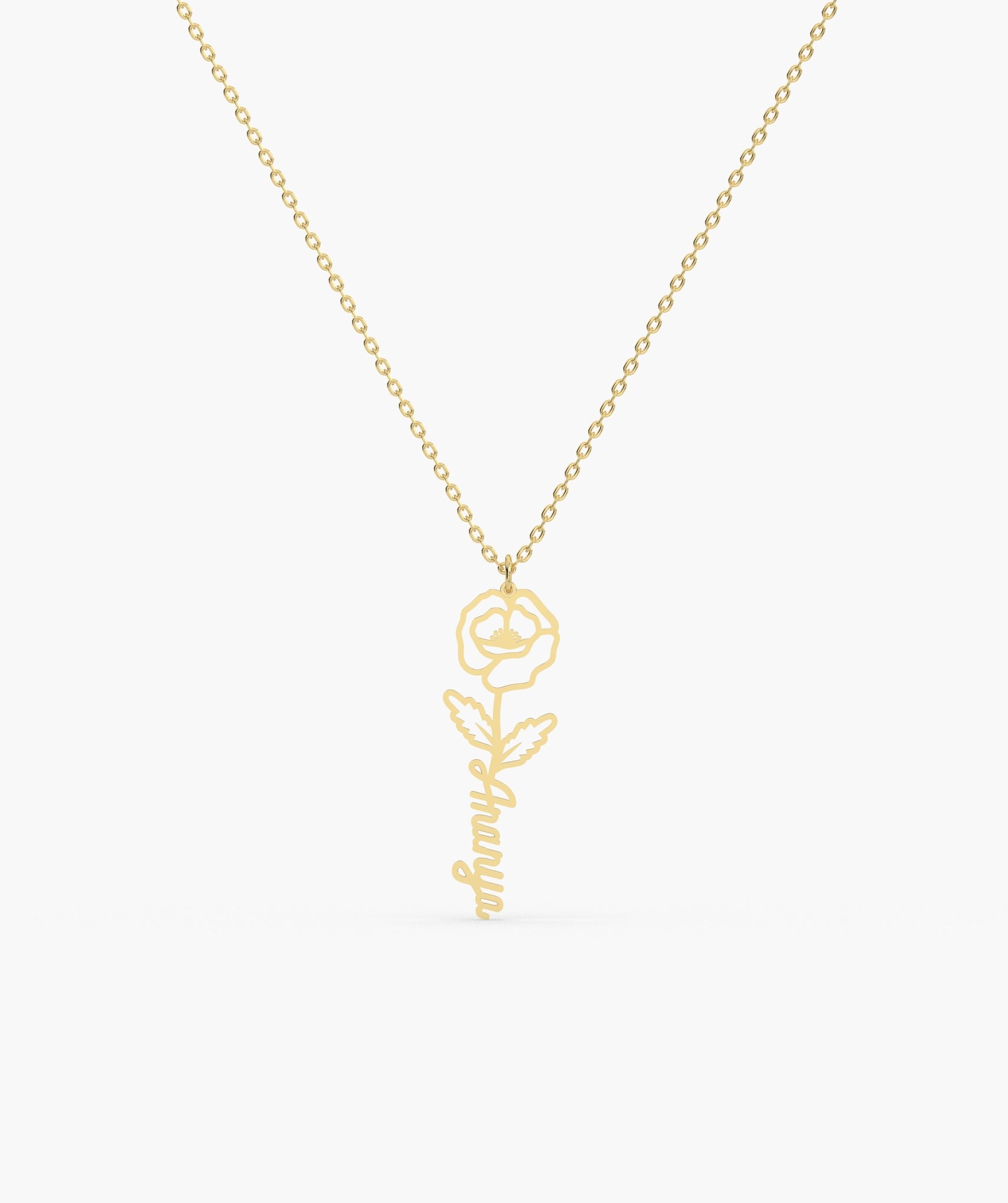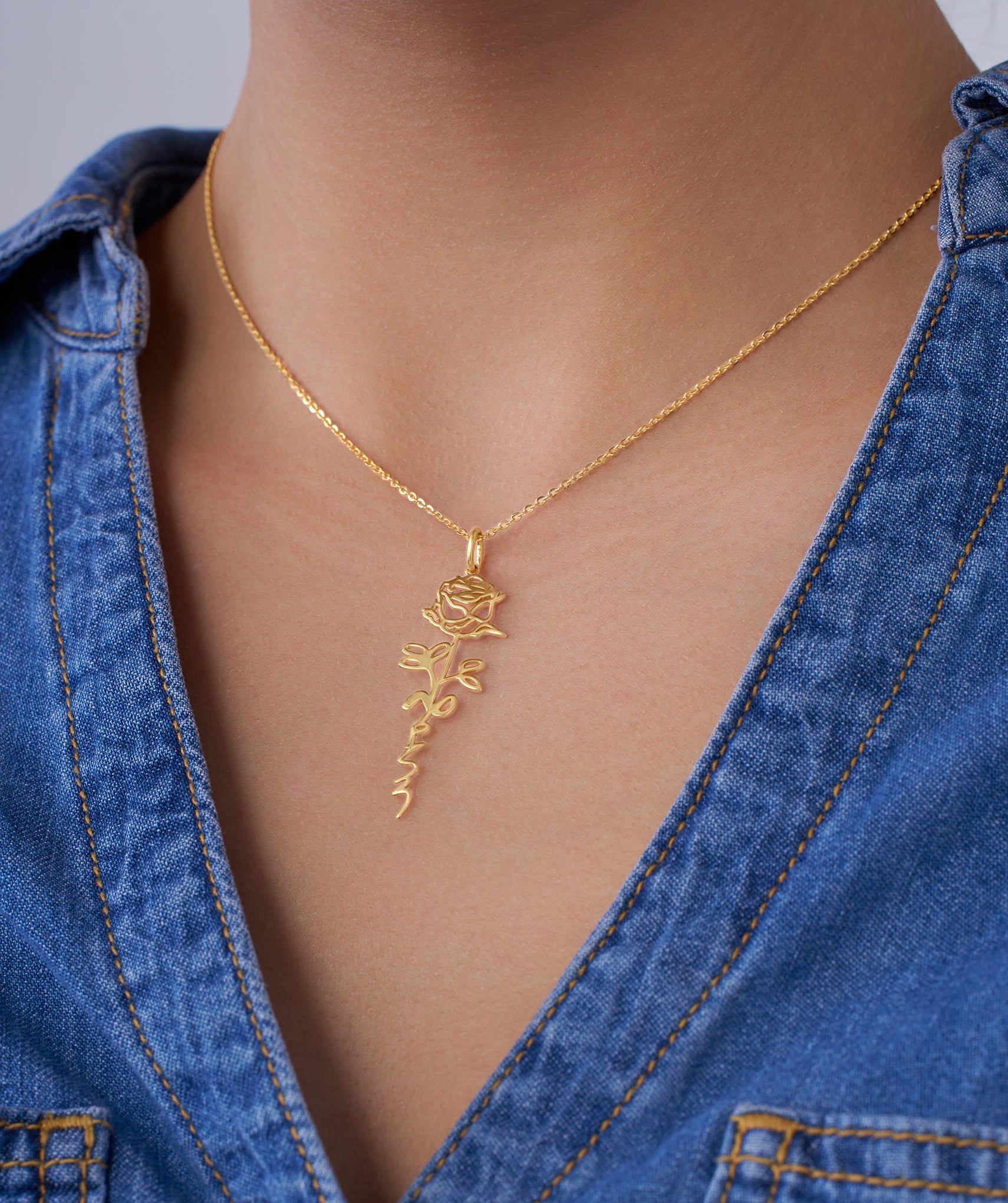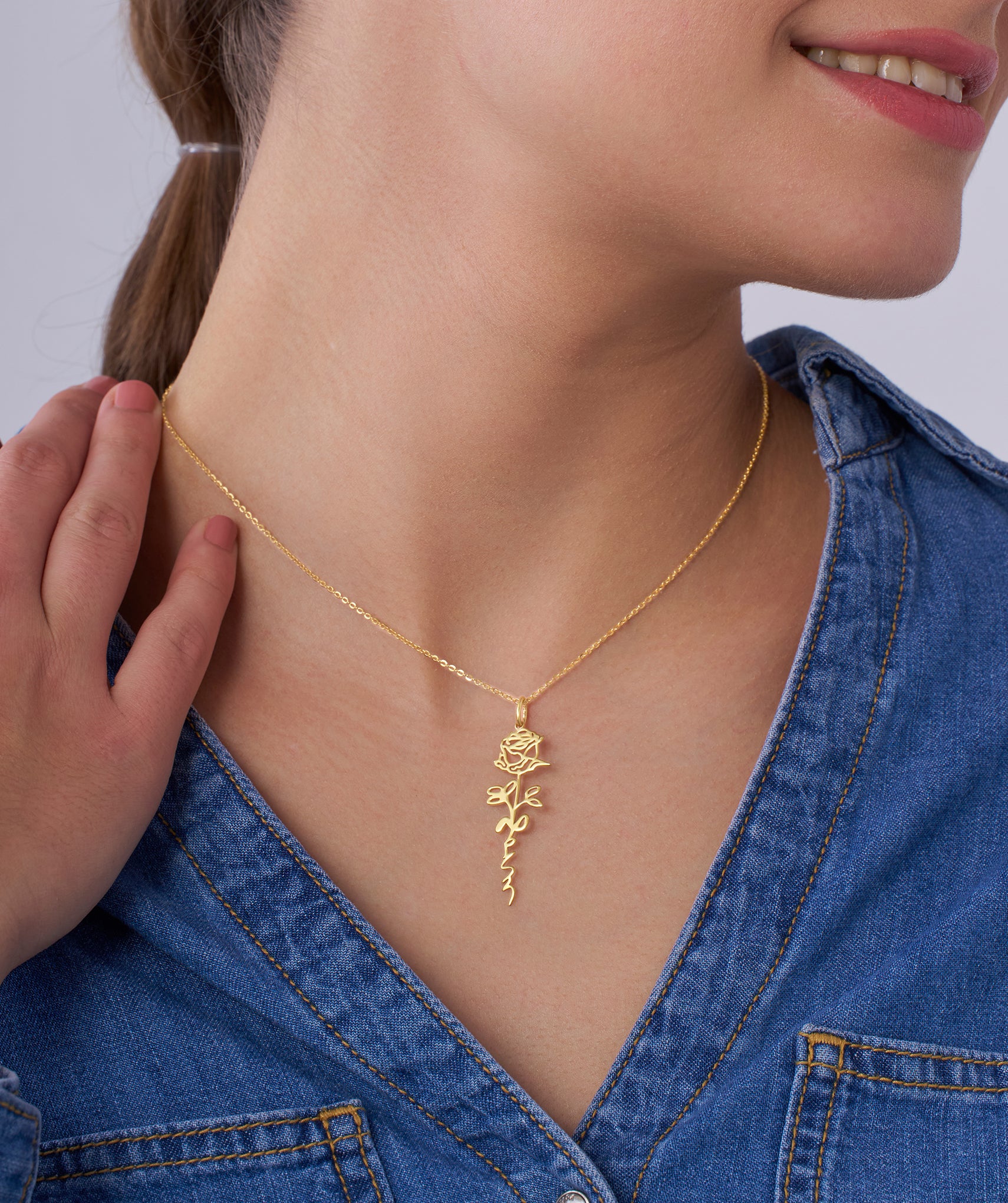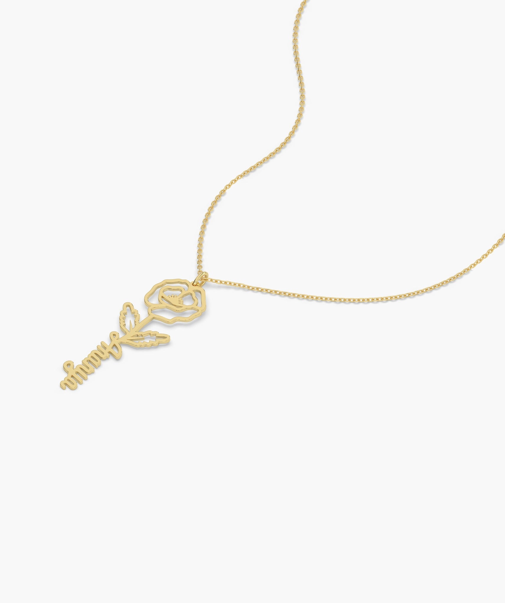 This exquisite 14K solid gold necklace features a unique pendant combining the name 'Marilyn' with an elegant rose design.