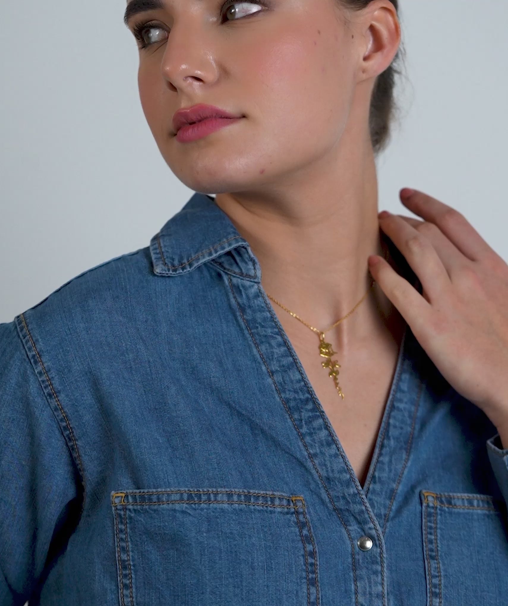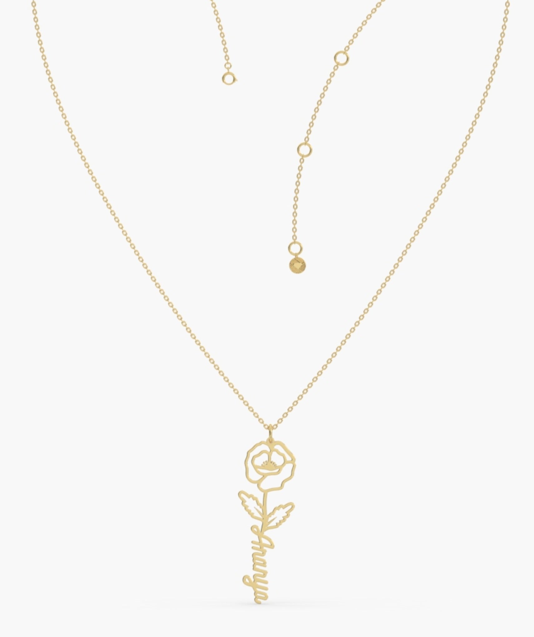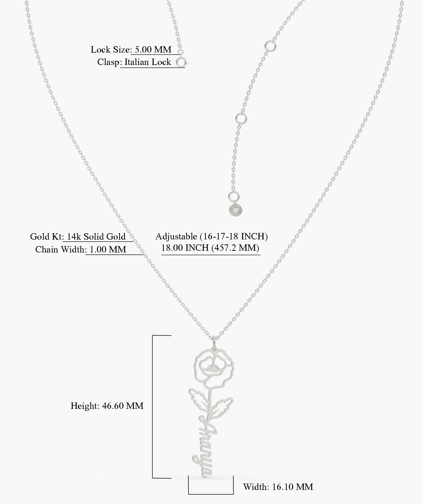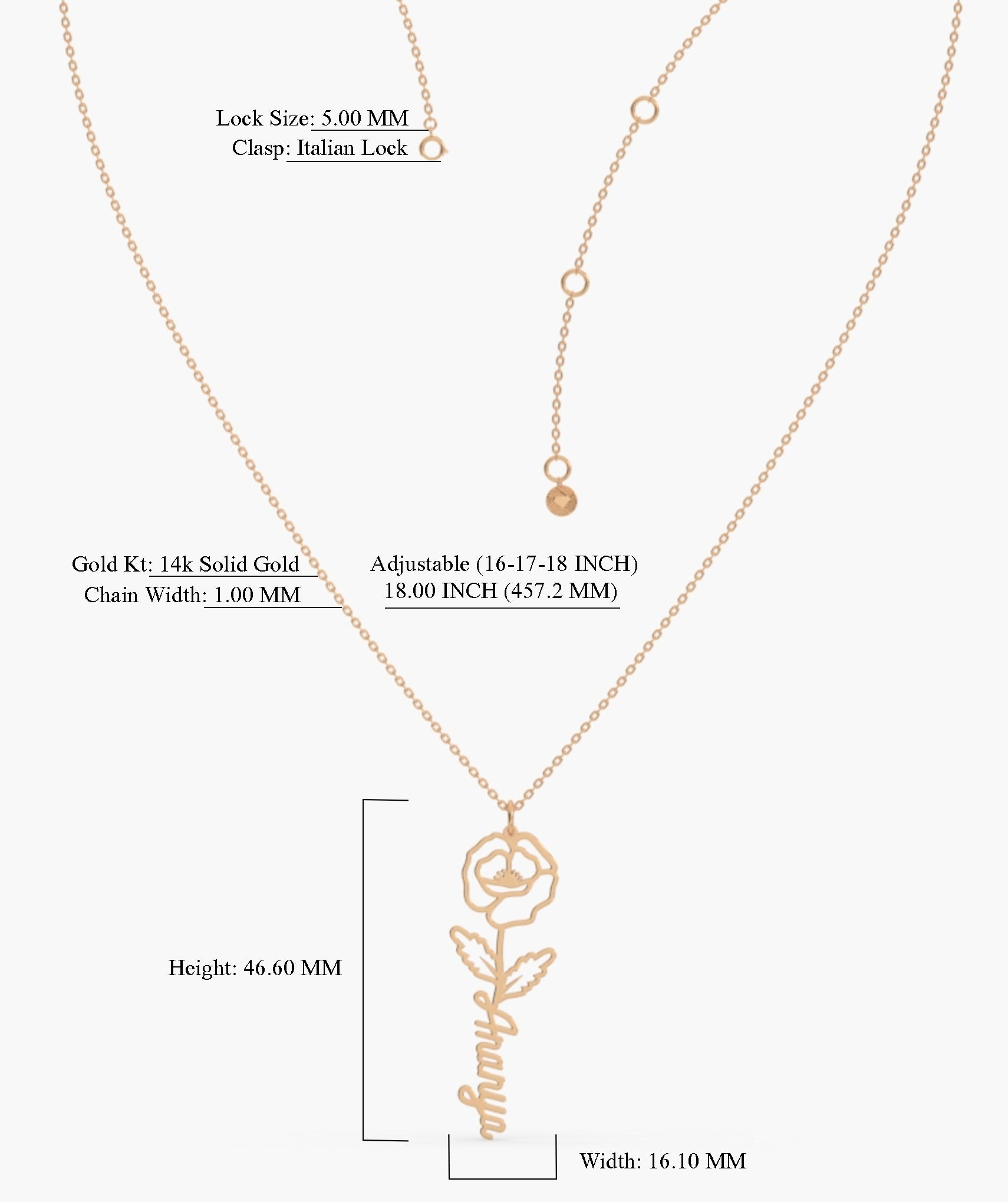 This exquisite 14K solid gold necklace features a unique pendant combining the name 'Marilyn' with an elegant rose design.