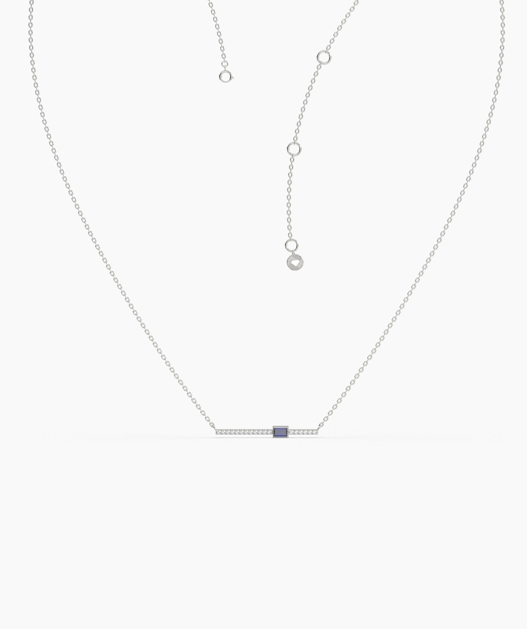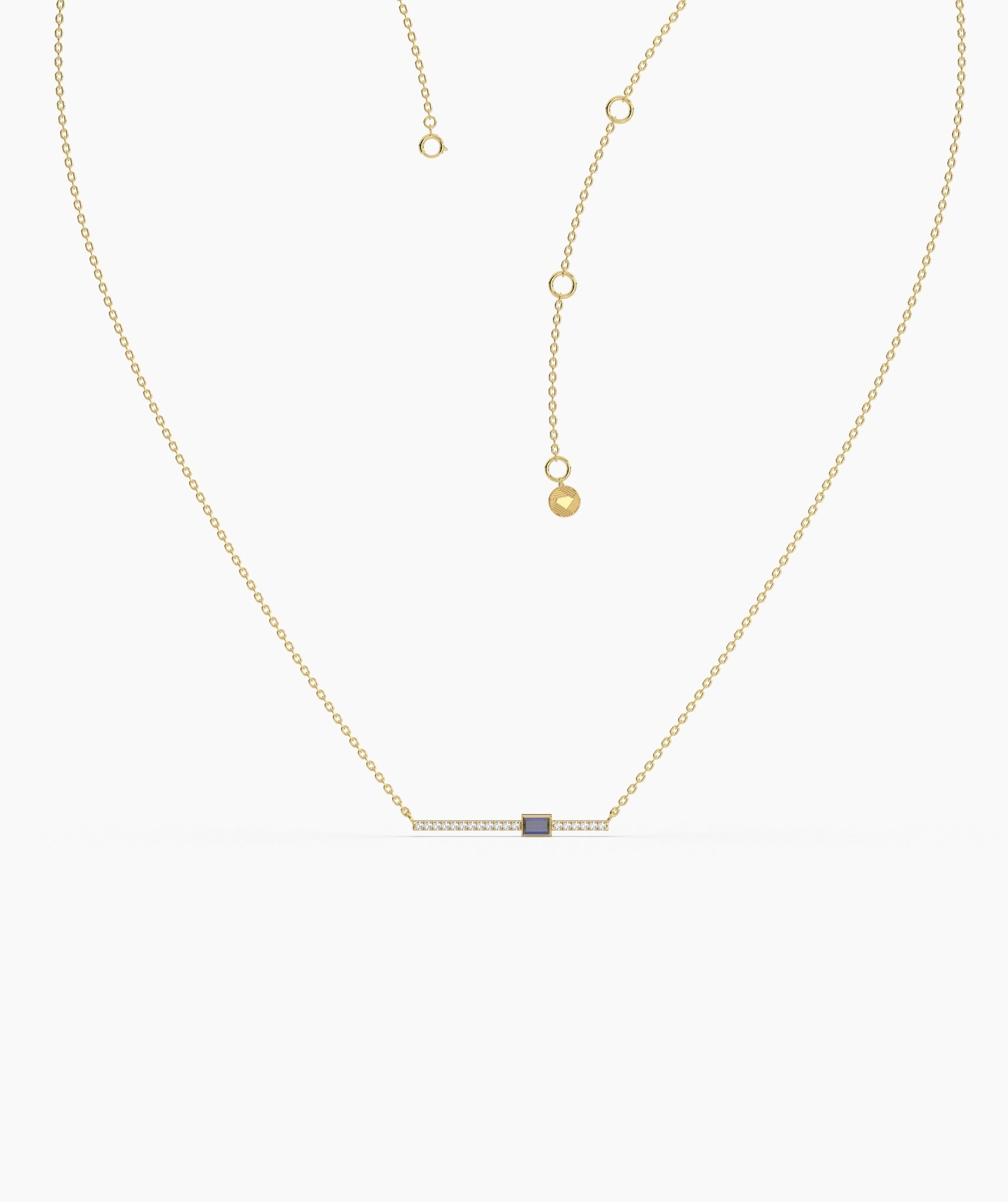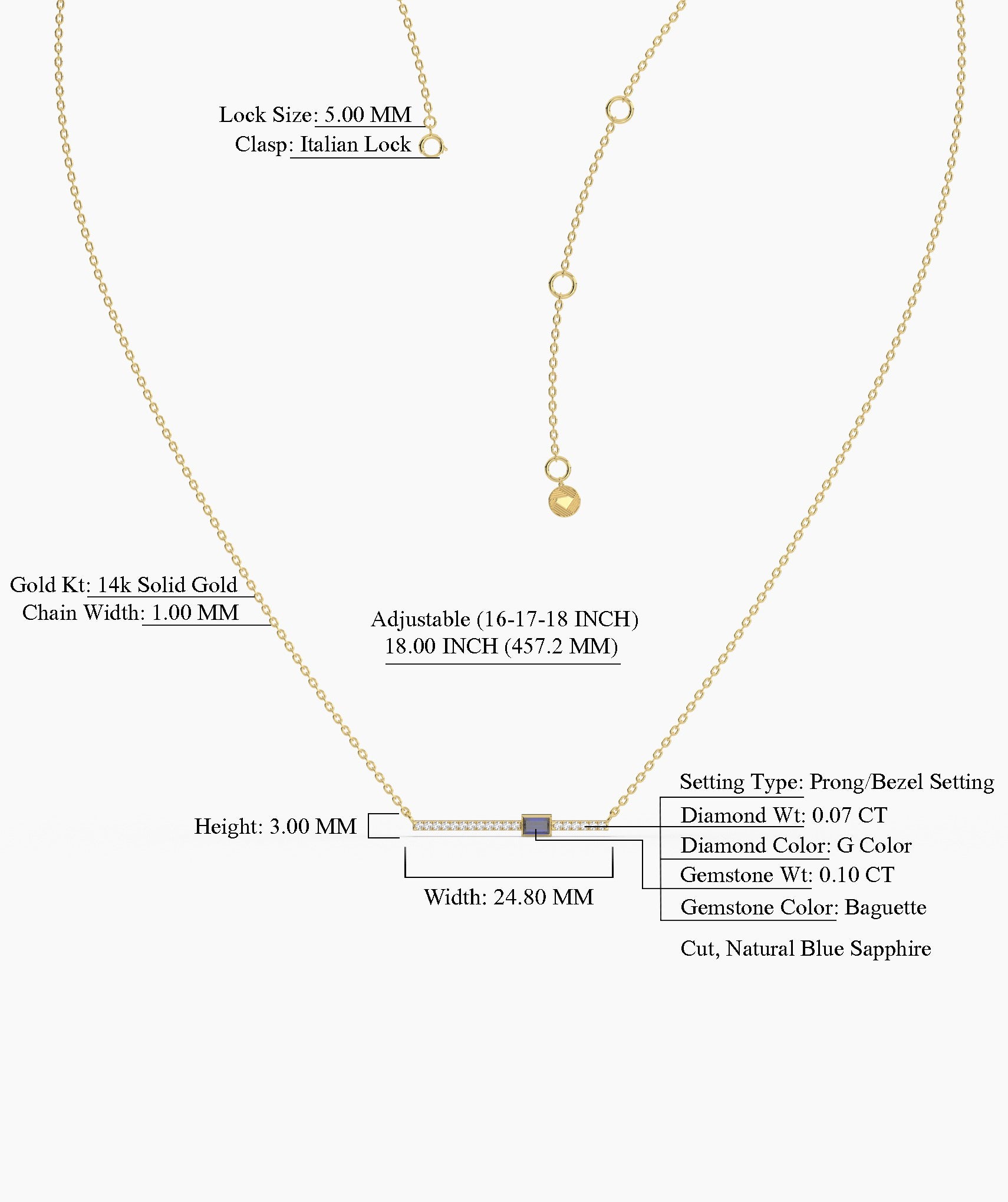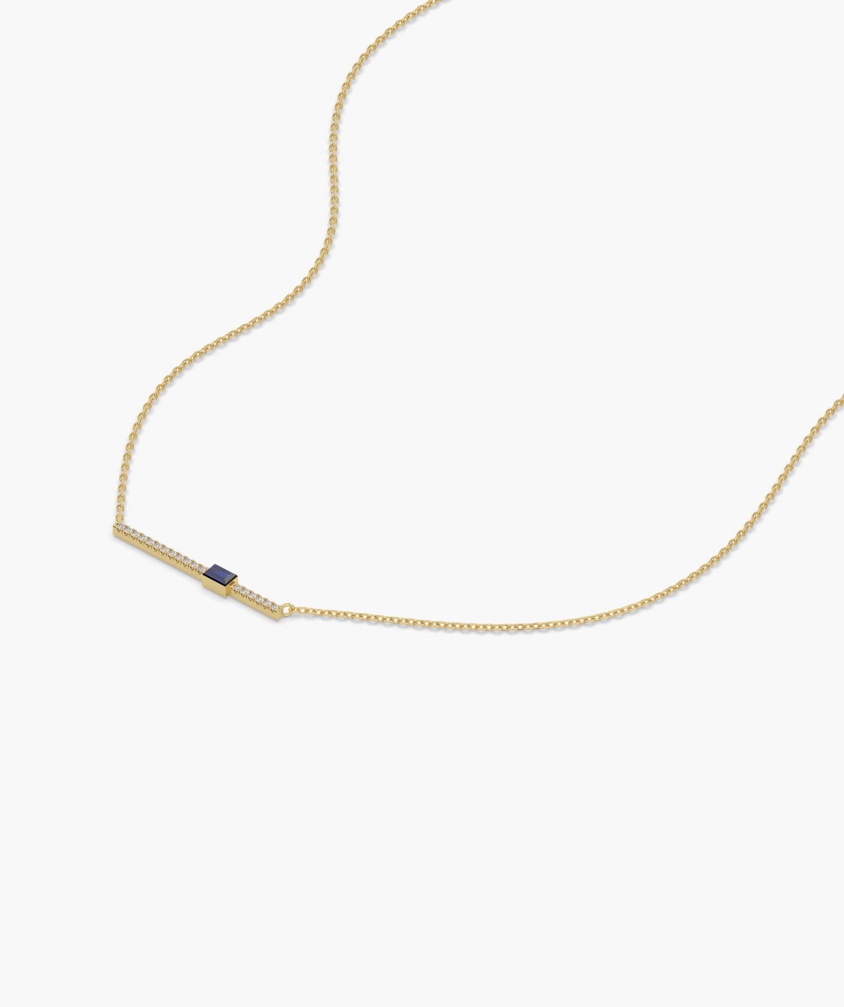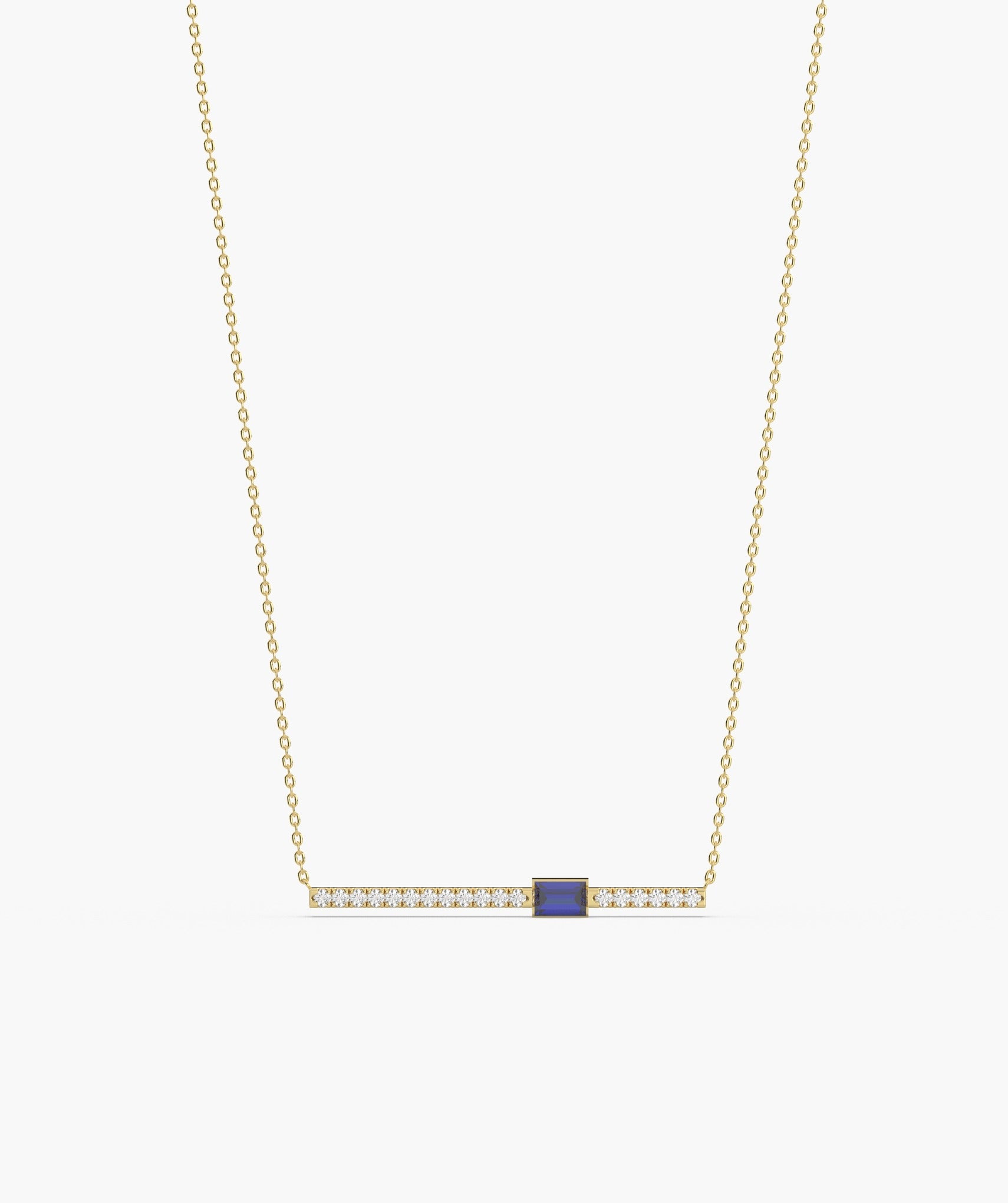 This 14K solid gold necklace features a sleek diamond-studded bar with a striking baguette-cut sapphire centerpiece.