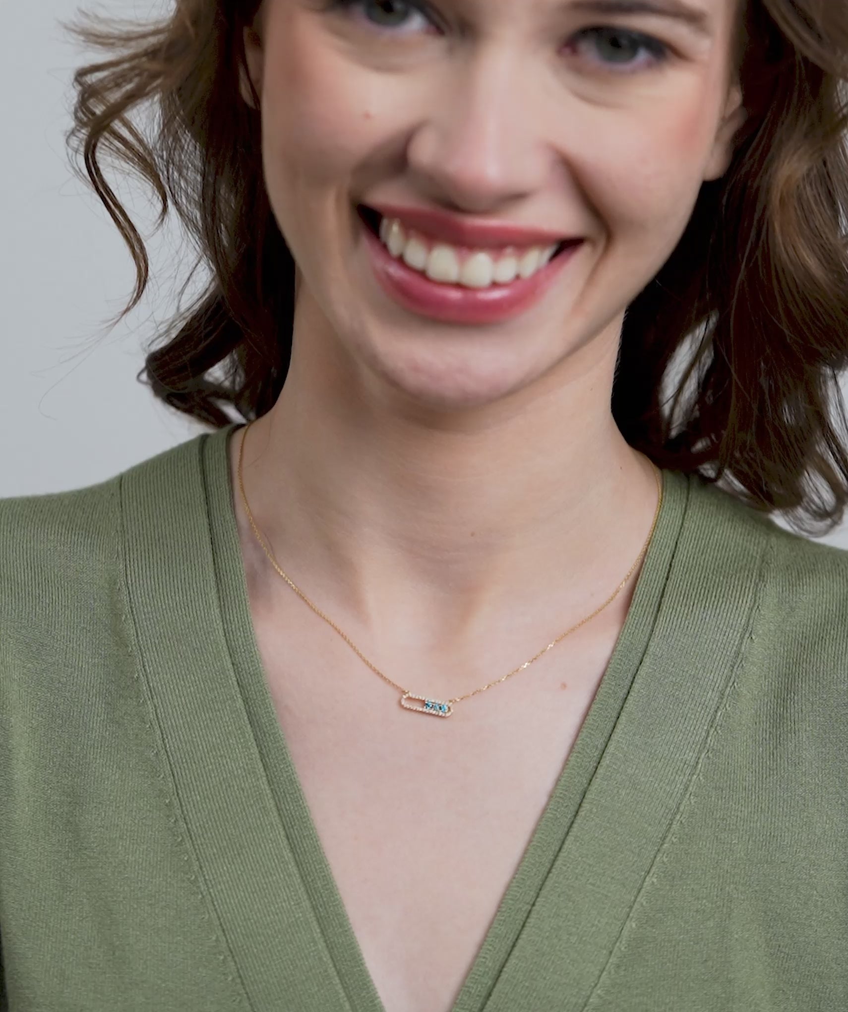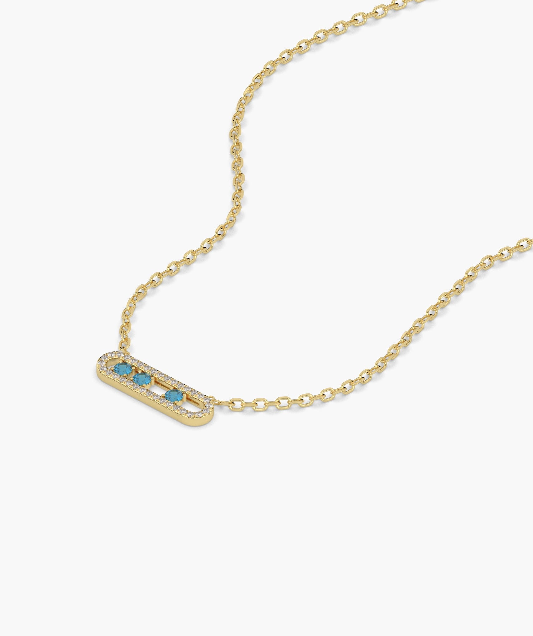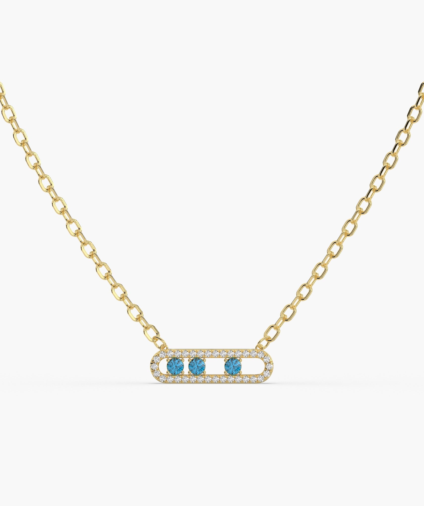 Disown the ordinary with a flash of electric blue. This modern necklace features three vibrant, round cut blue diamonds (0.11 ct) "floating" inside a sleek capsule silhouette, framed by a halo of brilliant white diamonds (0.12 ct). Expertly crafted in 14K solid gold with a secure prong and fishtail setting, the open work design keeps the piece feeling airy and lightweight against the skin. It sits on an adjustable chain that lets you dial in the perfect fit for your neckline. Available in yellow, white, and rose gold, it’s the perfect "something blue" for a wedding guest look or a rebellious pop of color for your Monday morning stack.