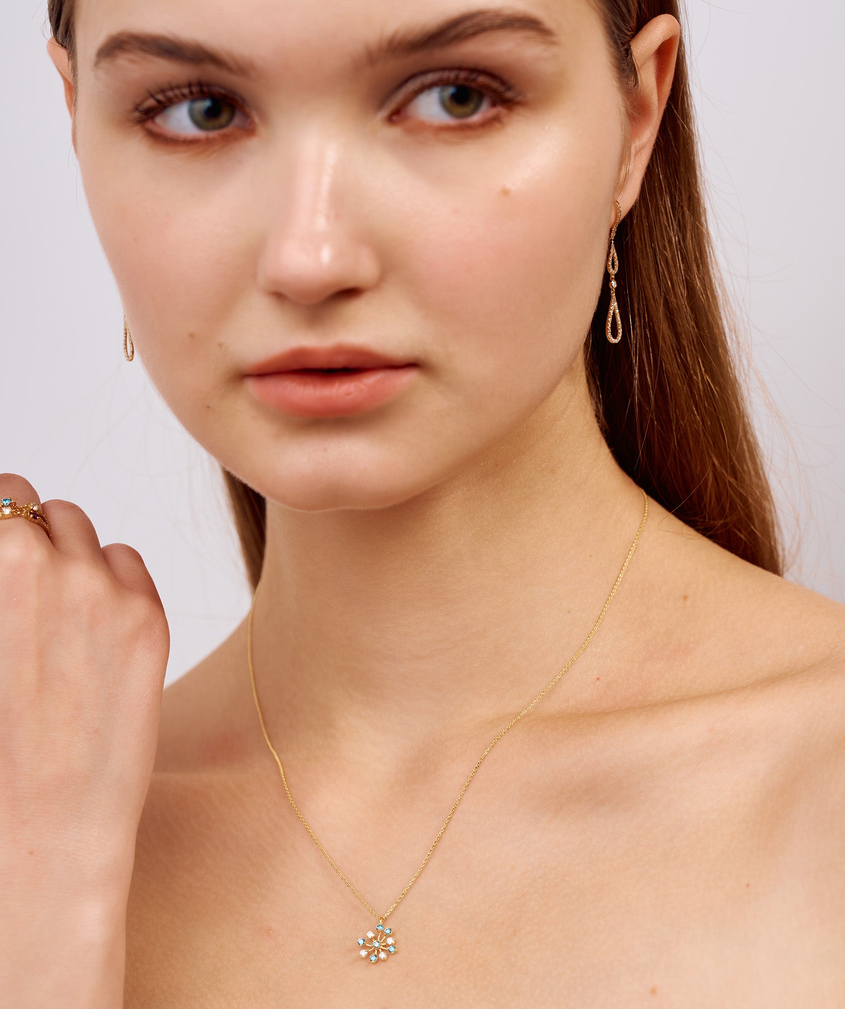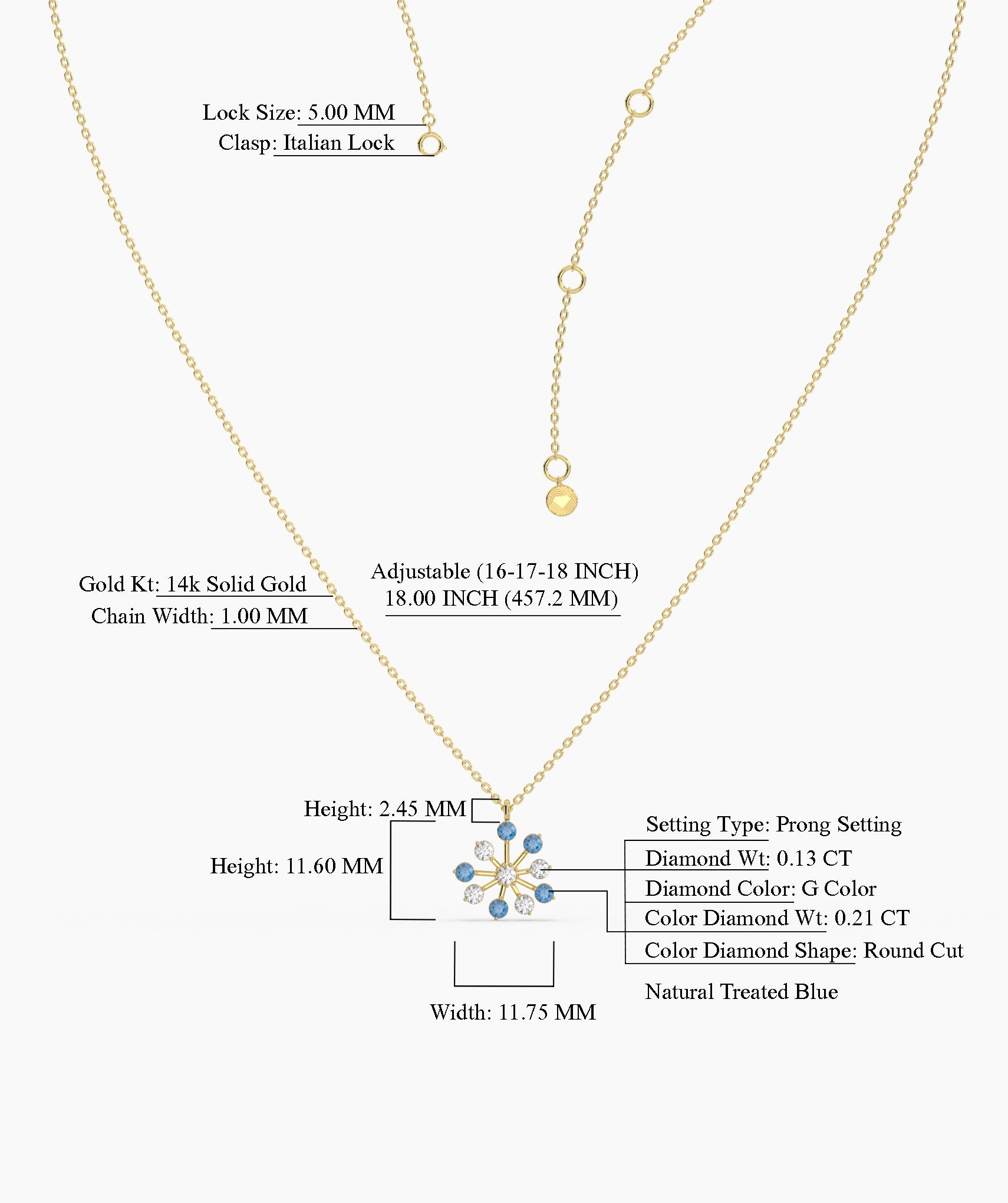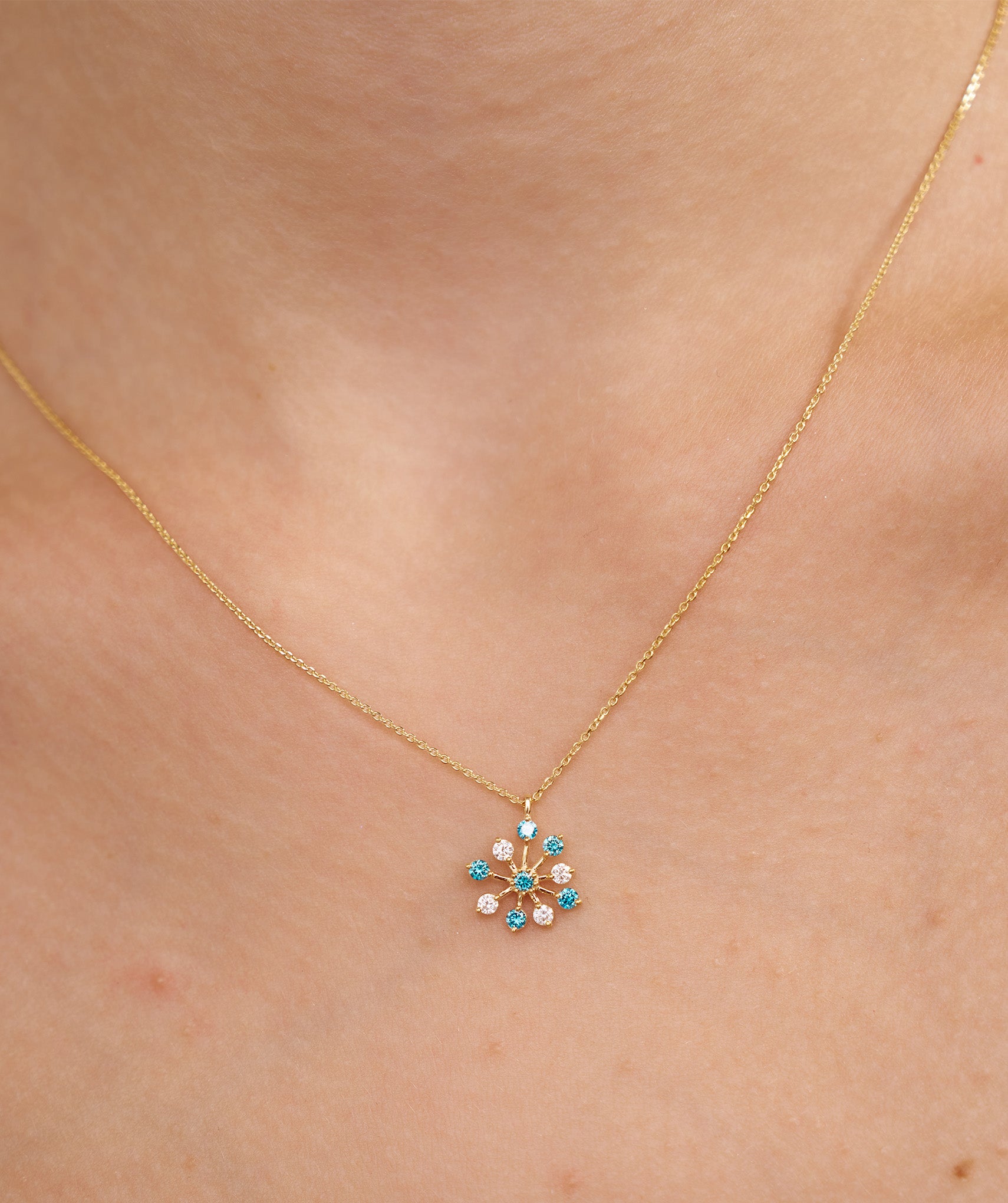 Bring a burst of cosmic energy to your neckline. This playful yet elegant pendant features a radiating starburst design, alternating between sparkling white diamonds and vibrant natural treated blue diamonds for a mesmerizing contrast. Set in 14K solid gold, the prong set stones create a floating celestial silhouette that feels both retro and modern. With a combined diamond weight of 0.34 carats, it offers just the right amount of everyday shine. The delicate 1.00 mm chain is adjustable from 16 to 18 inches, allowing you to find your perfect fit. Available in yellow, white, and rose gold.