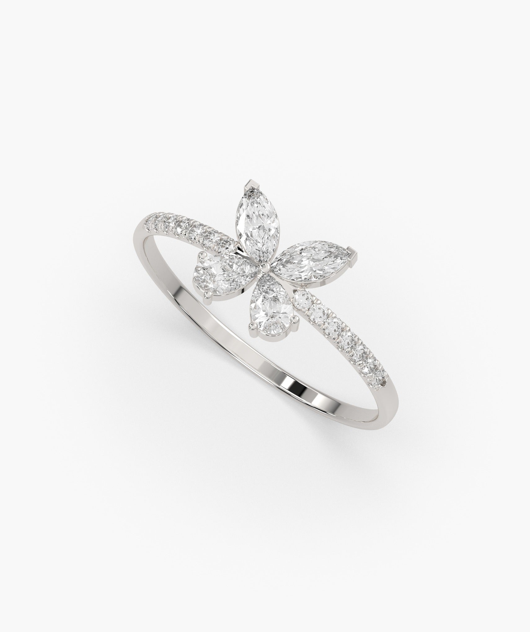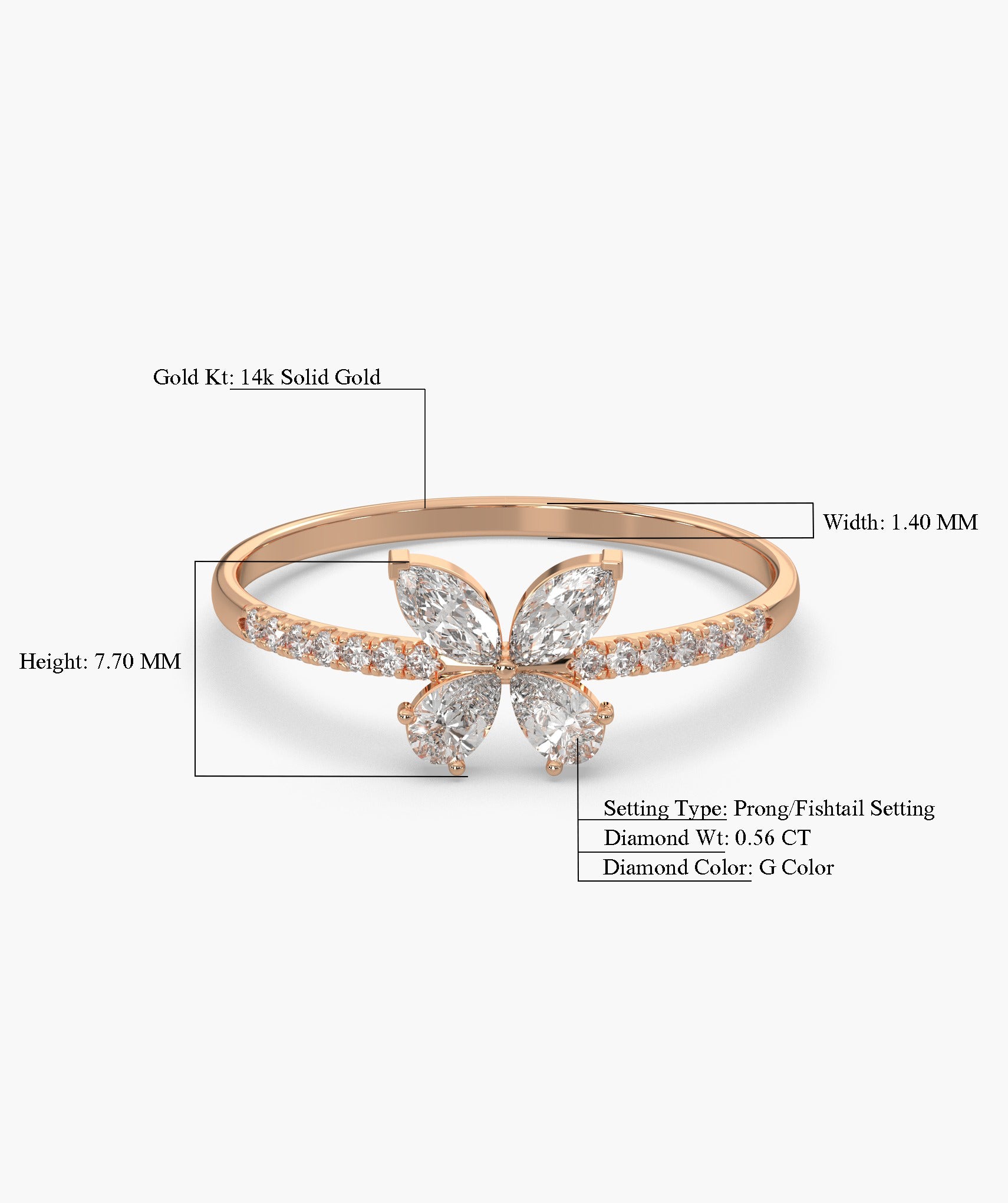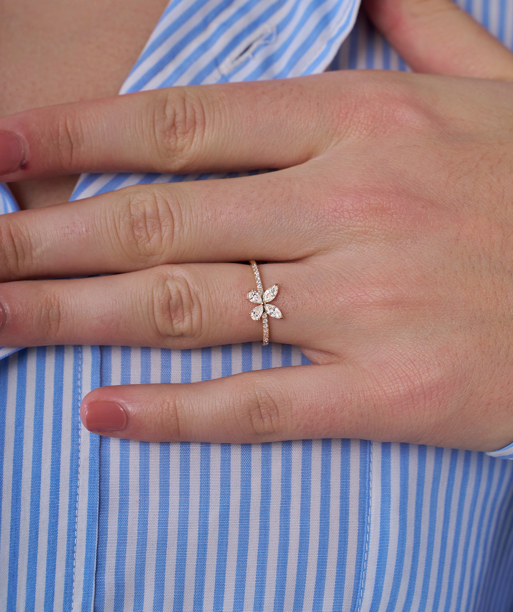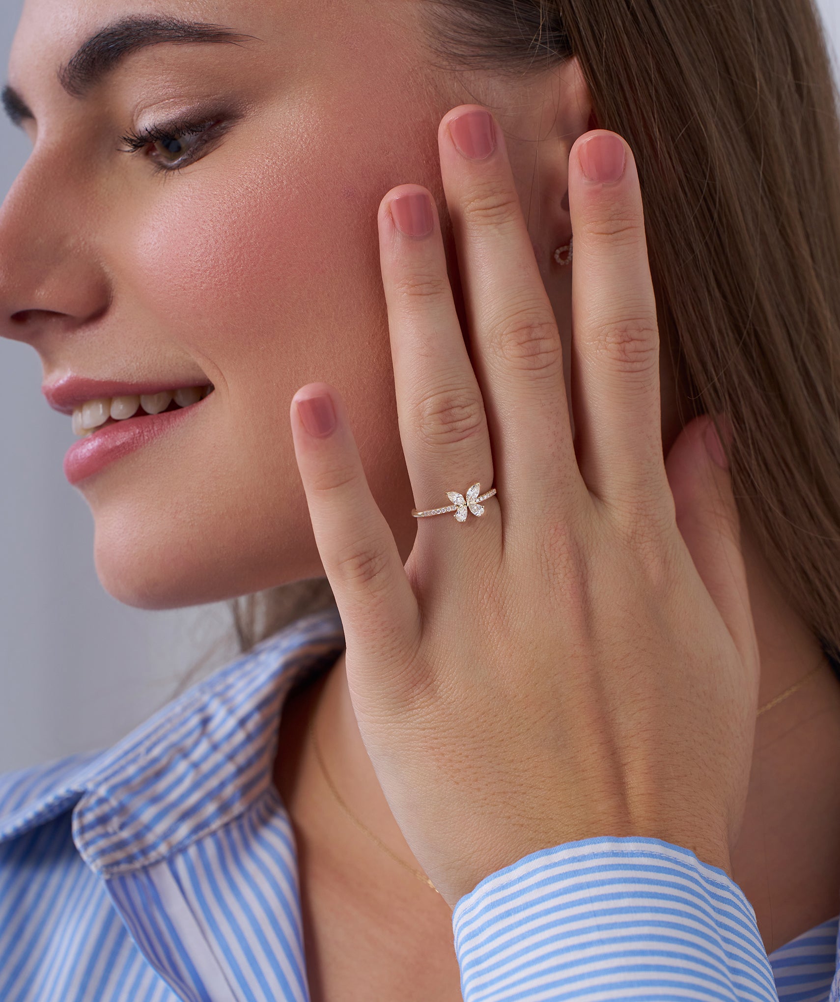 Delicate 14K gold ring featuring a butterfly design with marquise and round diamonds, symbolizing grace and transformation.