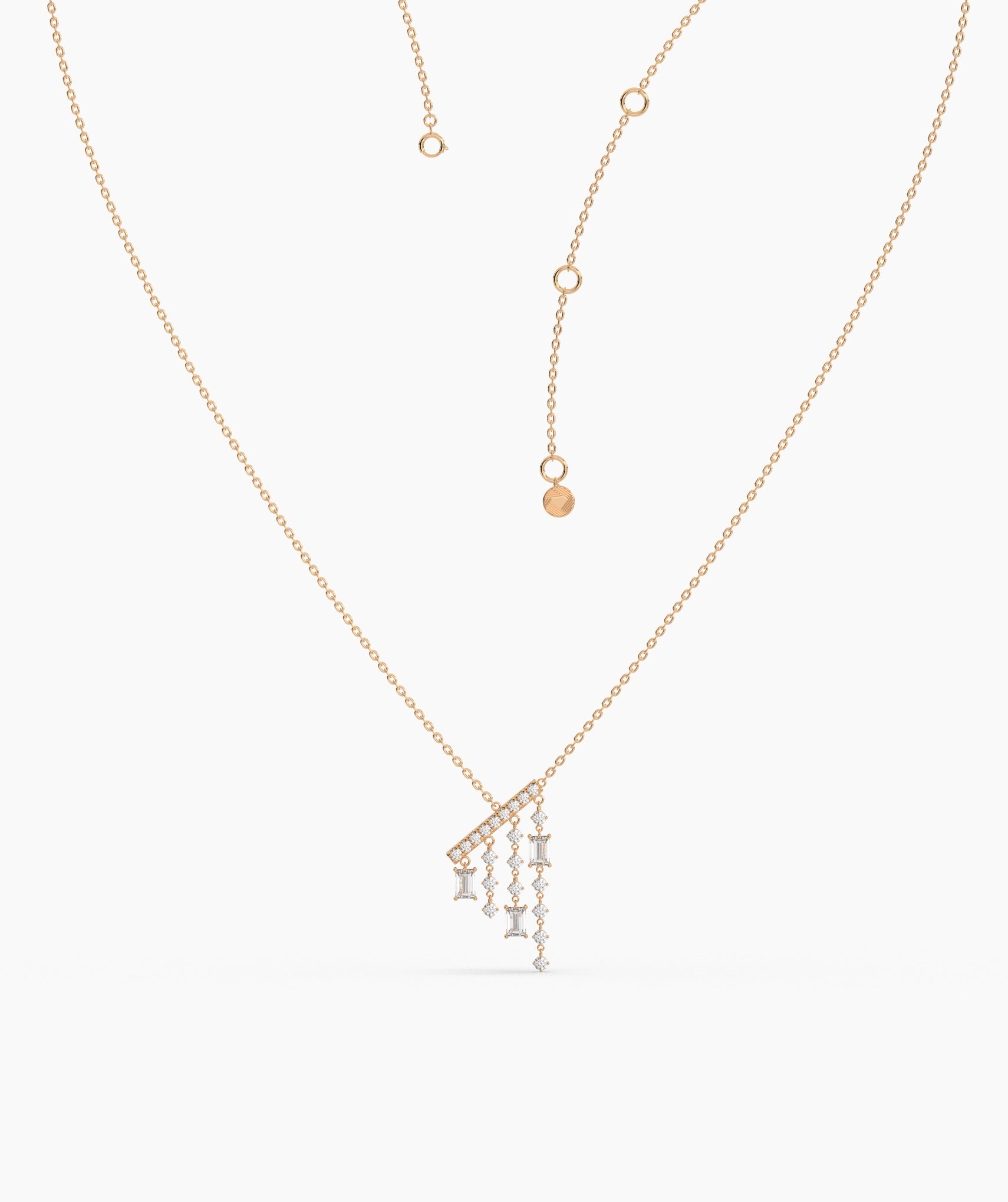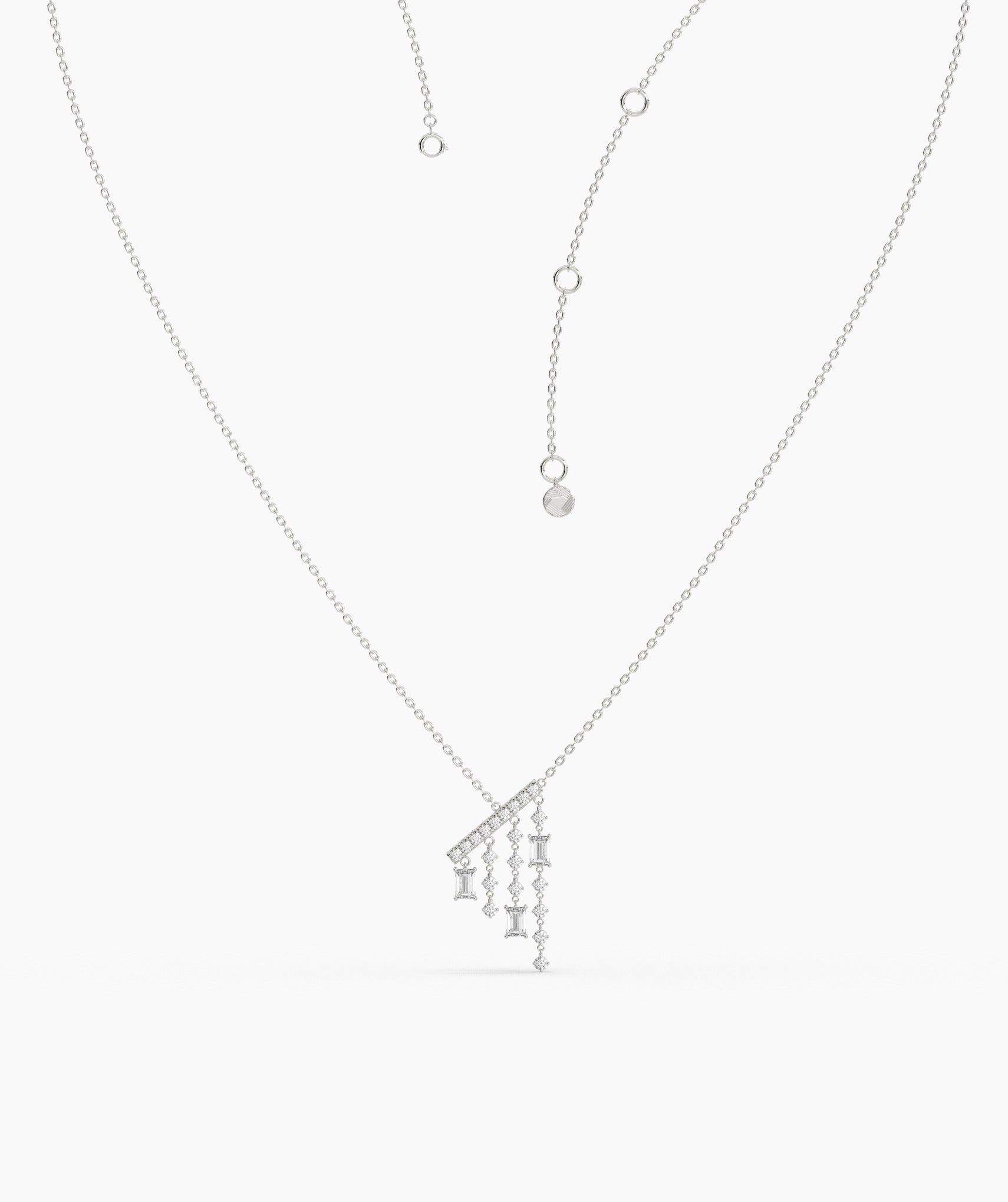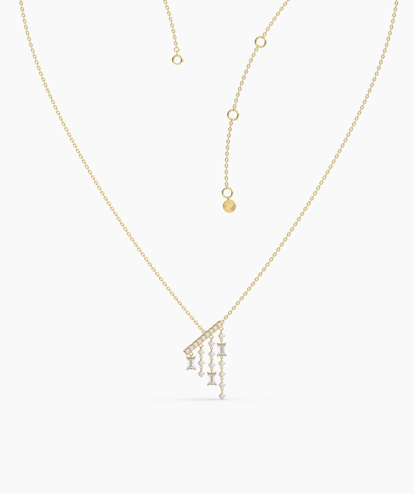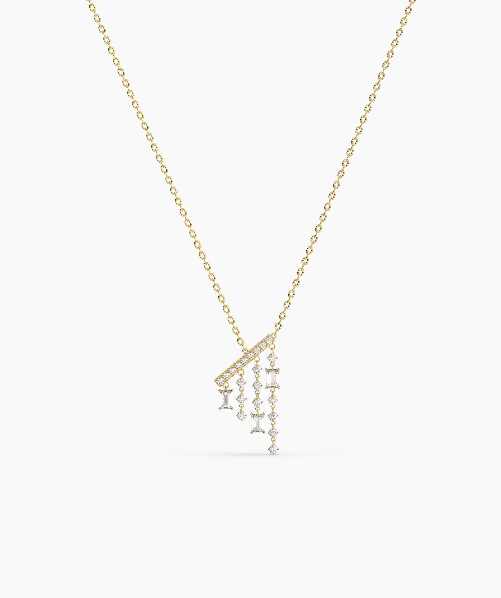 A luxurious blend of baguette and round diamonds, this dangle necklace is perfect for both everyday wear and special occasions.