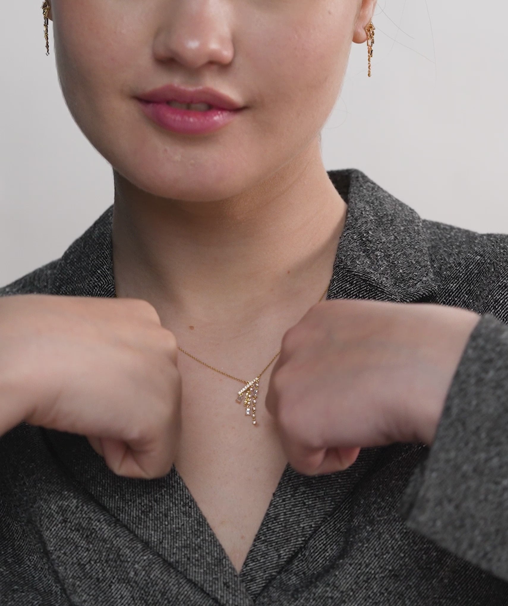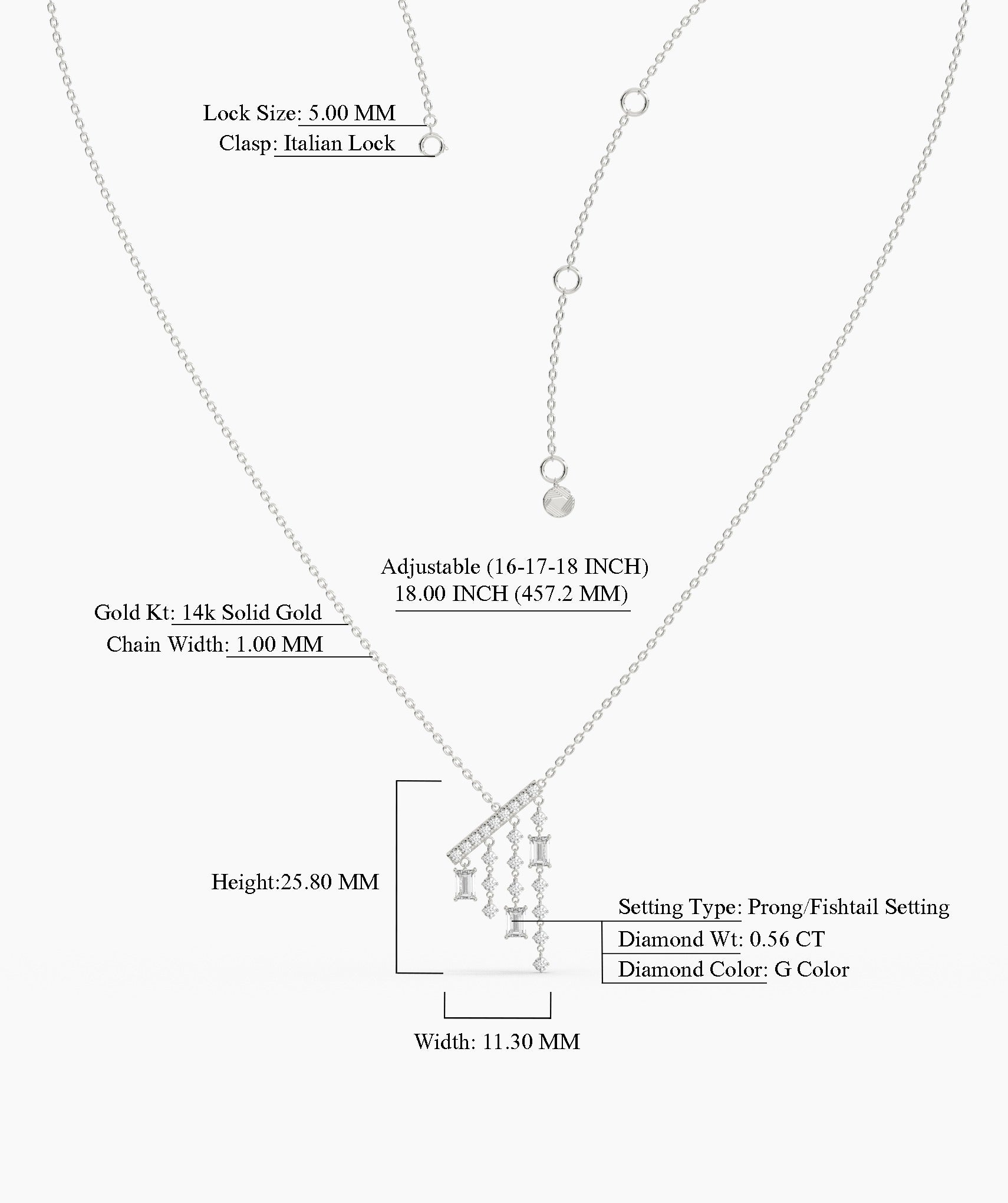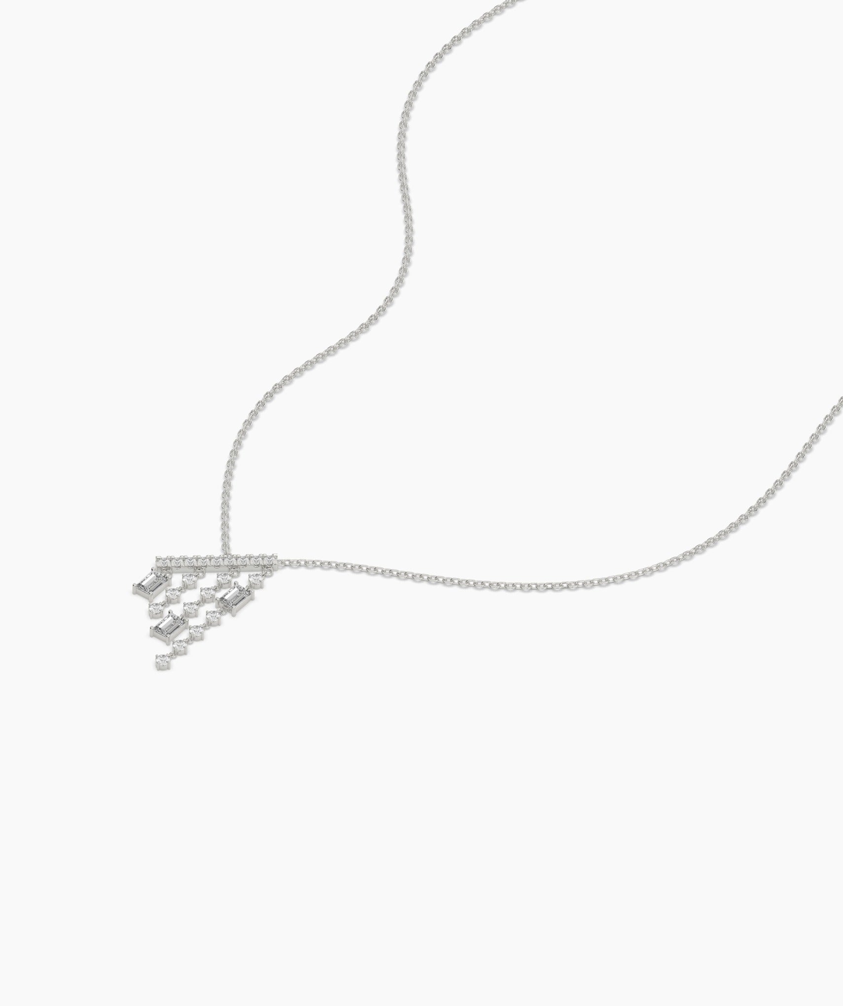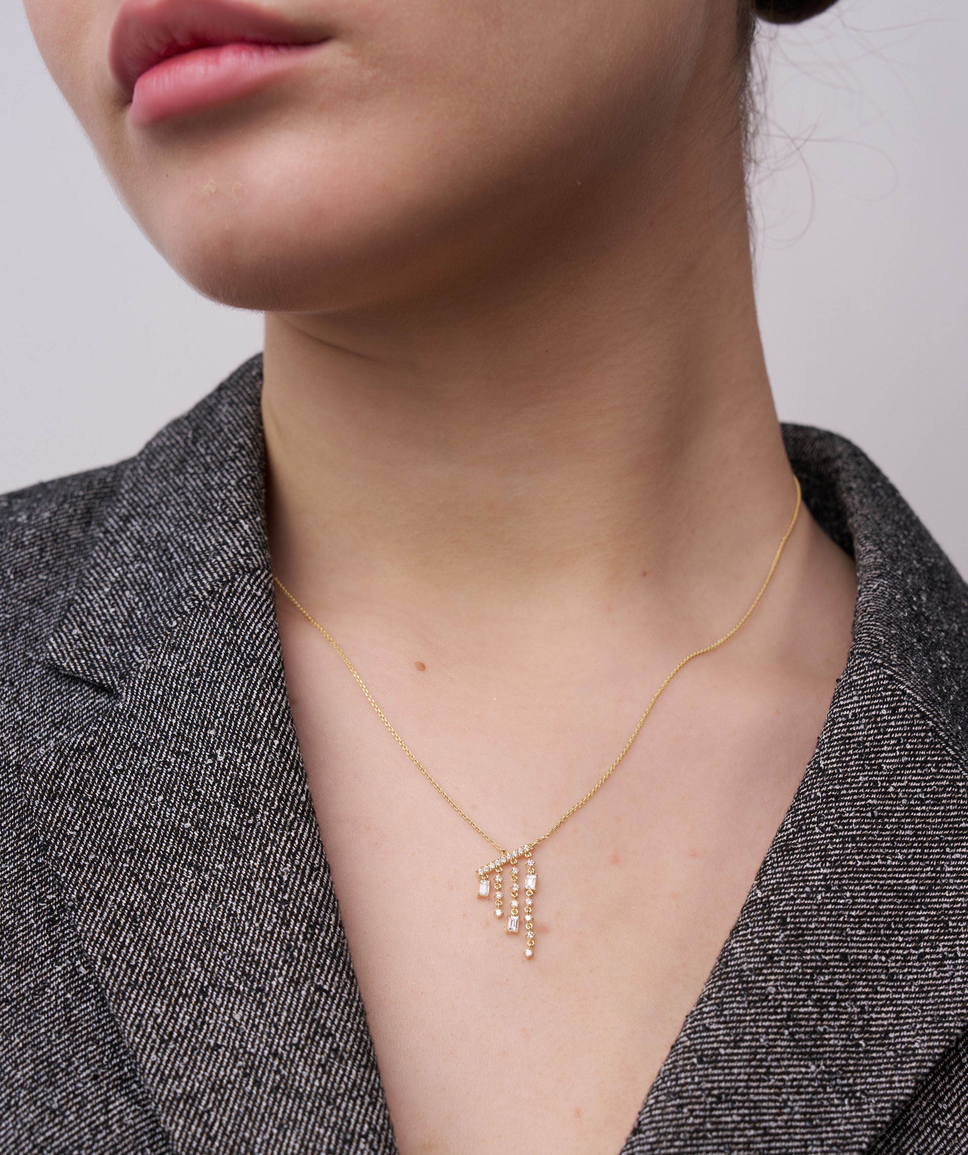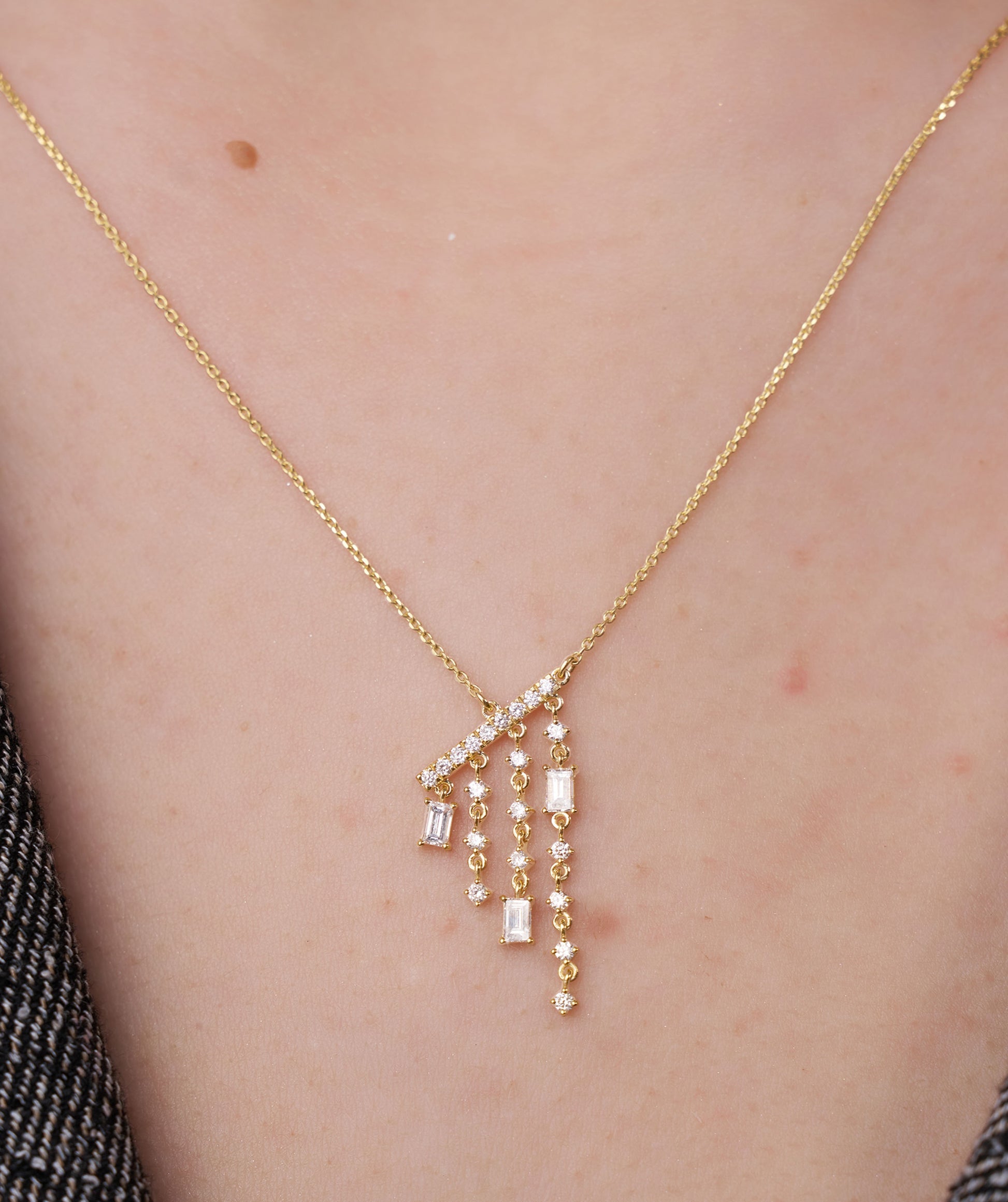 A luxurious blend of baguette and round diamonds, this dangle necklace is perfect for both everyday wear and special occasions.