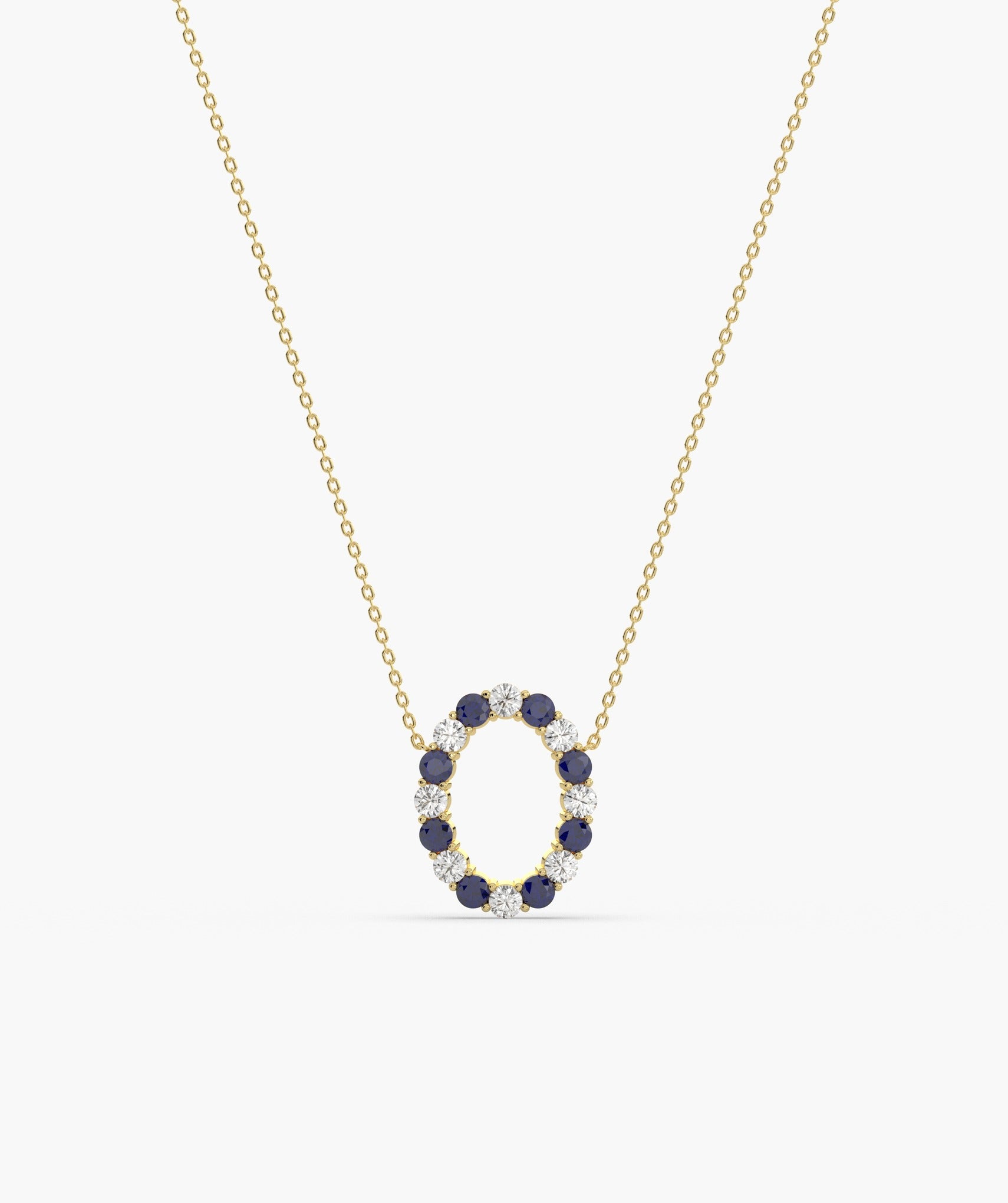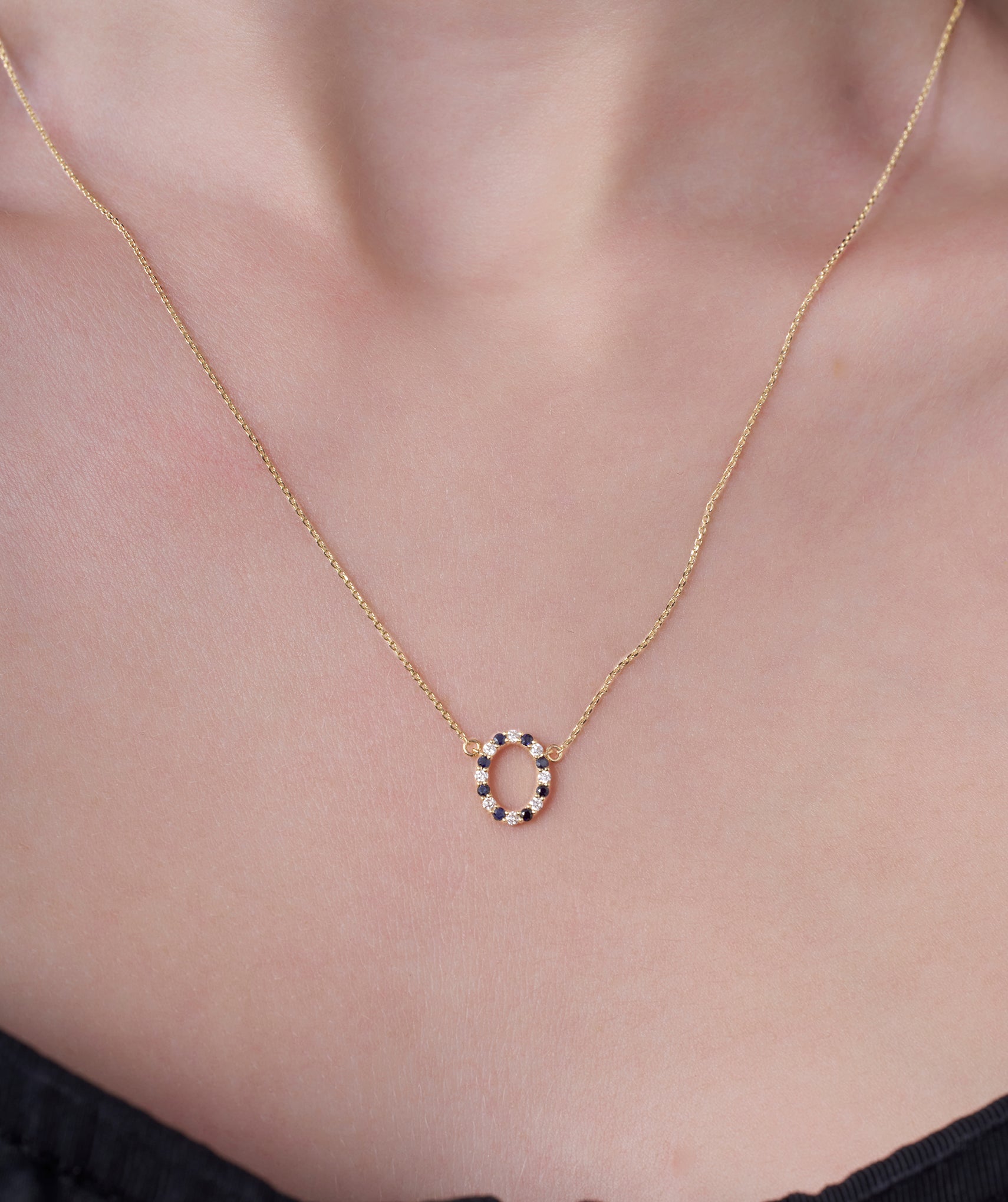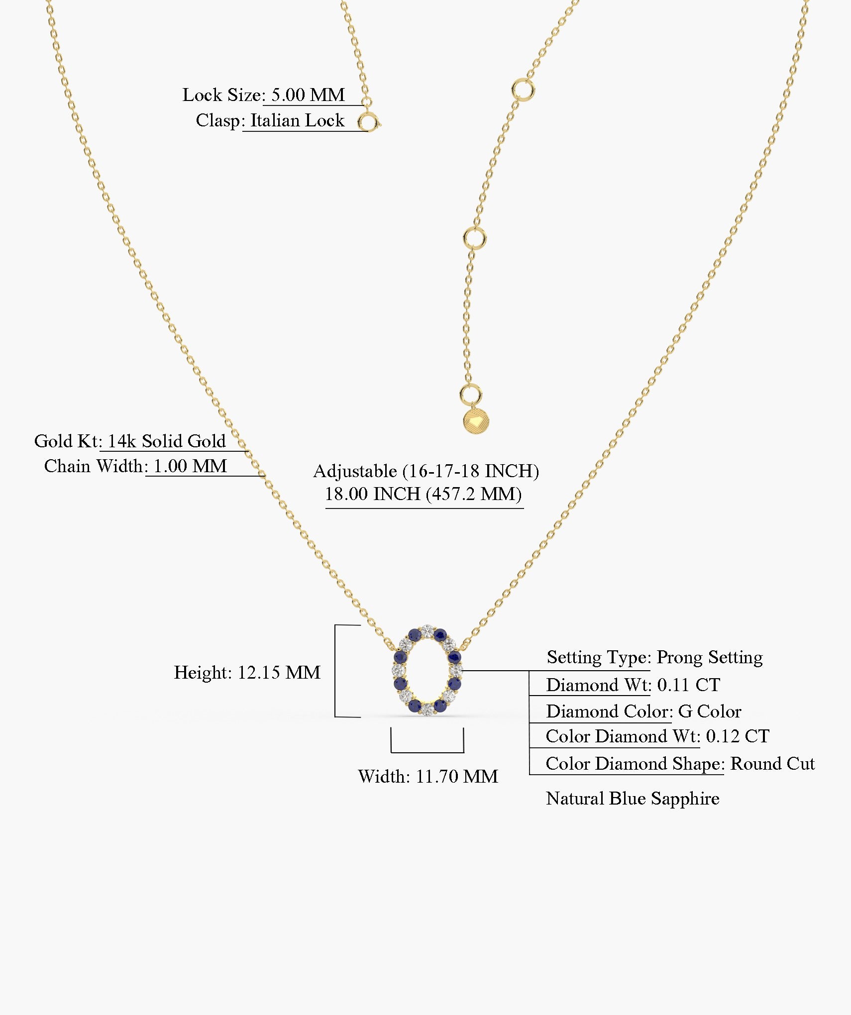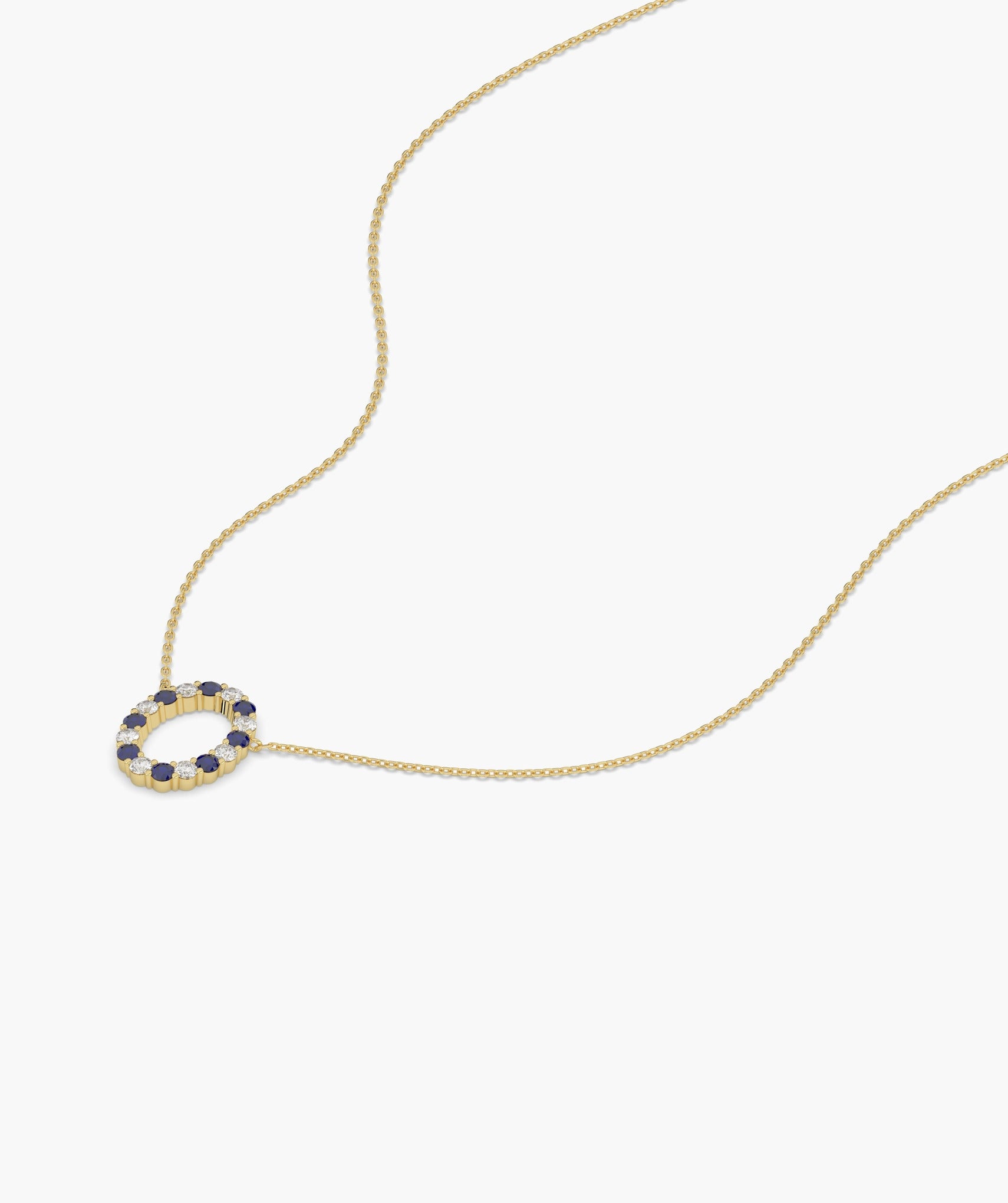 Elegant 14K gold necklace with a circular pendant adorned with alternating sapphires and diamonds, blending classic charm and modern sophistication.